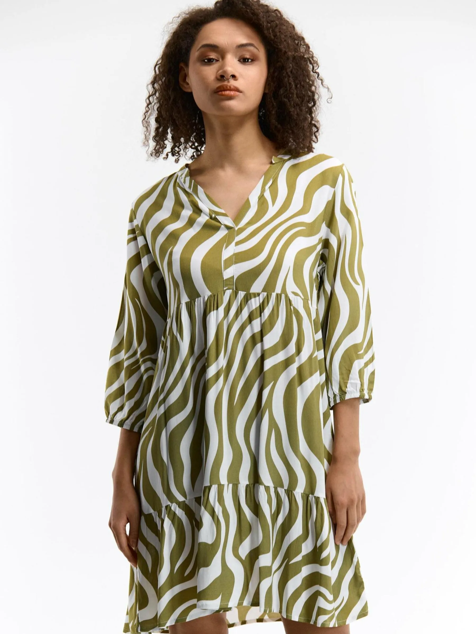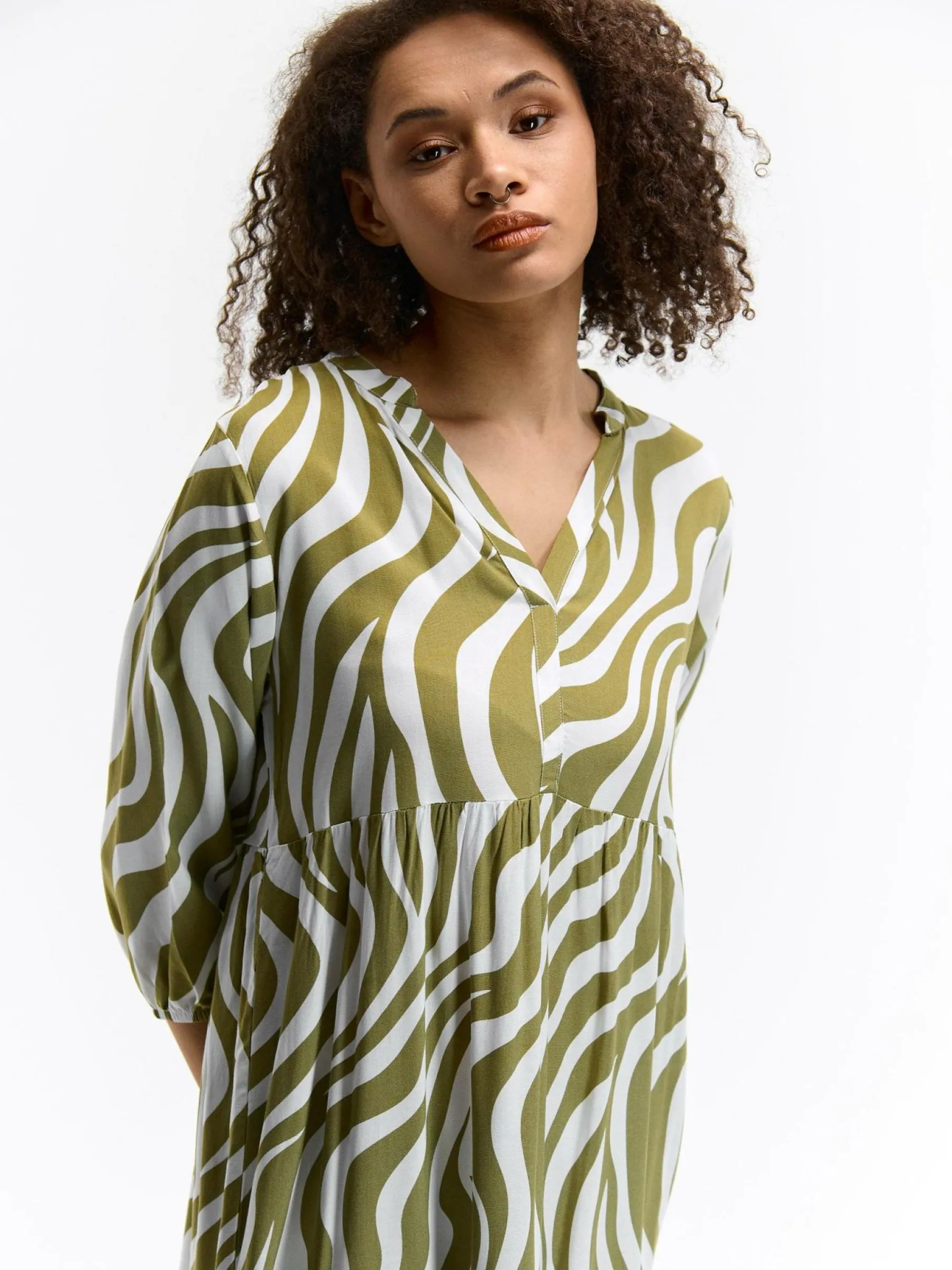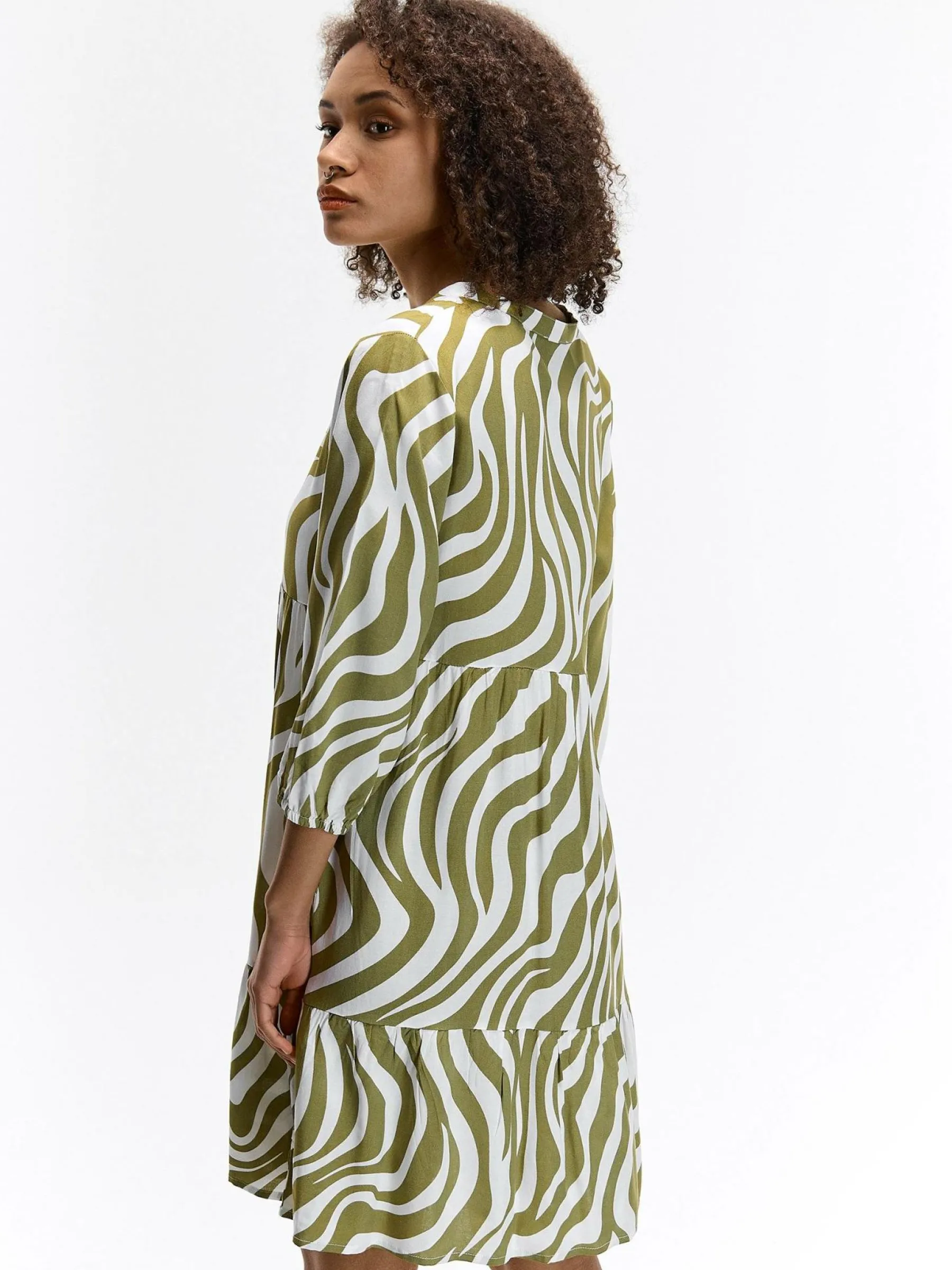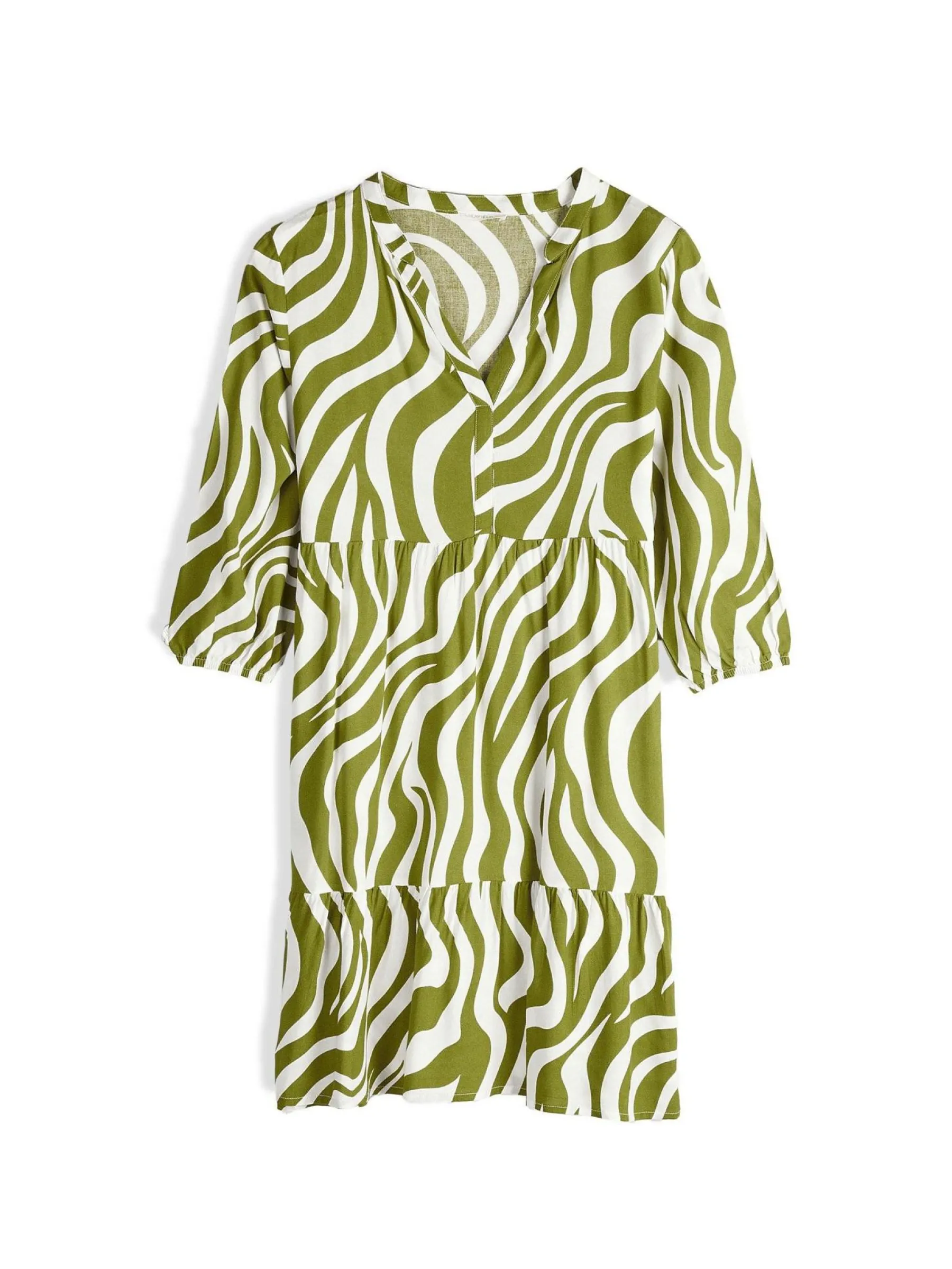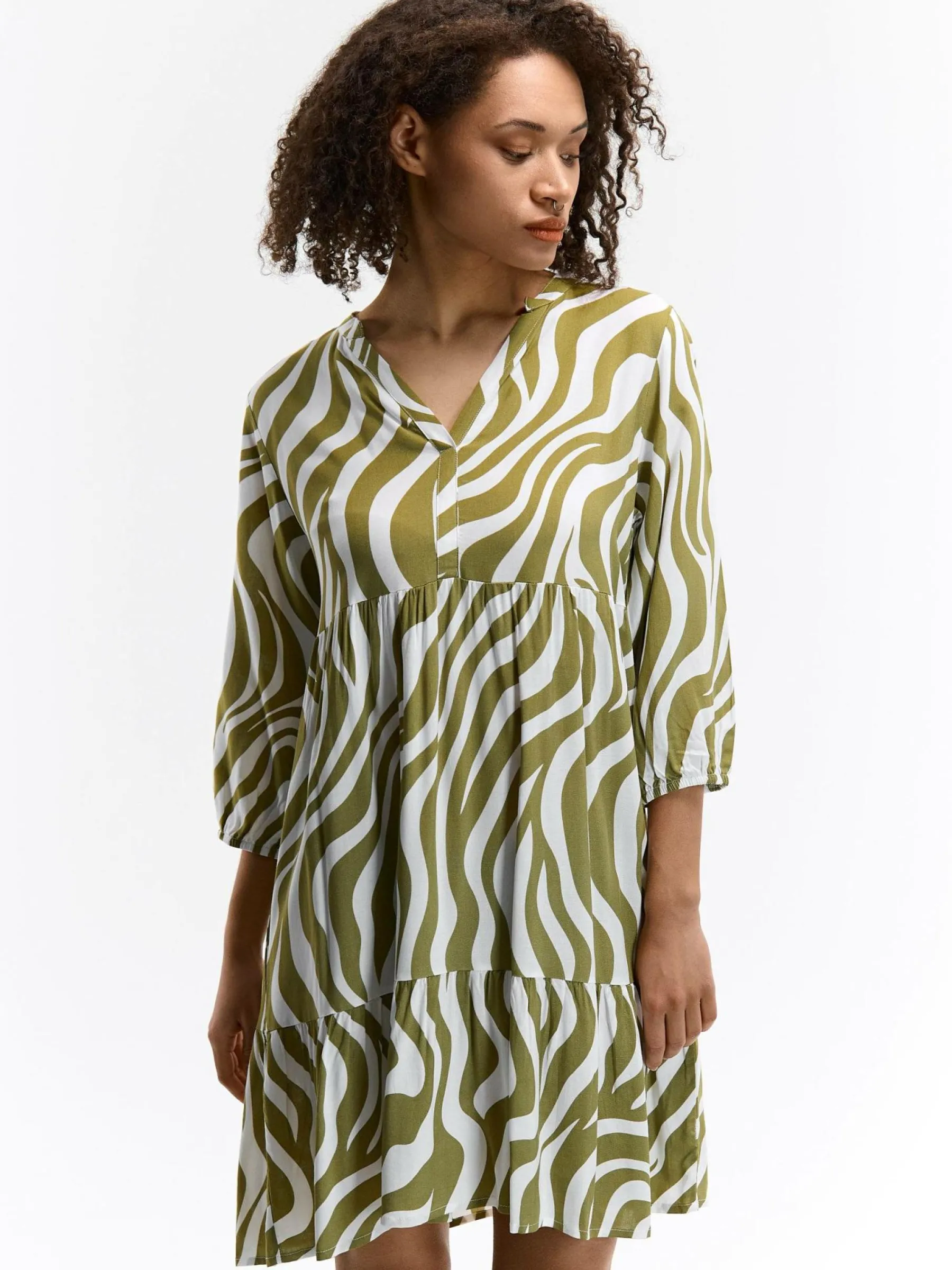 Kolor: zielonyKrój: z falbanąTyp: sukienkaRekaw: rękaw 3/4Długość: miniPattern style: wzorzysteDetal: v-neck, nad …