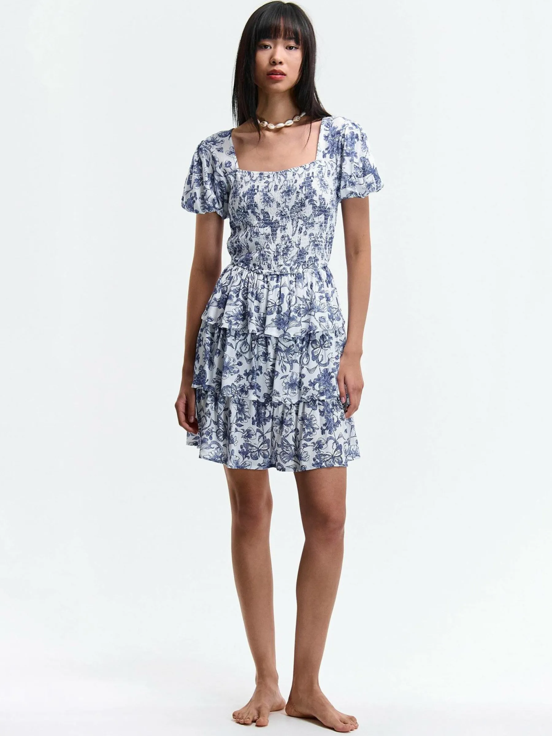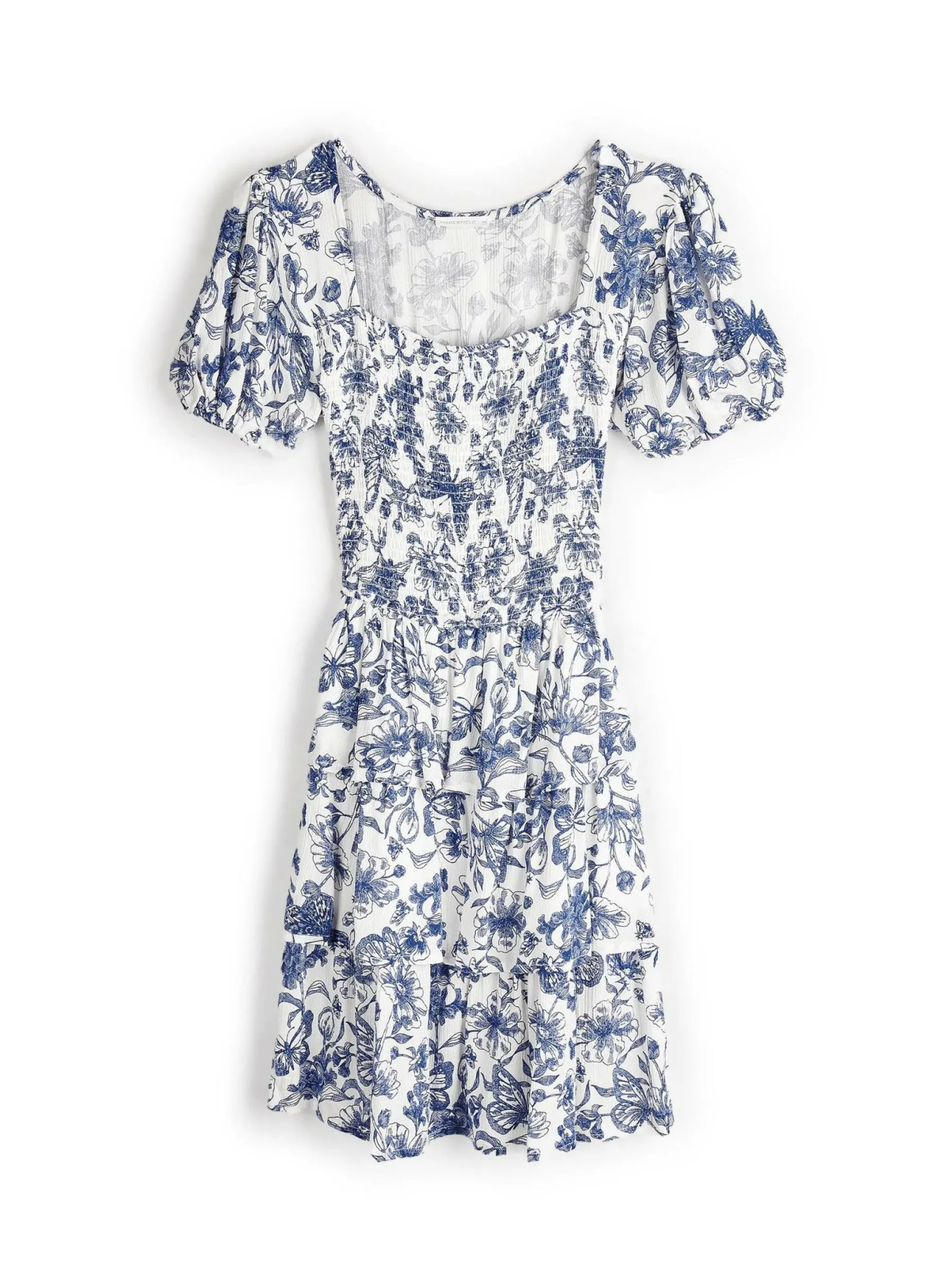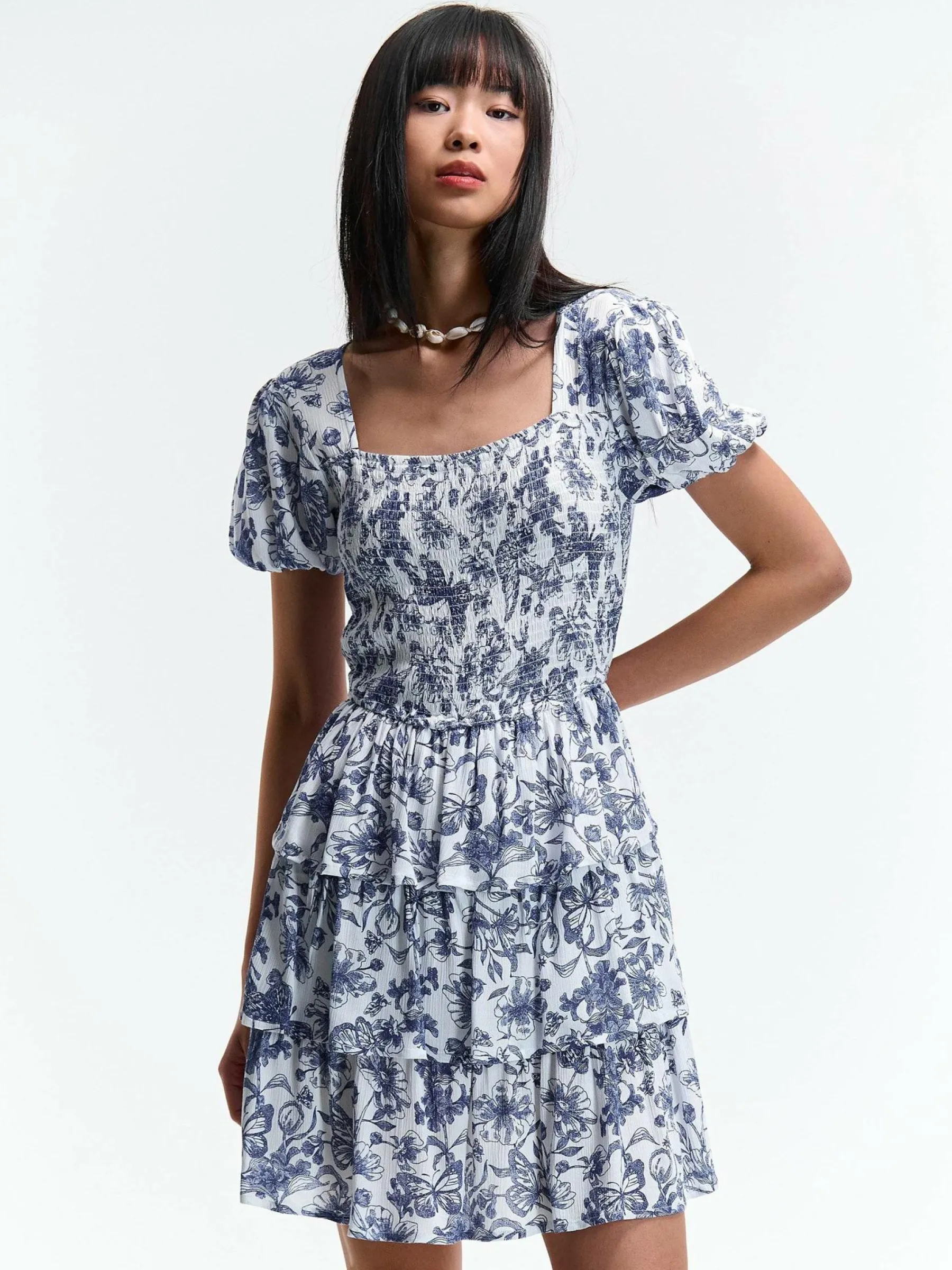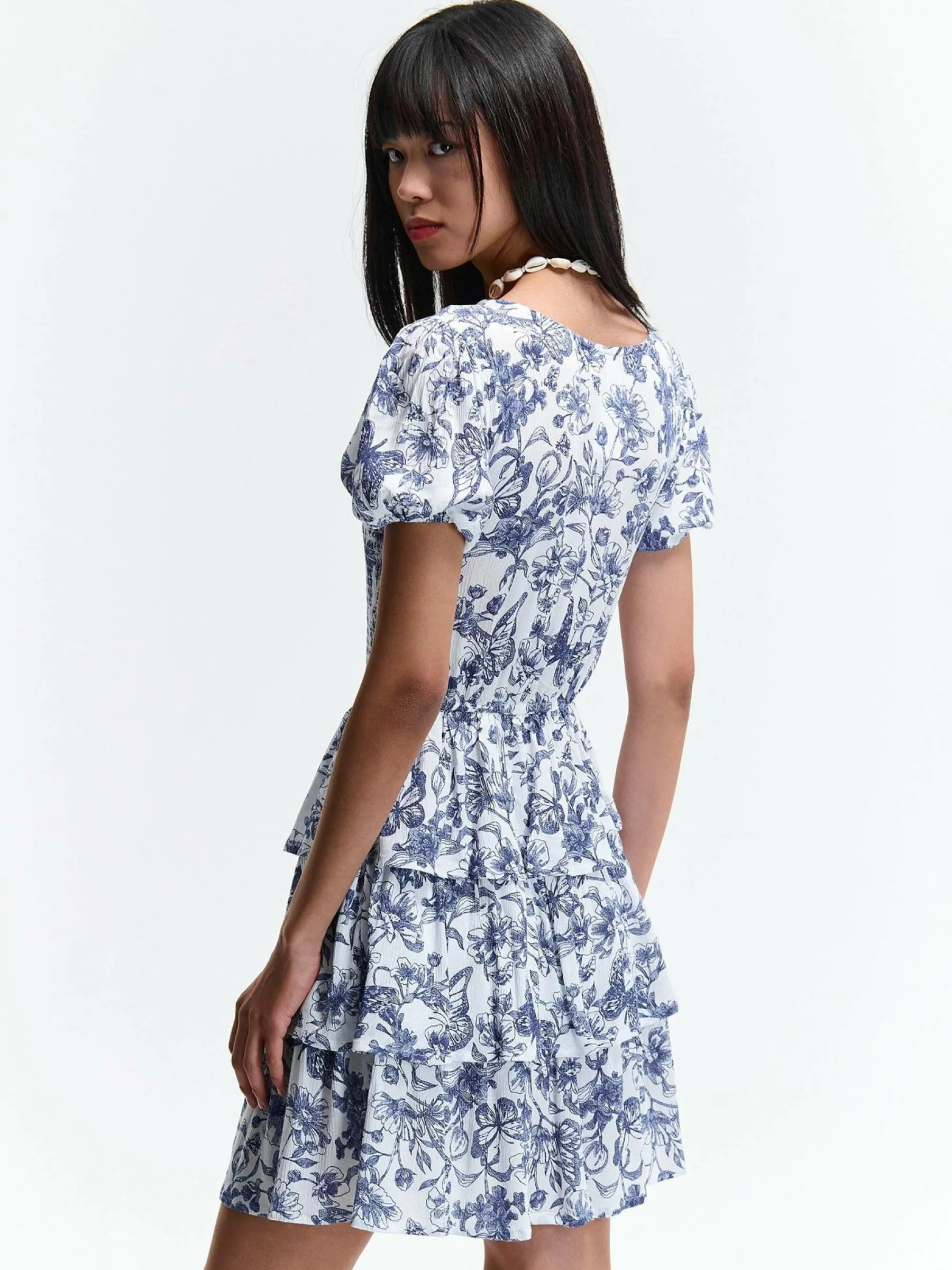 Kolor: niebieskiKrój: z falbanąTyp: sukienkaRekaw: krótki rękawDługość: miniPattern style: kwiatoweDetal: nad gł…
