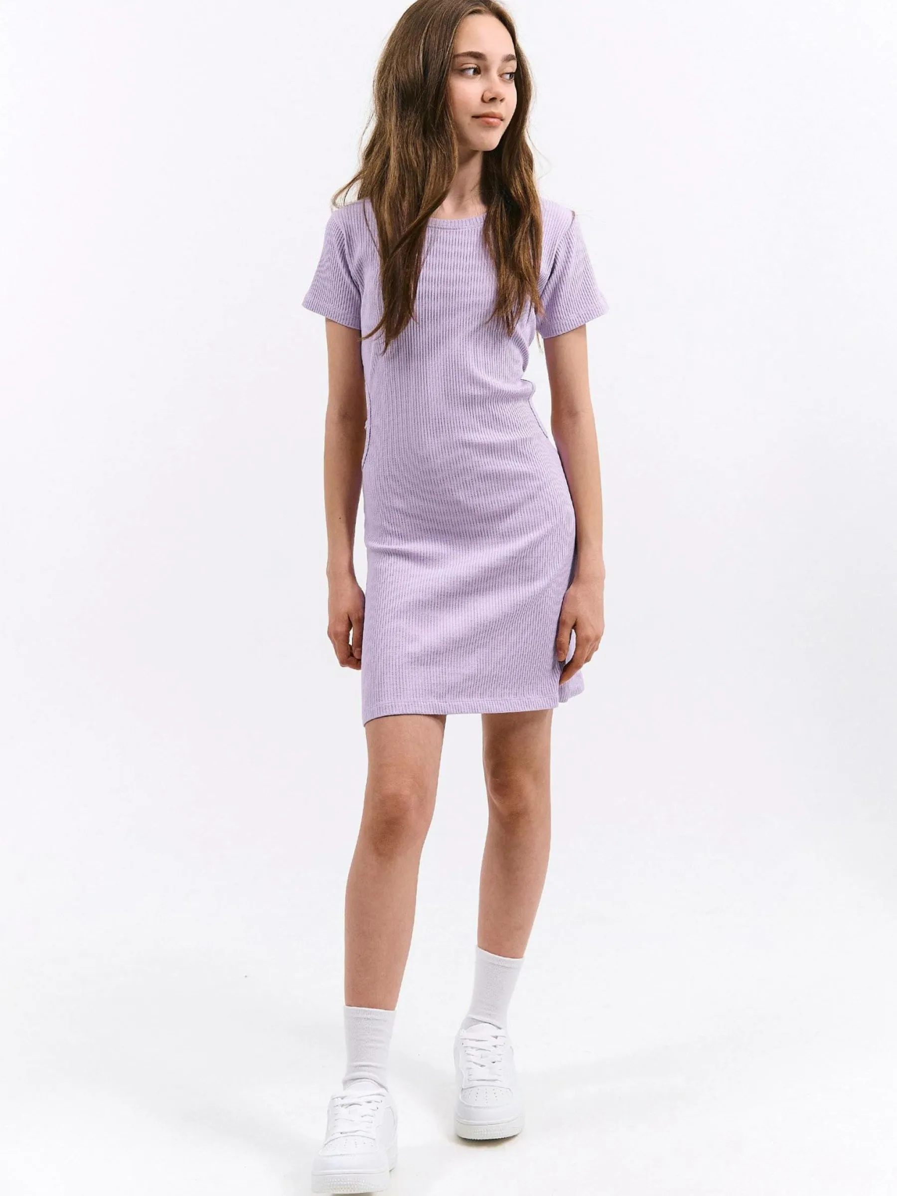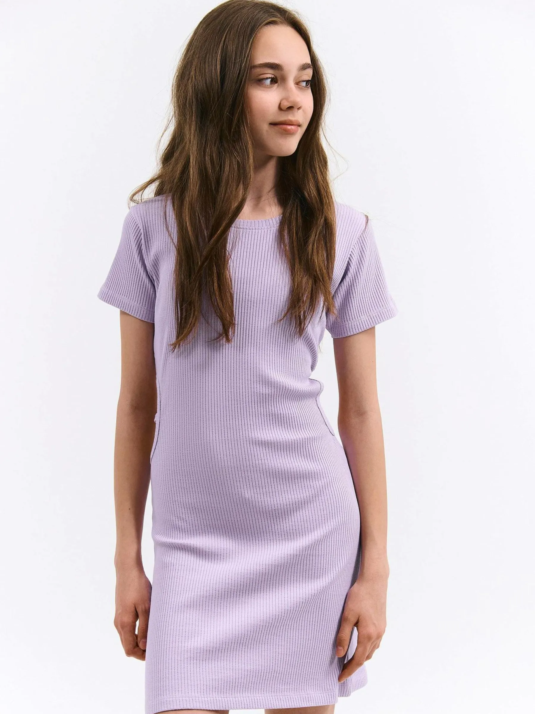 Kolor: purpurowyKrój: regularTyp: sukienkaRekaw: krótki rękawDługość: miniPattern style: pojedynczy kolor, żebrow…