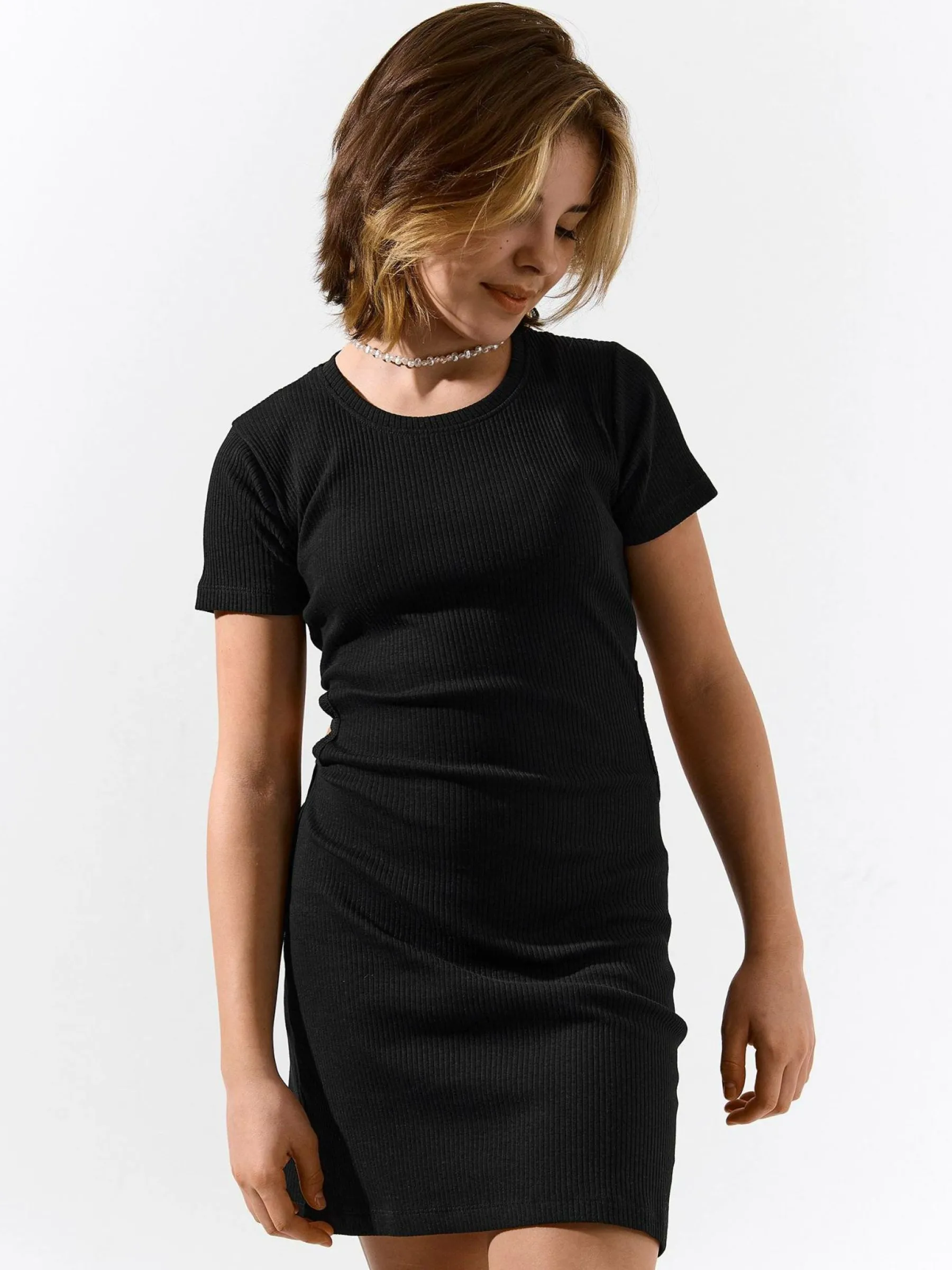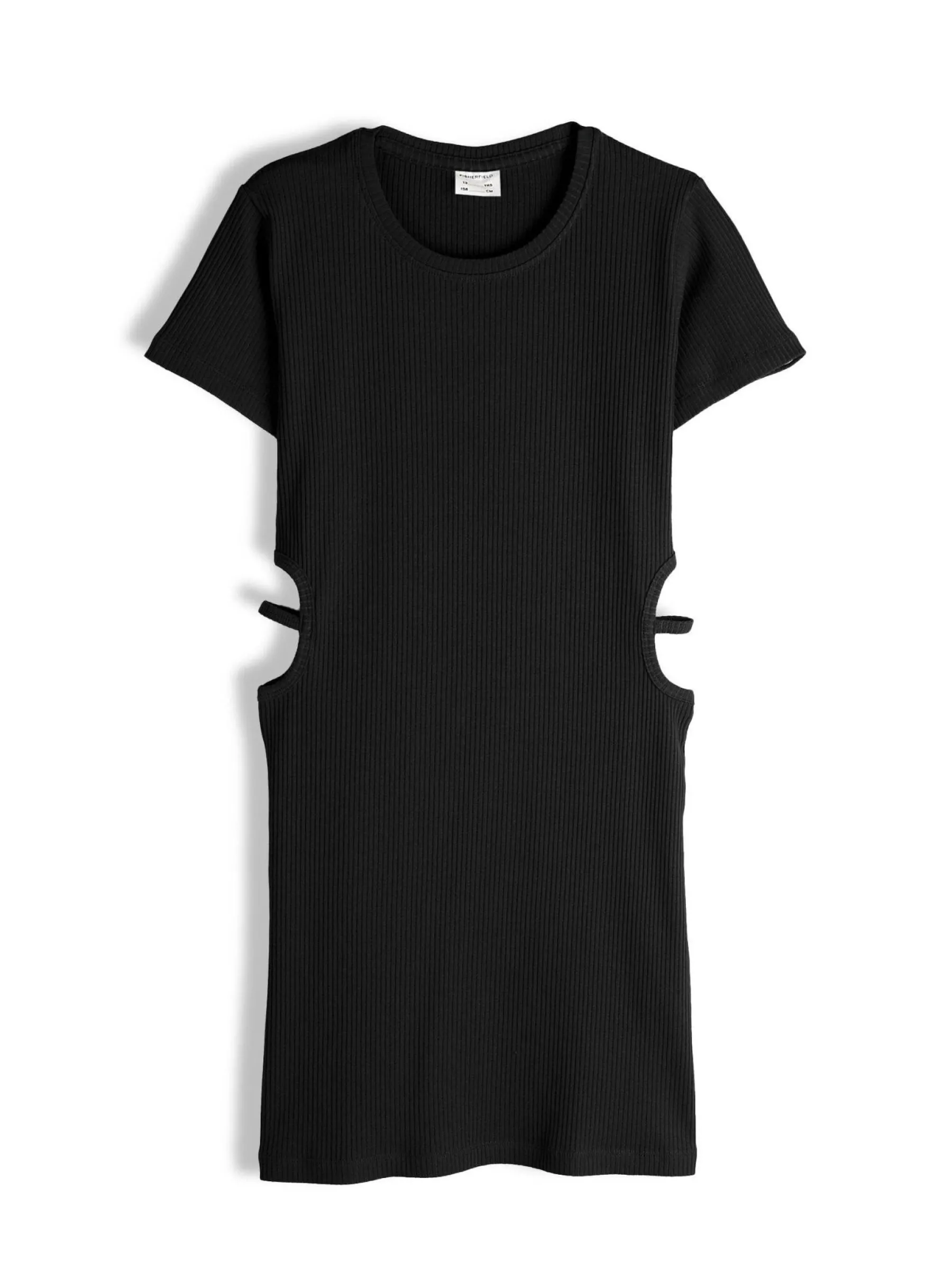 Kolor: czarnyKrój: regularTyp: sukienkaRekaw: krótki rękawDługość: miniPattern style: pojedynczy kolorDetal: nad g…