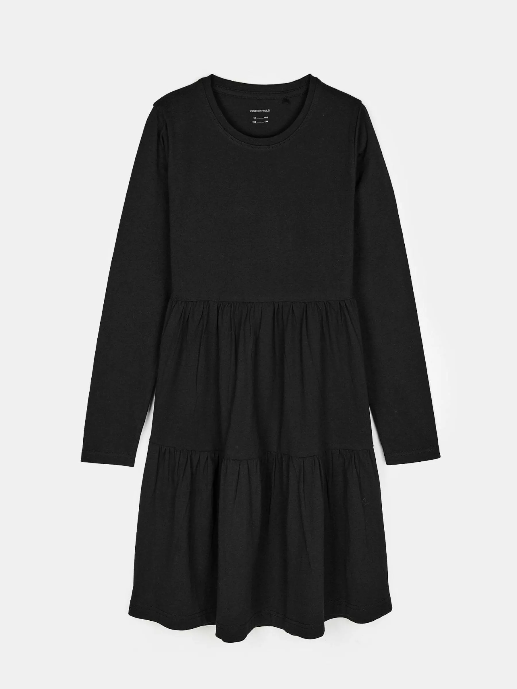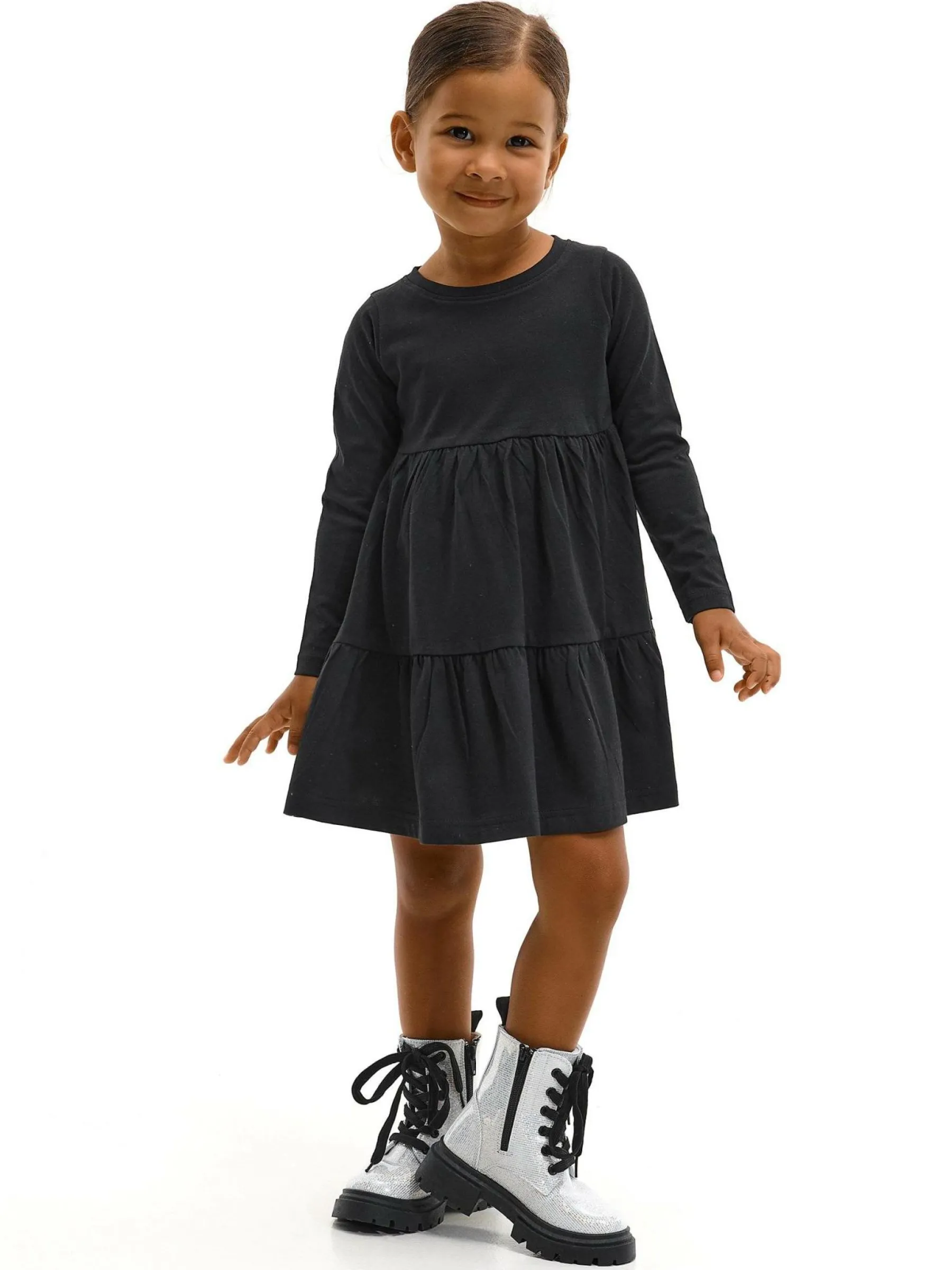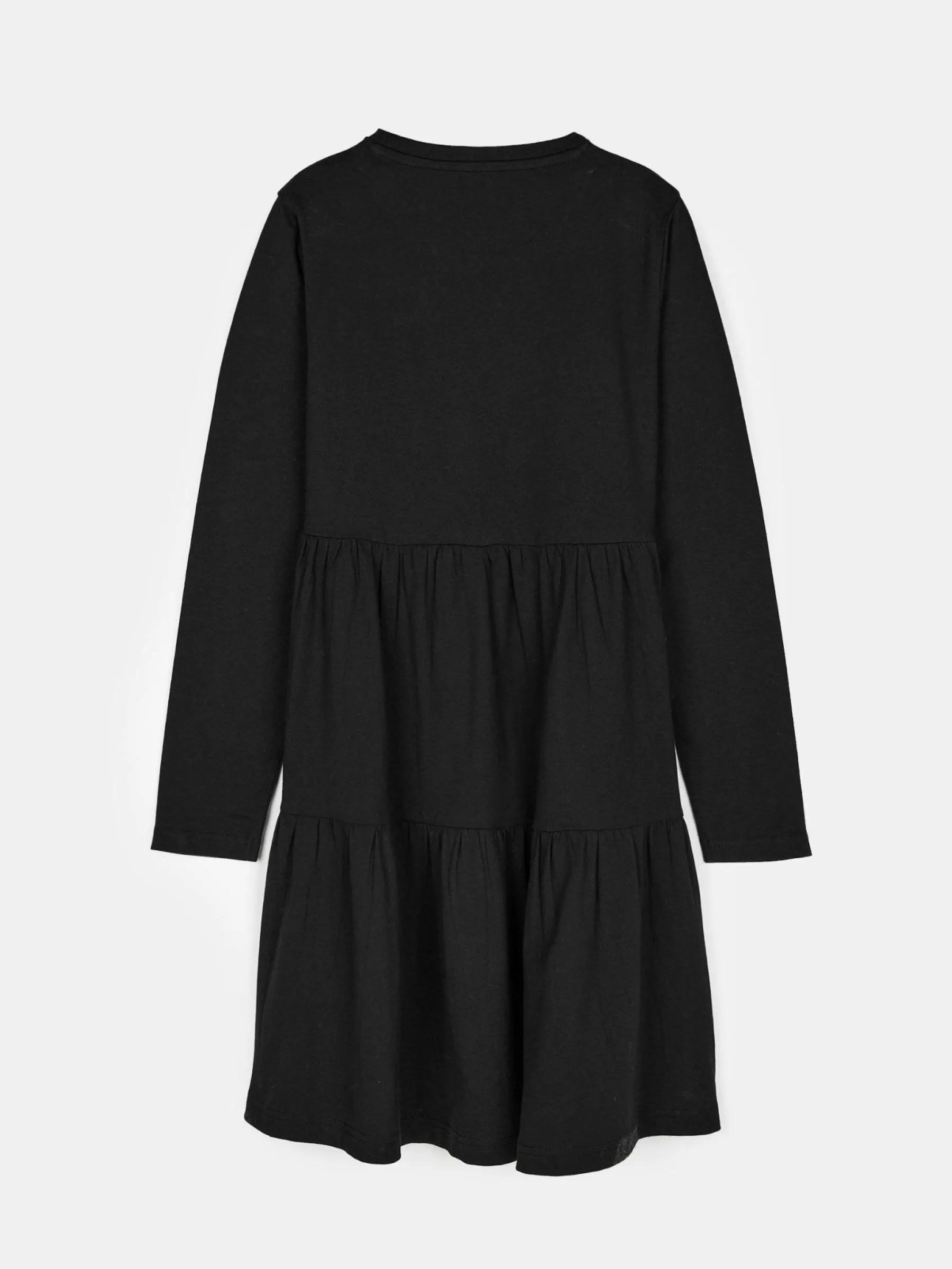 Kolor: czarnyKrój: z falbanąTyp: sukienkaRekaw: długi rękawDługość: miniPattern style: pojedynczy kolorDetal: nad…