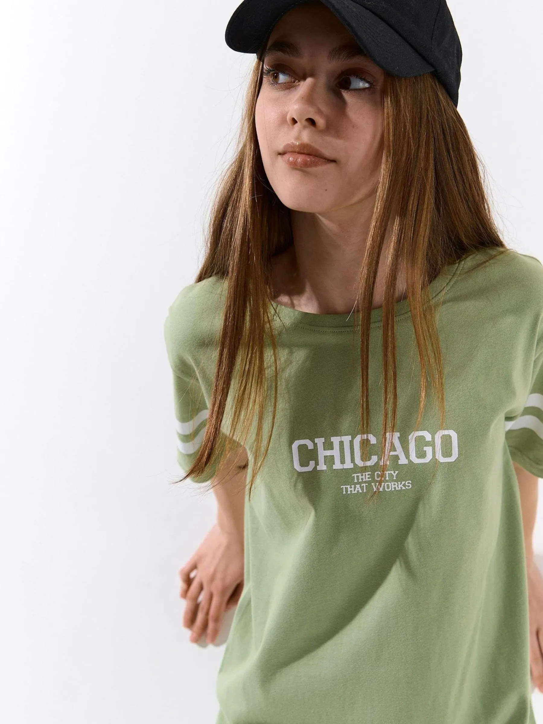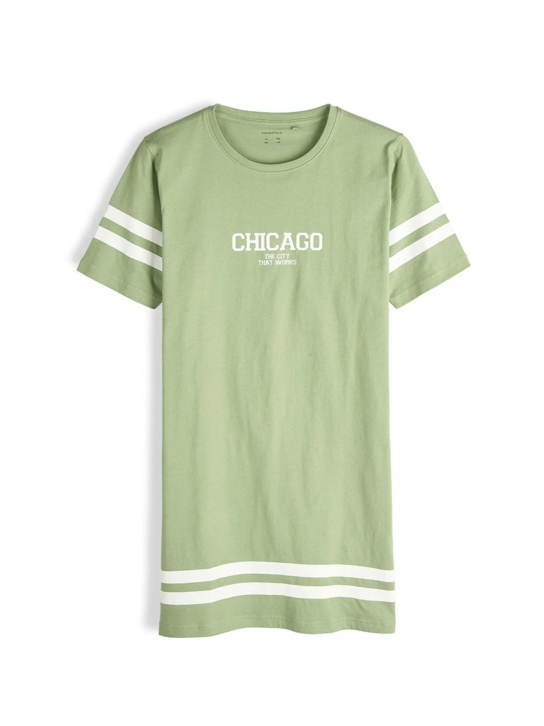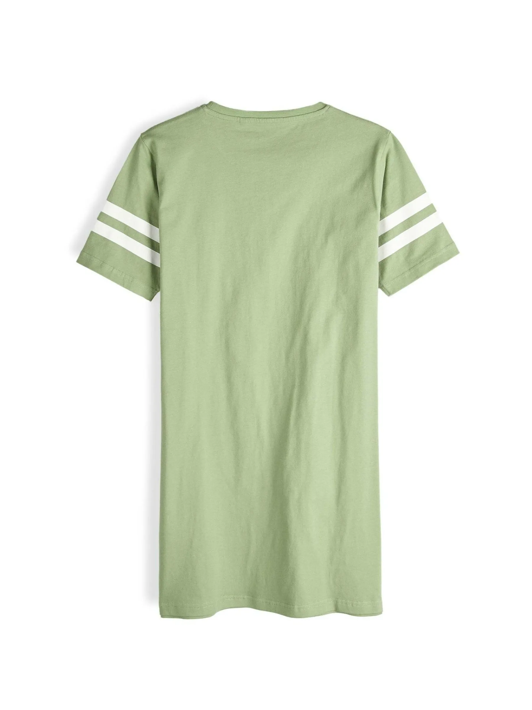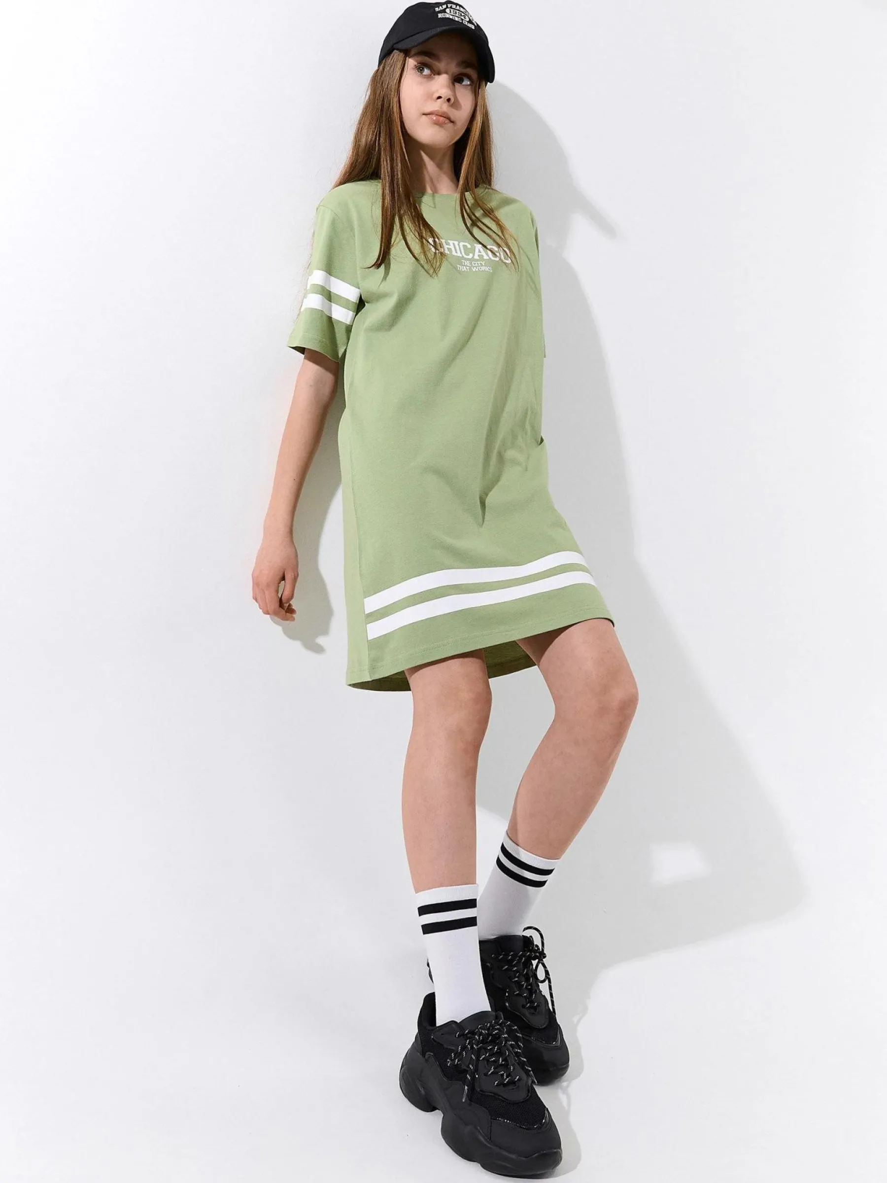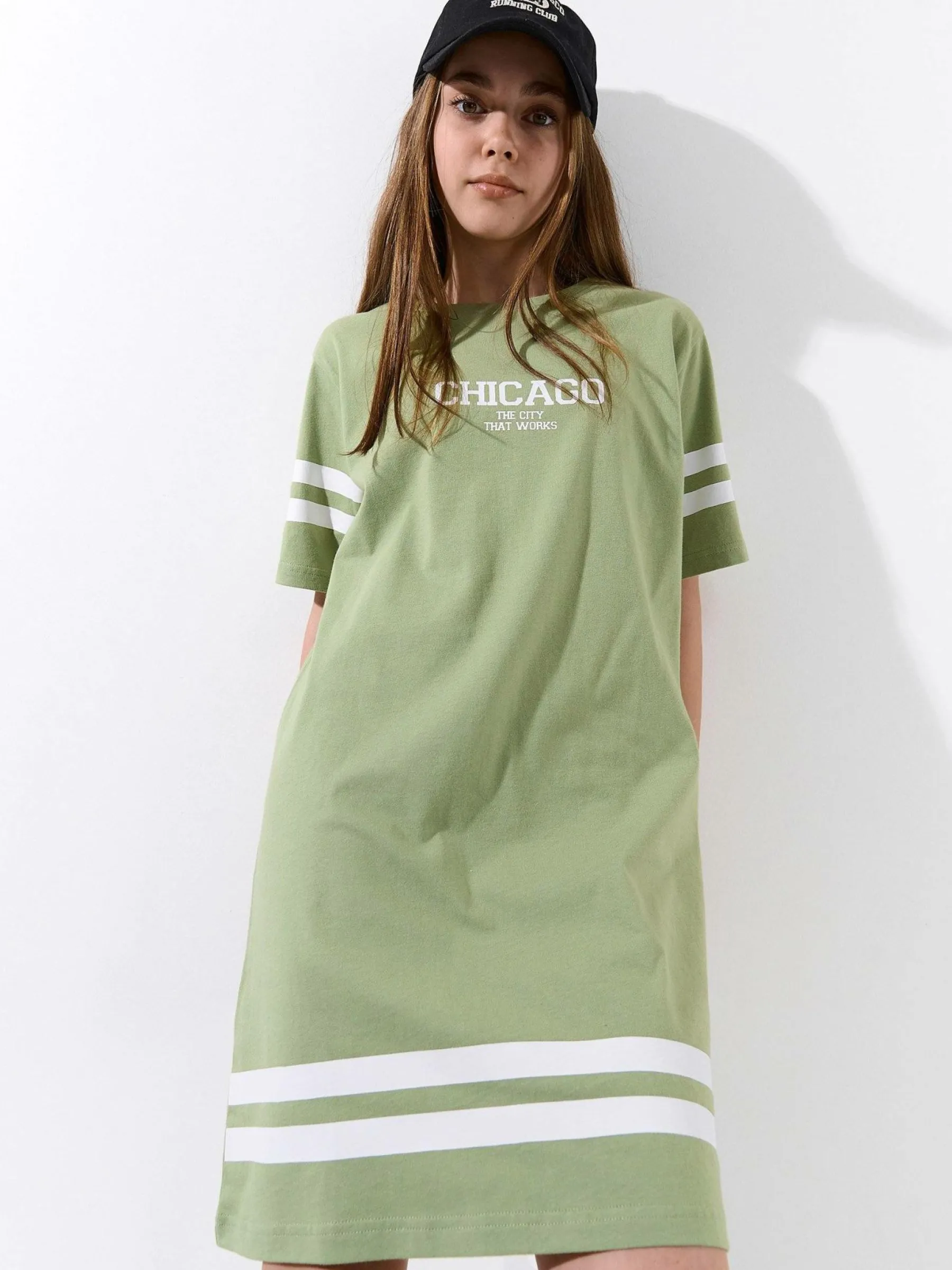 Kolor: zielonyKrój: koszulkoweTyp: sukienkaRekaw: krótki rękawDługość: miniPattern style: z napisemDetal: nad gło…