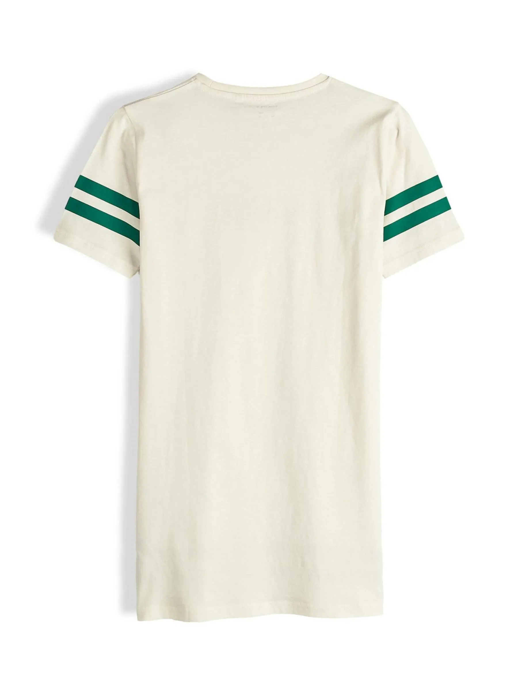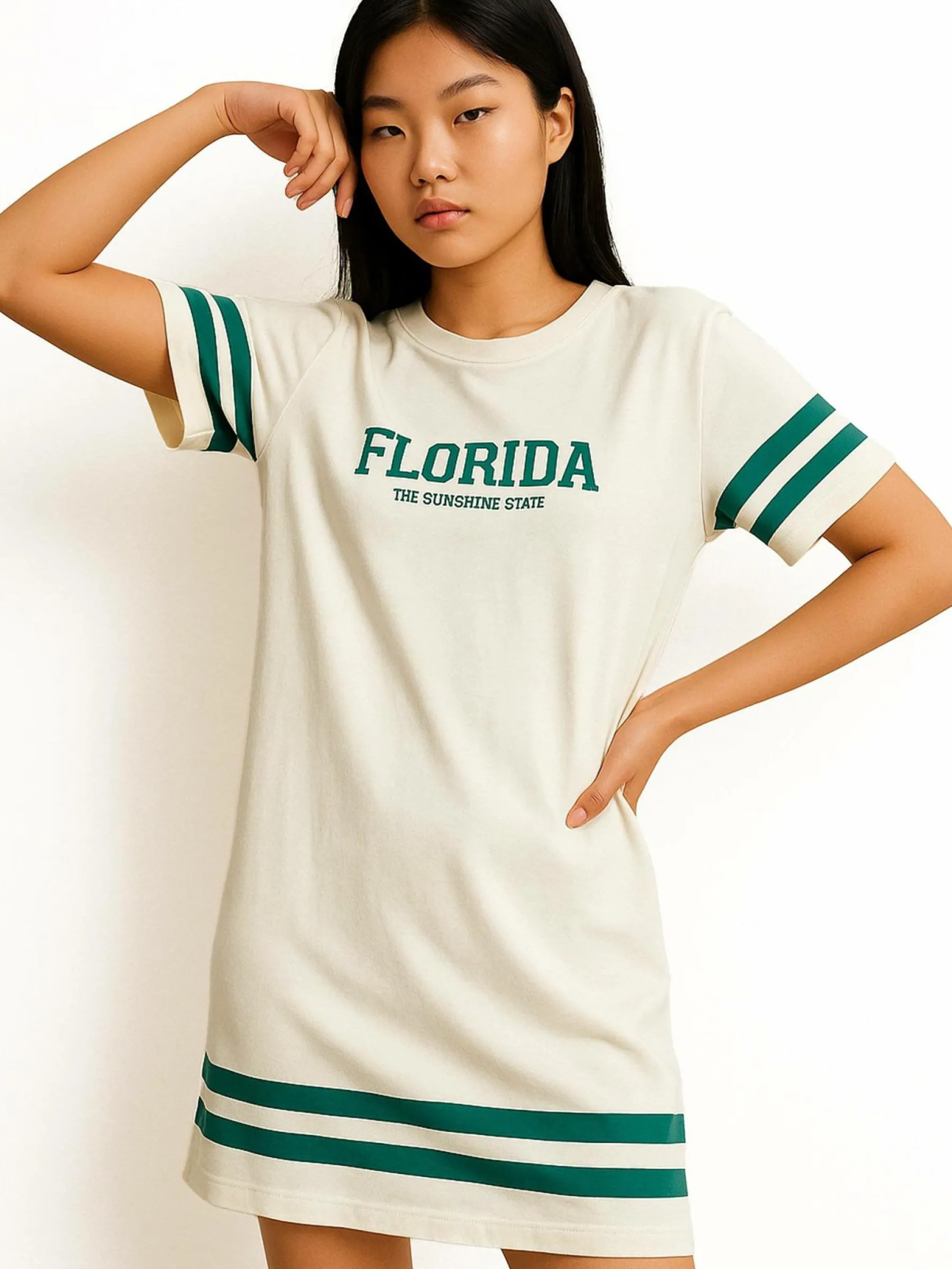 Kolor: beżowyKrój: podstawowyTyp: sukienkaRekaw: krótki rękawDługość: miniPattern style: z napisemDetal: nad gło…
