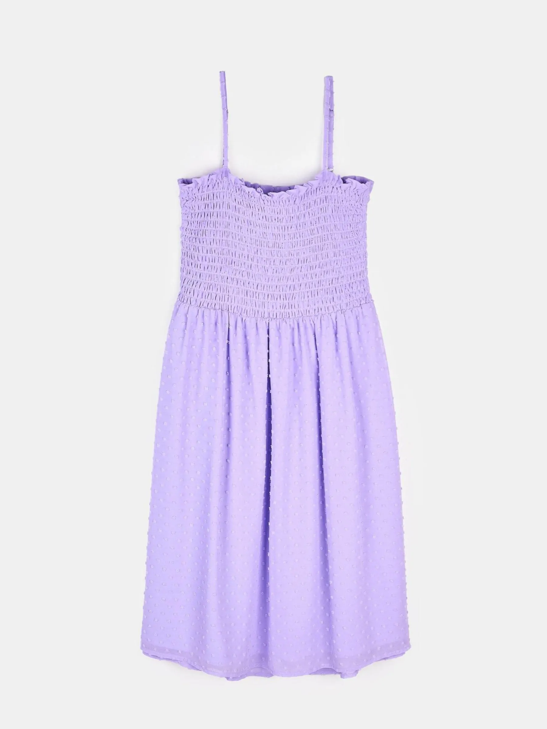 Kolor: purpurowyKrój: z marszczeniemTyp: sukienkaRekaw: bez rękawówDługość: miniPattern style: strukturowane, poje…
