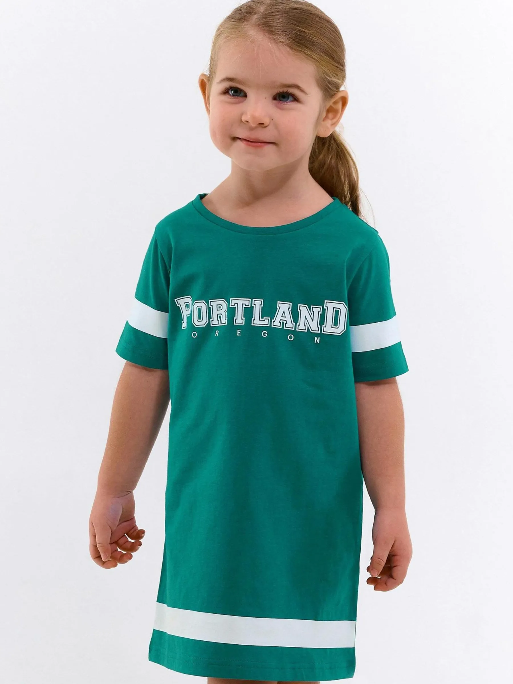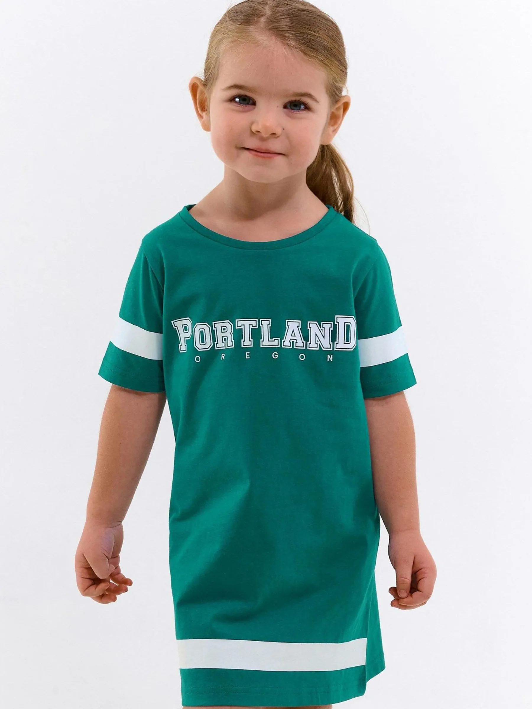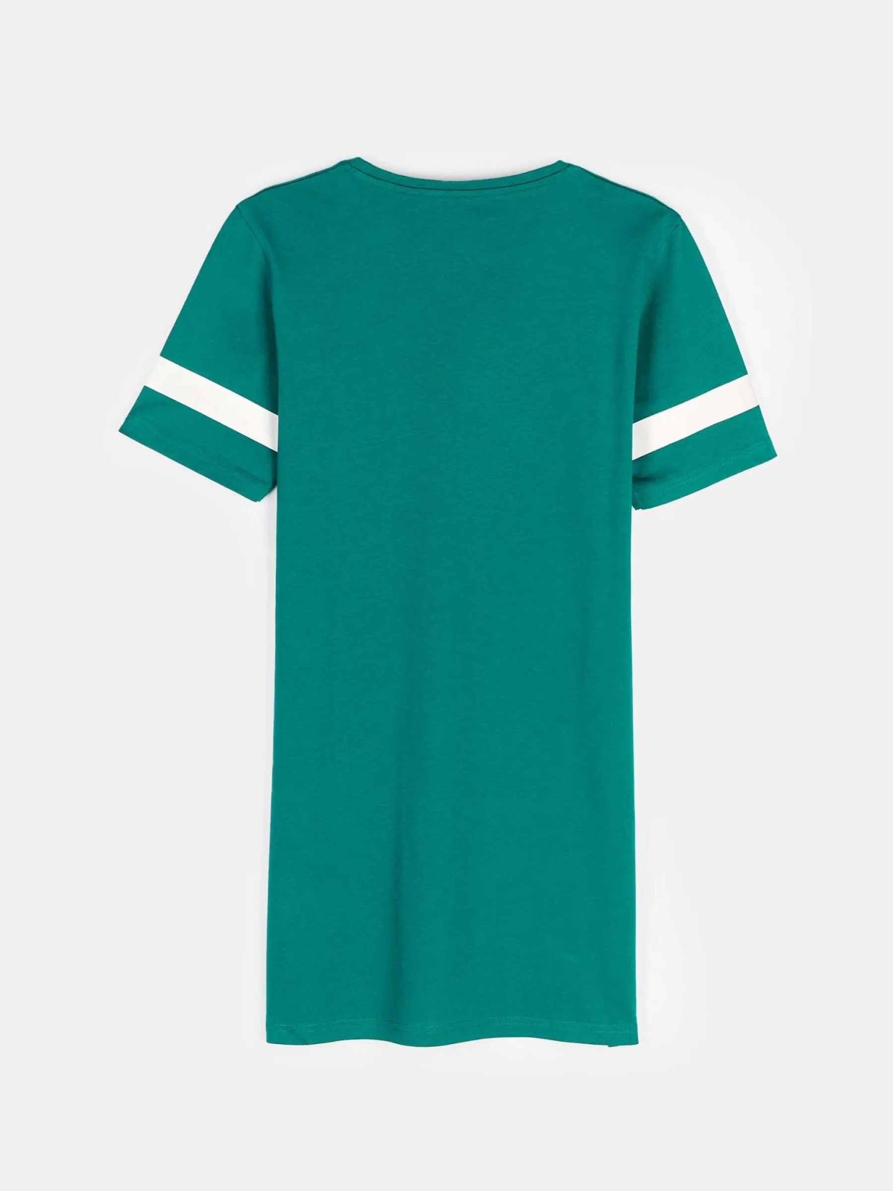 Kolor: zielonyKrój: podstawowyTyp: sukienkaRekaw: krótki rękawDługość: miniPattern style: z napisemDetal: nad gło…