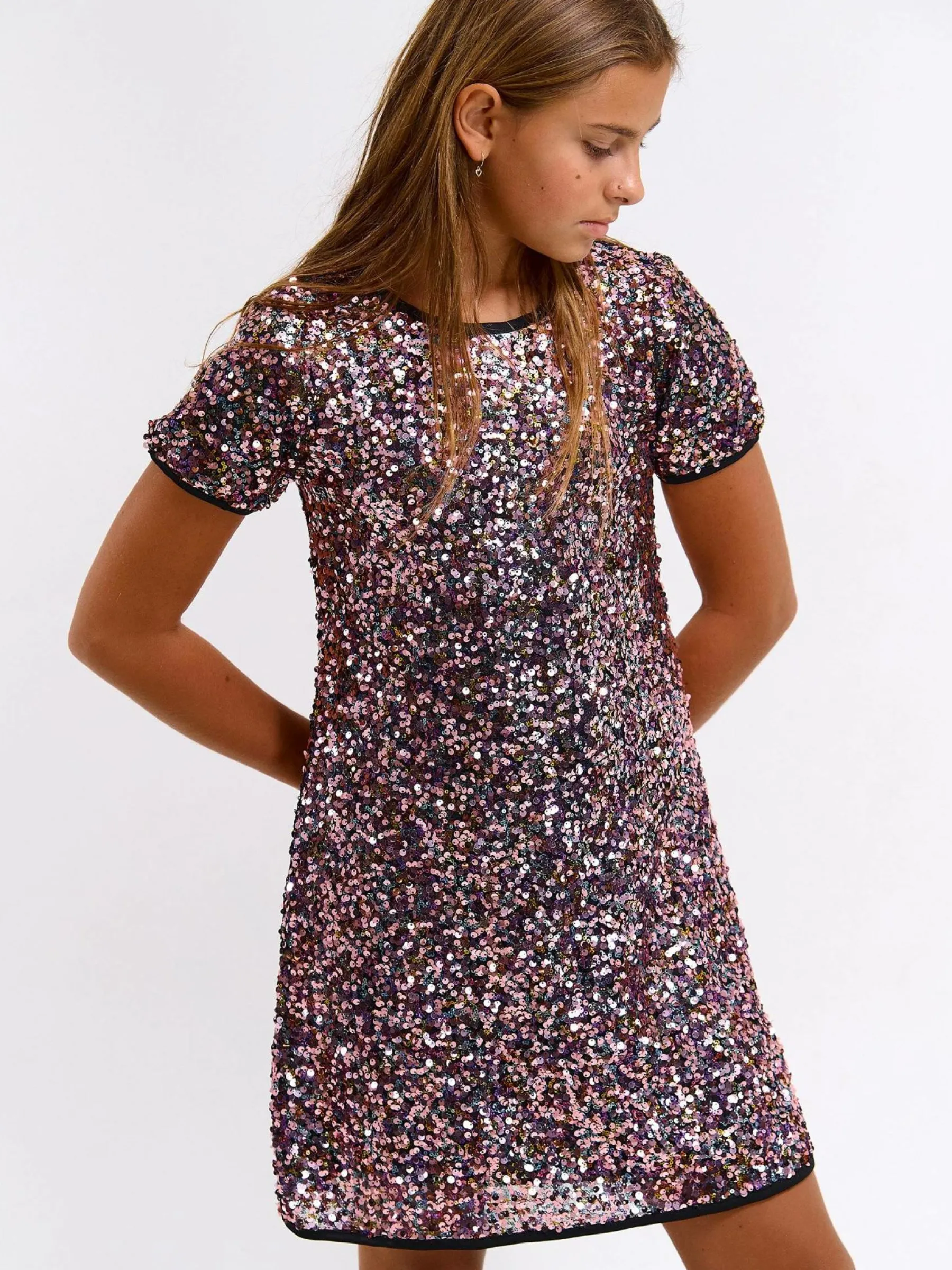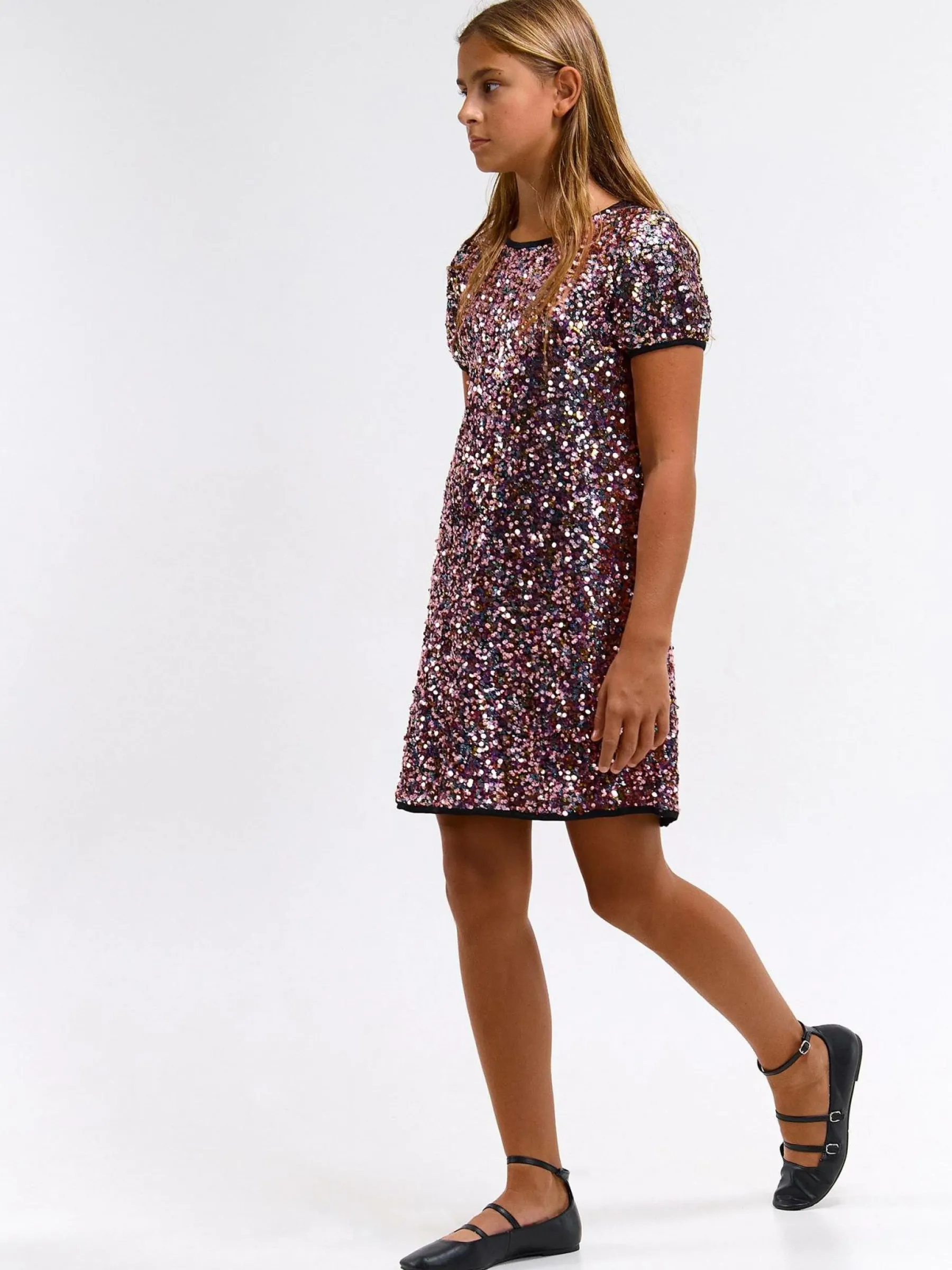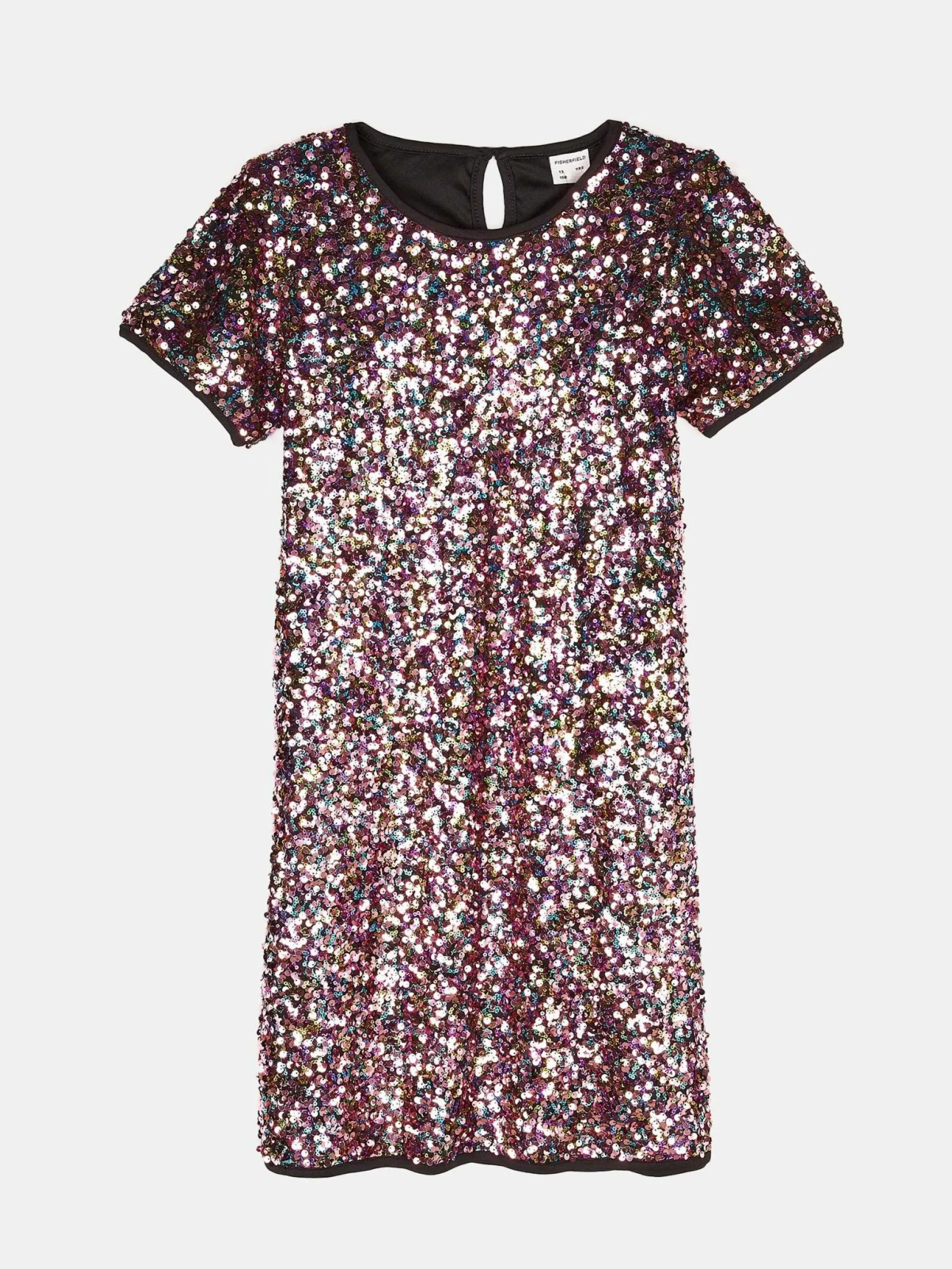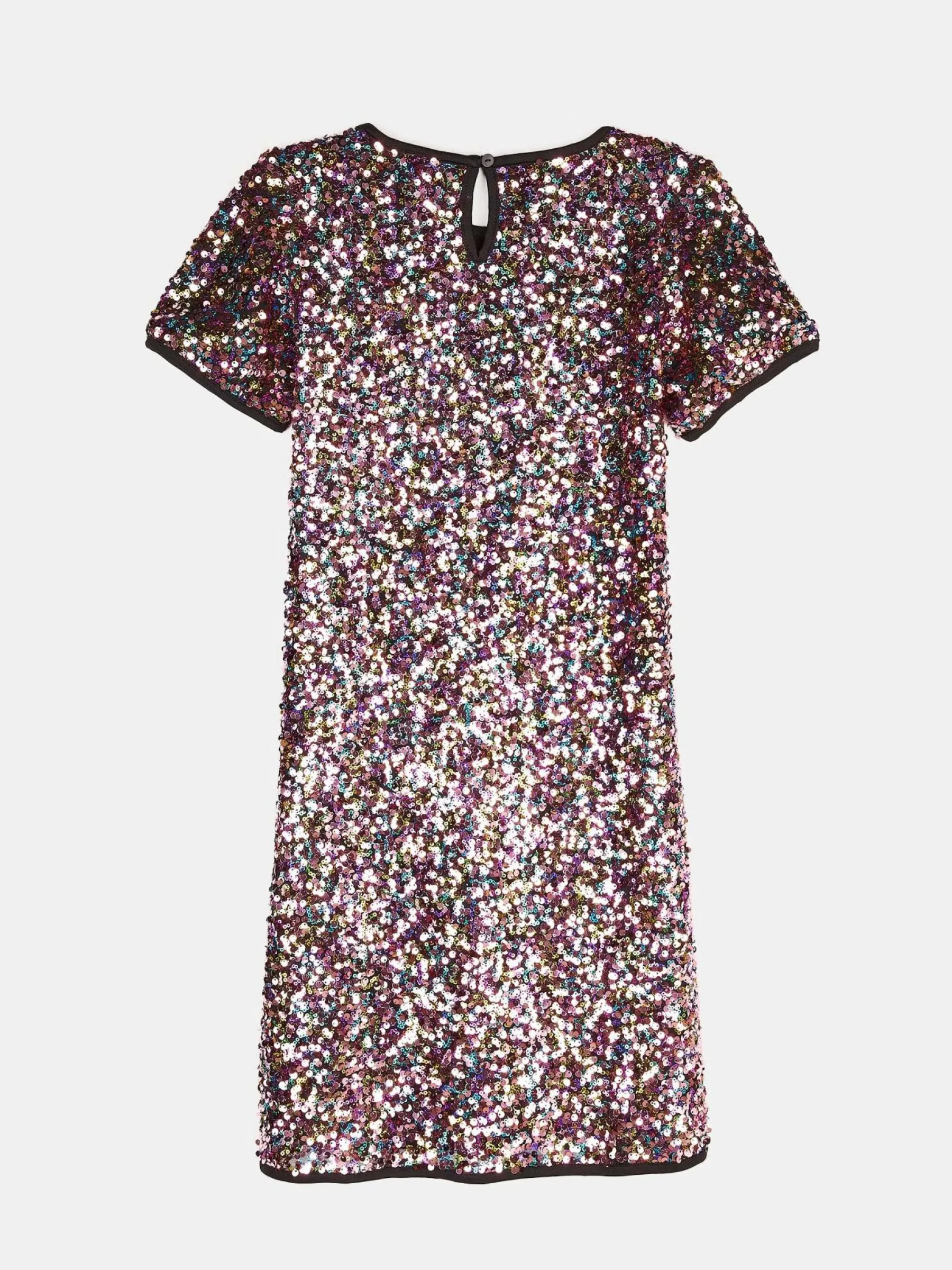 Kolor: czarnyKrój: regularTyp: sukienkaRekaw: krótki rękawDługość: miniPattern style: z cekinami, wielobarwnyDetal…