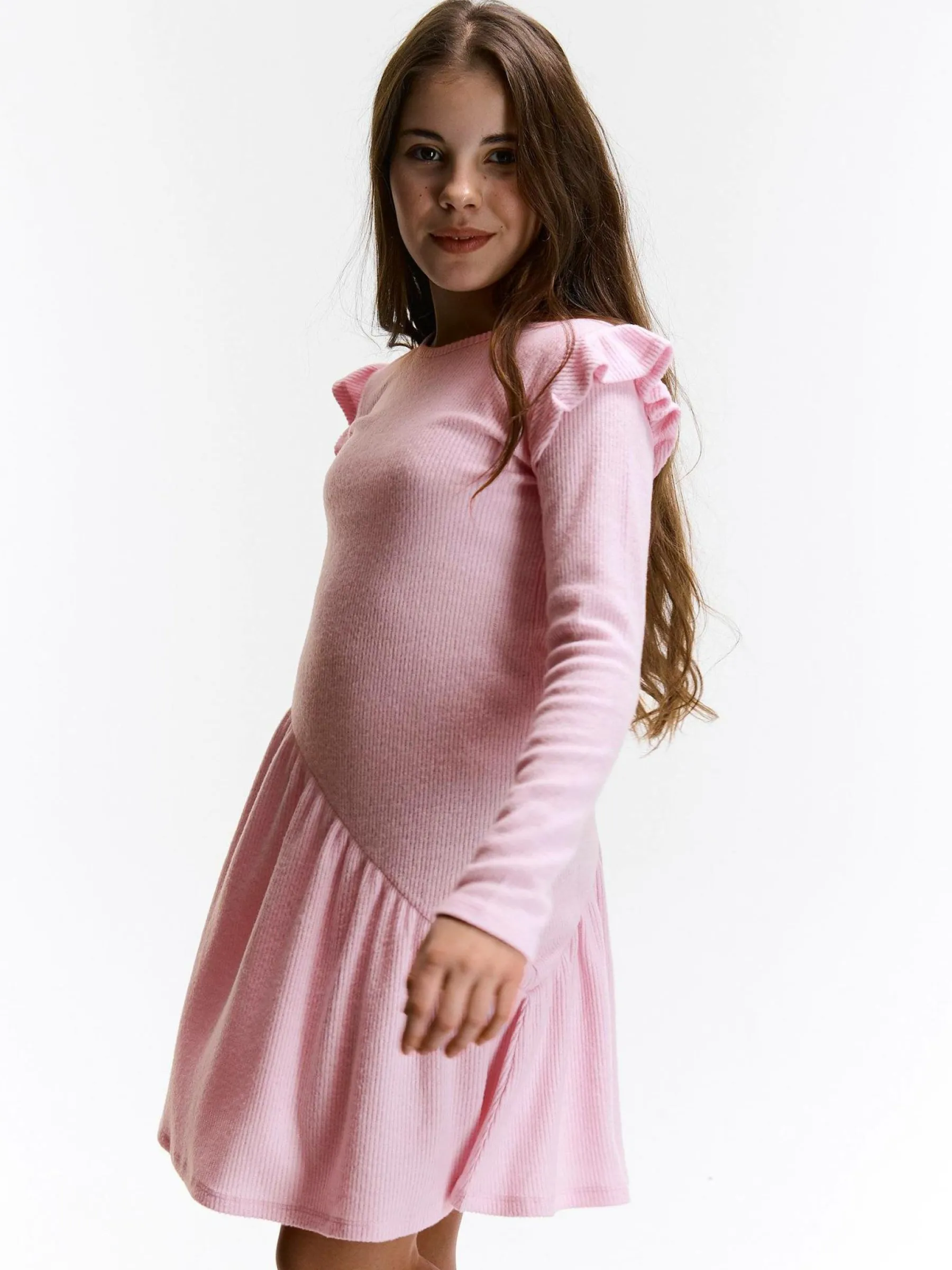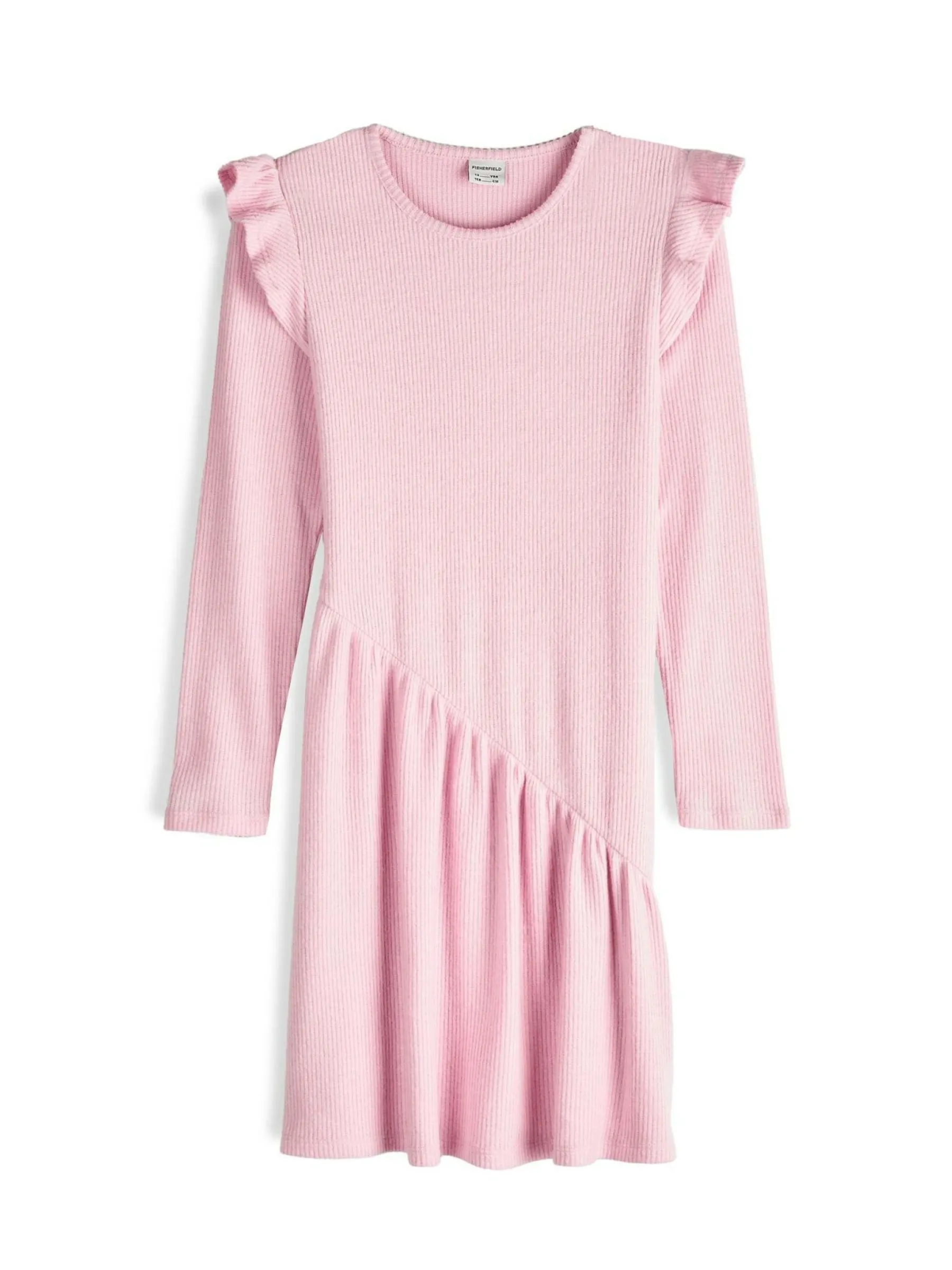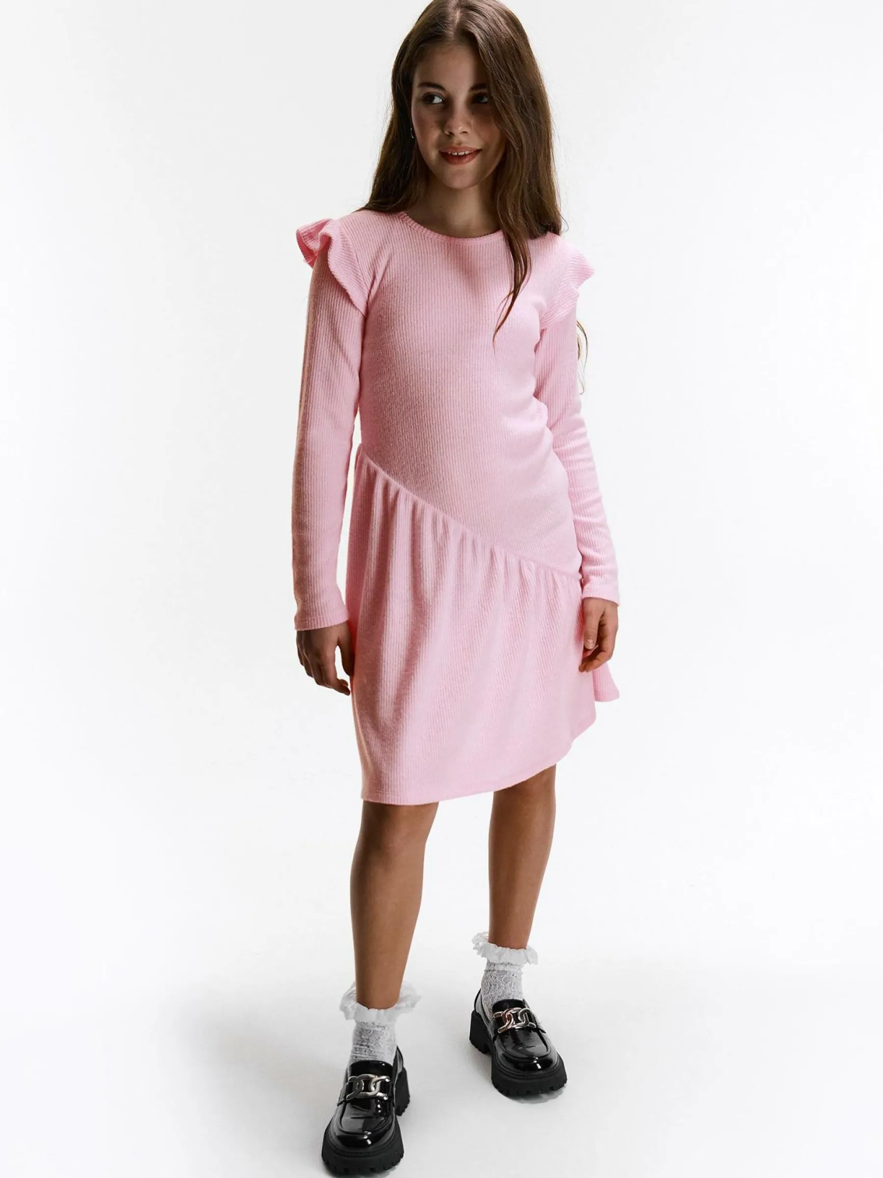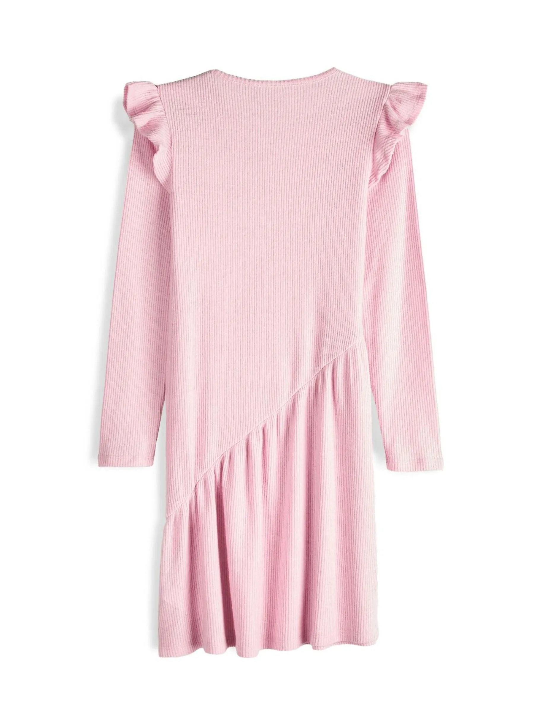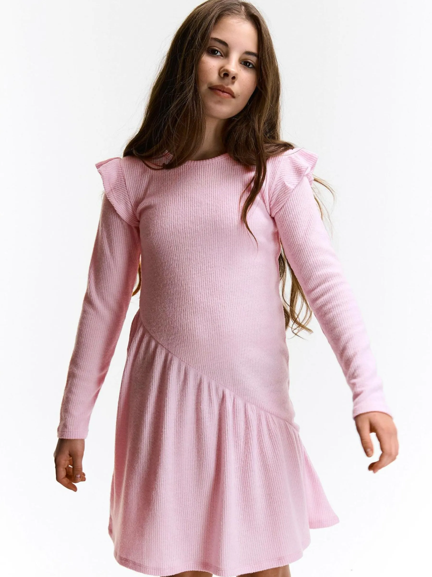 Kolor: różowyKrój: asymetryczneTyp: sukienkaRekaw: długi rękawDługość: miniPattern style: pojedynczy kolor, żeb…