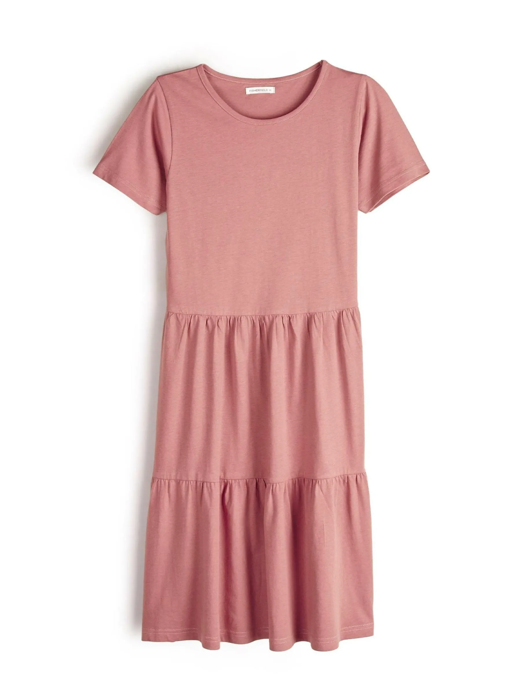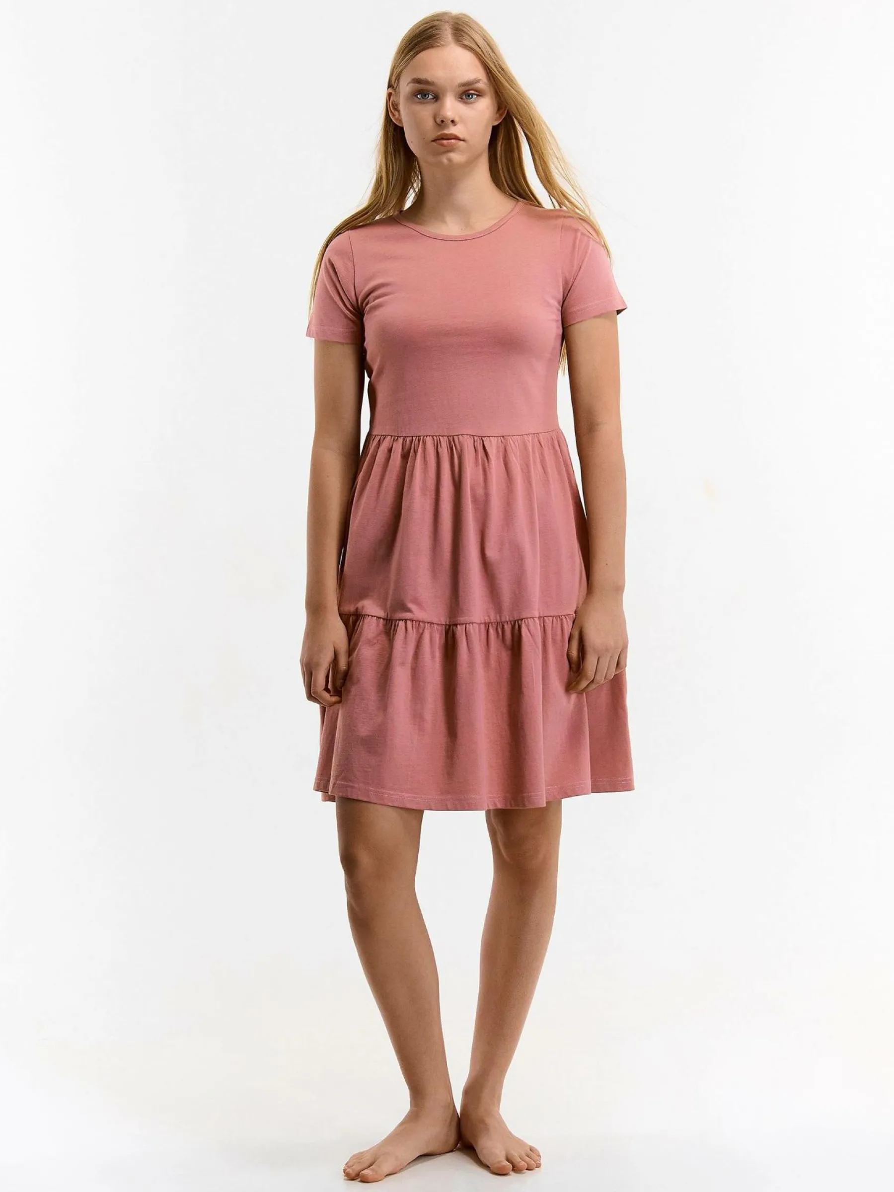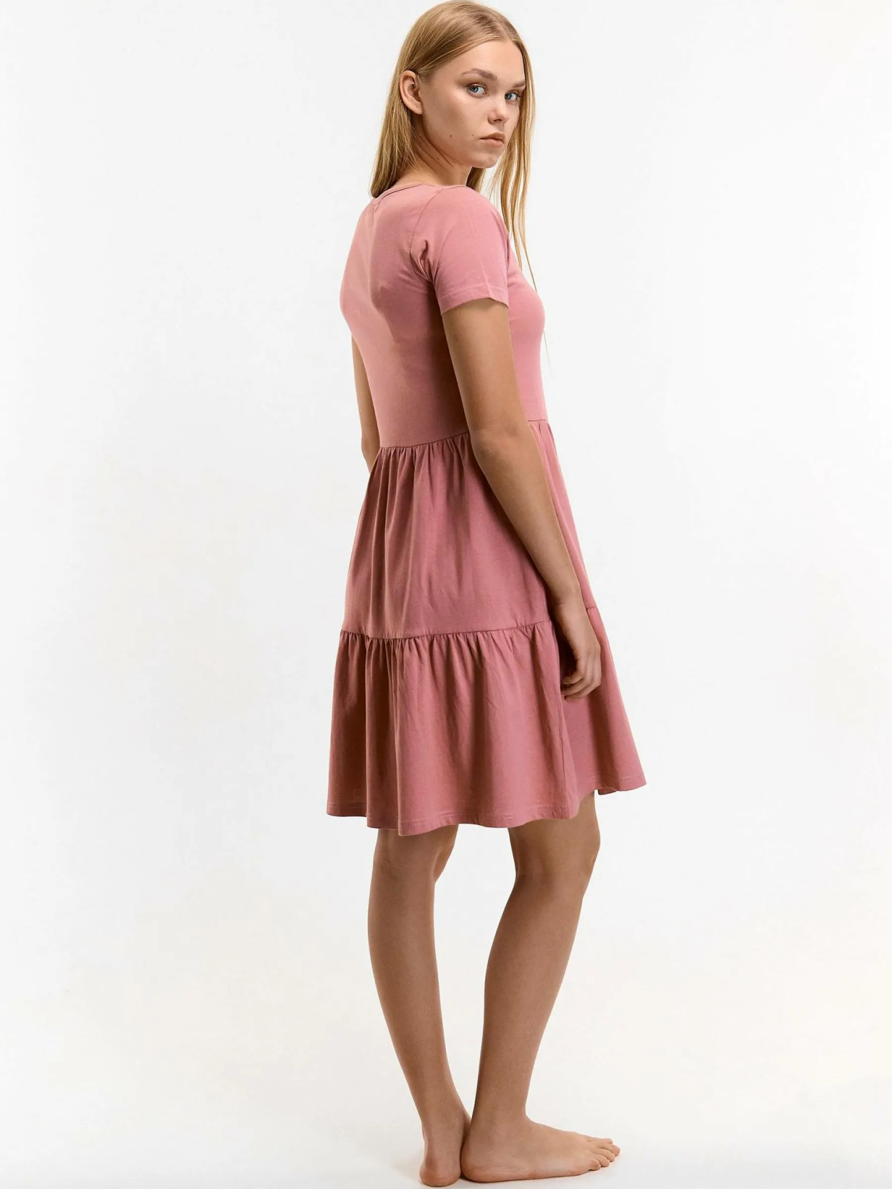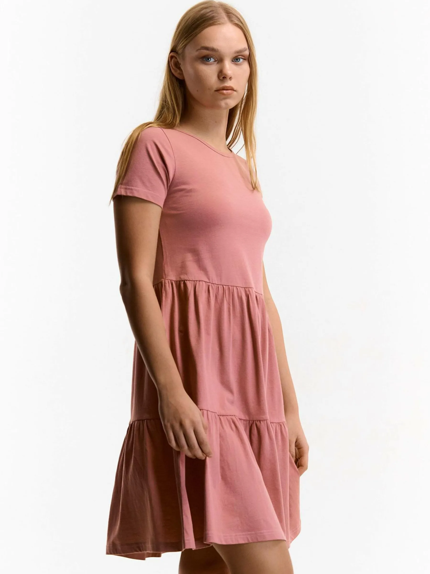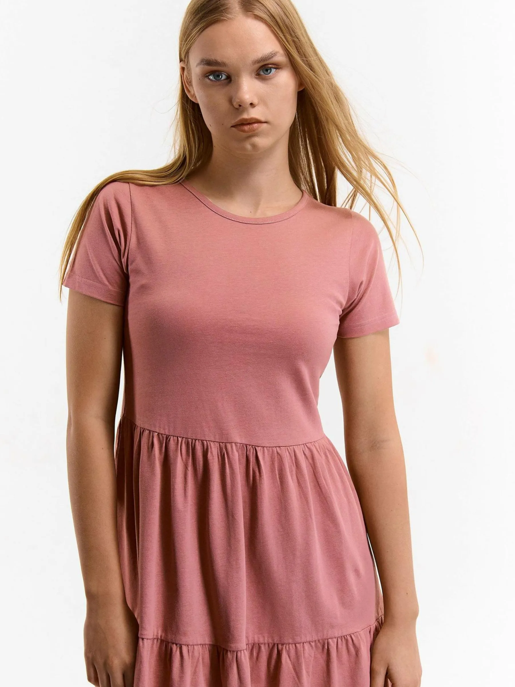 Kolor: różowyKrój: z falbanąTyp: sukienkaRekaw: krótki rękawDługość: miniPattern style: pojedynczy kolorDetal: …