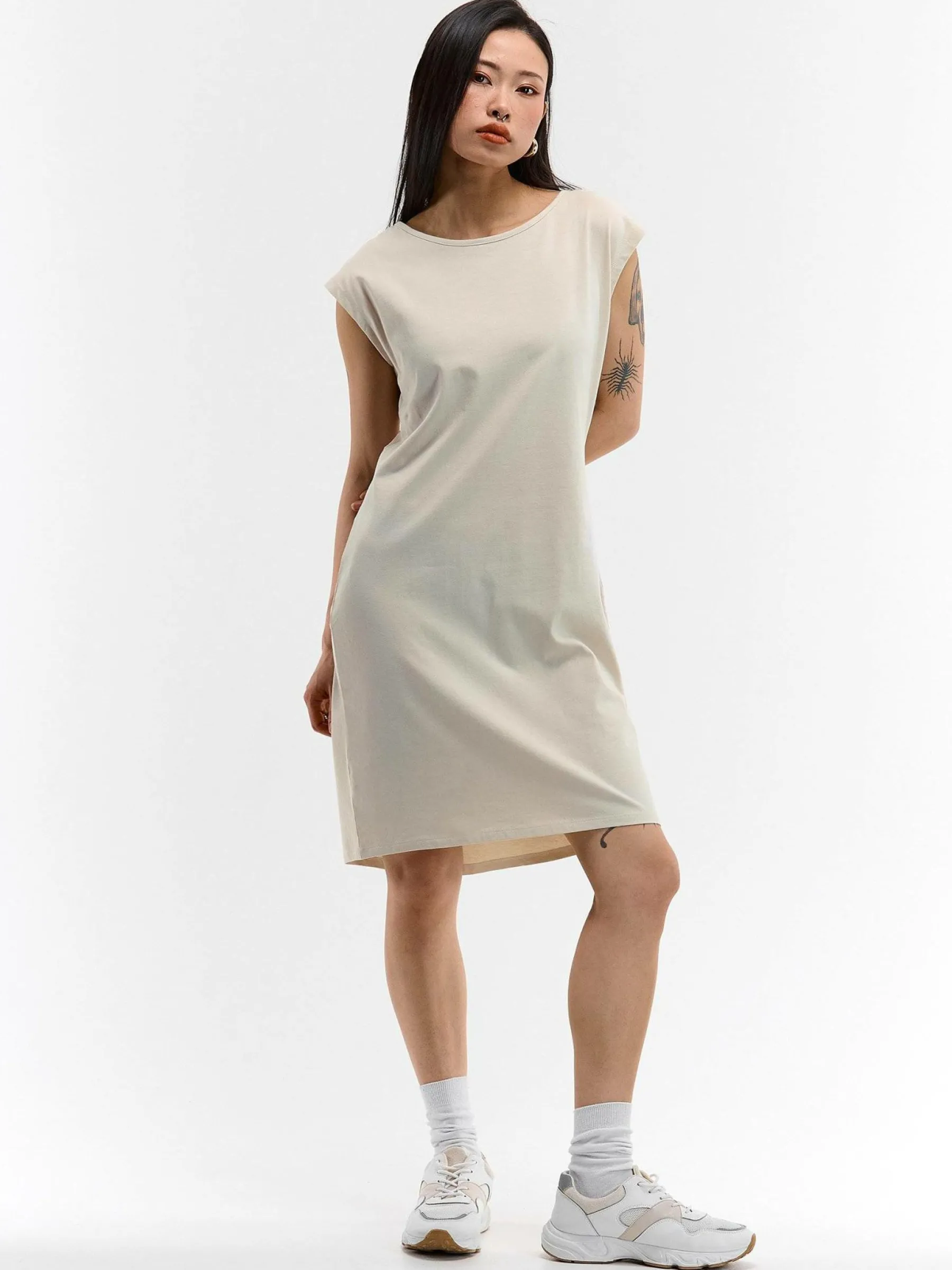 Kolor: beżowyKrój: regularTyp: sukienkaRekaw: bez rękawówDługość: miniPattern style: pojedynczy kolorDetal: nad g…