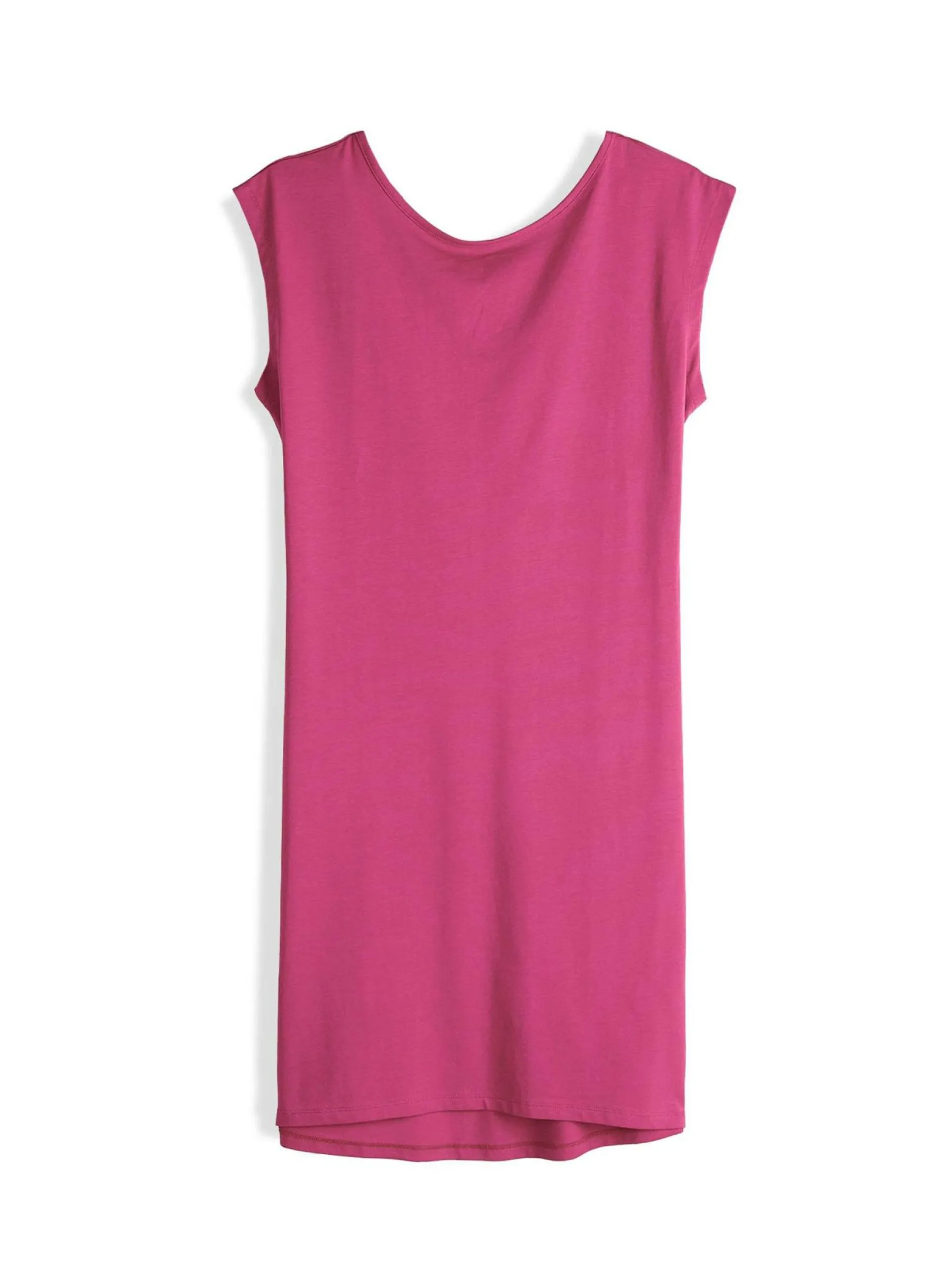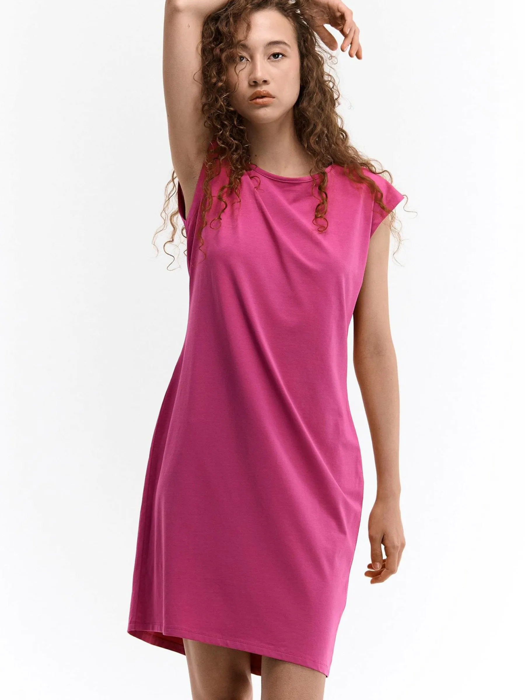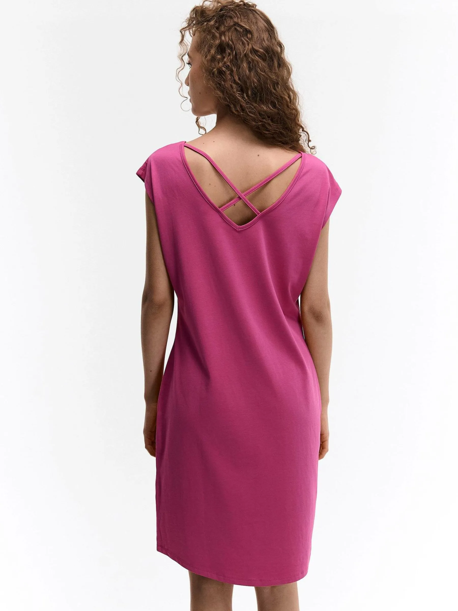 Kolor: różowyKrój: regularTyp: sukienkaRekaw: krótki rękawDługość: miniPattern style: pojedynczy kolorDetal: nad…
