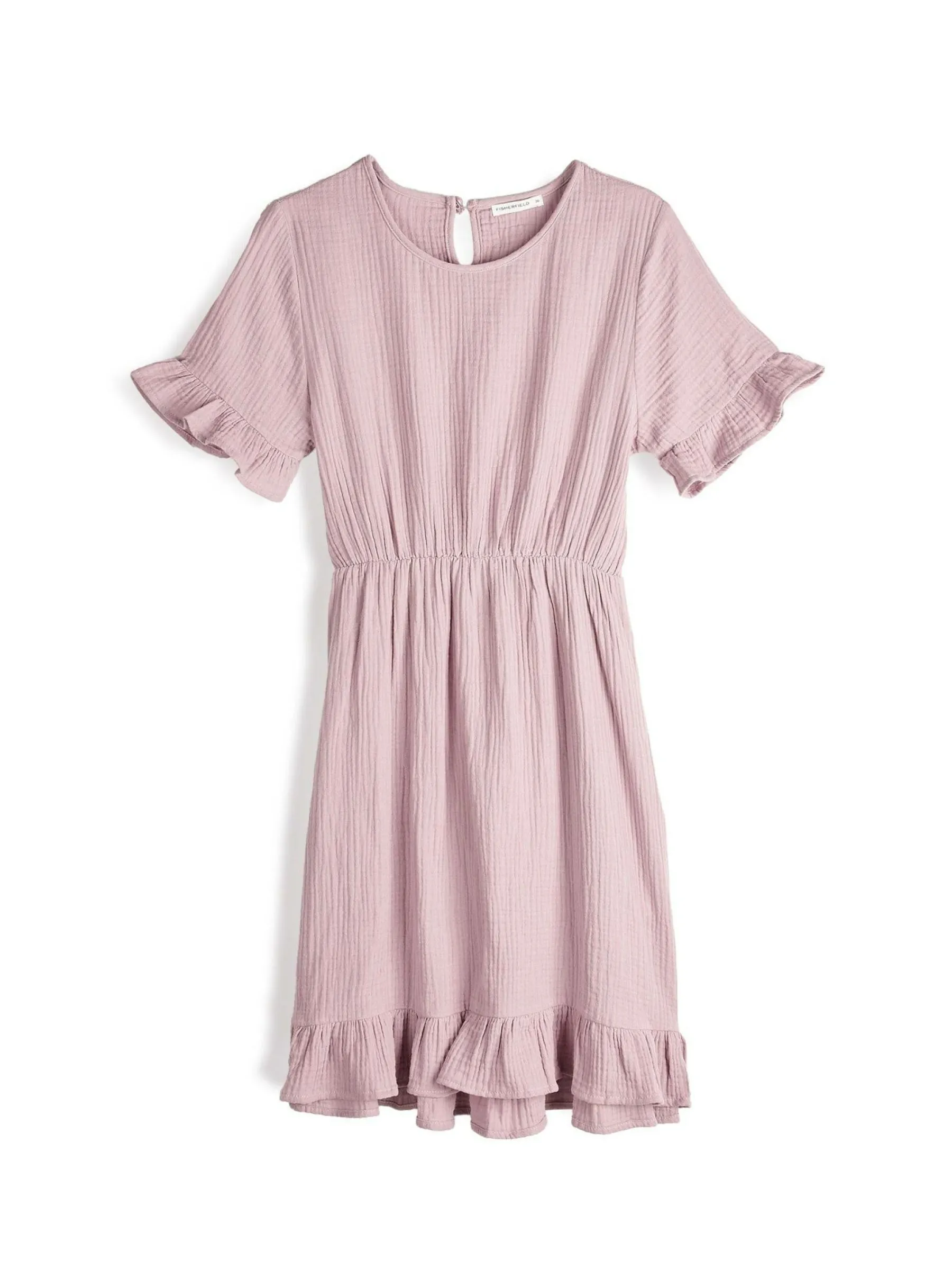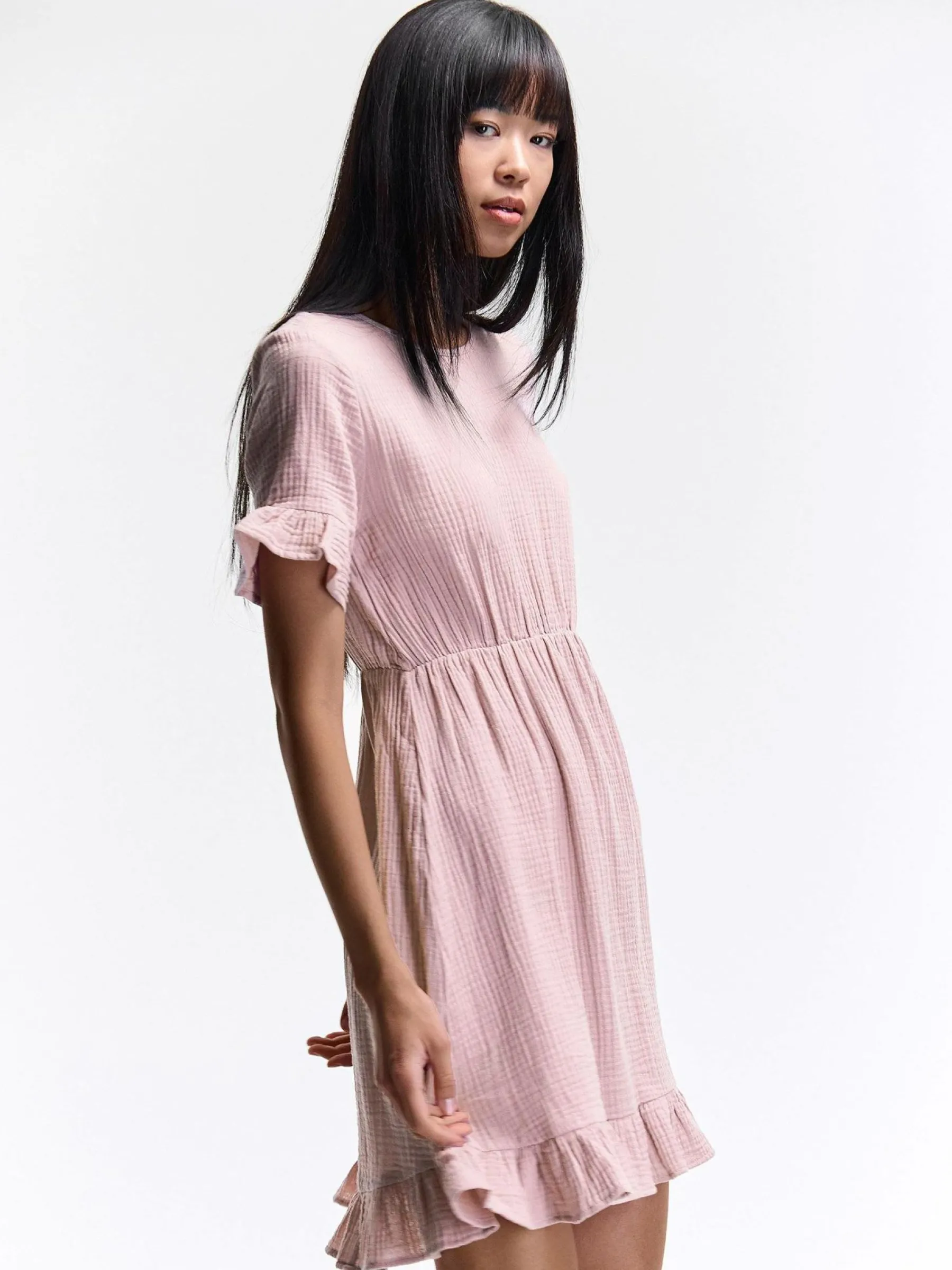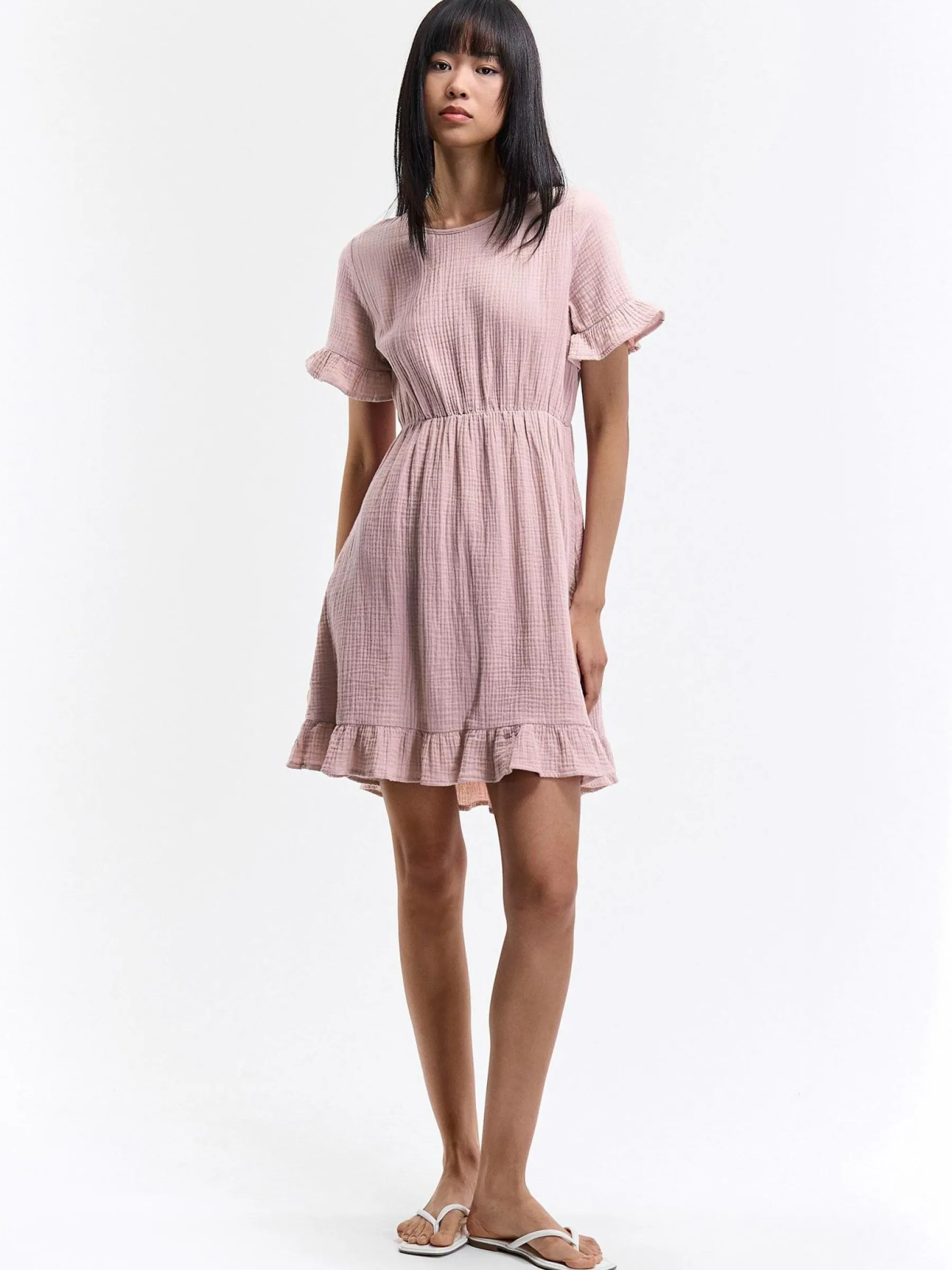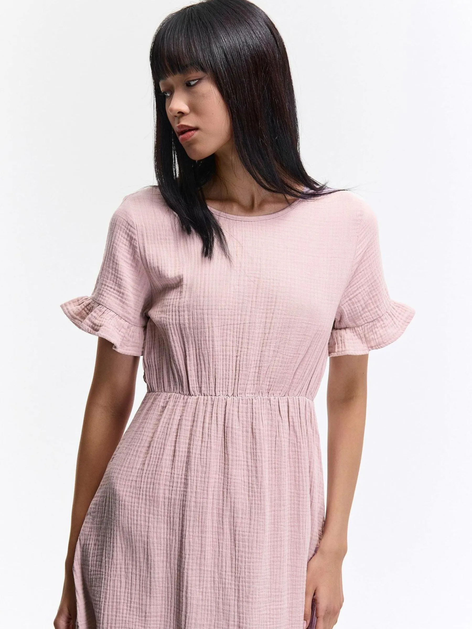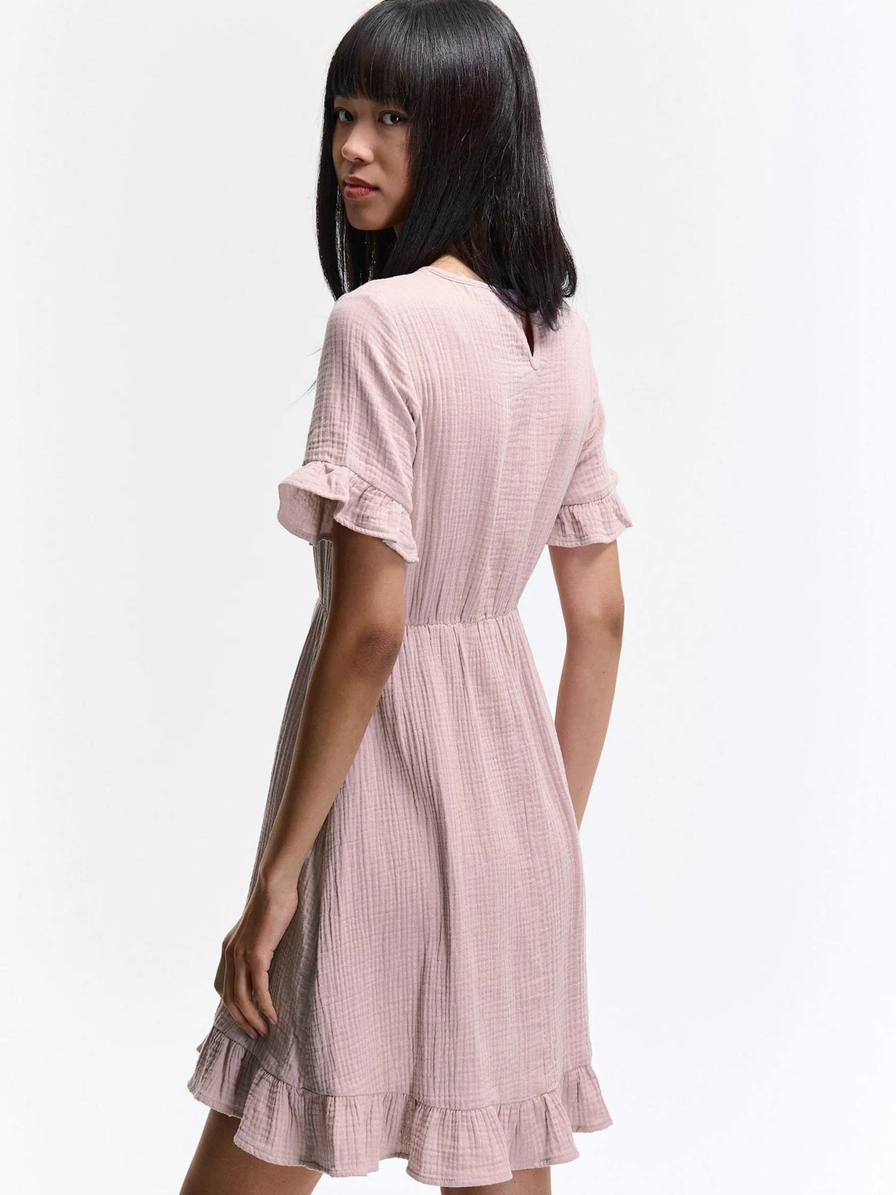 Kolor: różowyKrój: z falbaną, asyTyp: sukienkaRekaw: krótki rękawDługość: miniPattern style: pojedynczy kolorDe…