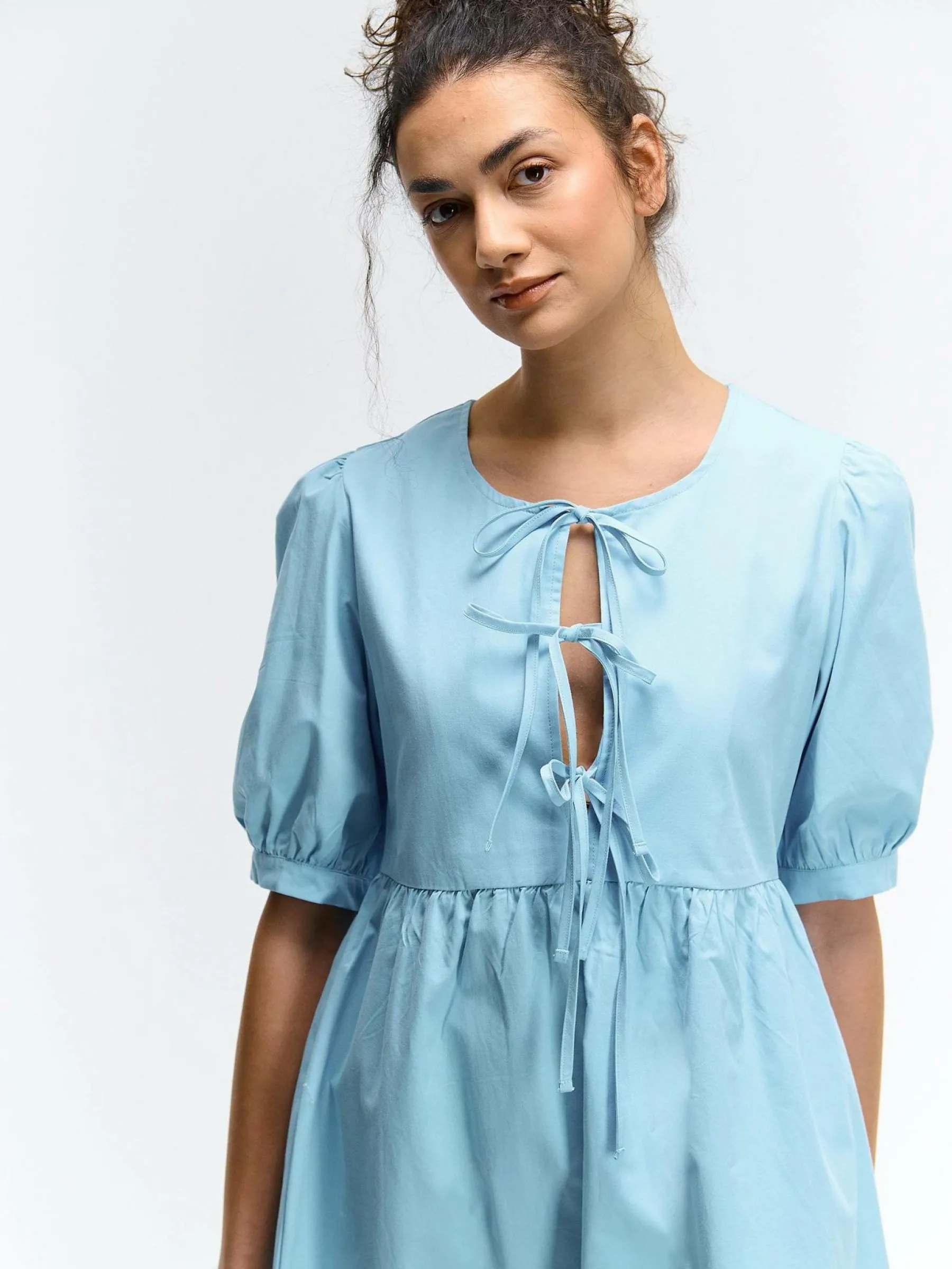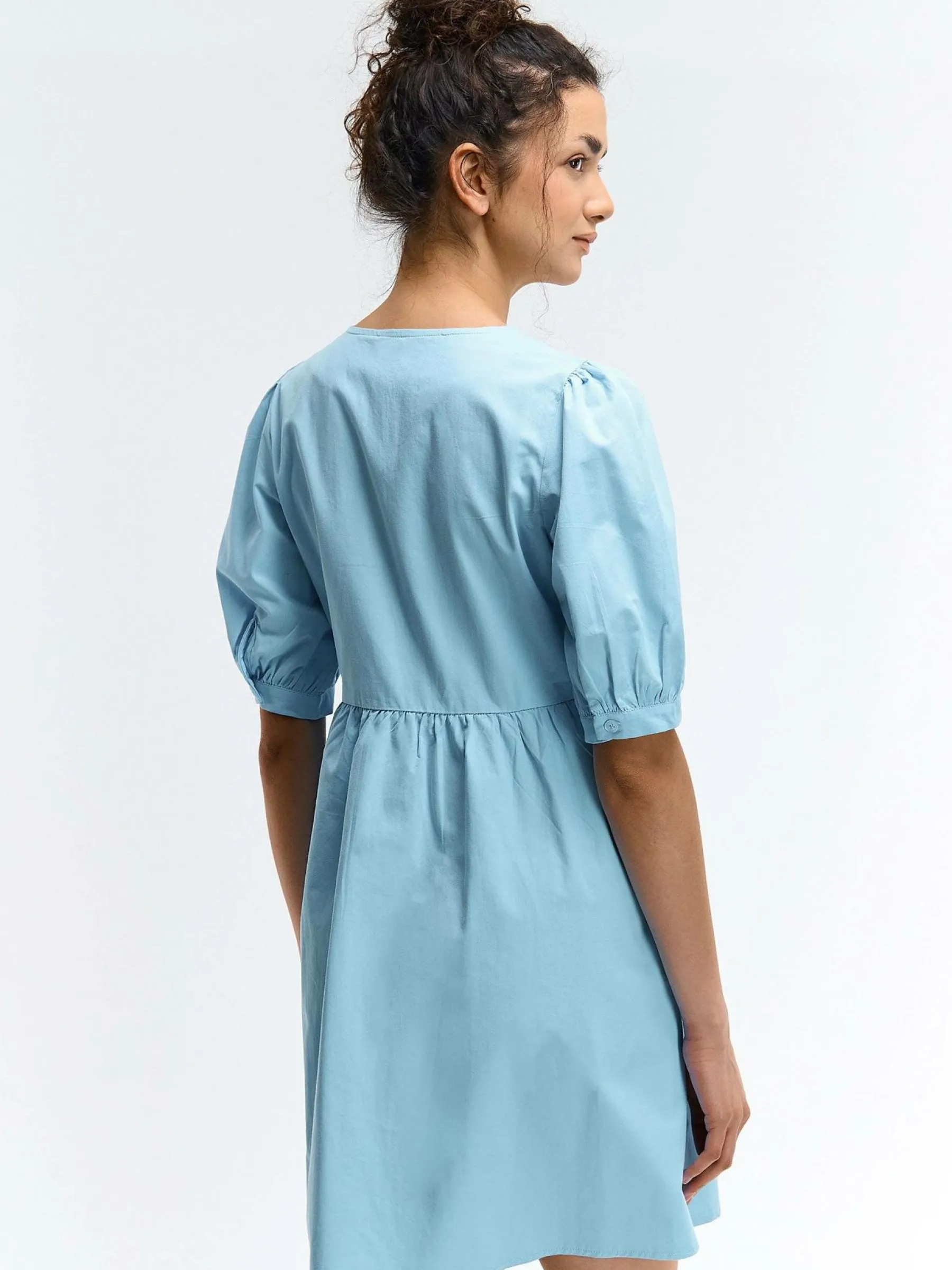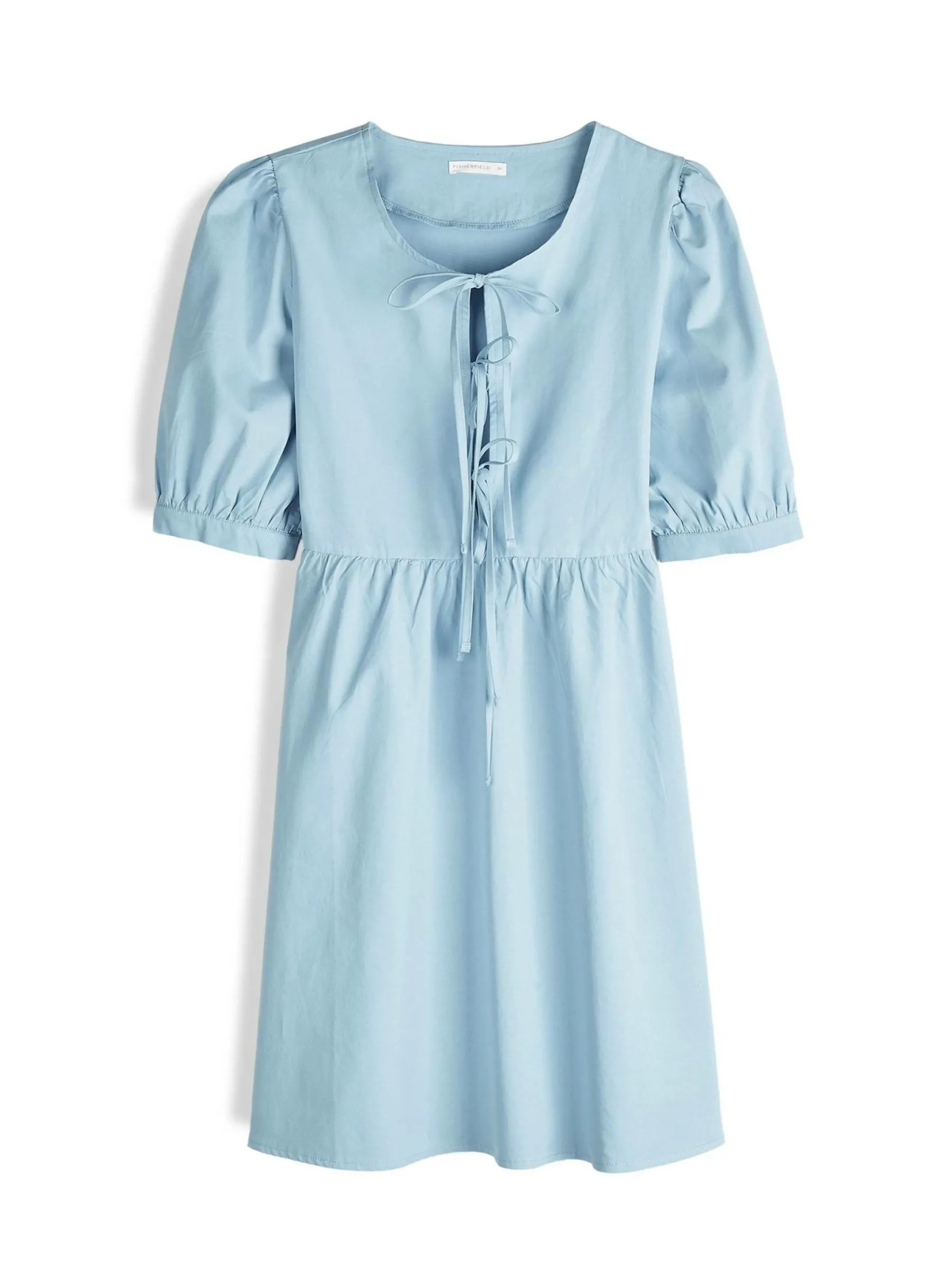 Kolor: niebieskiKrój: asyTyp: sukienkaRekaw: krótki rękawDługość: miniPattern style: pojedynczy kolorDetal: ze szn…