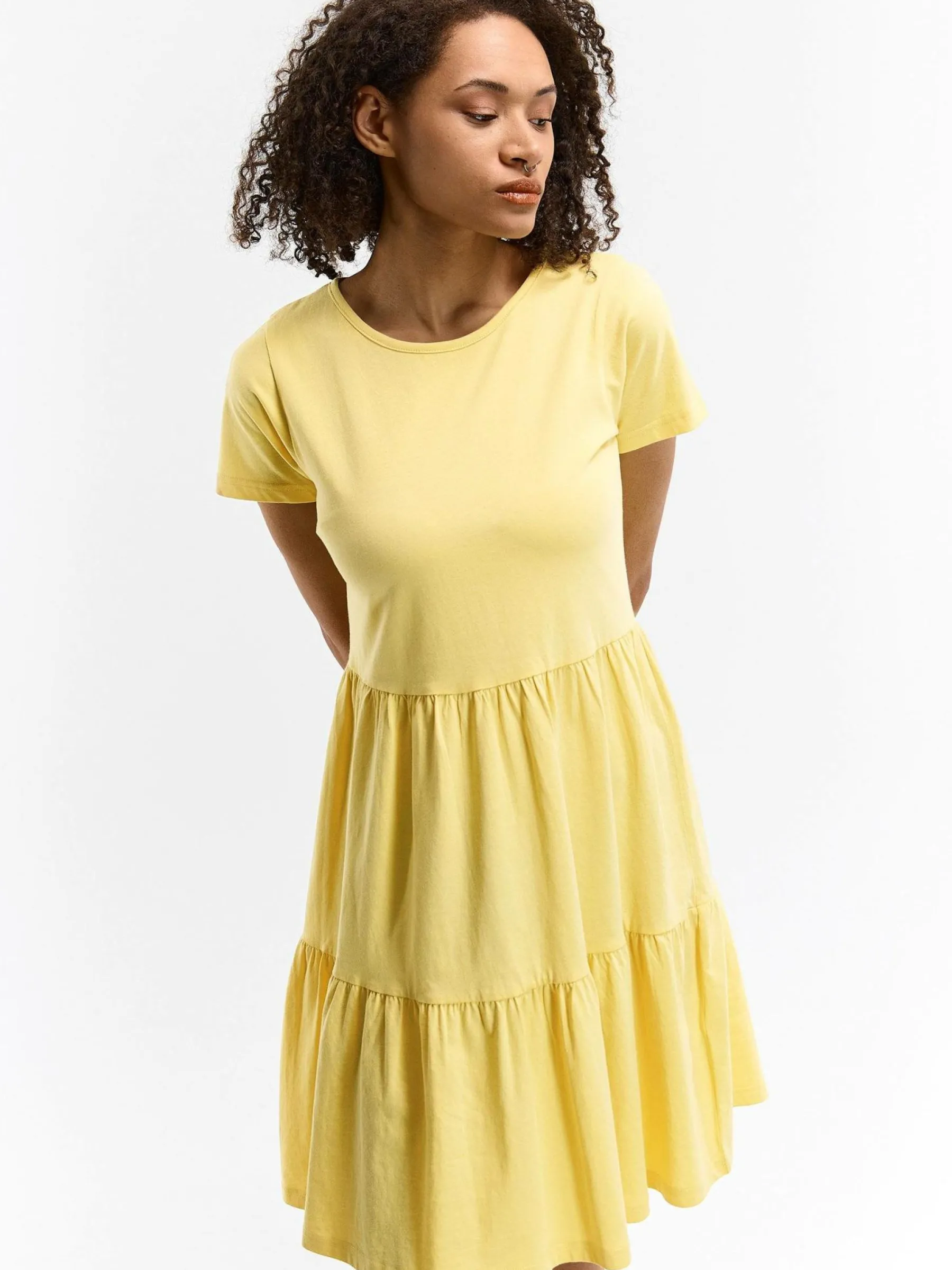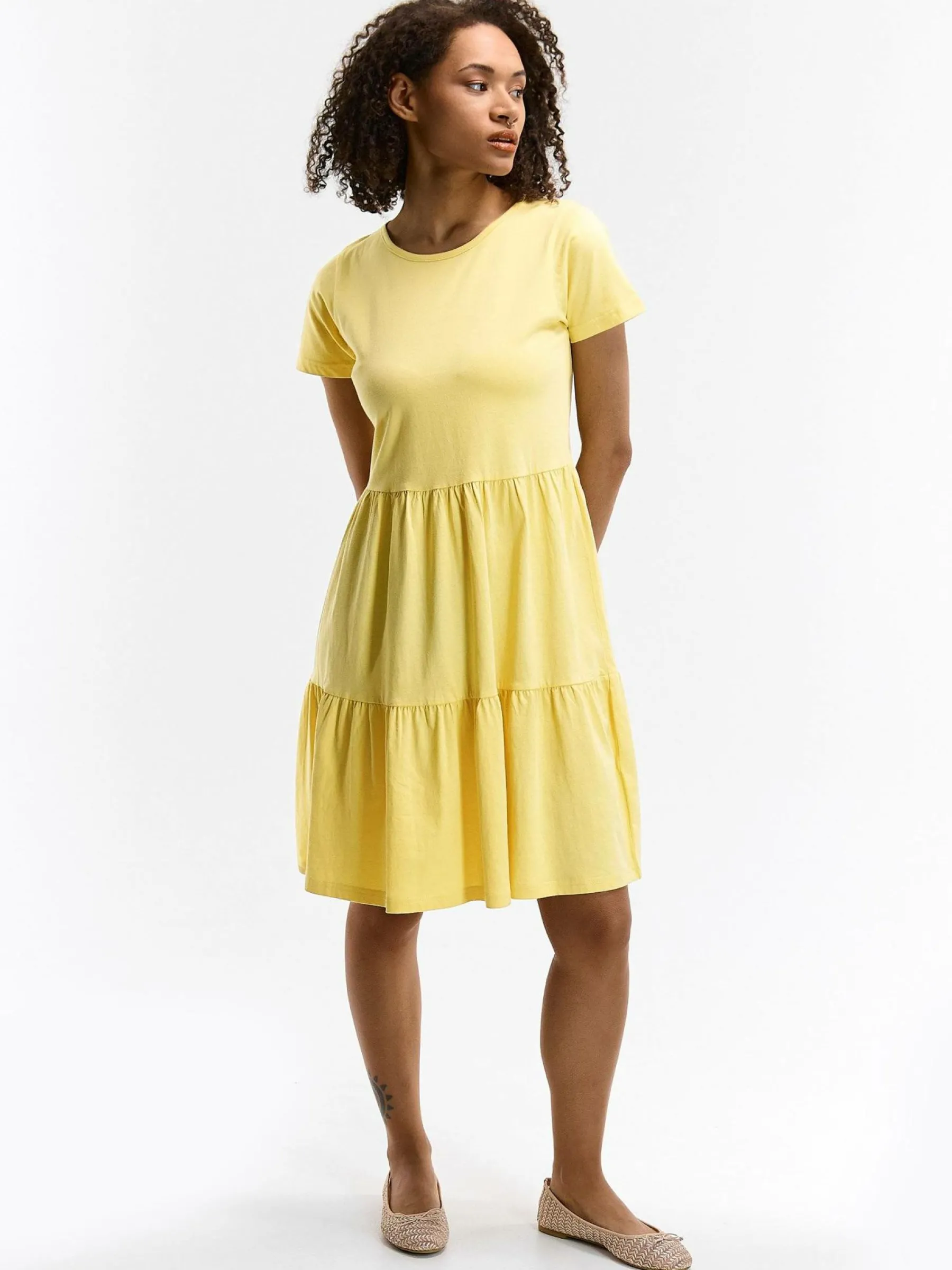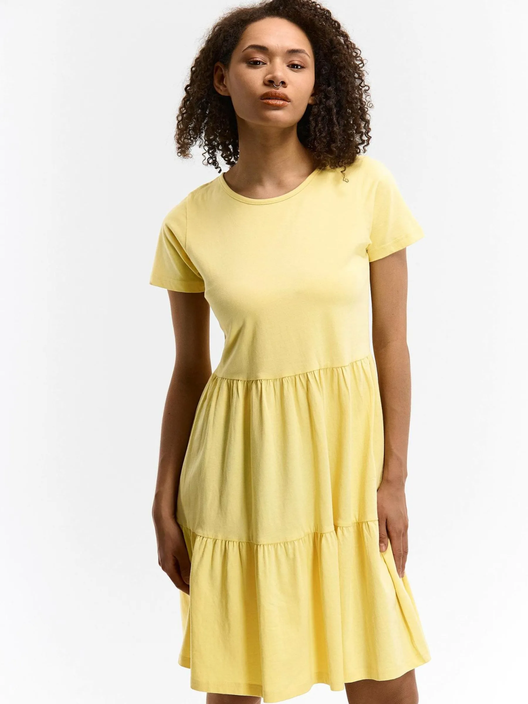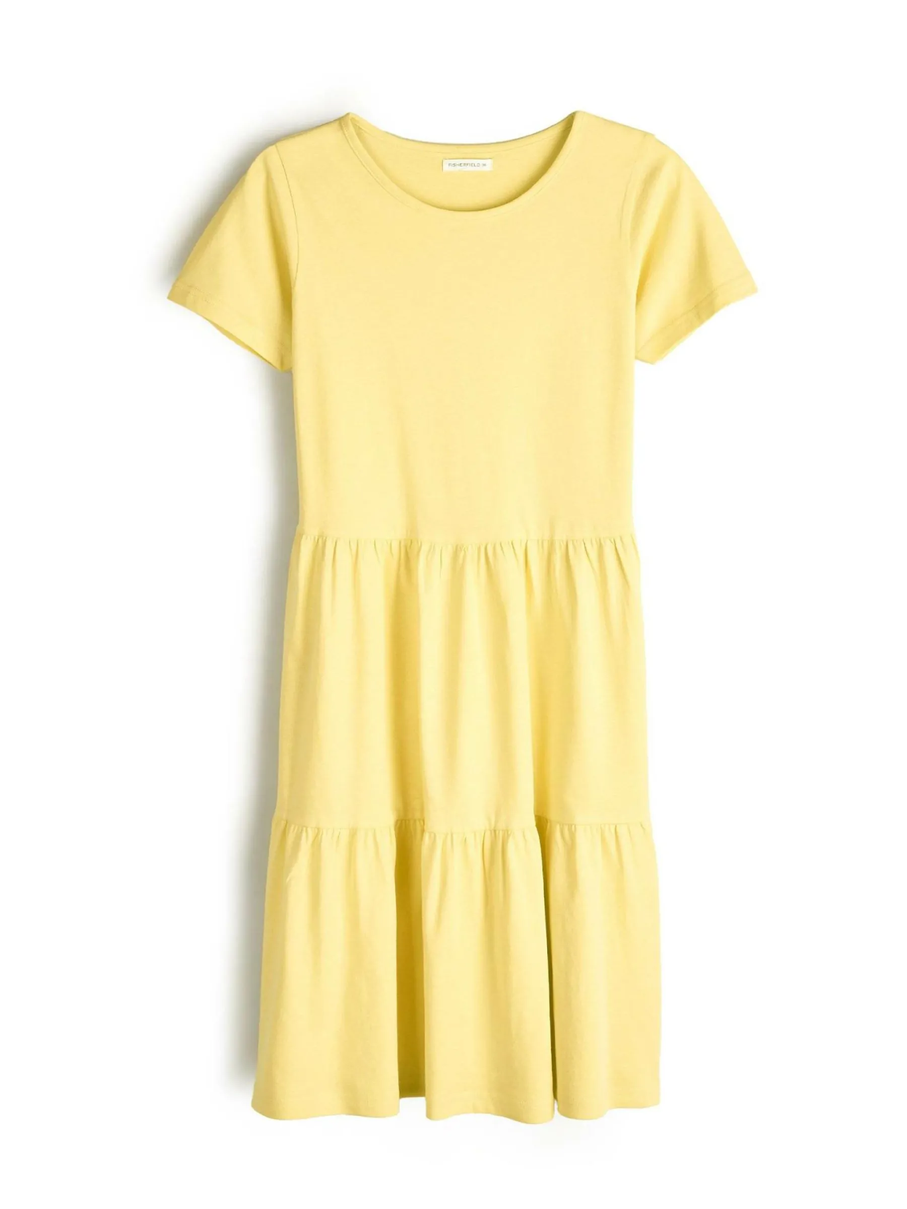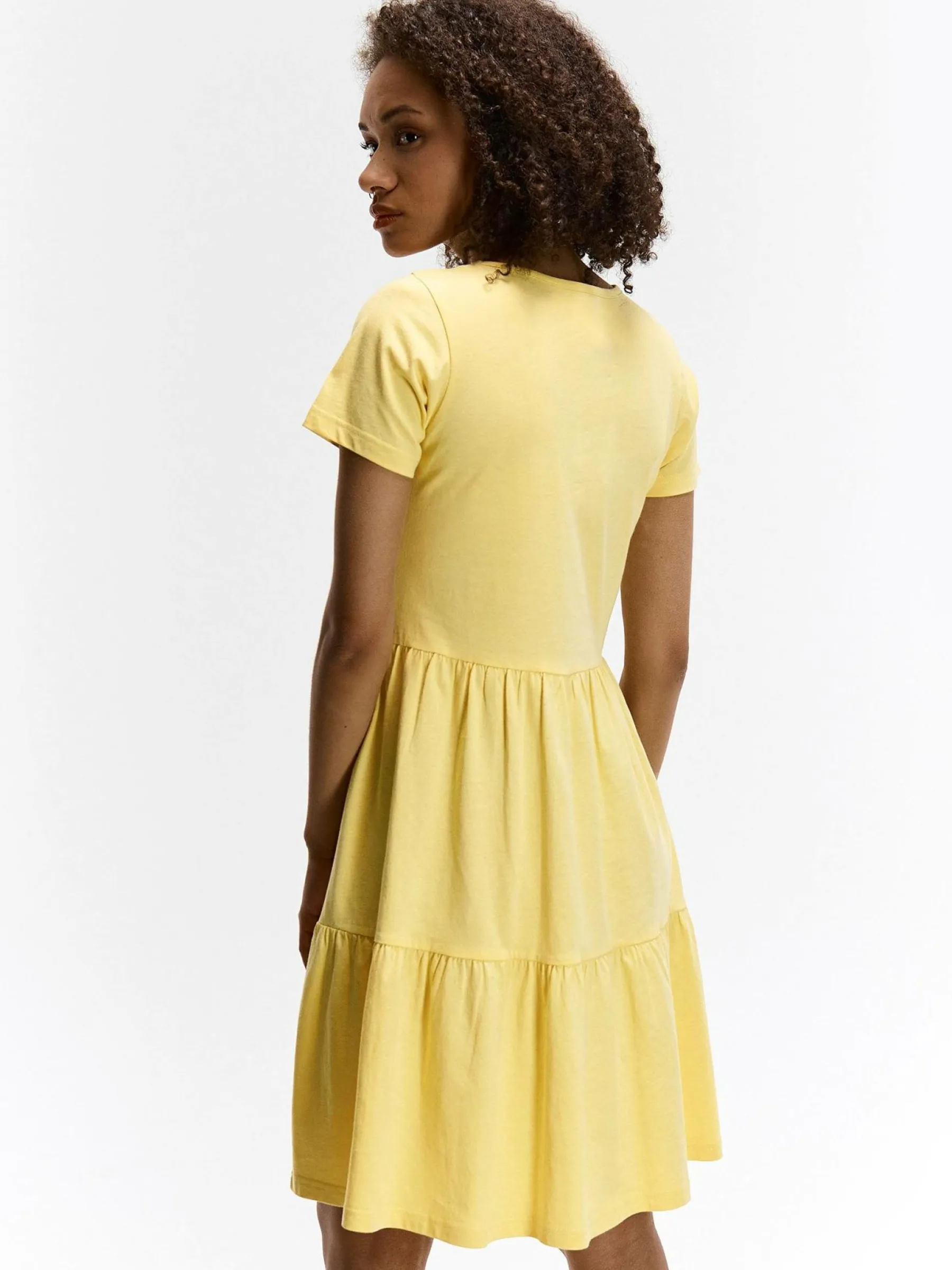 Kolor: żółtyKrój: z falbanąTyp: sukienkaRekaw: krótki rękawDługość: midiPattern style: pojedynczy kolorMateria…
