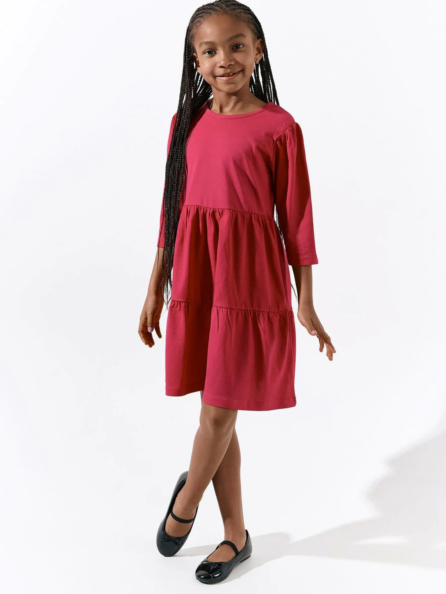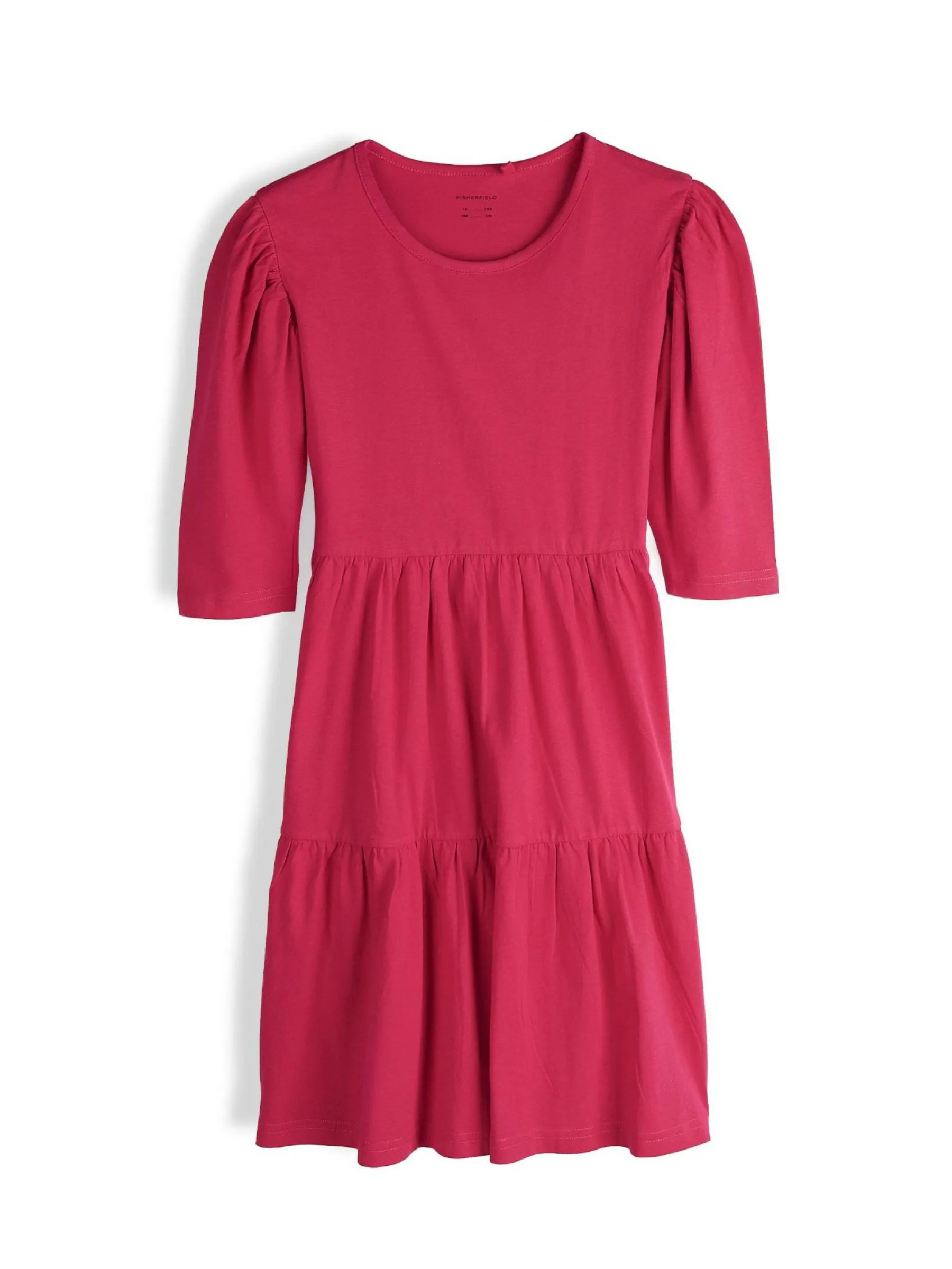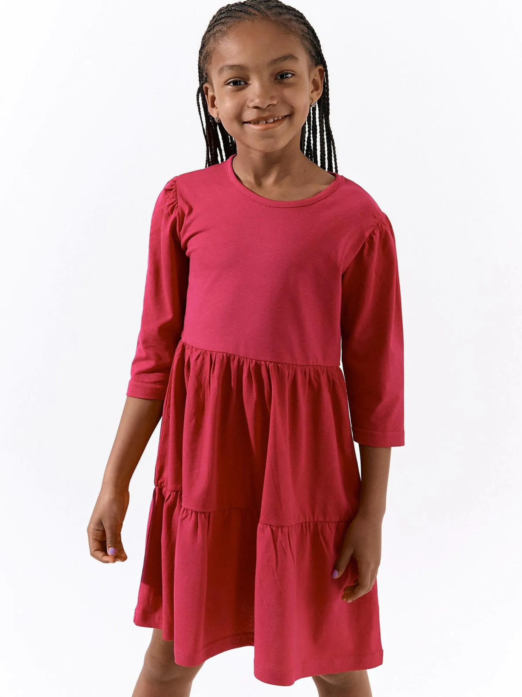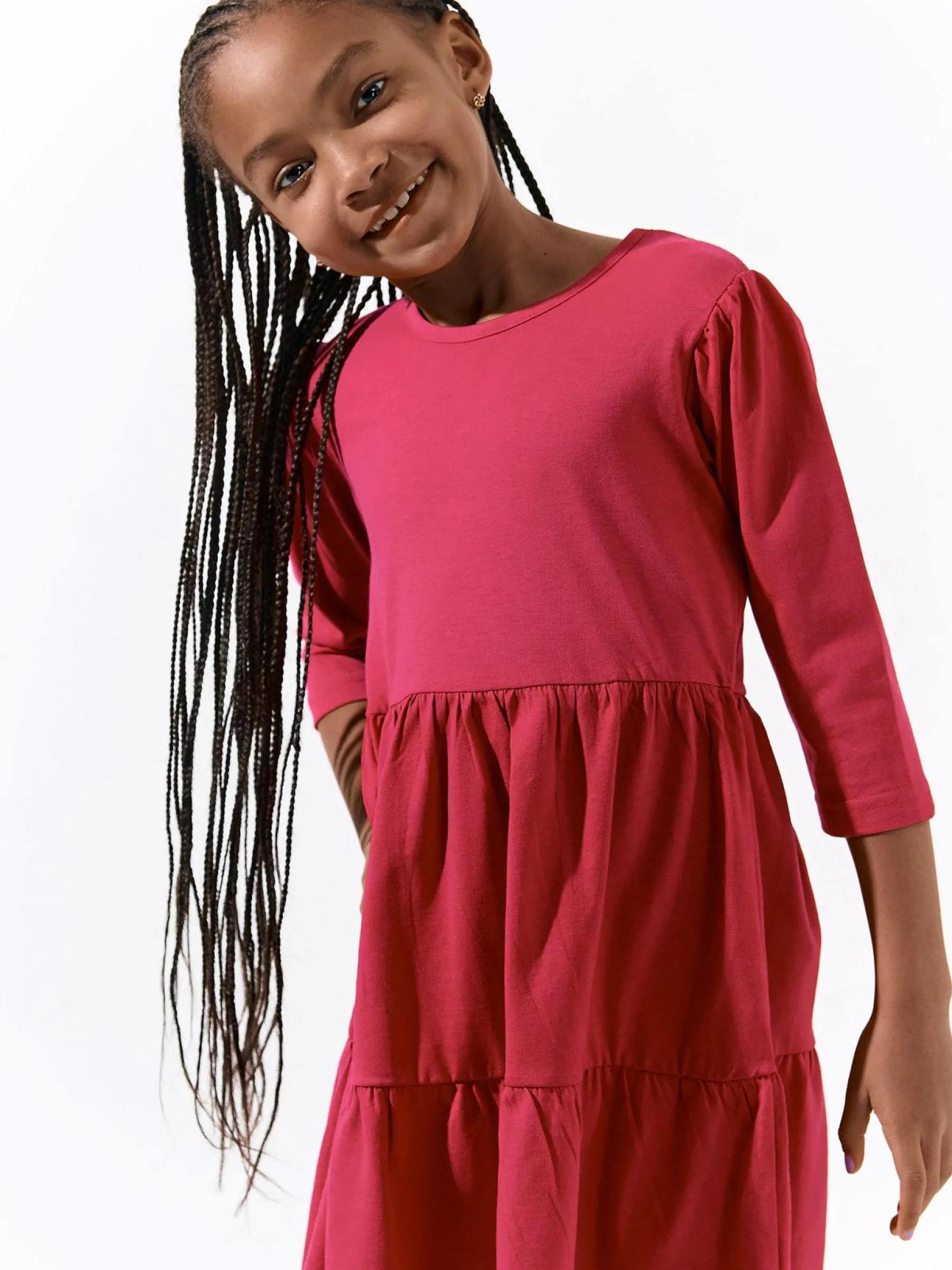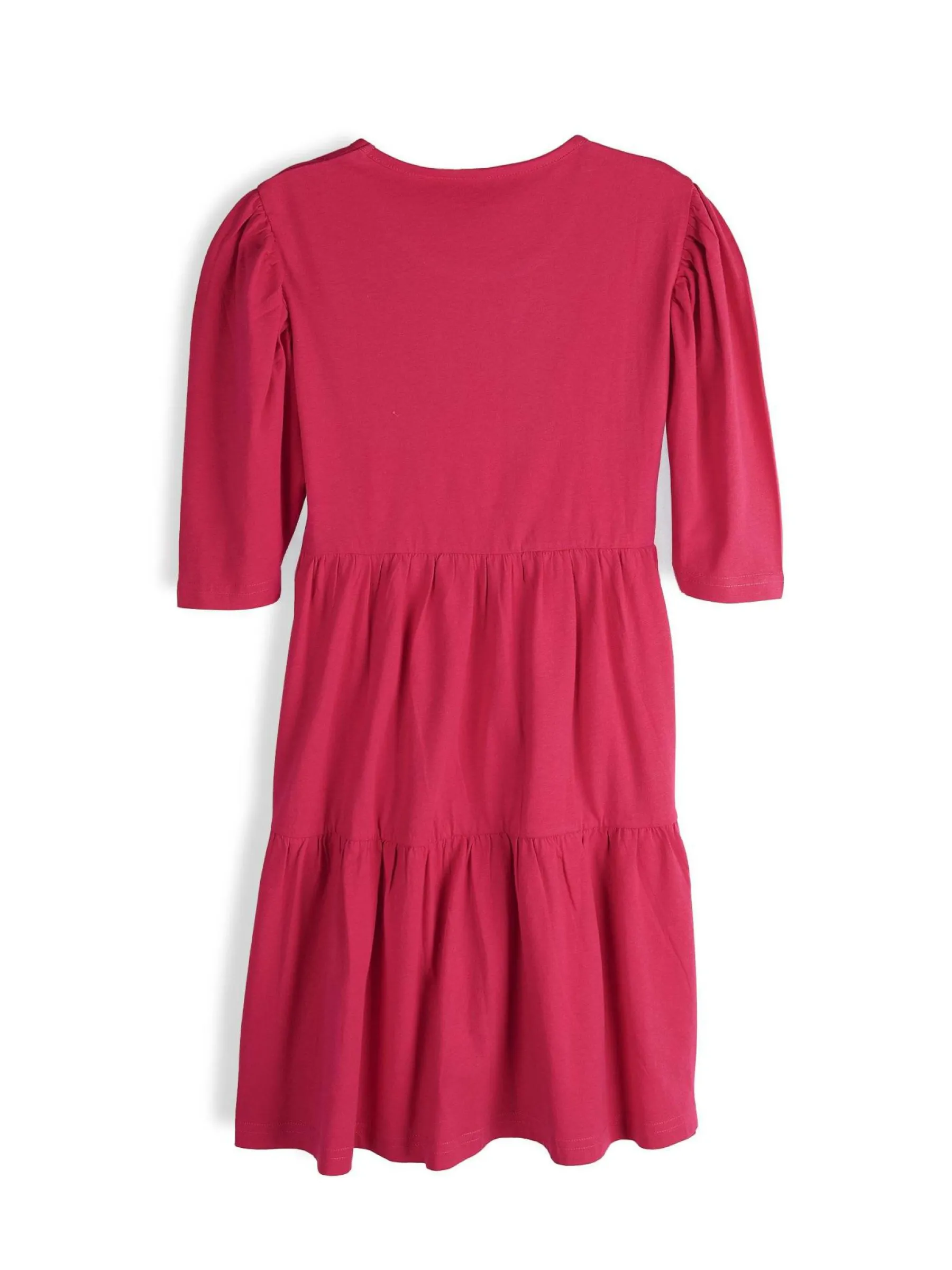 Kolor: różowyKrój: z falbanąTyp: sukienkaRekaw: rękaw 3/4Długość: miniPattern style: pojedynczy kolorDetal: nad …