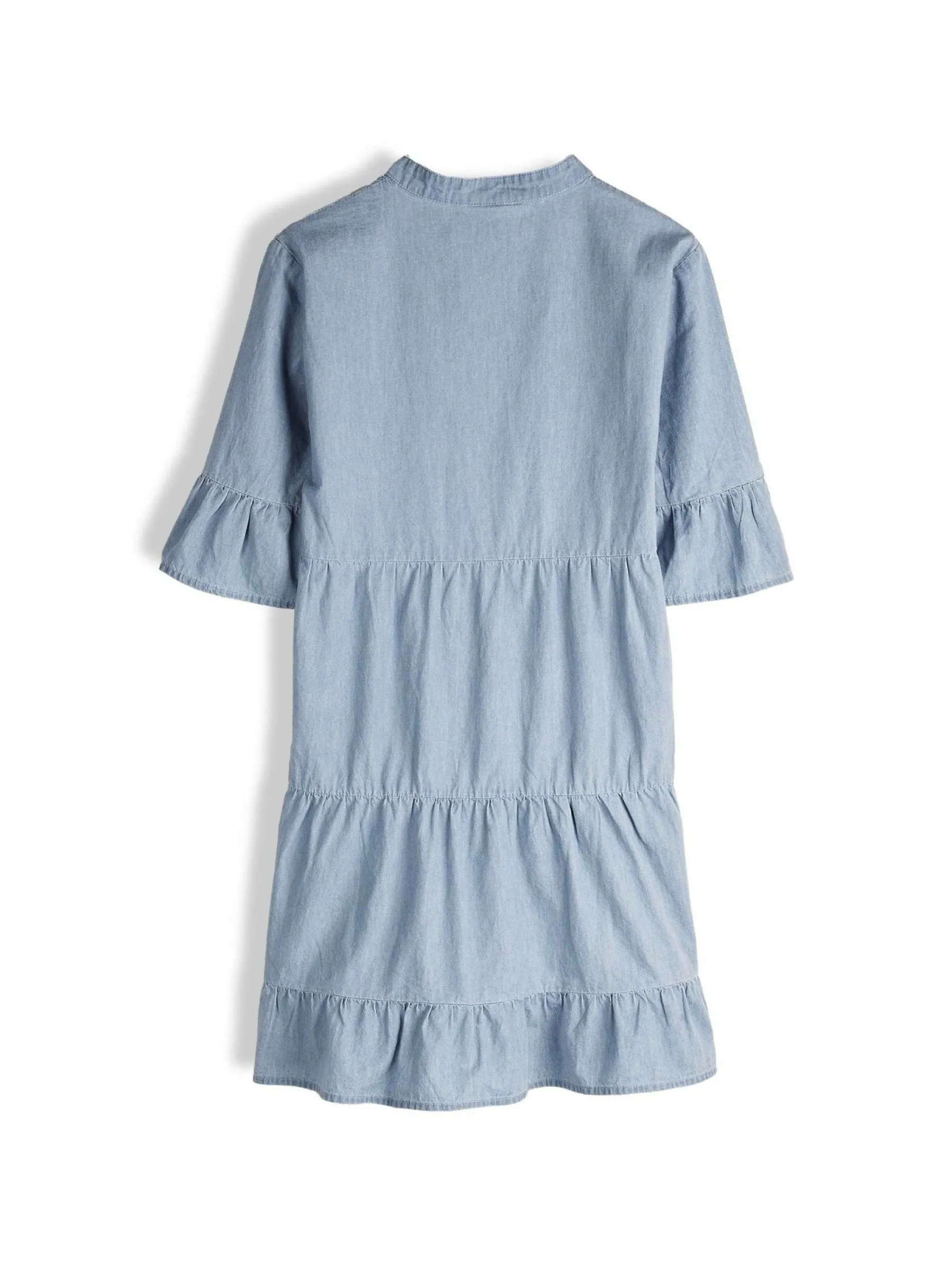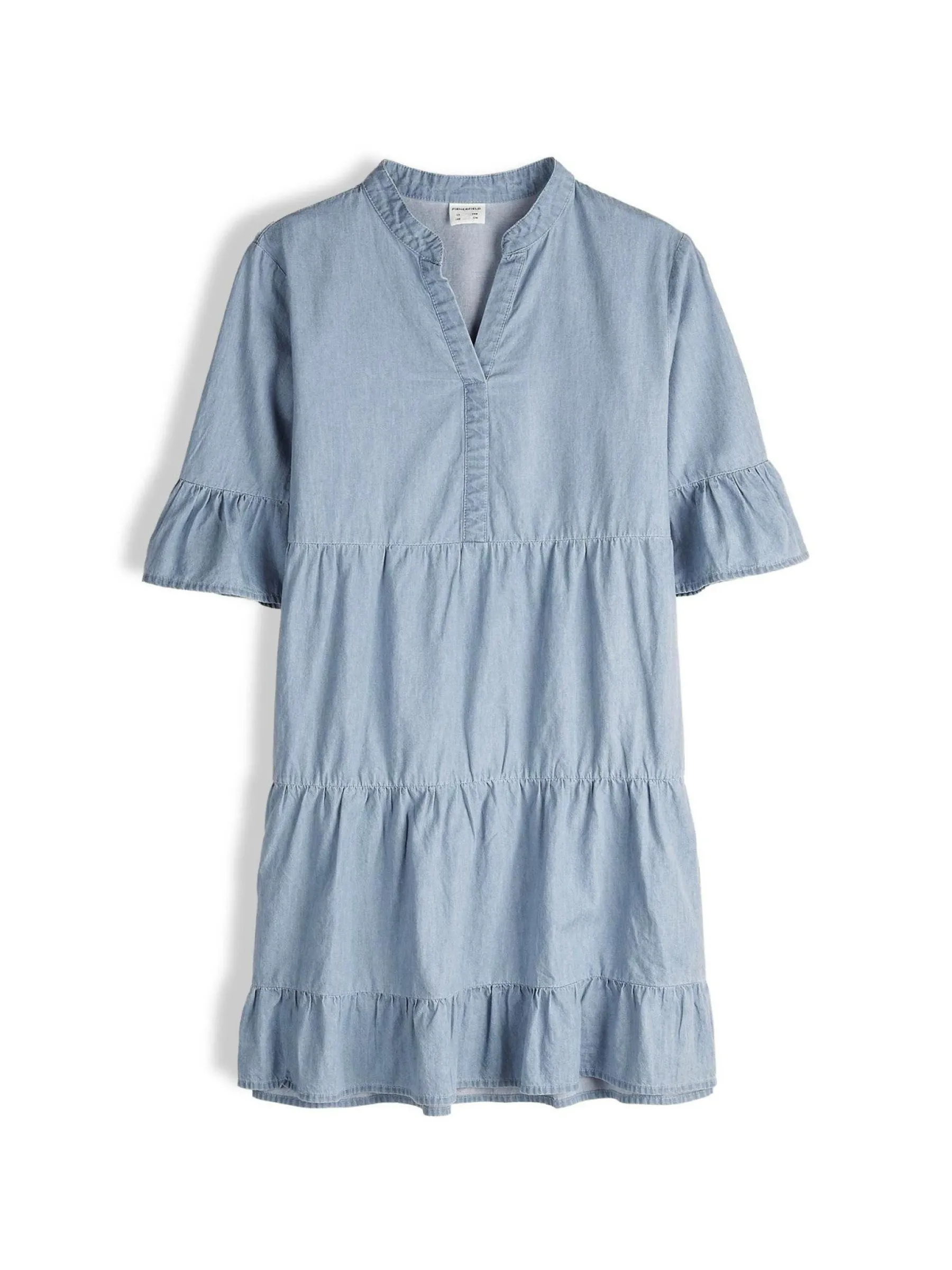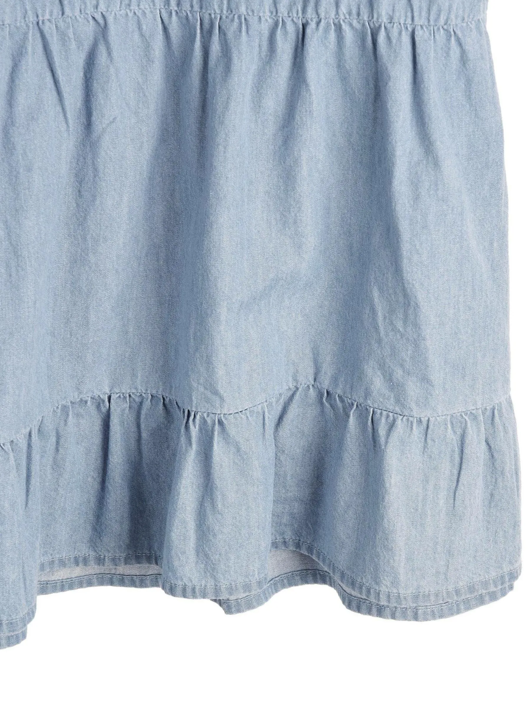 Kolor: niebieskiKrój: z falbanąTyp: sukienkaRekaw: rękaw 3/4Długość: miniPattern style: pojedynczy kolorDetal: nad…
