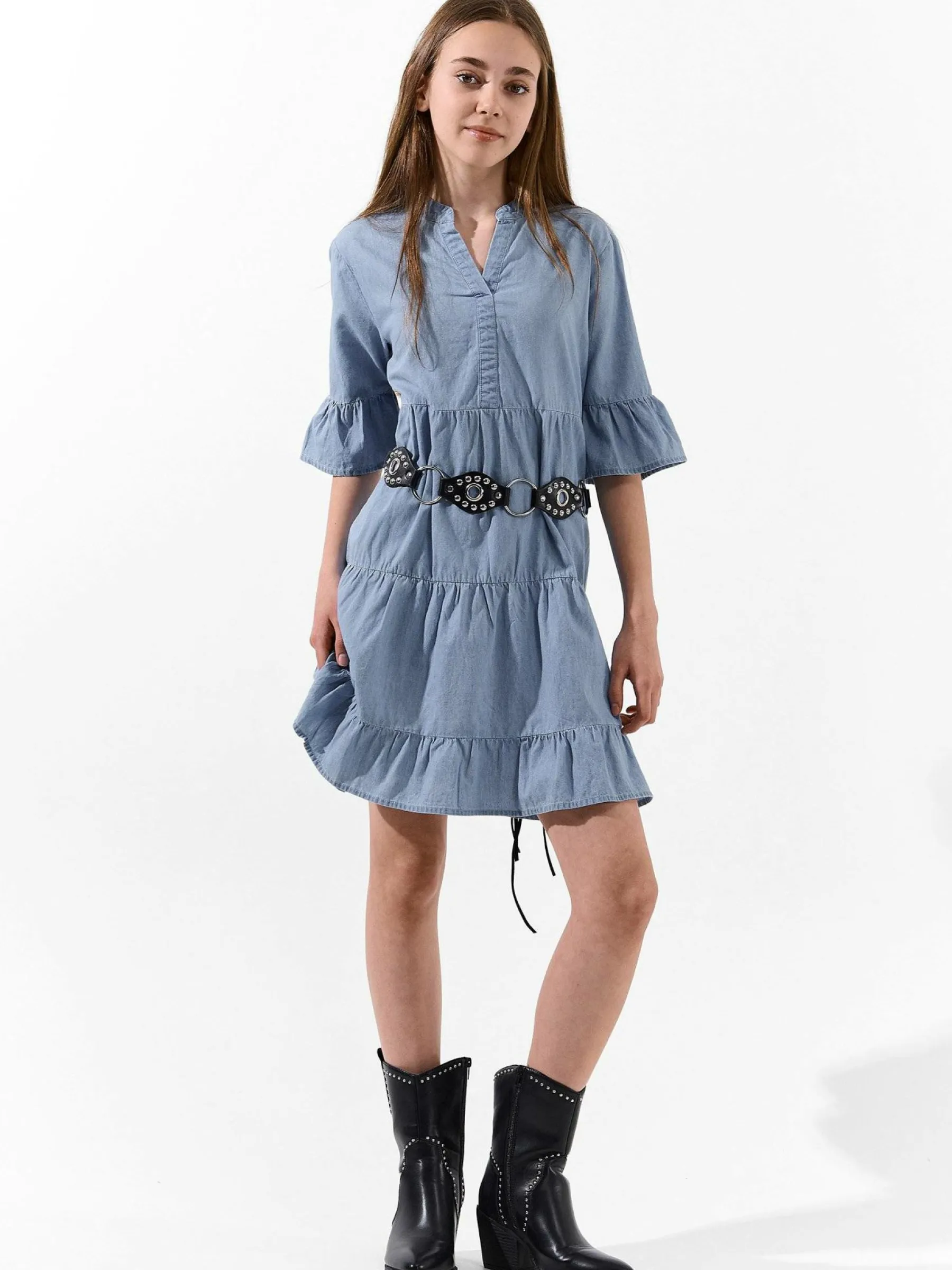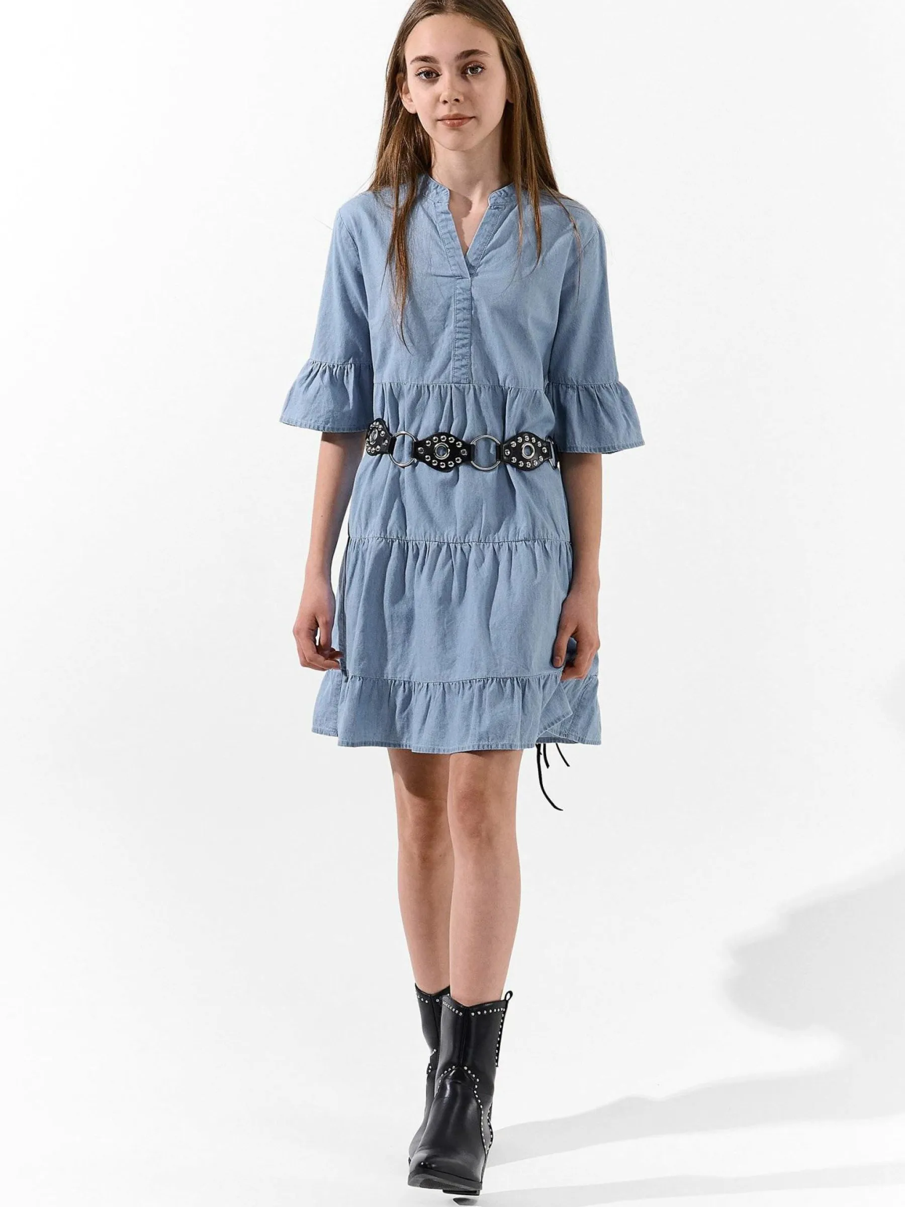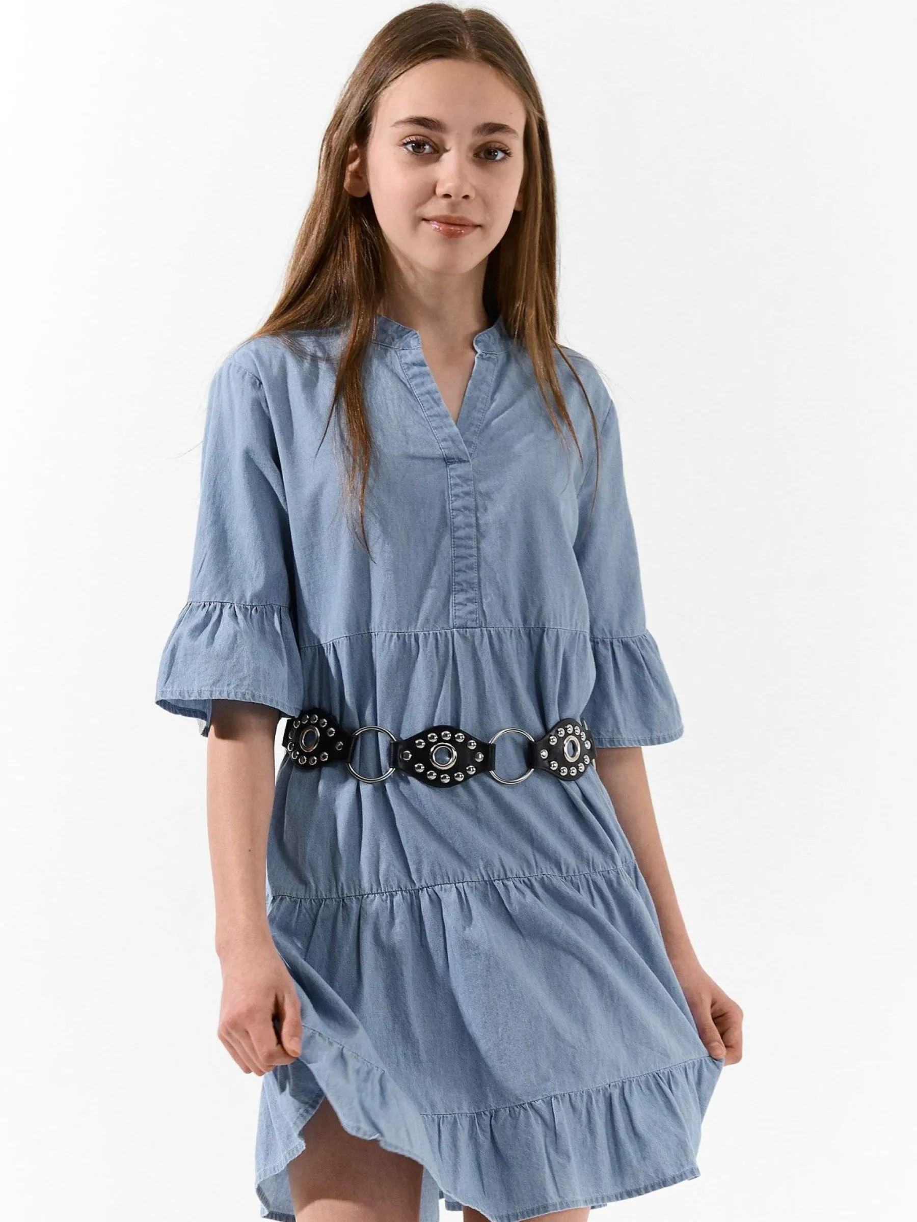 Kolor: niebieskiKrój: z falbanąTyp: sukienkaRekaw: rękaw 3/4Długość: miniPattern style: pojedynczy kolorDetal: nad…
