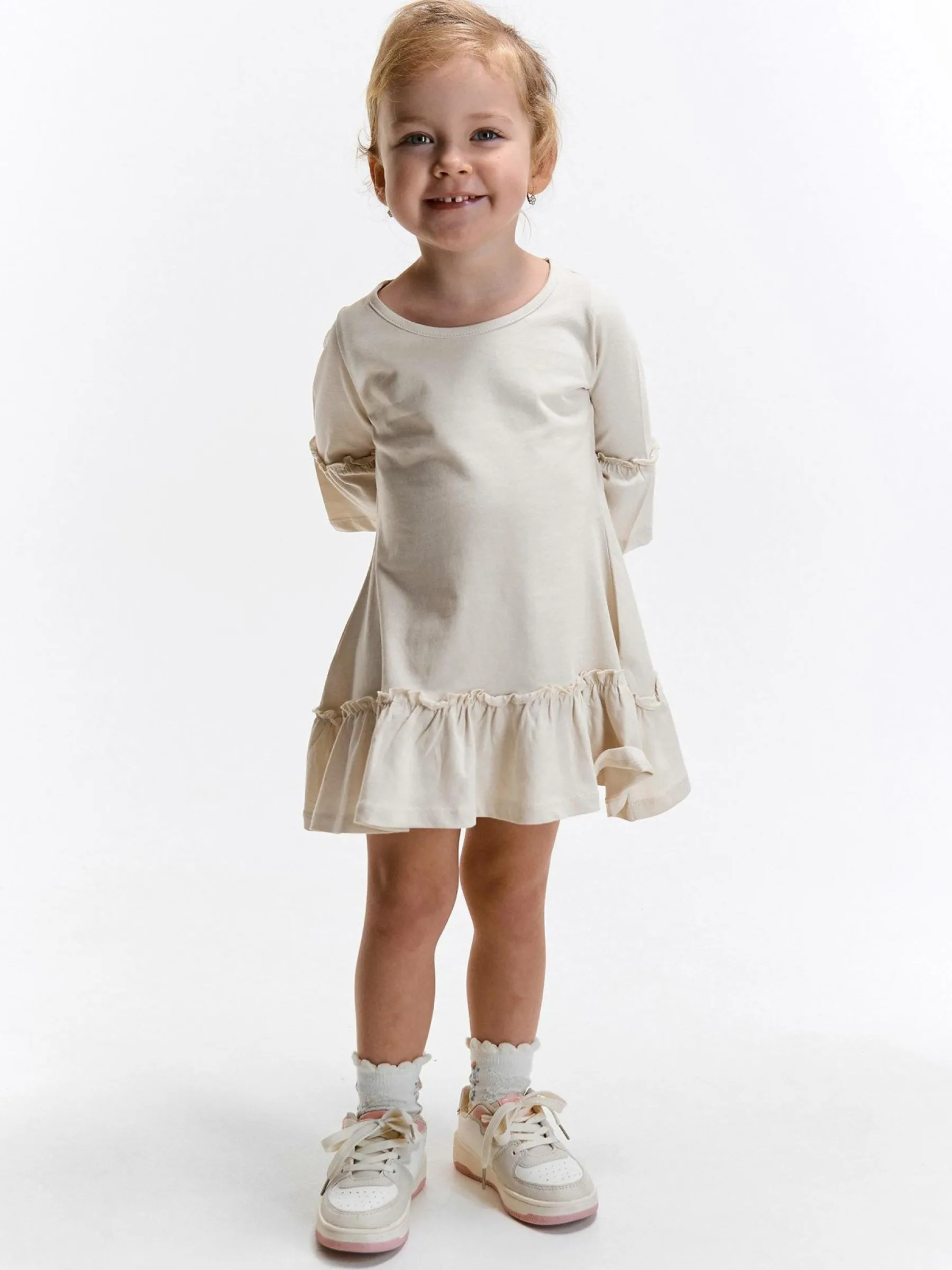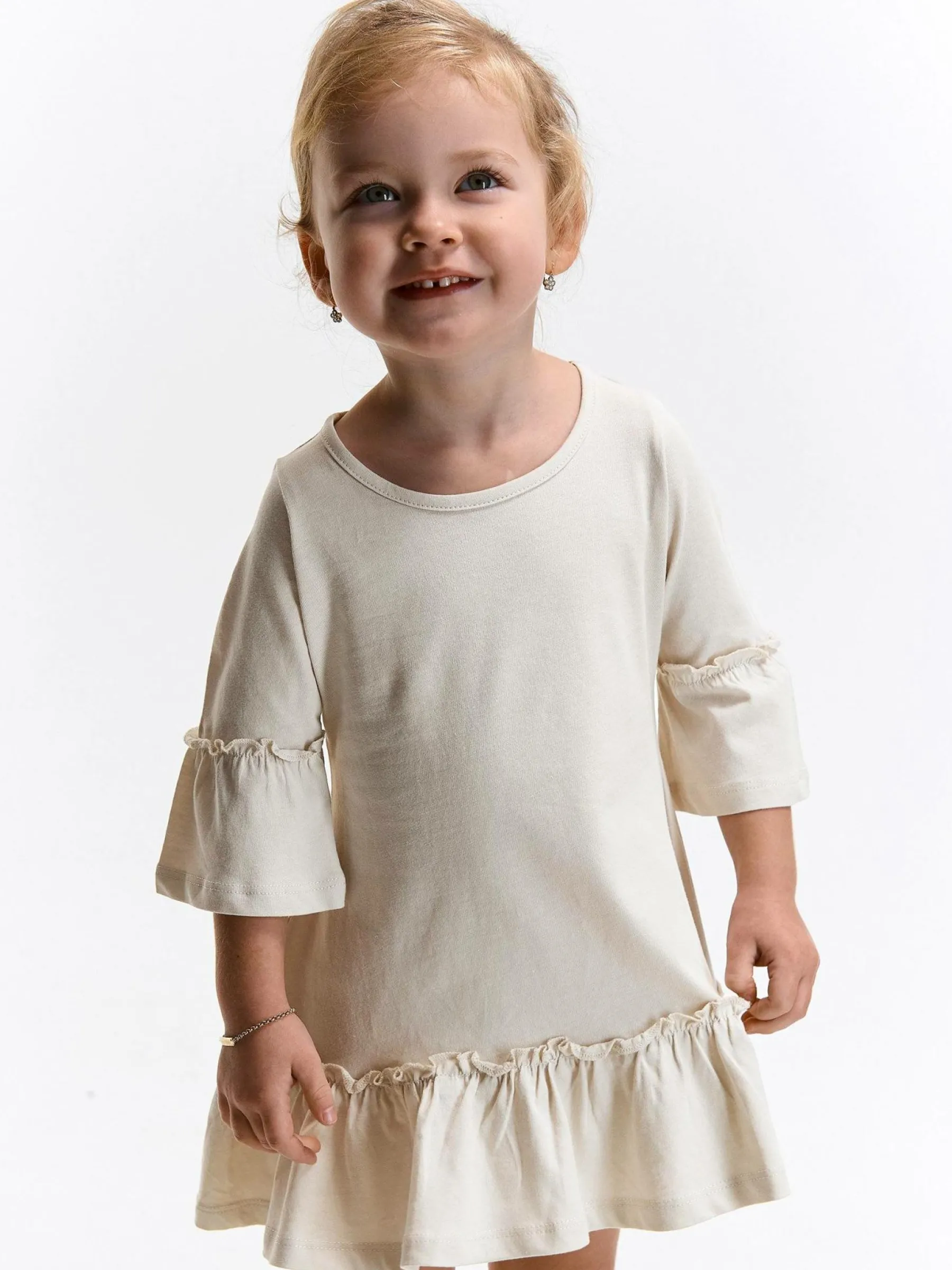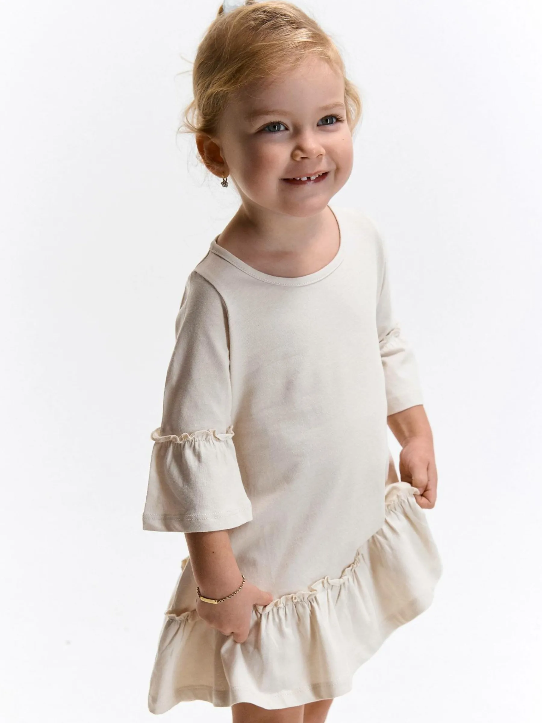 Kolor: beżowyKrój: z falbanąTyp: sukienkaRekaw: rękaw 3/4Długość: miniPattern style: pojedynczy kolorDetal: nad g…