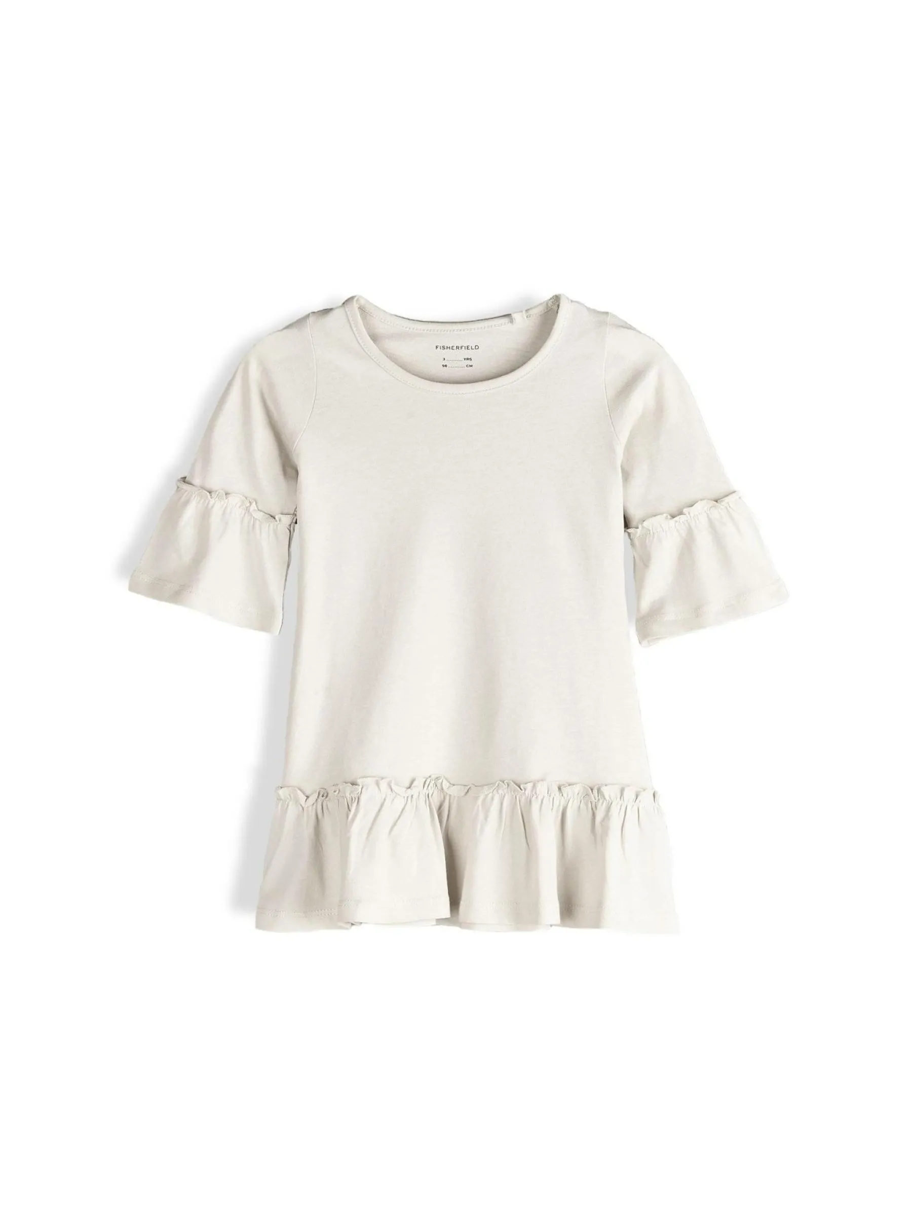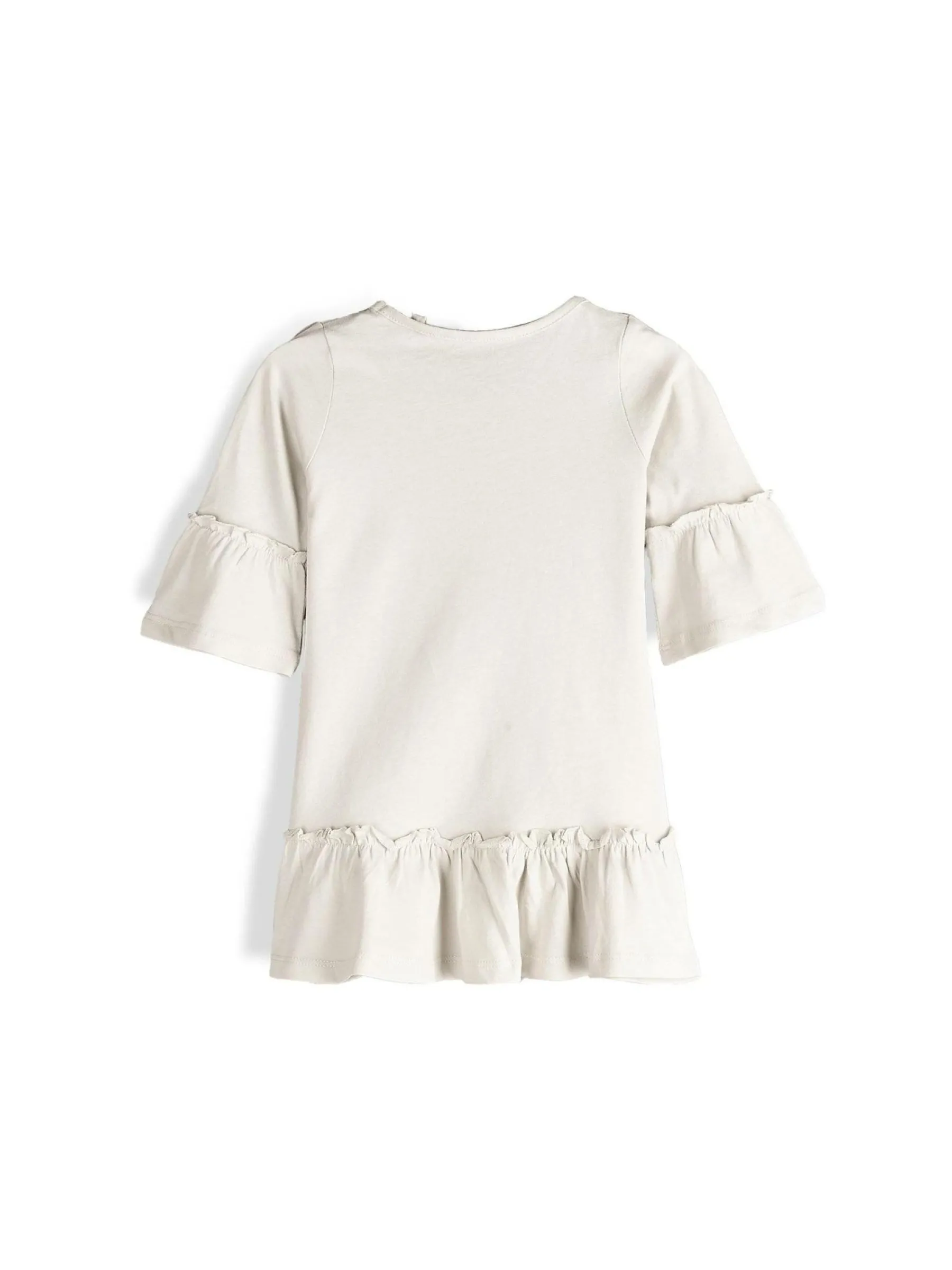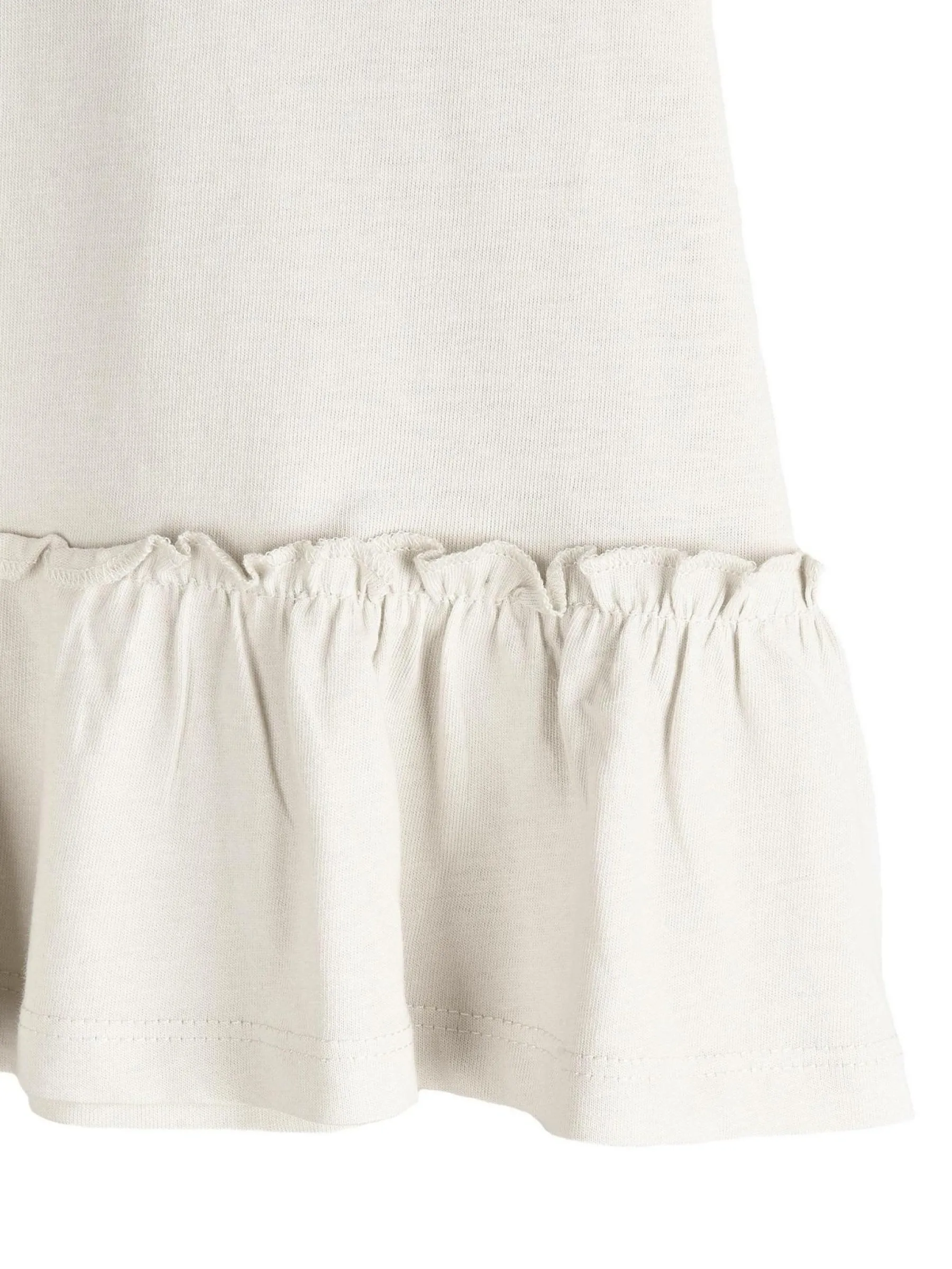 Kolor: beżowyKrój: z falbanąTyp: sukienkaRekaw: rękaw 3/4Długość: miniPattern style: pojedynczy kolorDetal: nad g…