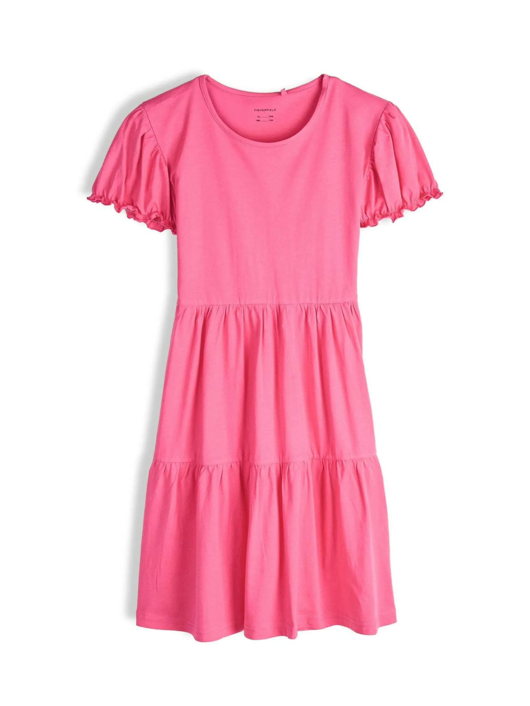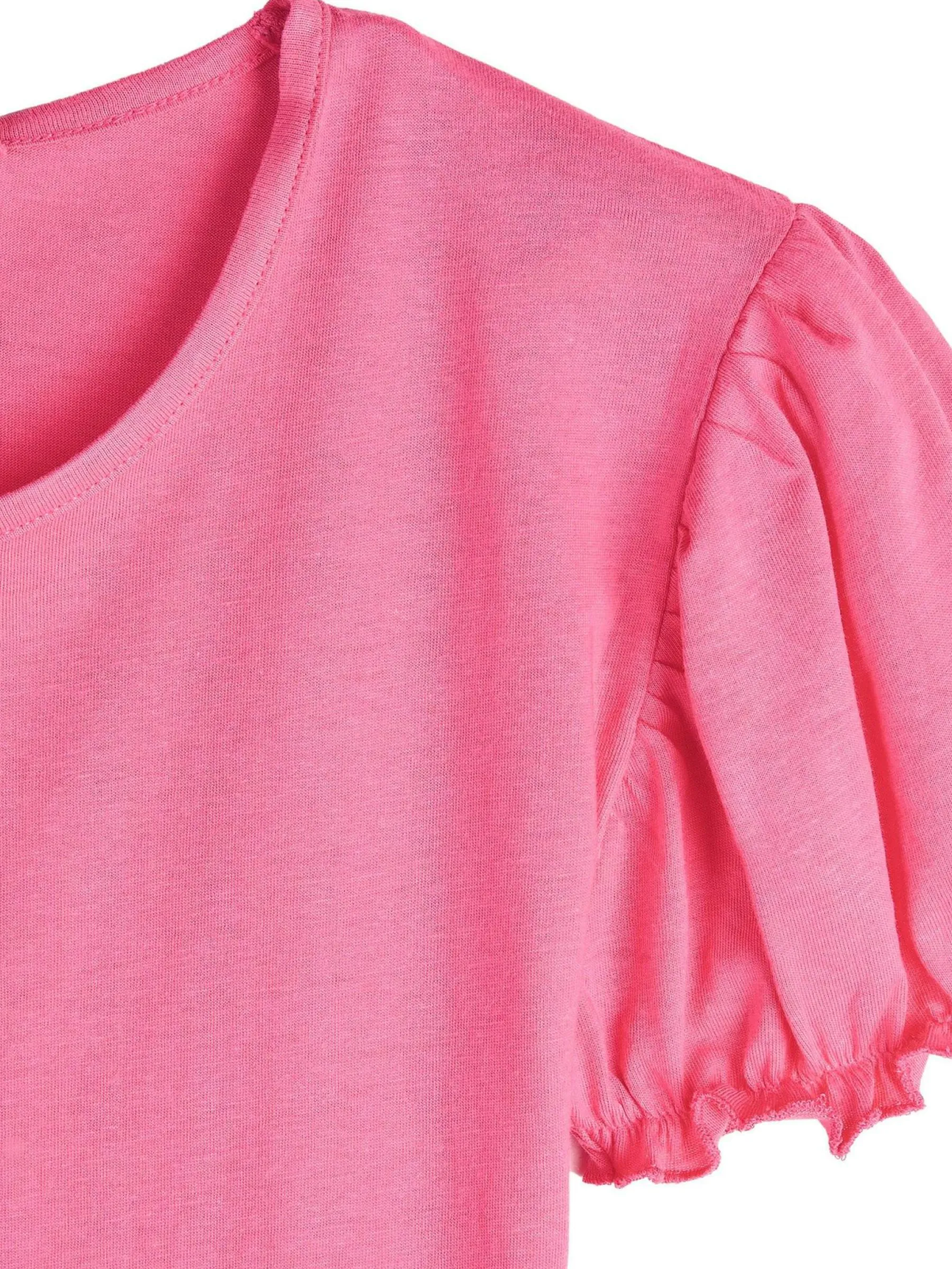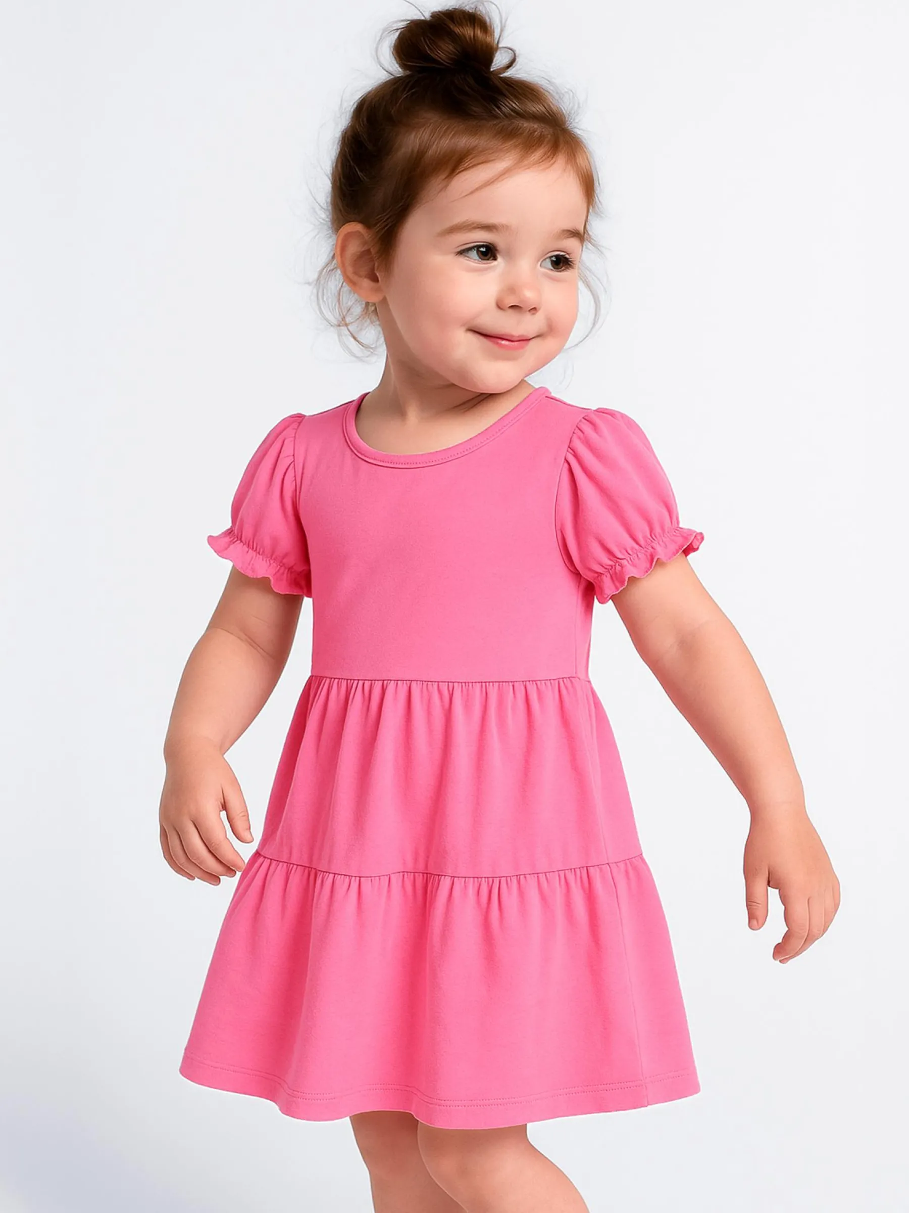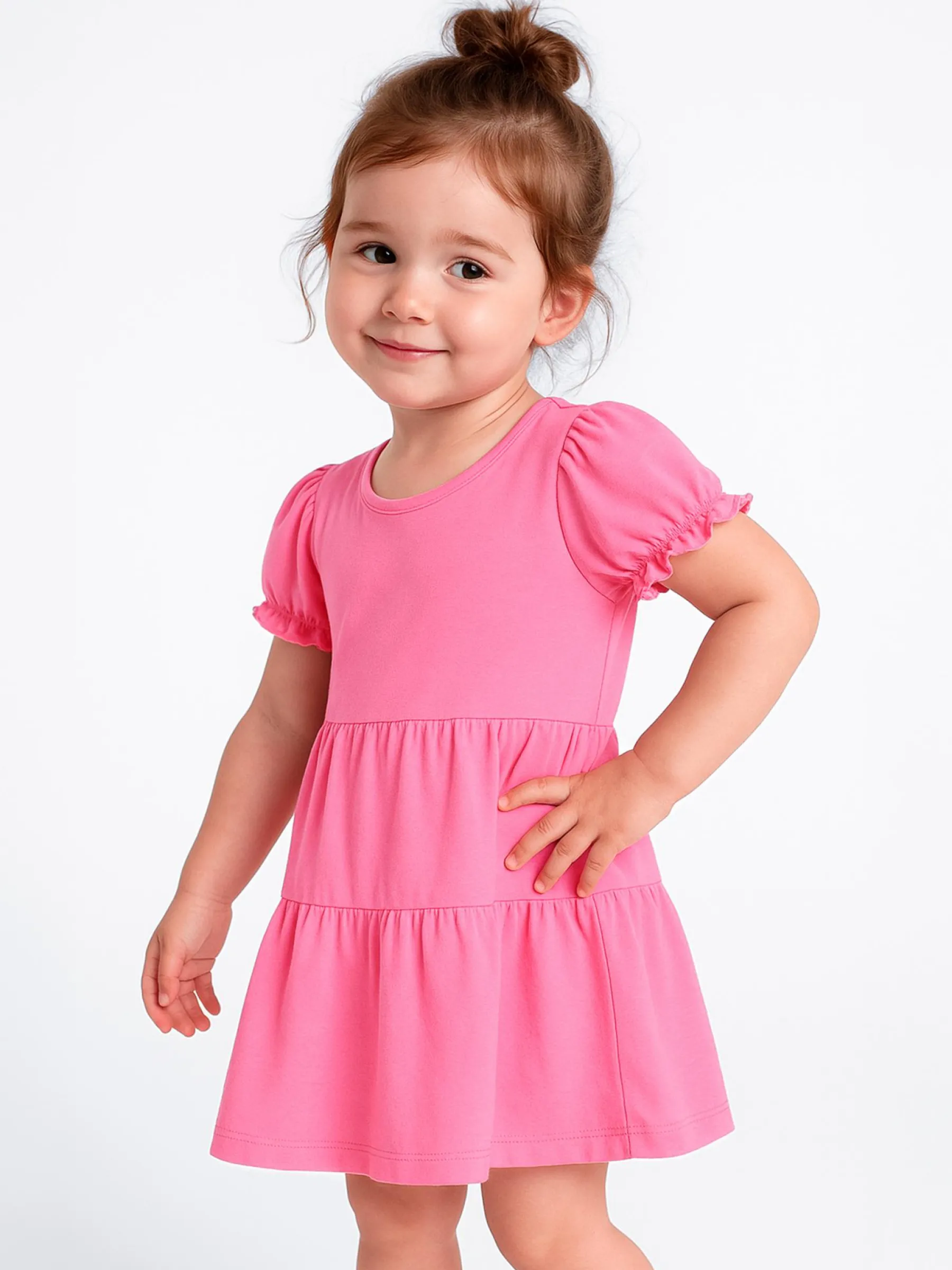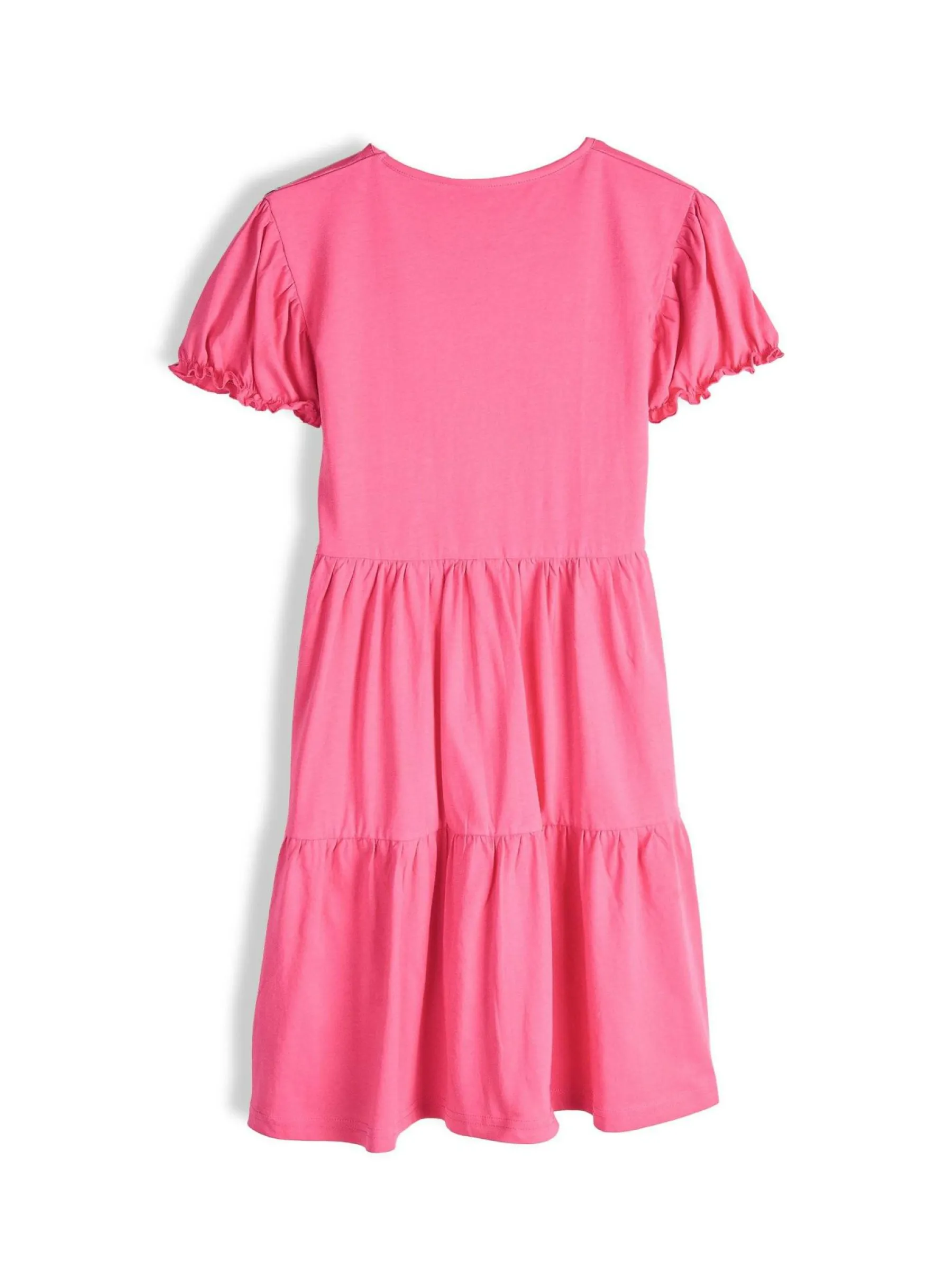 Kolor: różowyKrój: z falbanąTyp: sukienkaRekaw: krótki rękawDługość: miniPattern style: pojedynczy kolorDetal: …