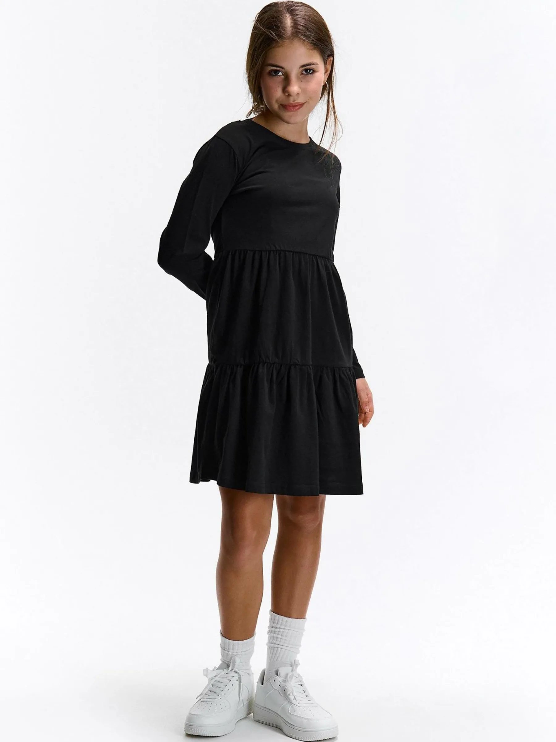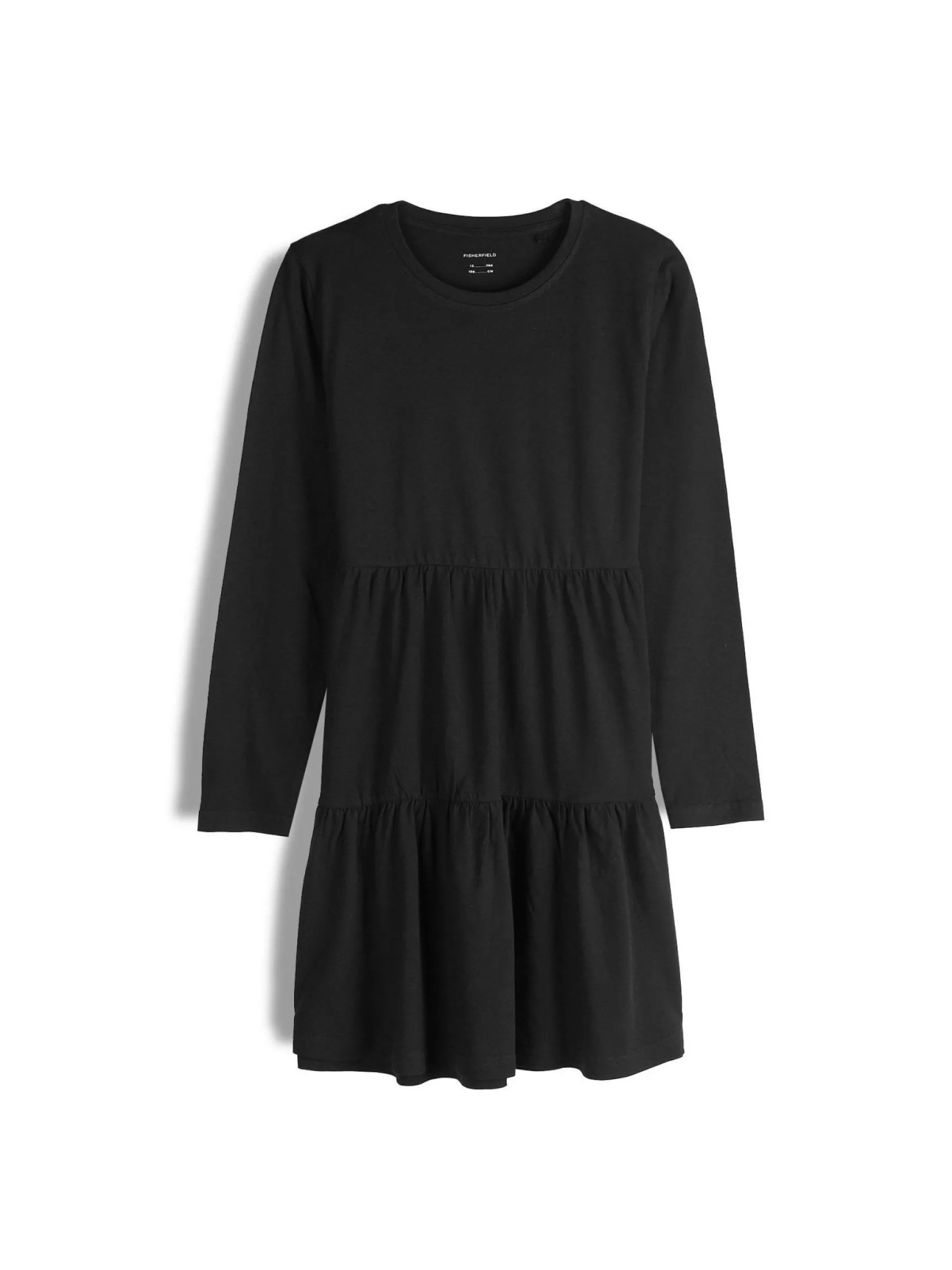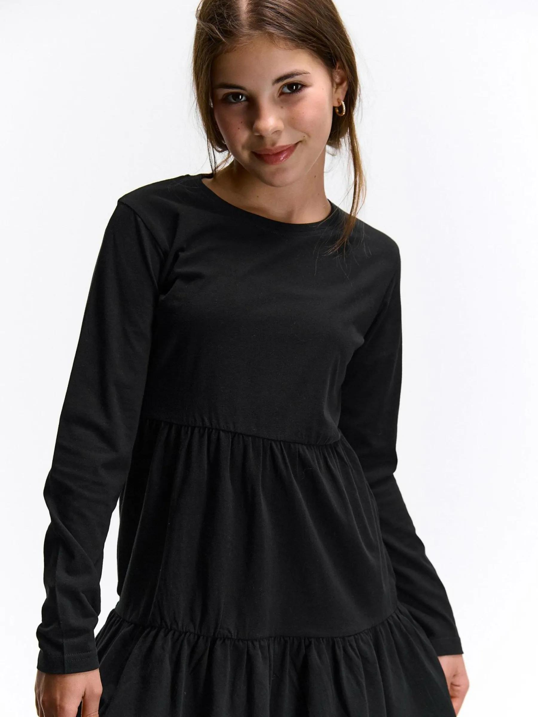 Kolor: czarnyKrój: z falbanąTyp: sukienkaRekaw: długi rękawDługość: miniPattern style: pojedynczy kolorDetal: nad…