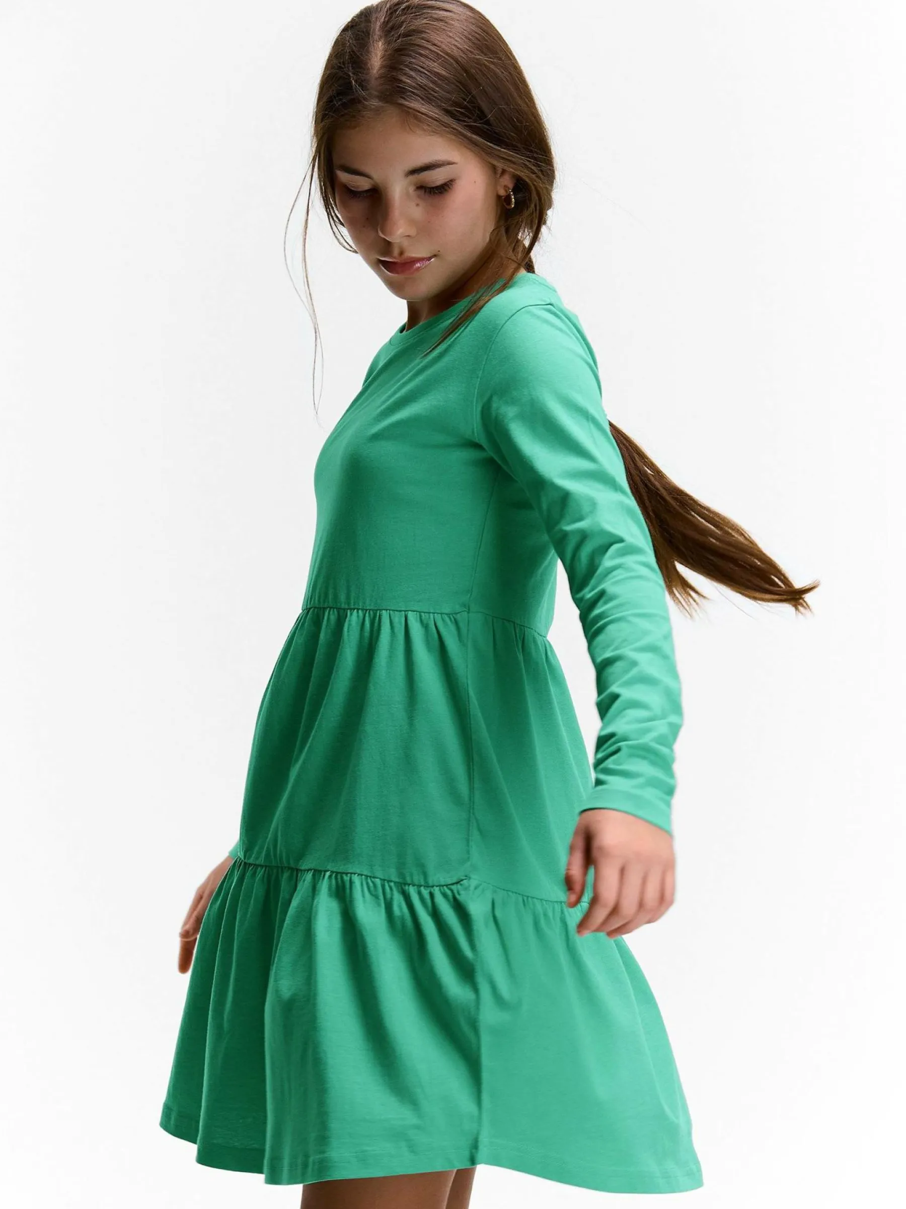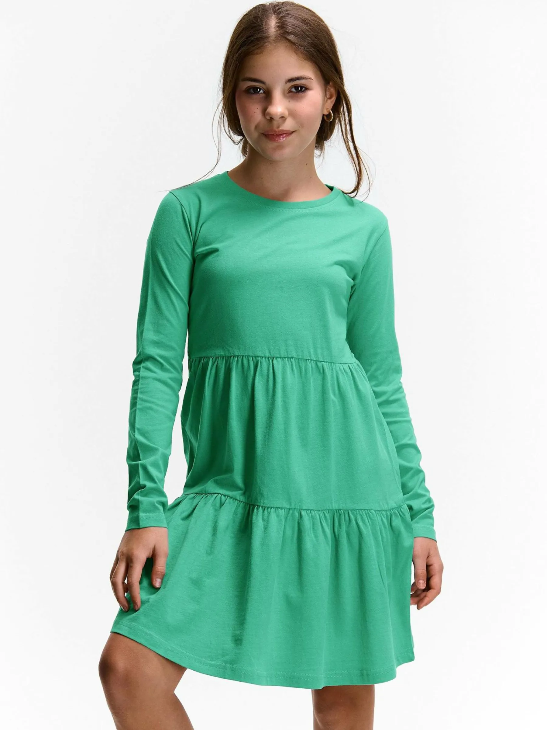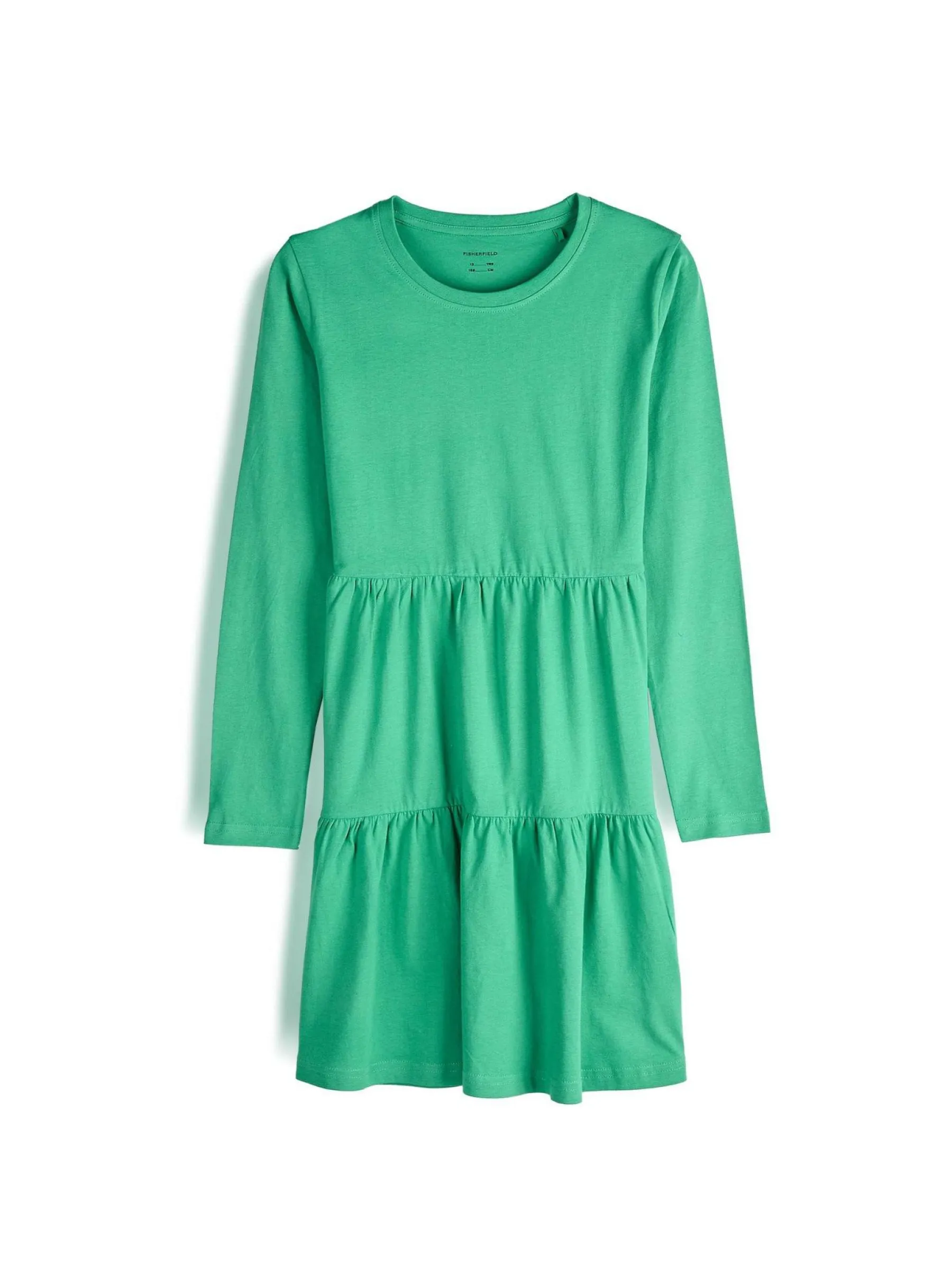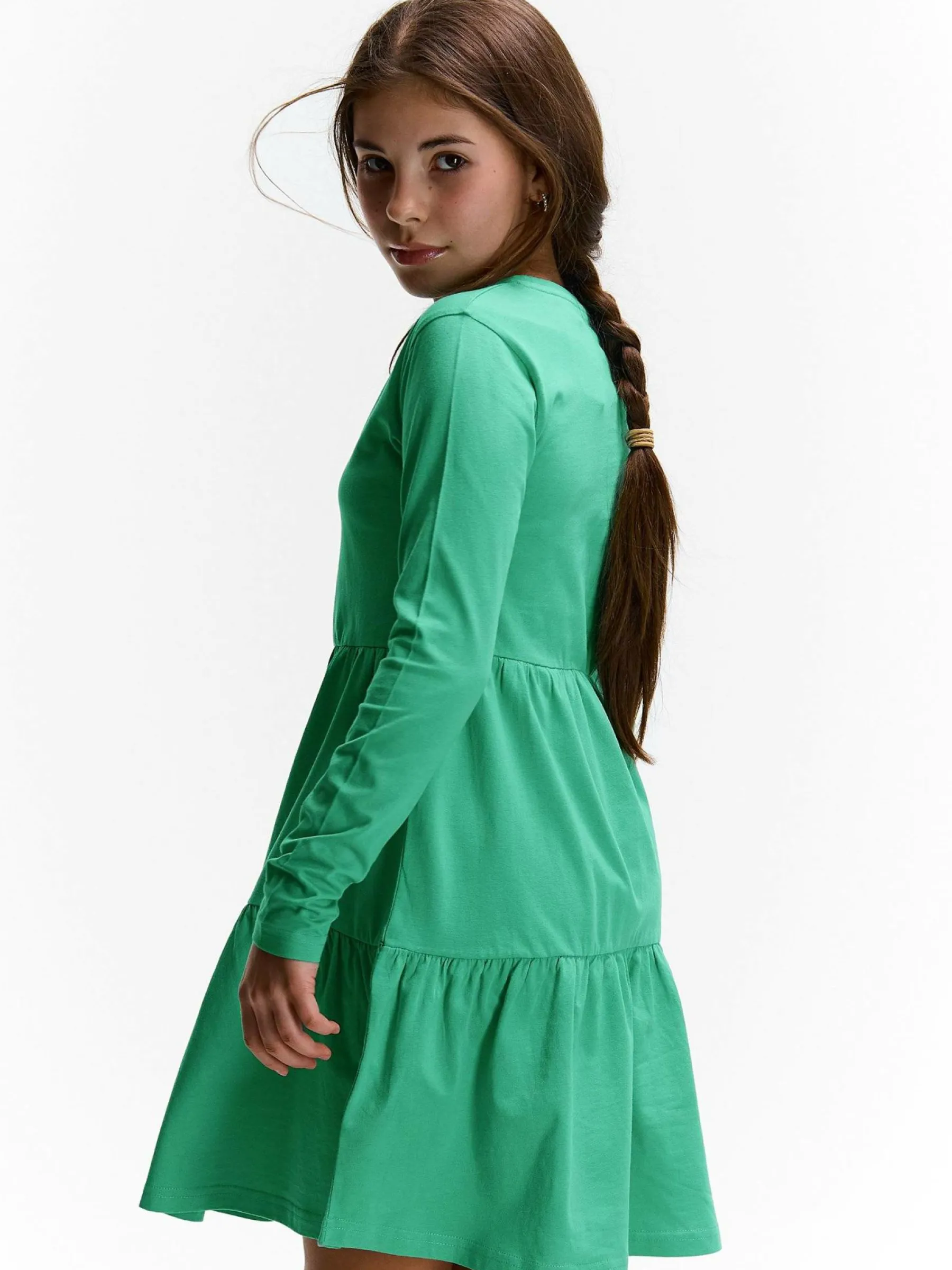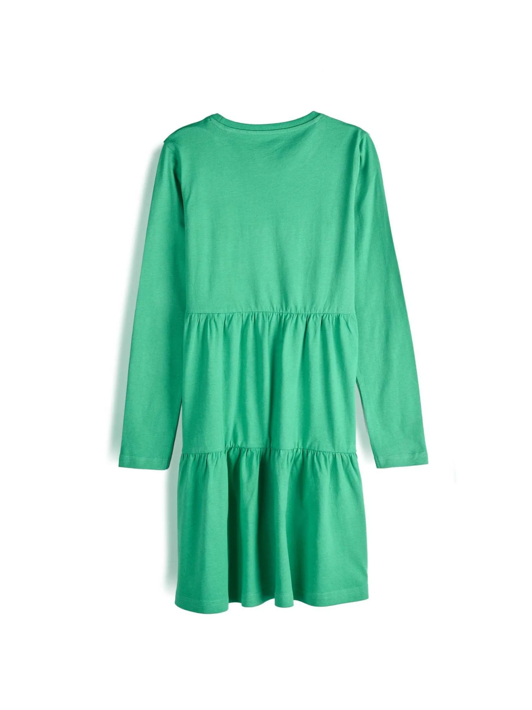 Kolor: zielonyKrój: z falbanąTyp: sukienkaRekaw: długi rękawDługość: miniPattern style: pojedynczy kolorDetal: na…