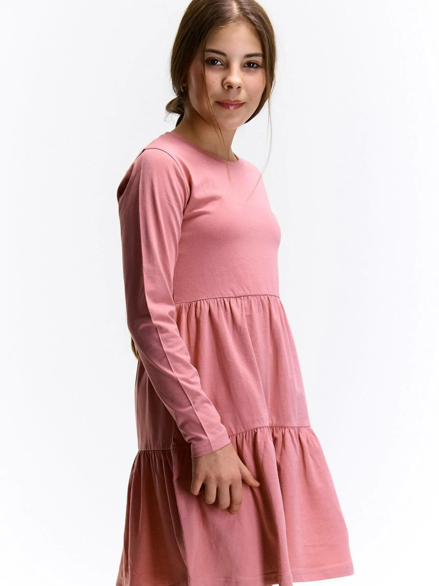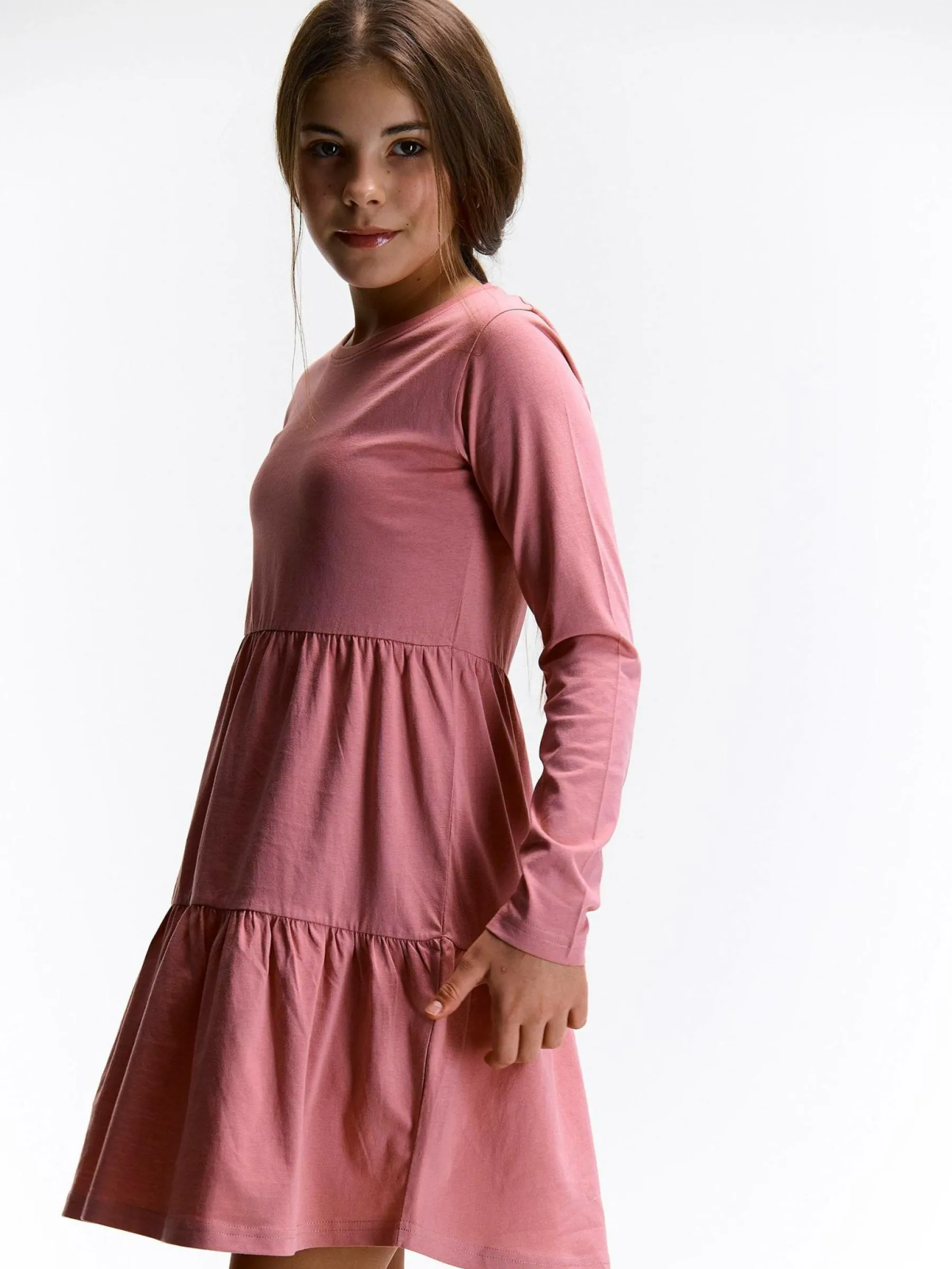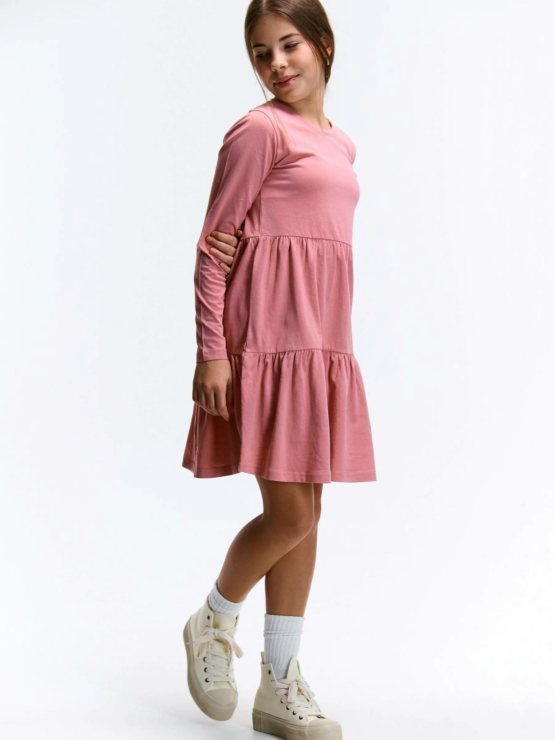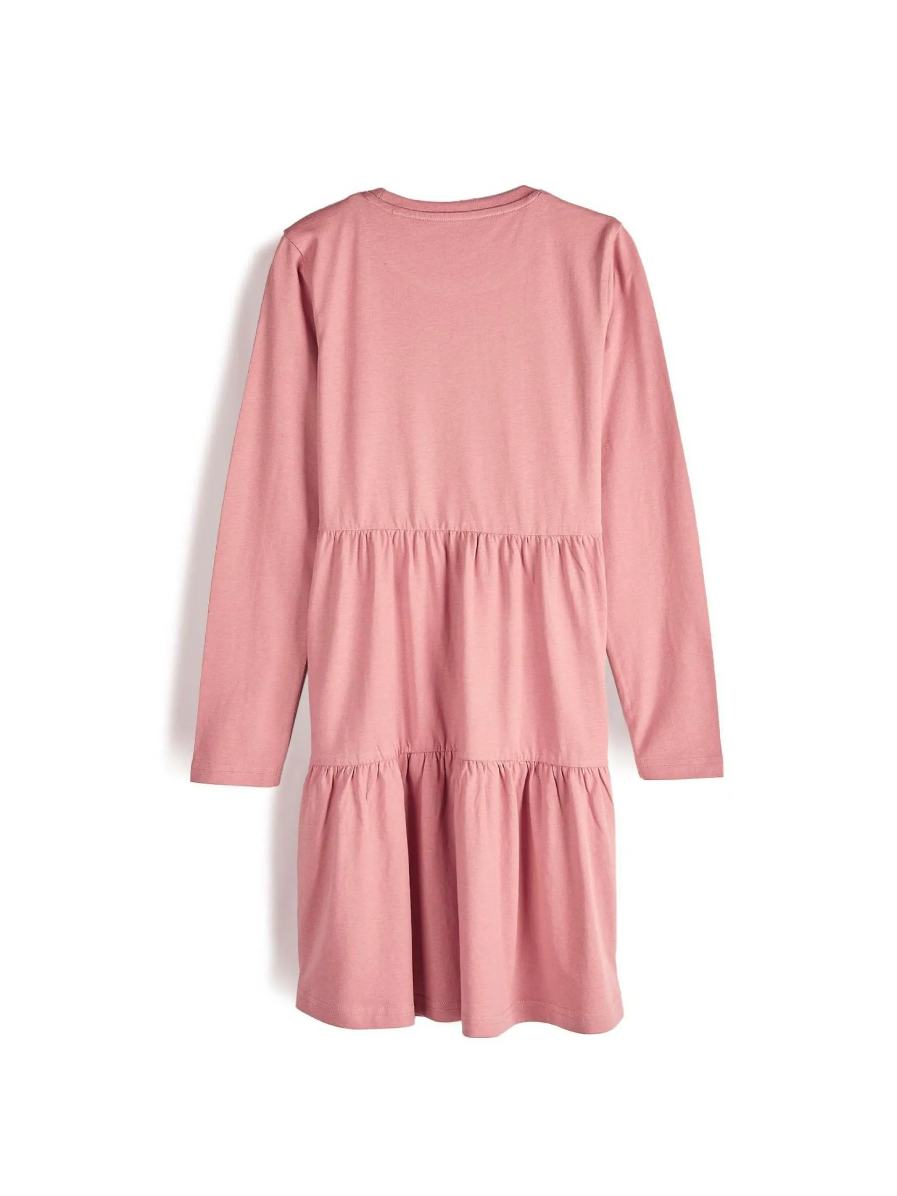 Kolor: różowyKrój: z falbanąTyp: sukienkaRekaw: długi rękawDługość: miniPattern style: pojedynczy kolorDetal: n…
