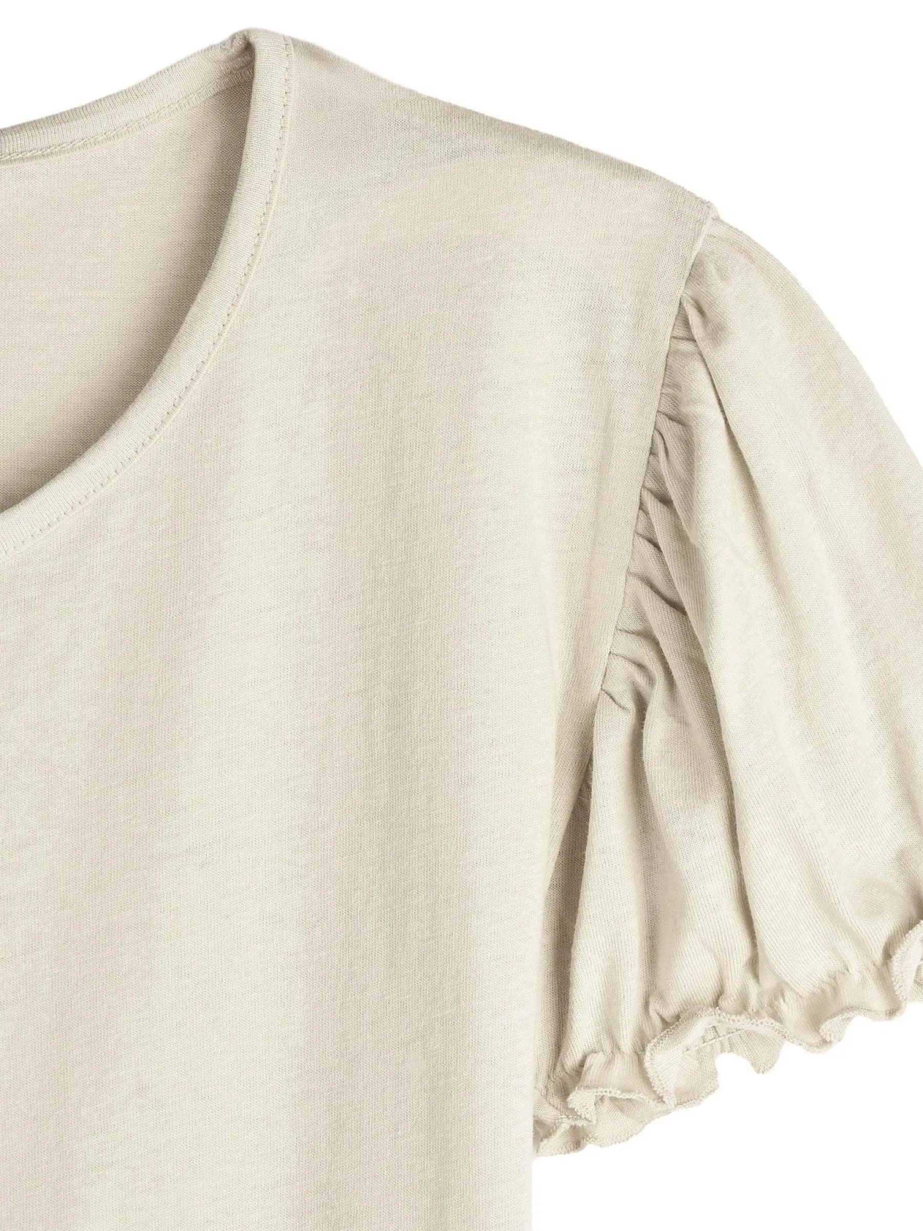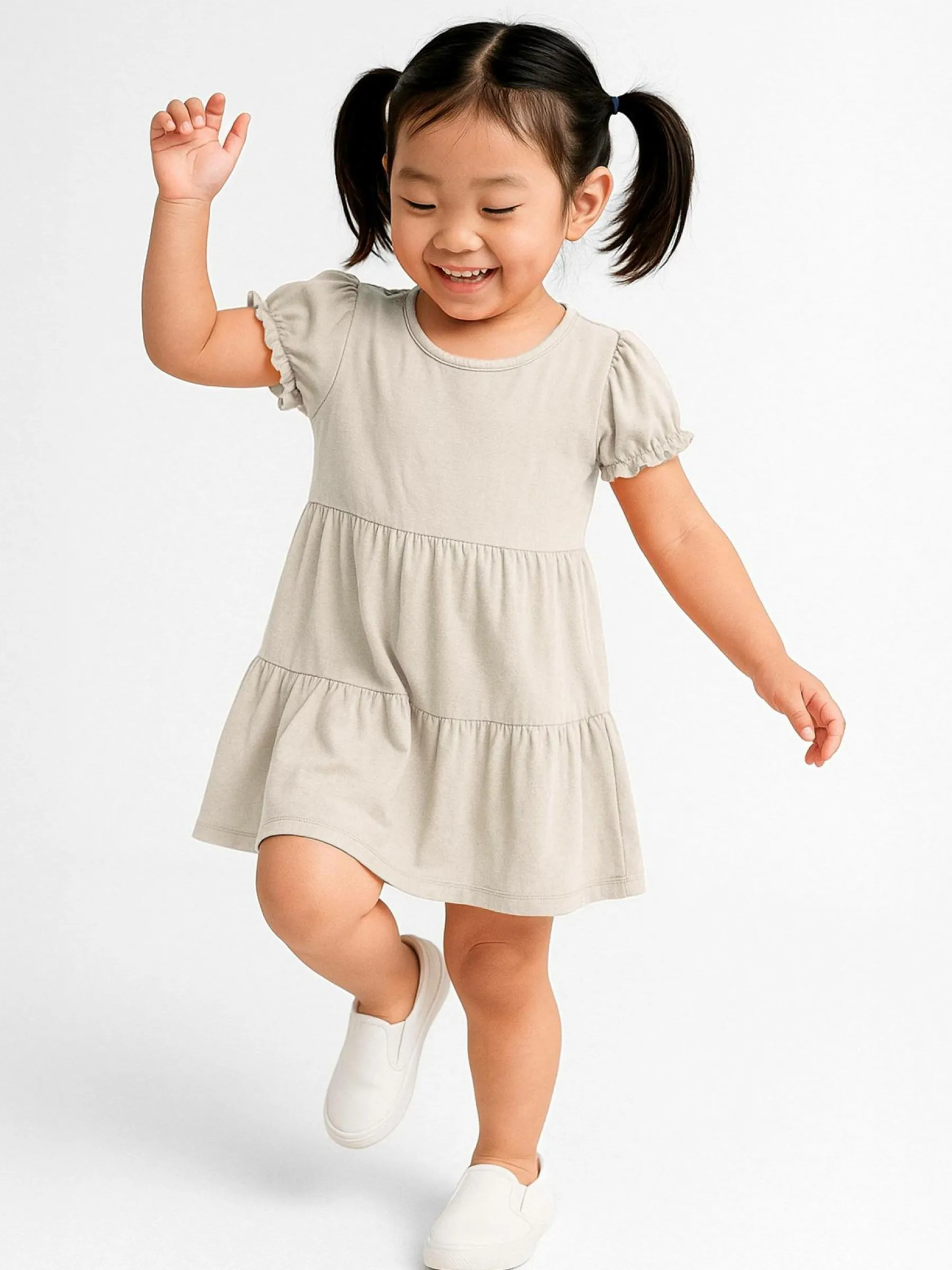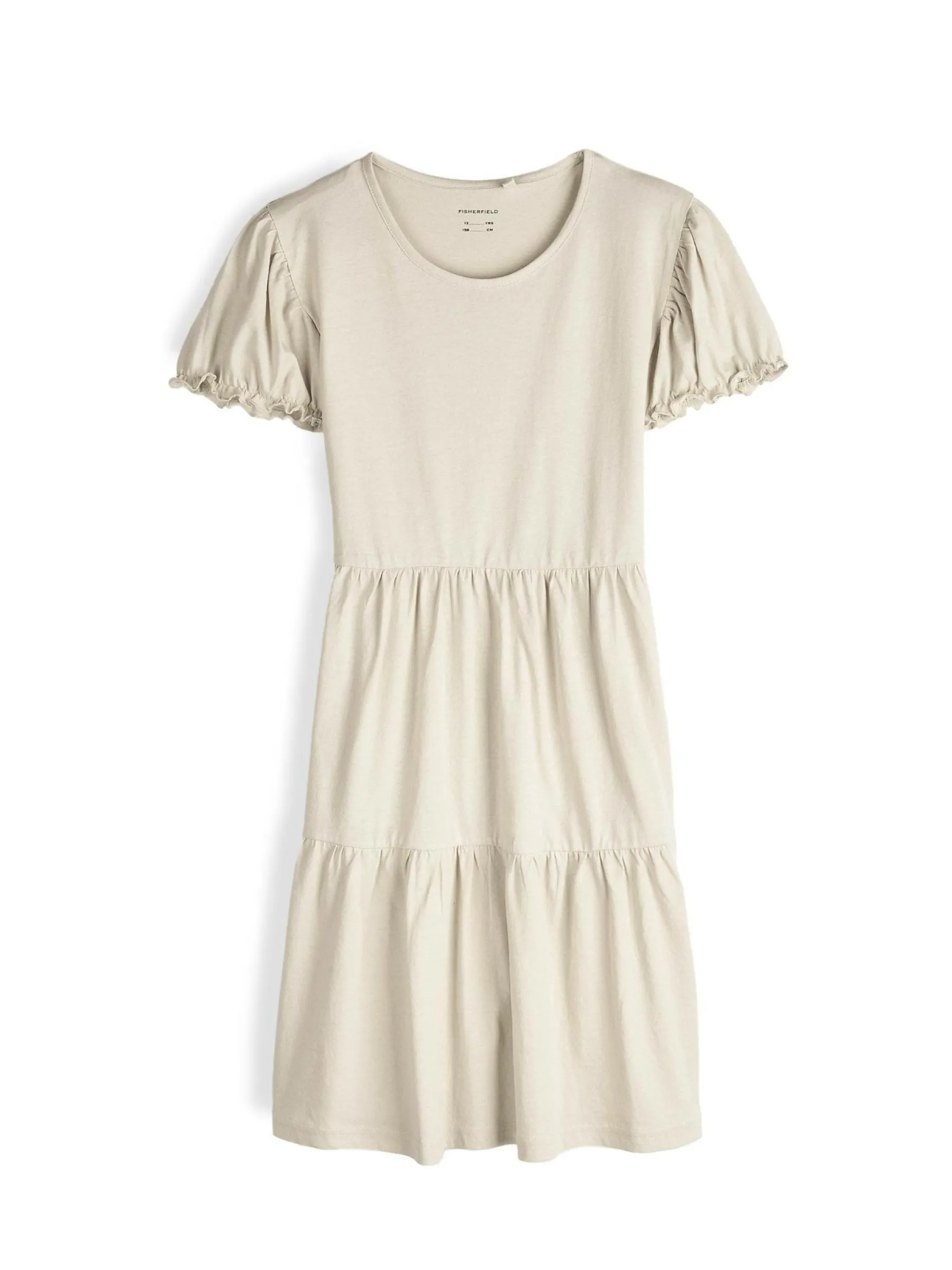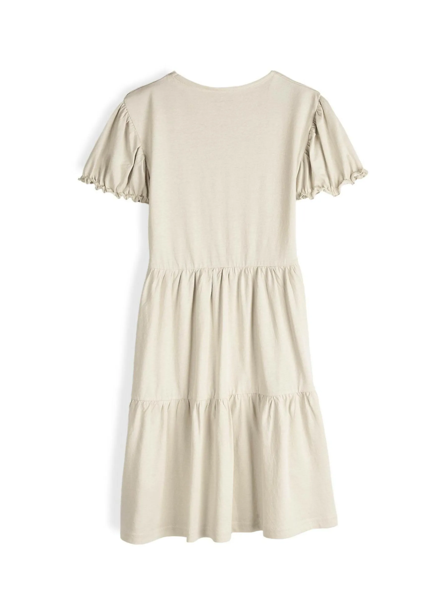 Kolor: beżowyKrój: z falbanąTyp: sukienkaRekaw: krótki rękawDługość: miniPattern style: pojedynczy kolorDetal: n…