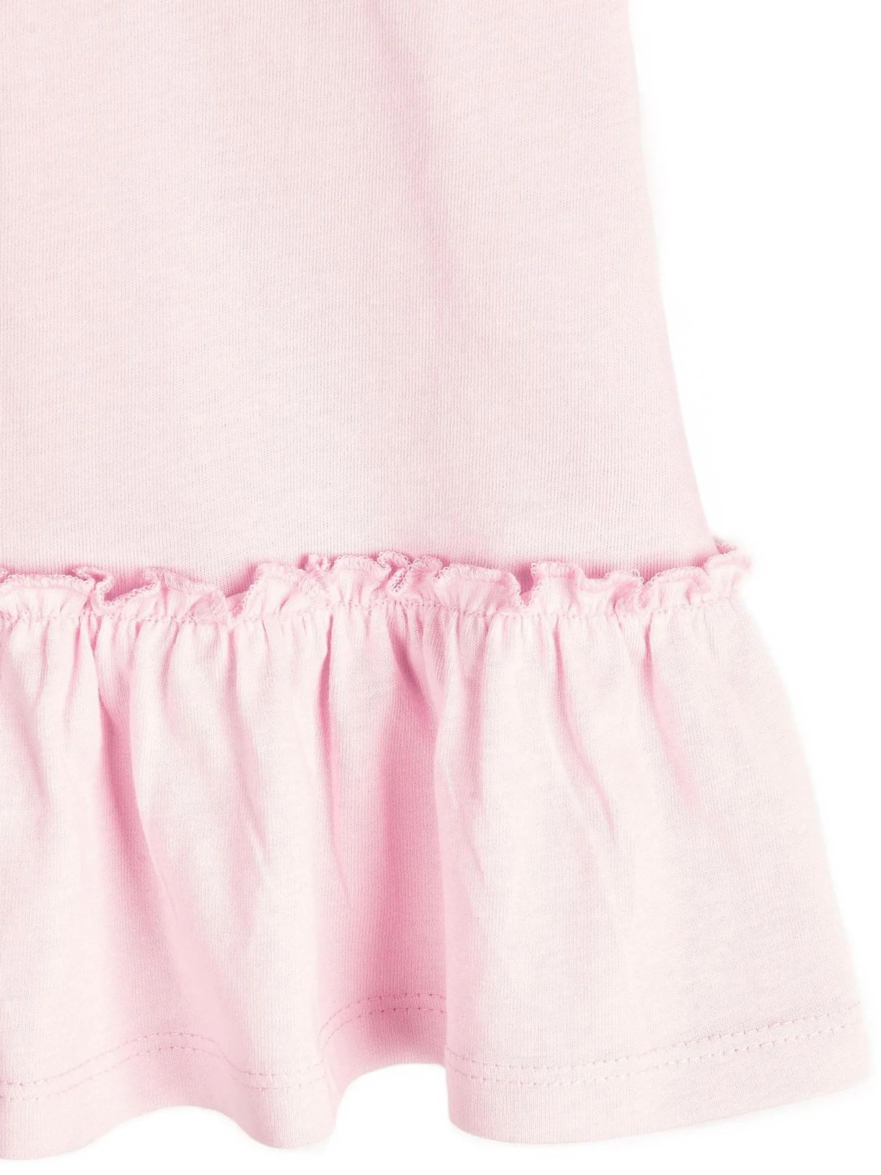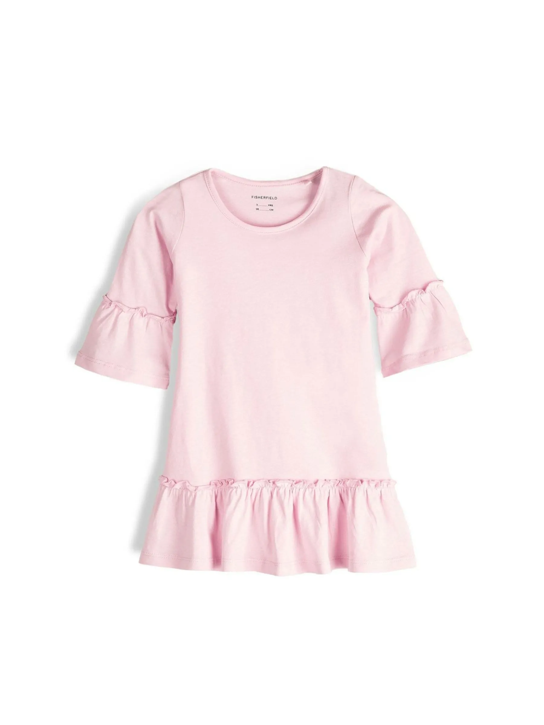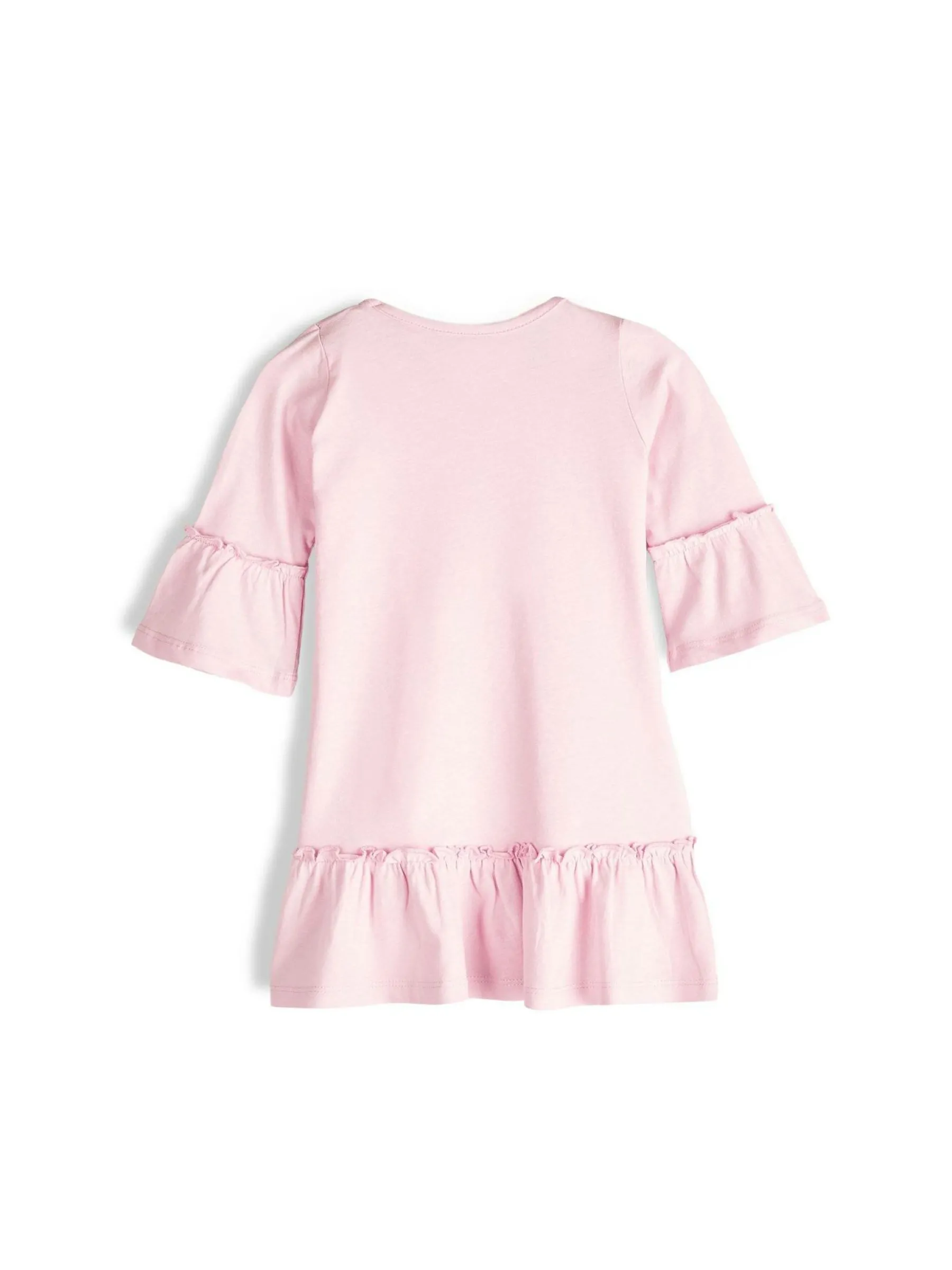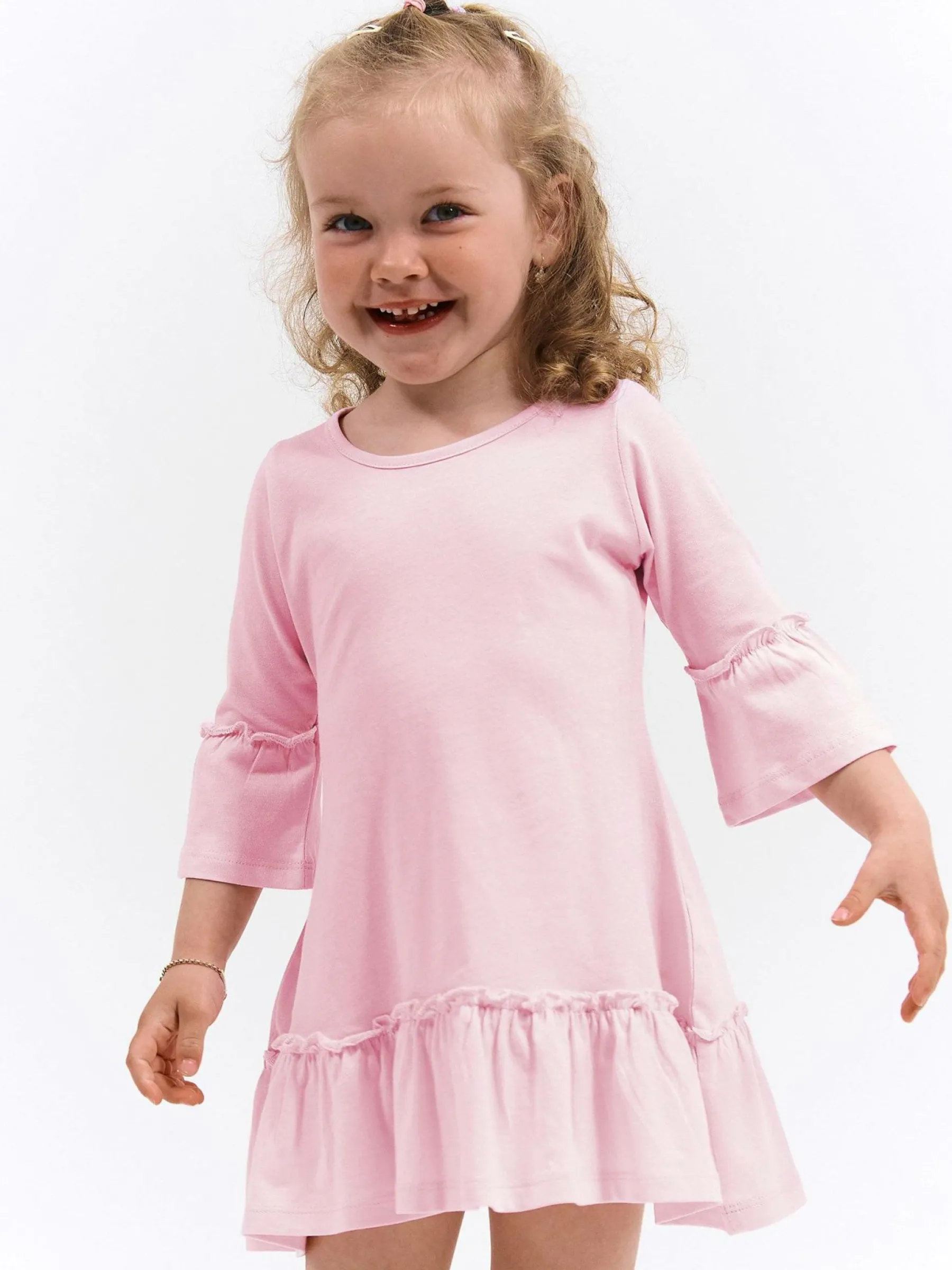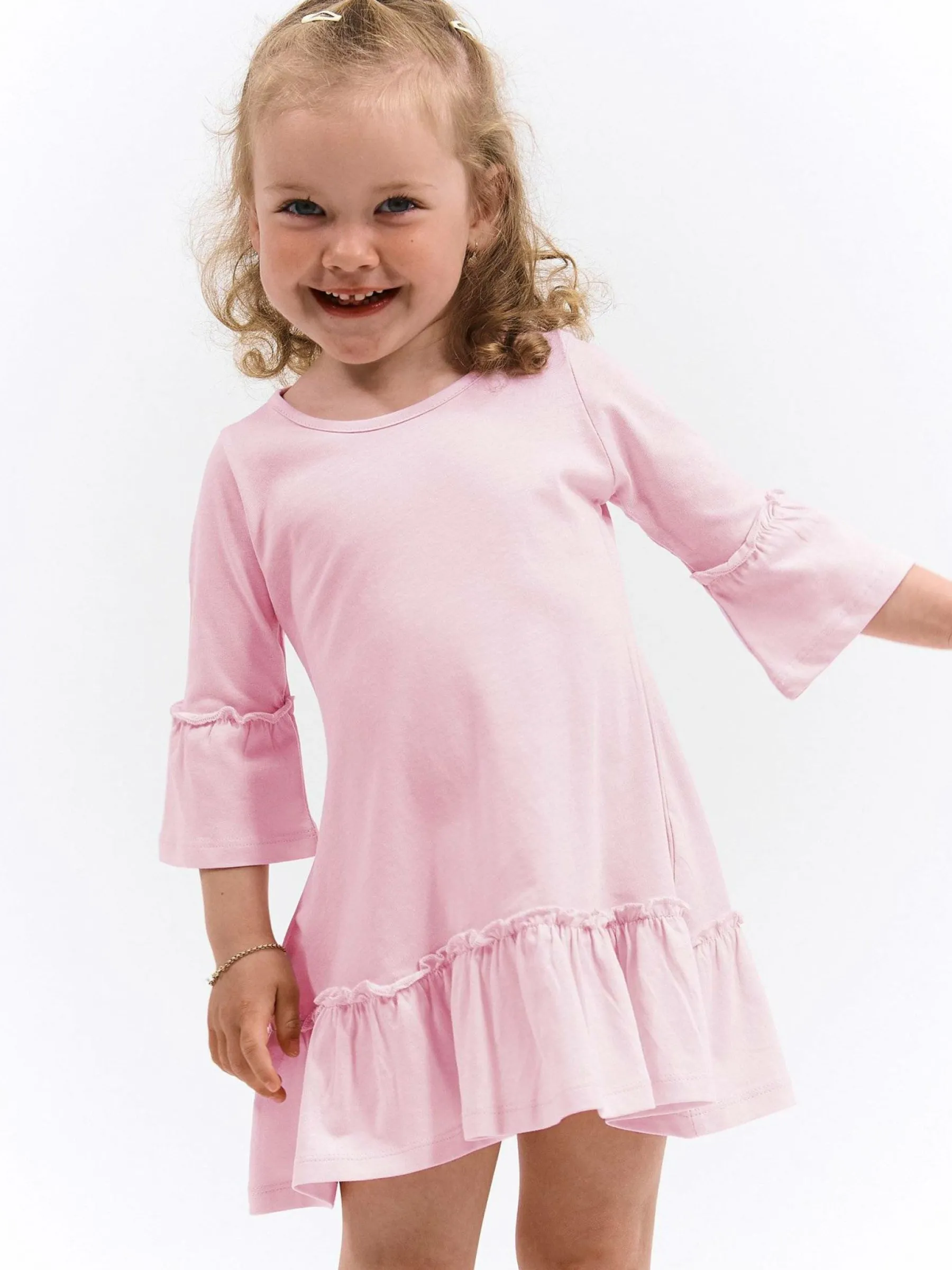 Kolor: różowyKrój: z falbanąTyp: sukienkaRekaw: rękaw 3/4Długość: miniPattern style: pojedynczy kolorDetal: nad …
