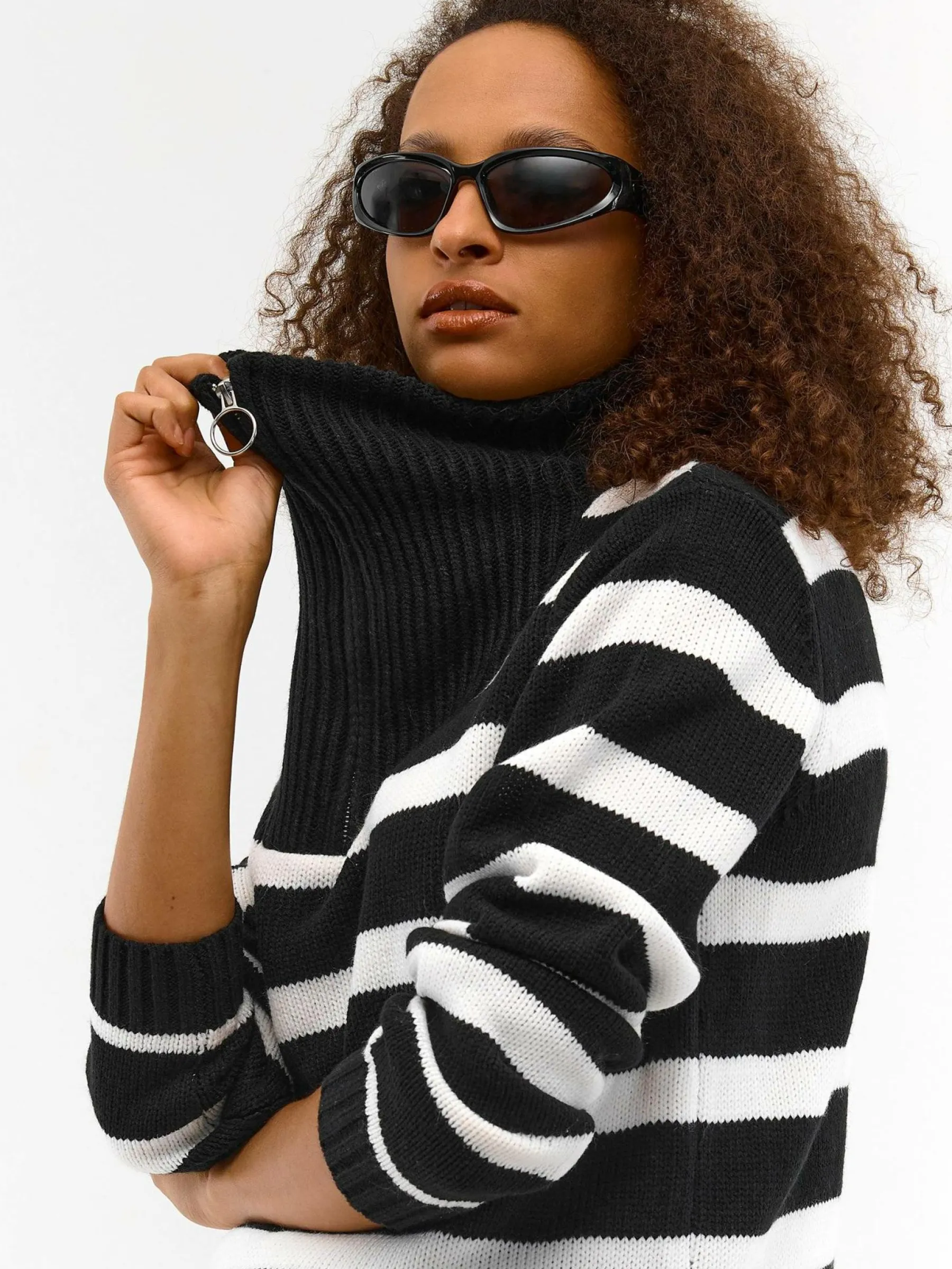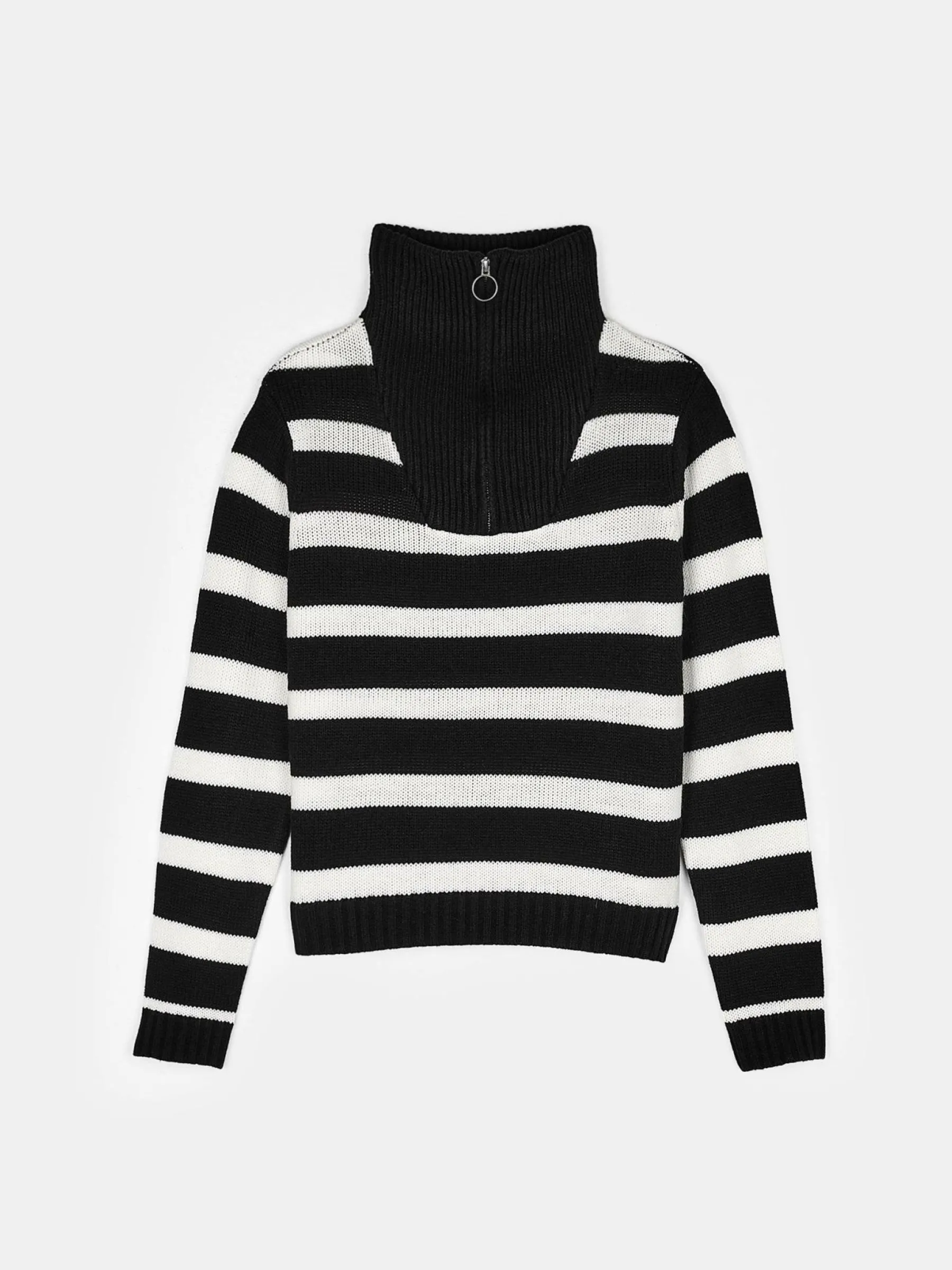 Kolor: czarnyKrój: regularTyp: swetryRekaw: długi rękawDługość: krótkiPattern style: w prążkiDetal: nad głową…