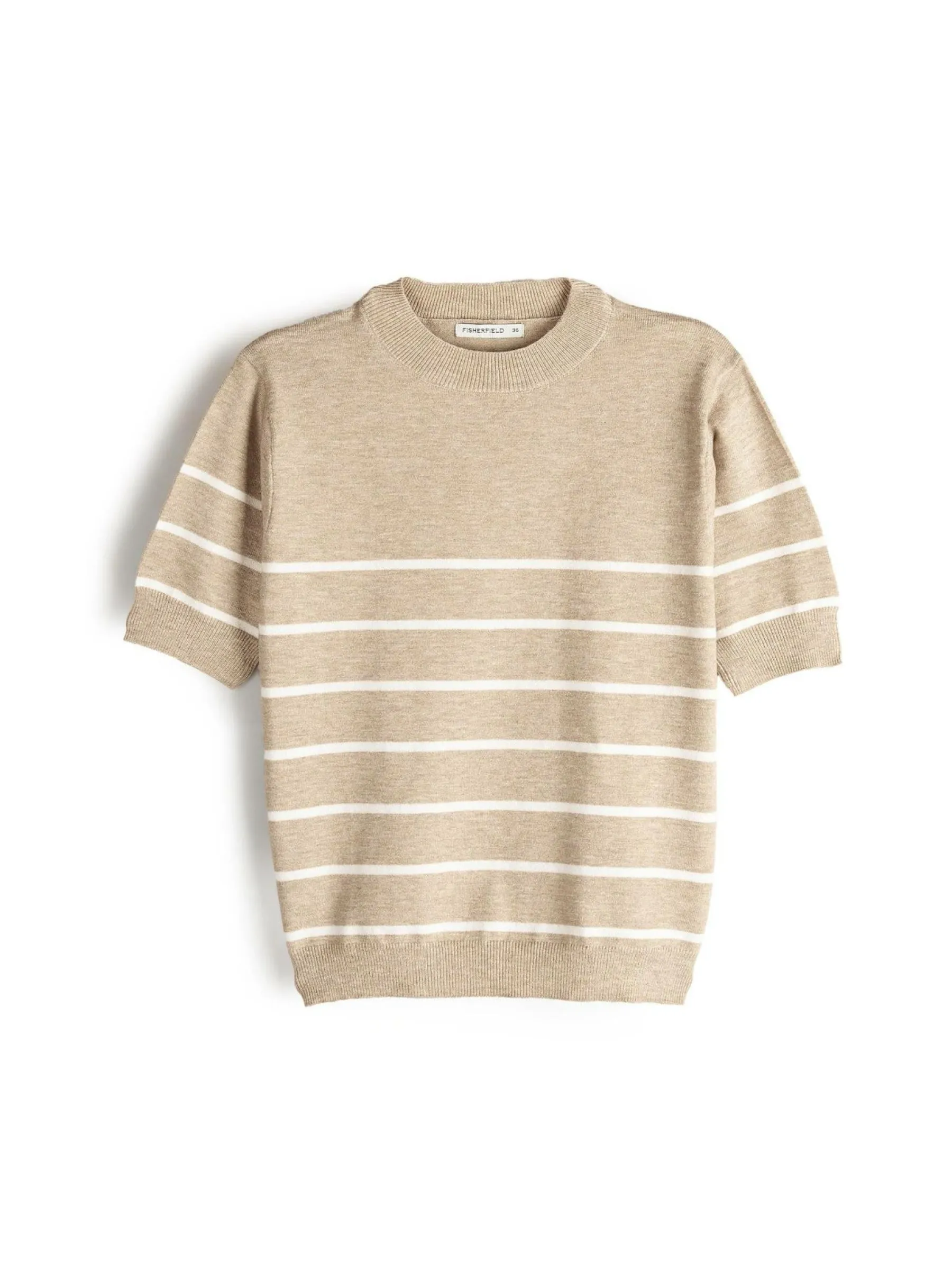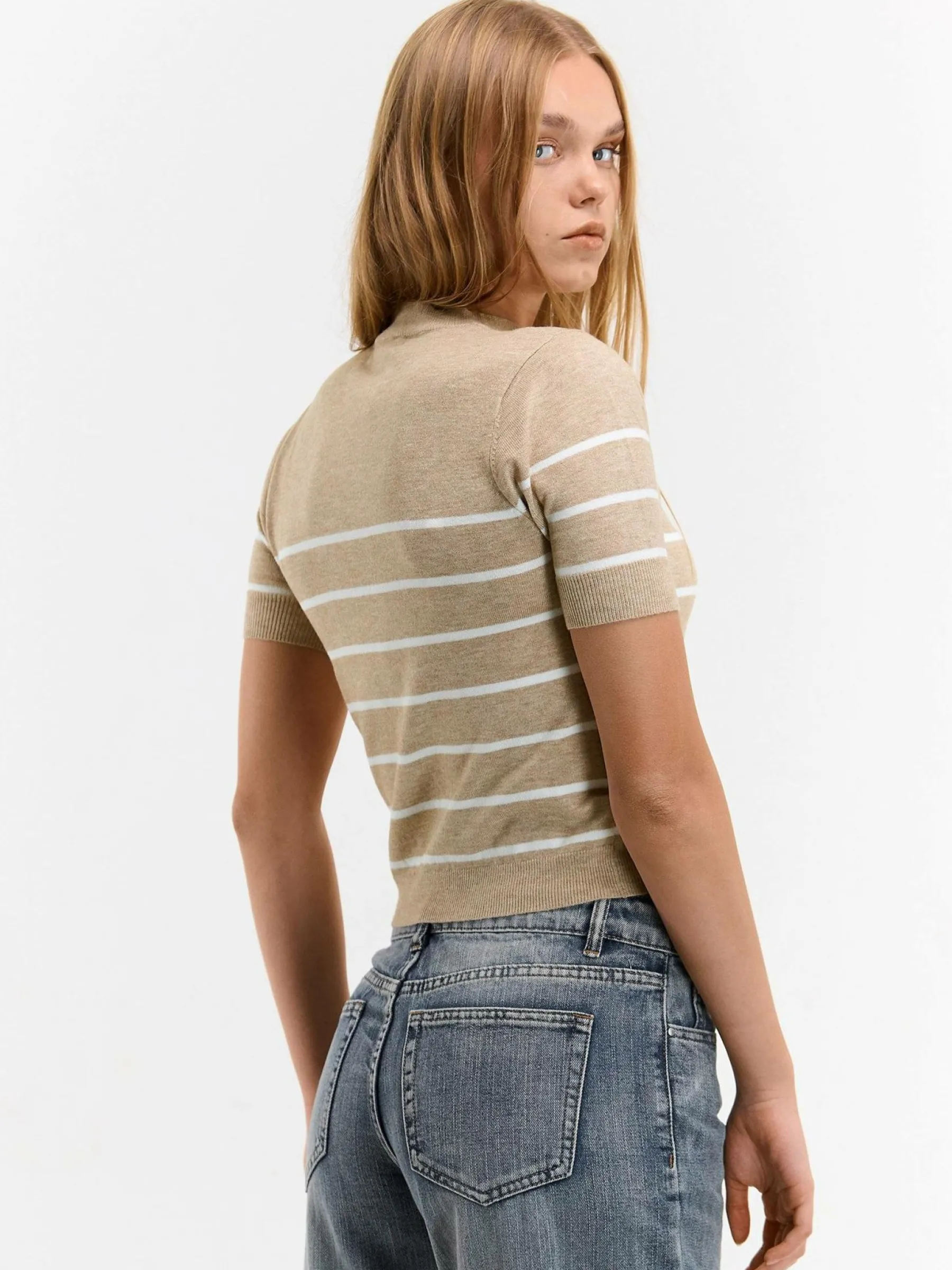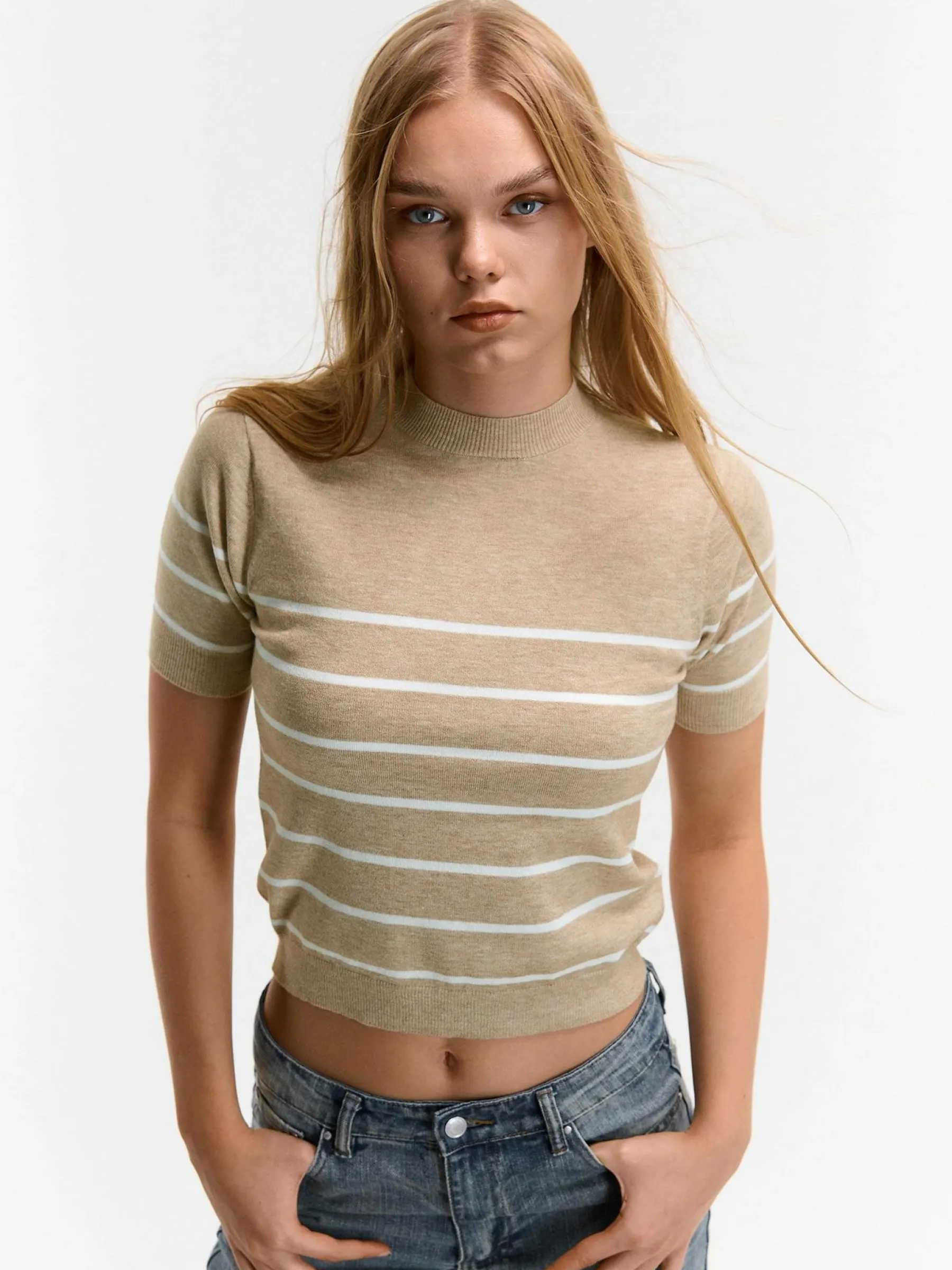 Kolor: beżowyKrój: regularTyp: swetryRekaw: krótki rękawDługość: krótkiPattern style: w prążkiDetal: nad głow…