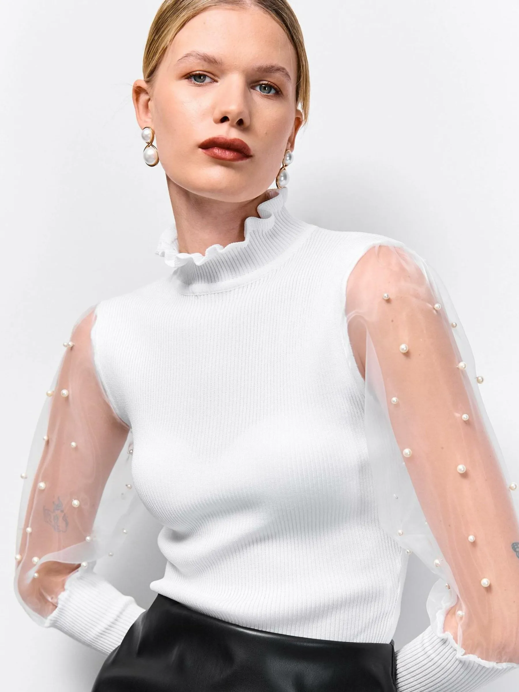 Kolor: białyKrój: regularTyp: swetryRekaw: długi rękawDługość: krótkiPattern style: żebrowany, pojedynczy kolor…