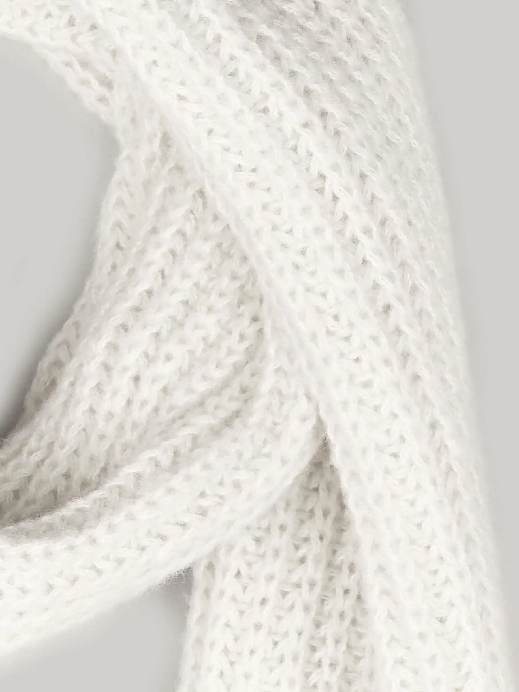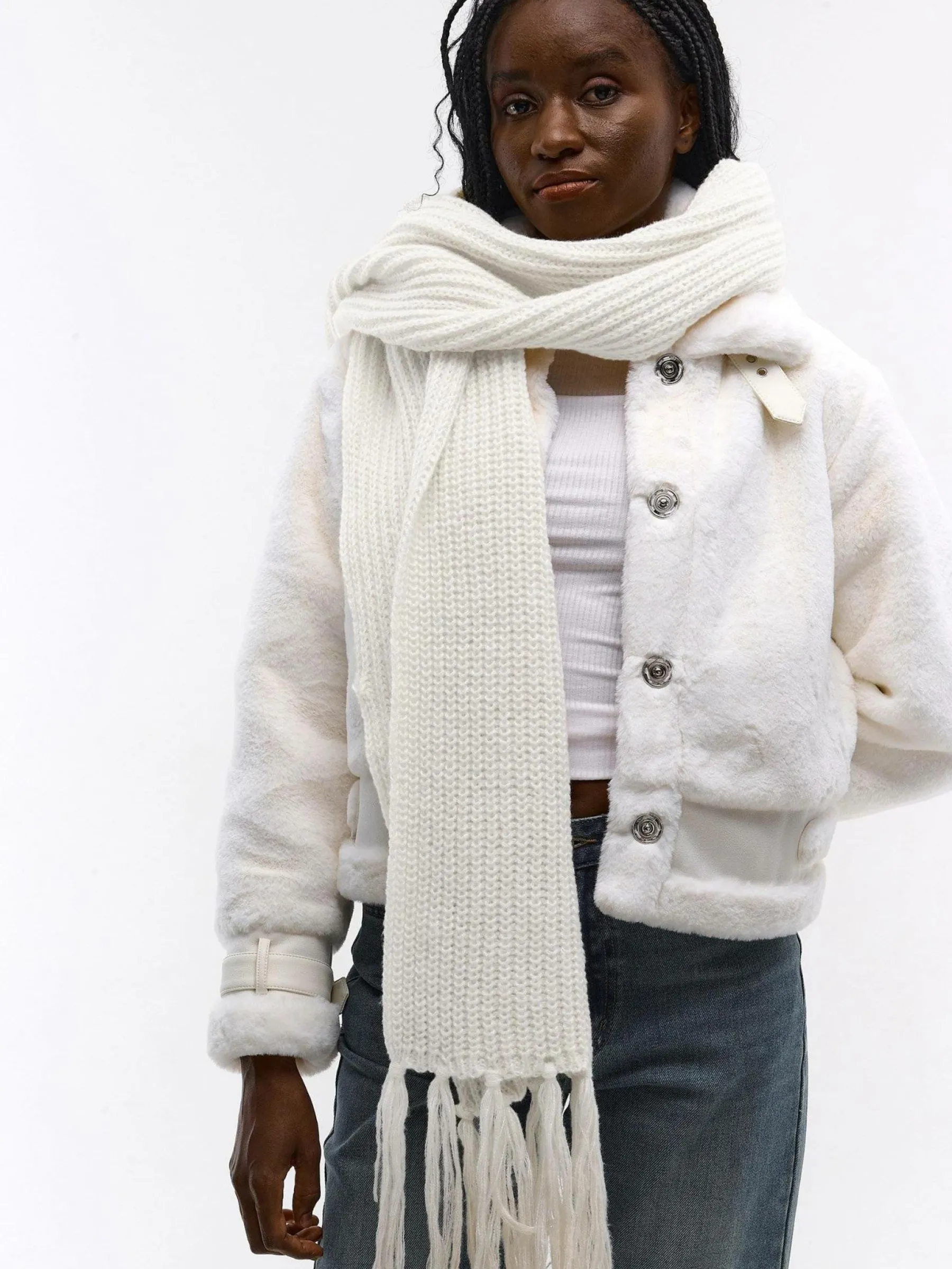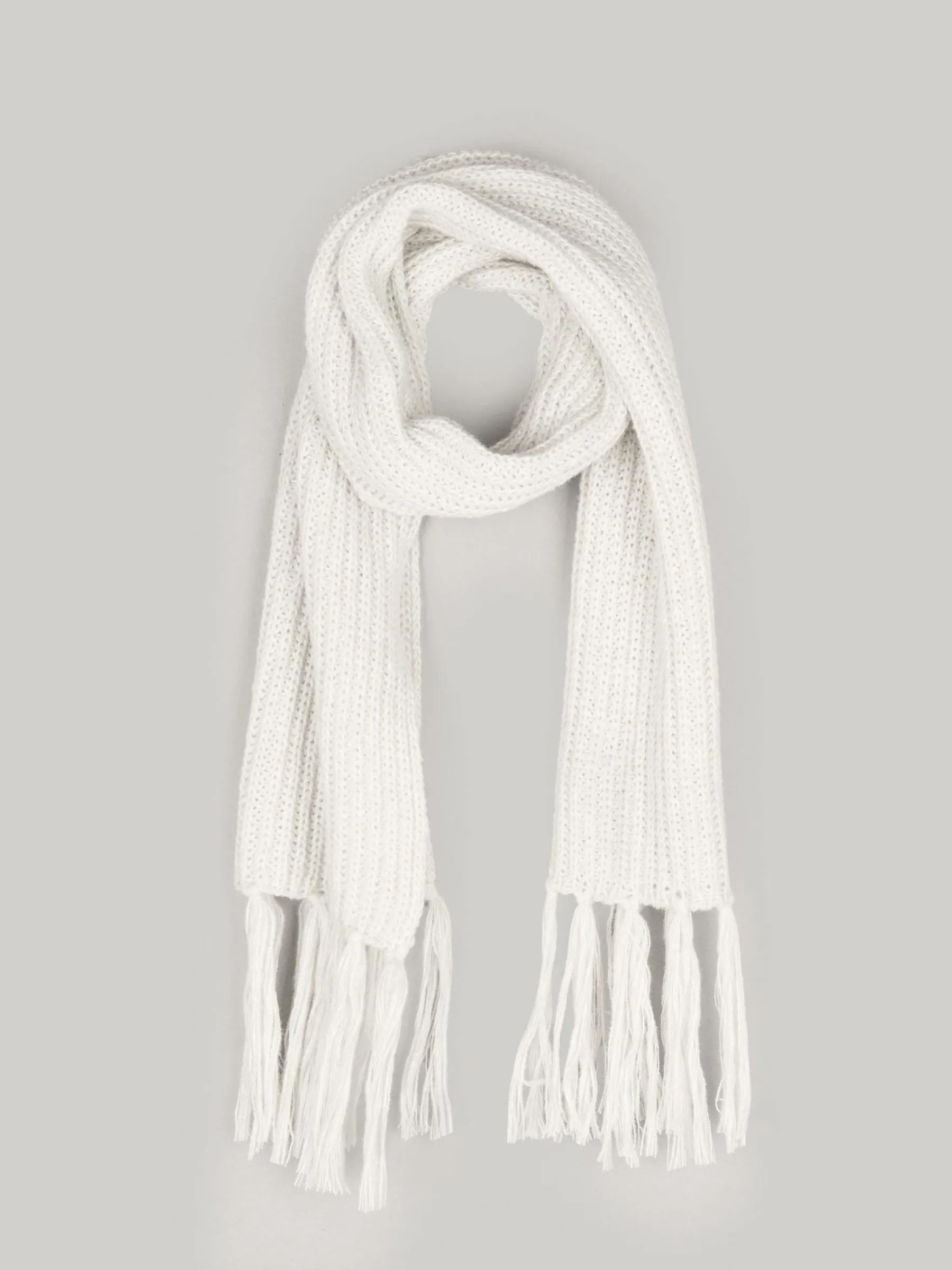 Kolor: białyKrój: podstawowyTyp: szalPattern style: pojedynczy kolorDetal: z frędzlamiMateriał: trykotowyPłeć: kob…