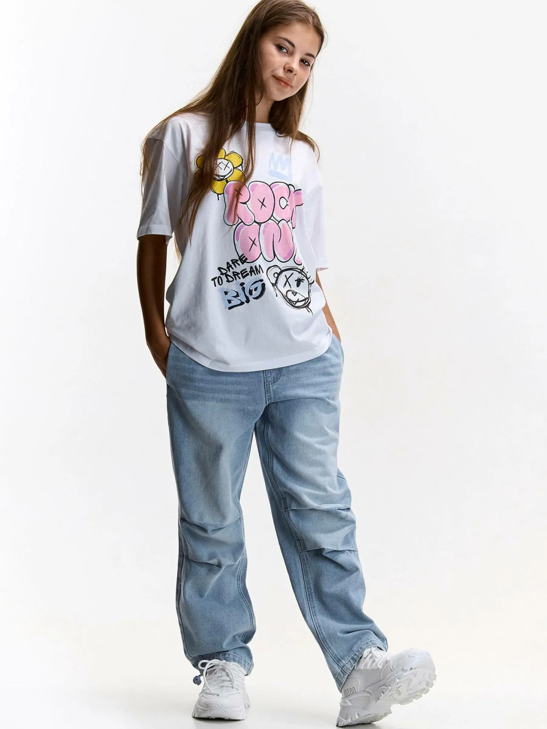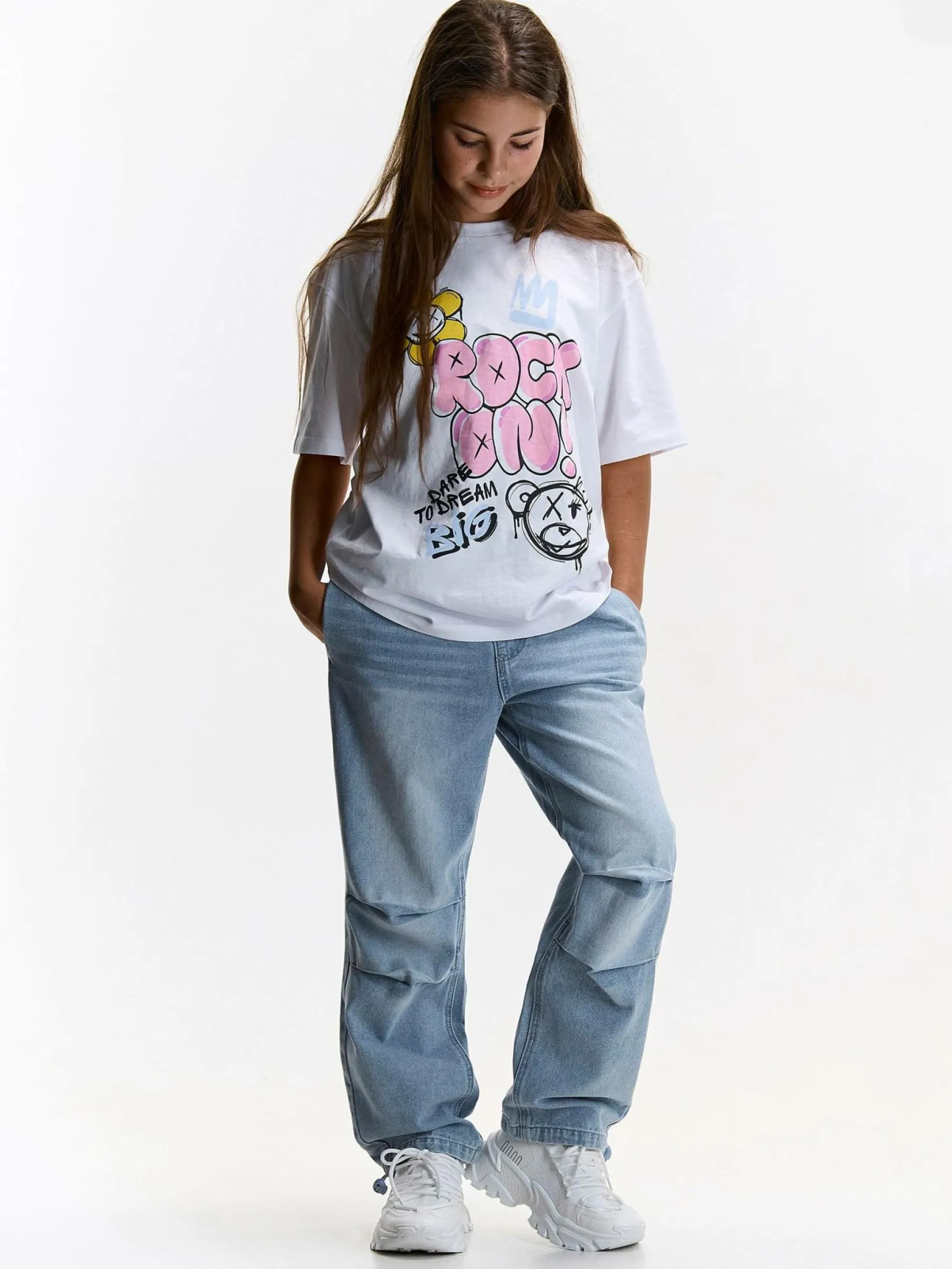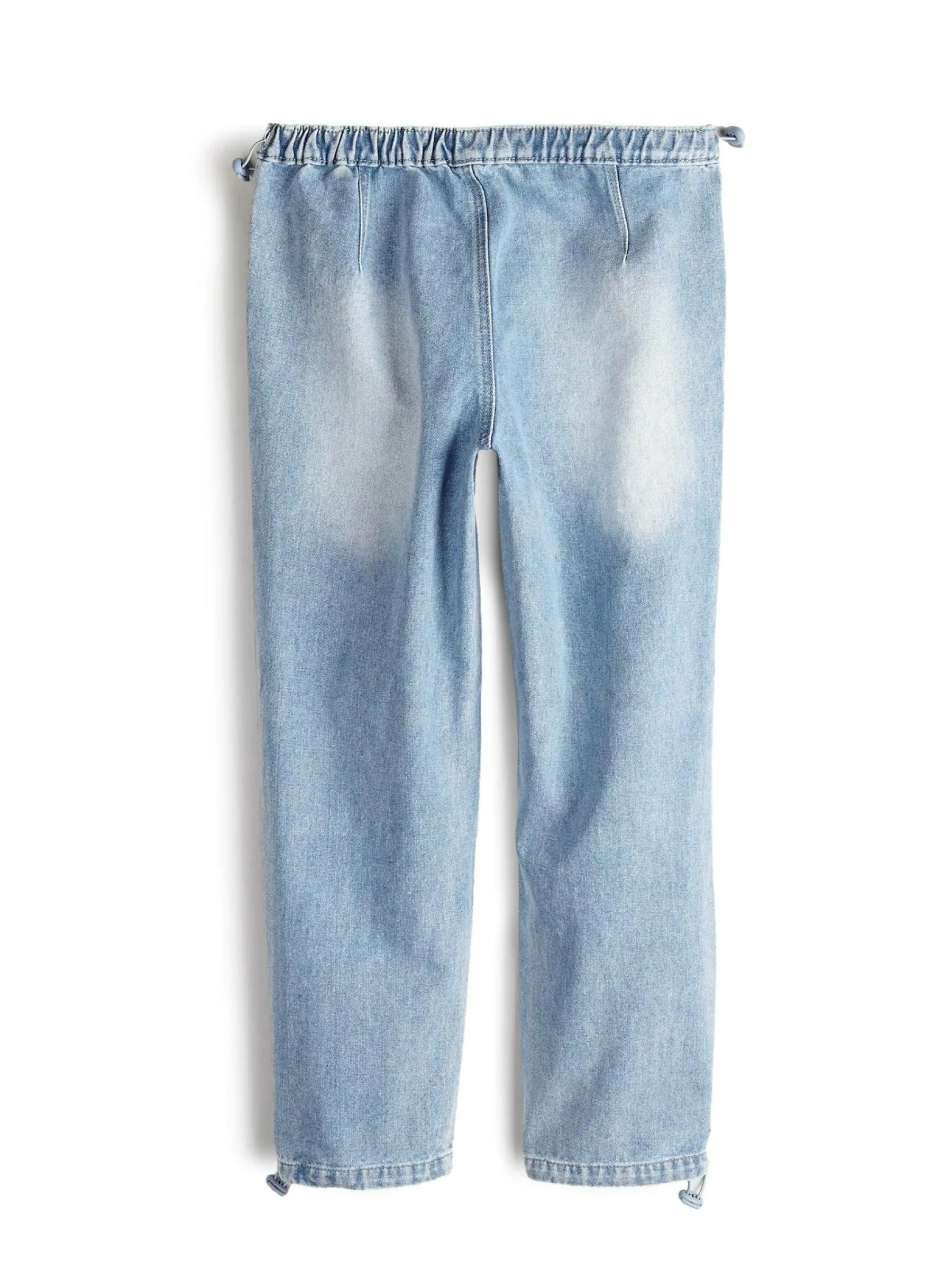 Kolor: niebieskiKrój: szerokieTyp: jeansDługość: dlugiePattern style: pojedynczy kolorDetal: z przeszyciami na kolan…
