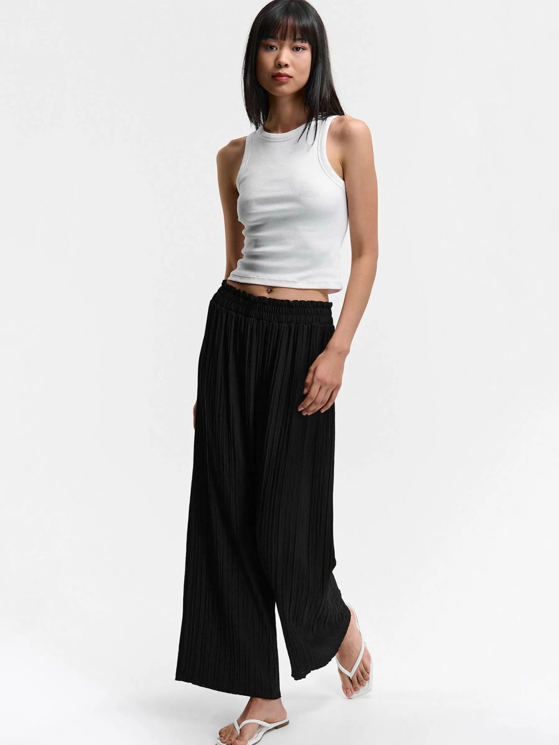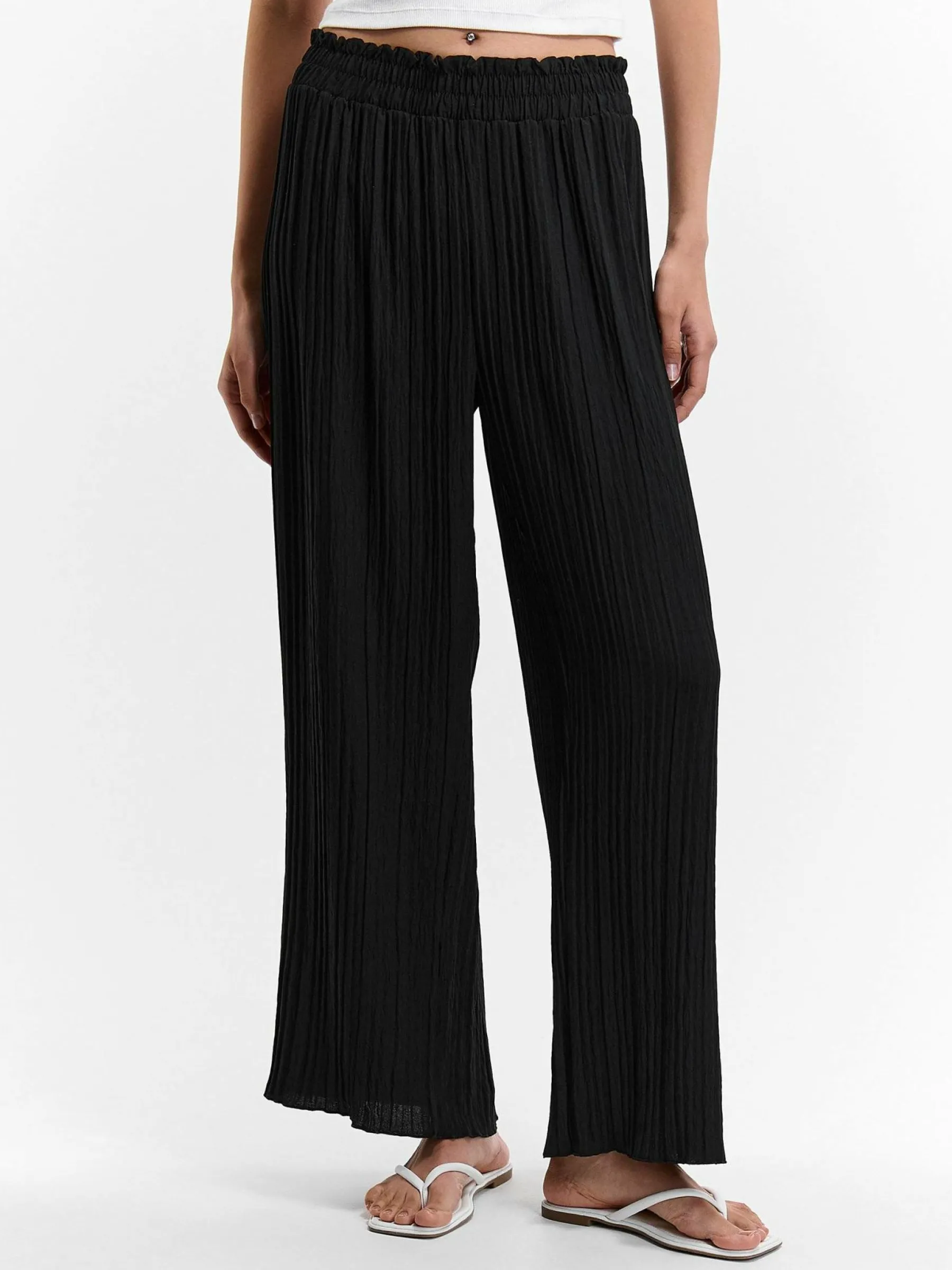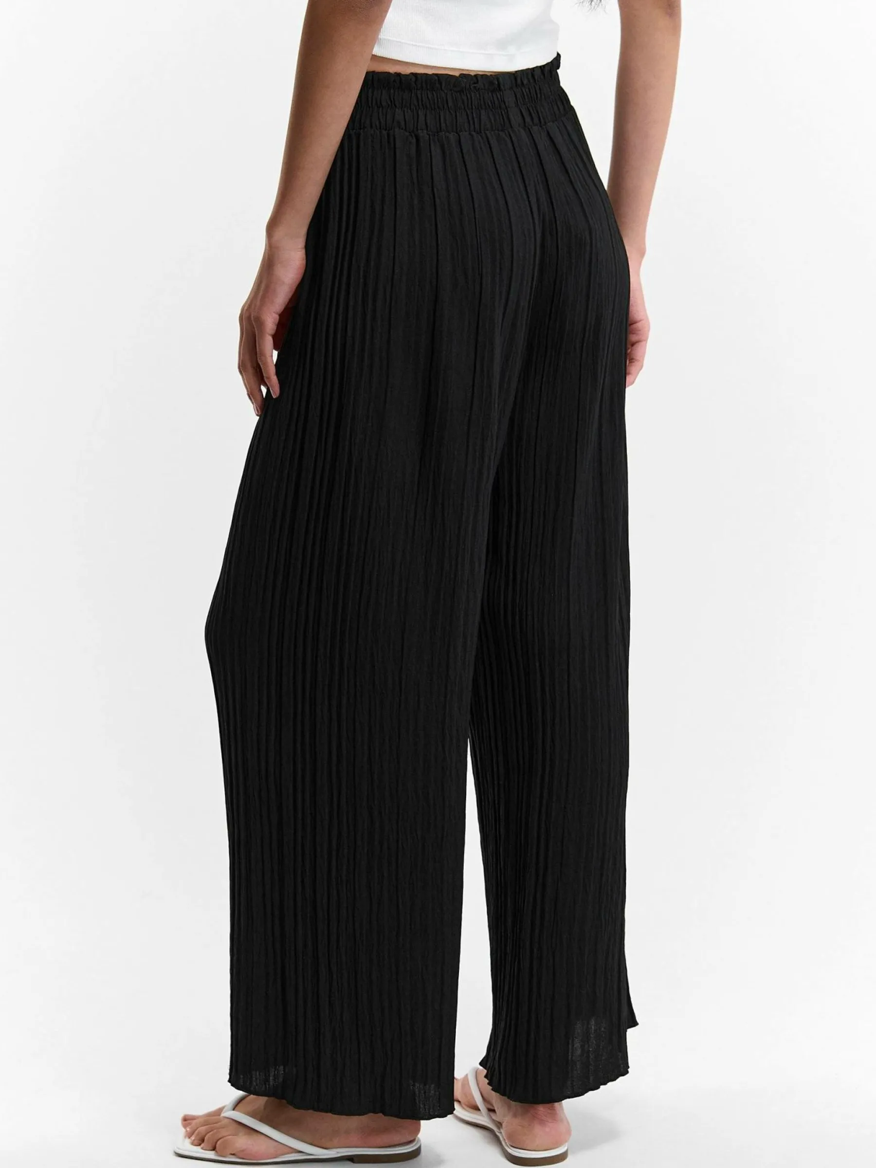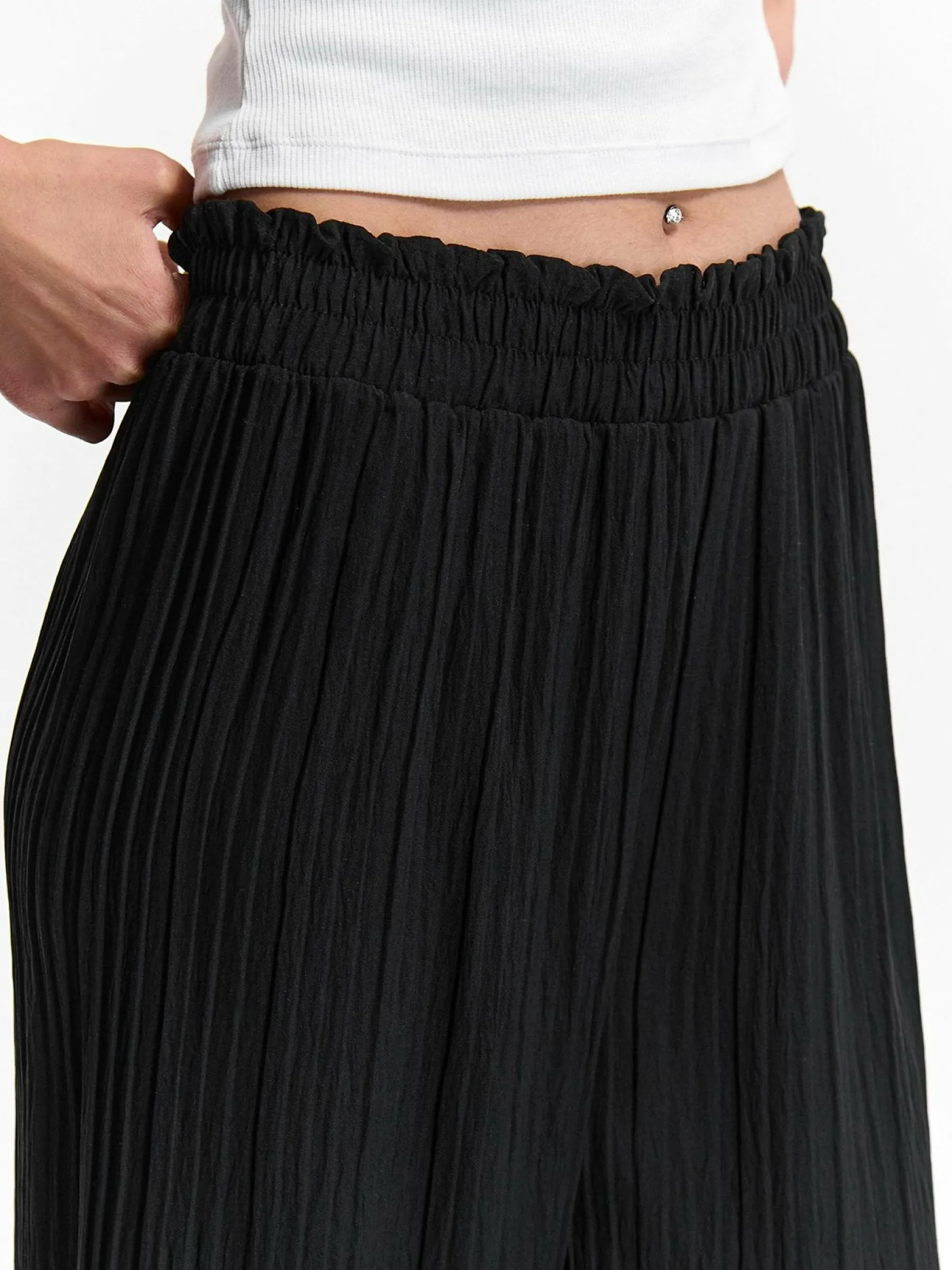 Kolor: czarnyKrój: szerokie, plisowaneTyp: spodnieDługość: dlugiePattern style: pojedynczy kolorDetal: z elastyczną…
