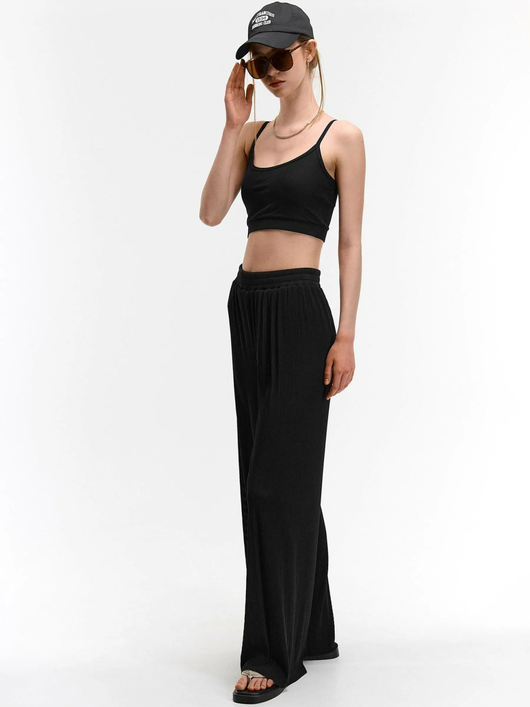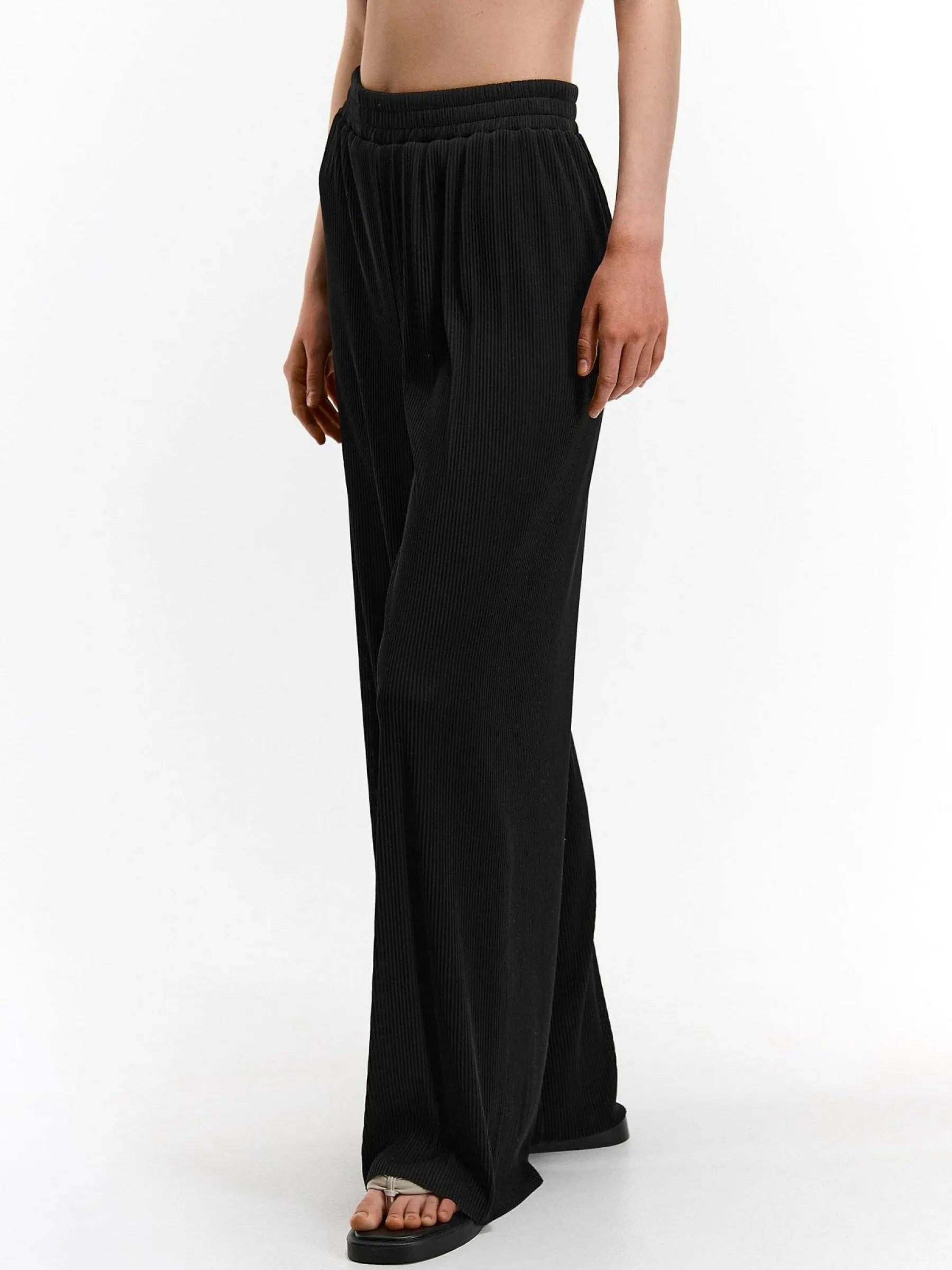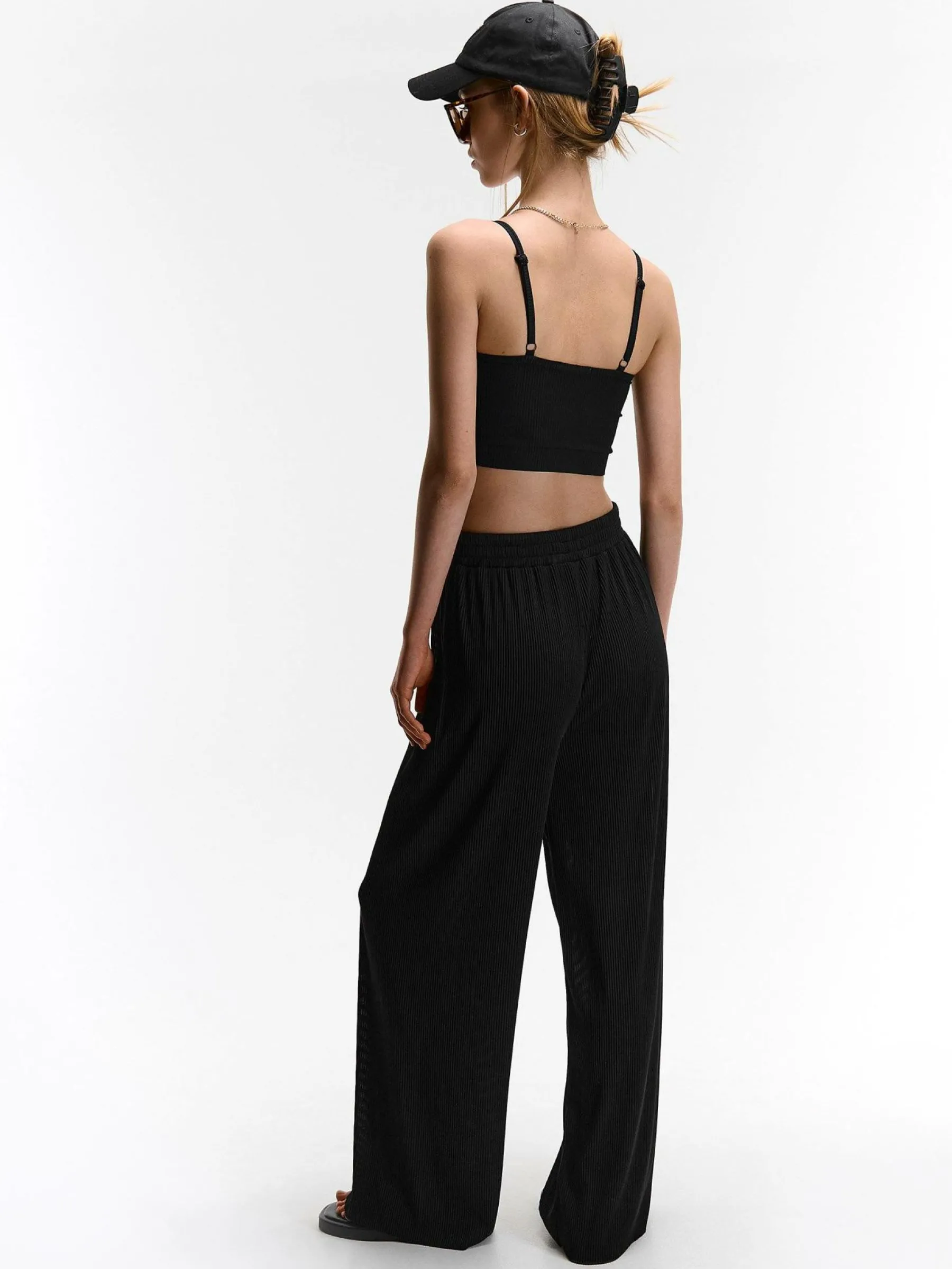 Kolor: czarnyKrój: szerokie, plisowaneTyp: spodnieDługość: dlugiePattern style: pojedynczy kolorDetal: z elastyczną…