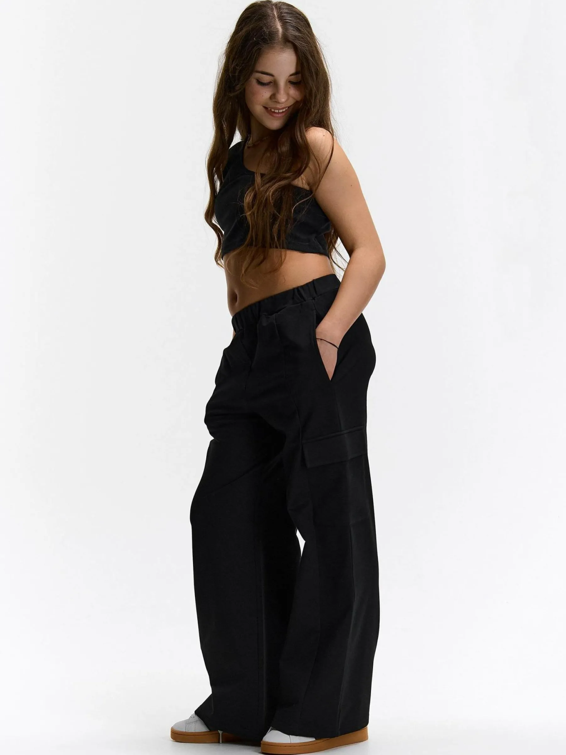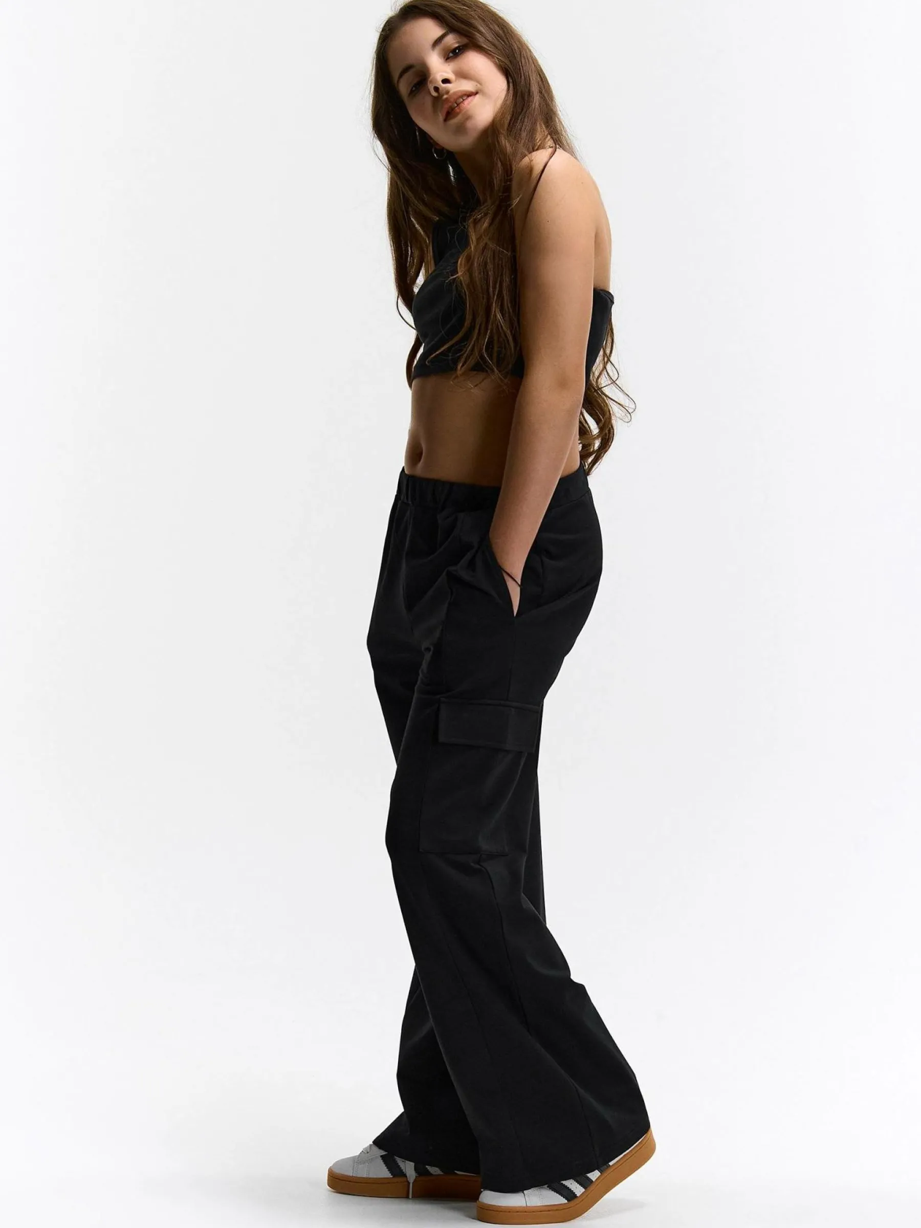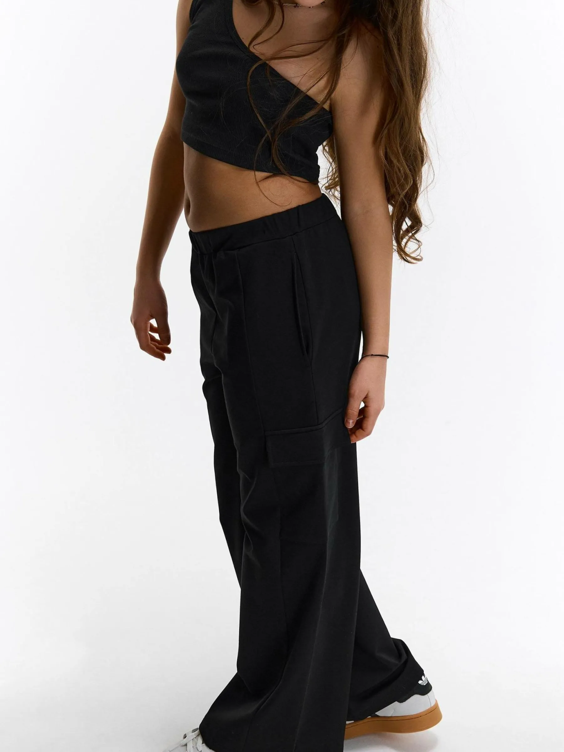 Kolor: czarnyKrój: szerokieTyp: spodnie dresoweDługość: dlugiePattern style: pojedynczy kolorDetal: z elastyczną op…
