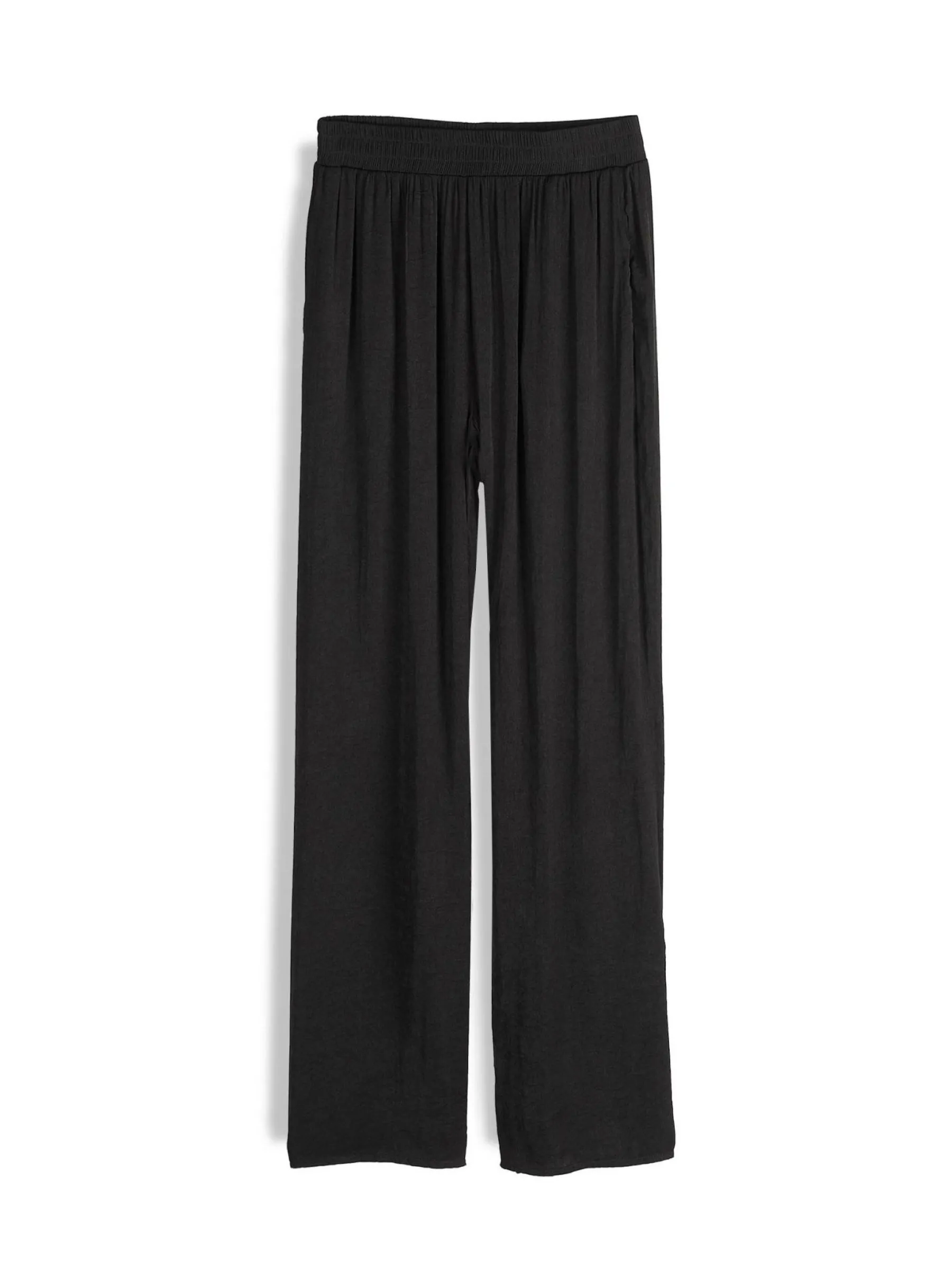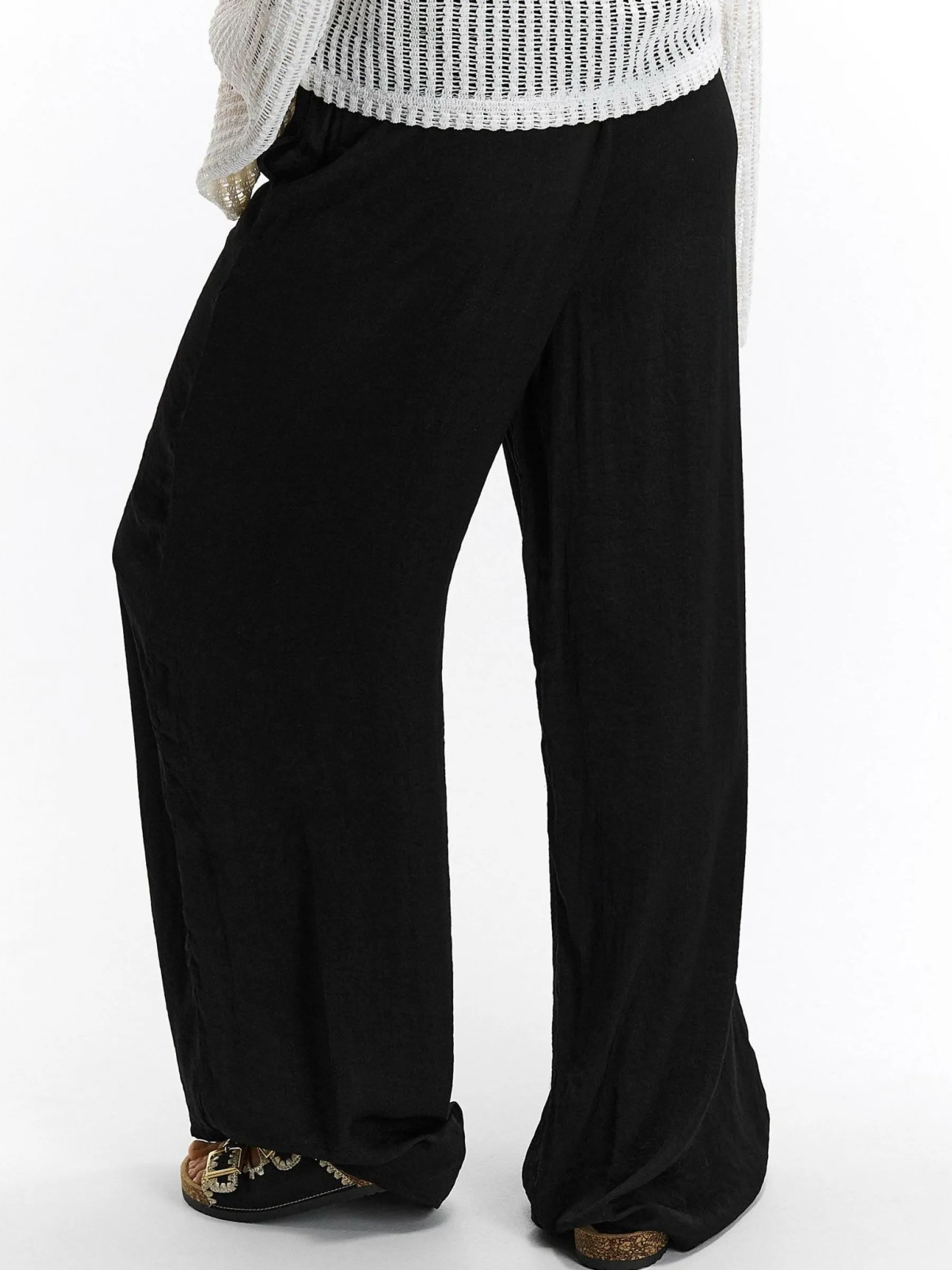 Kolor: czarnyKrój: szerokieTyp: spodnieDługość: dlugiePattern style: pojedynczy kolorDetal: z elastyczną opaskąMat…