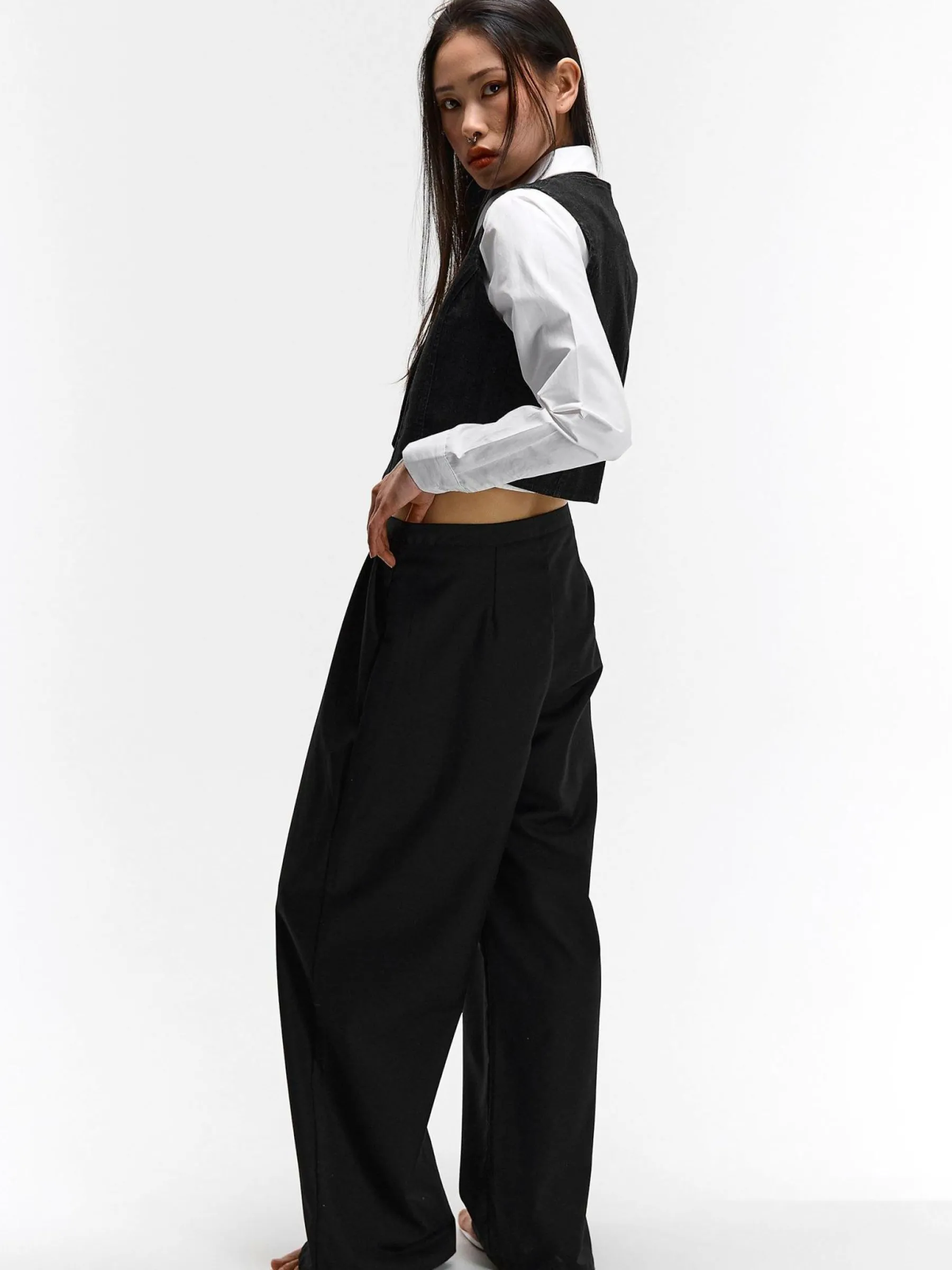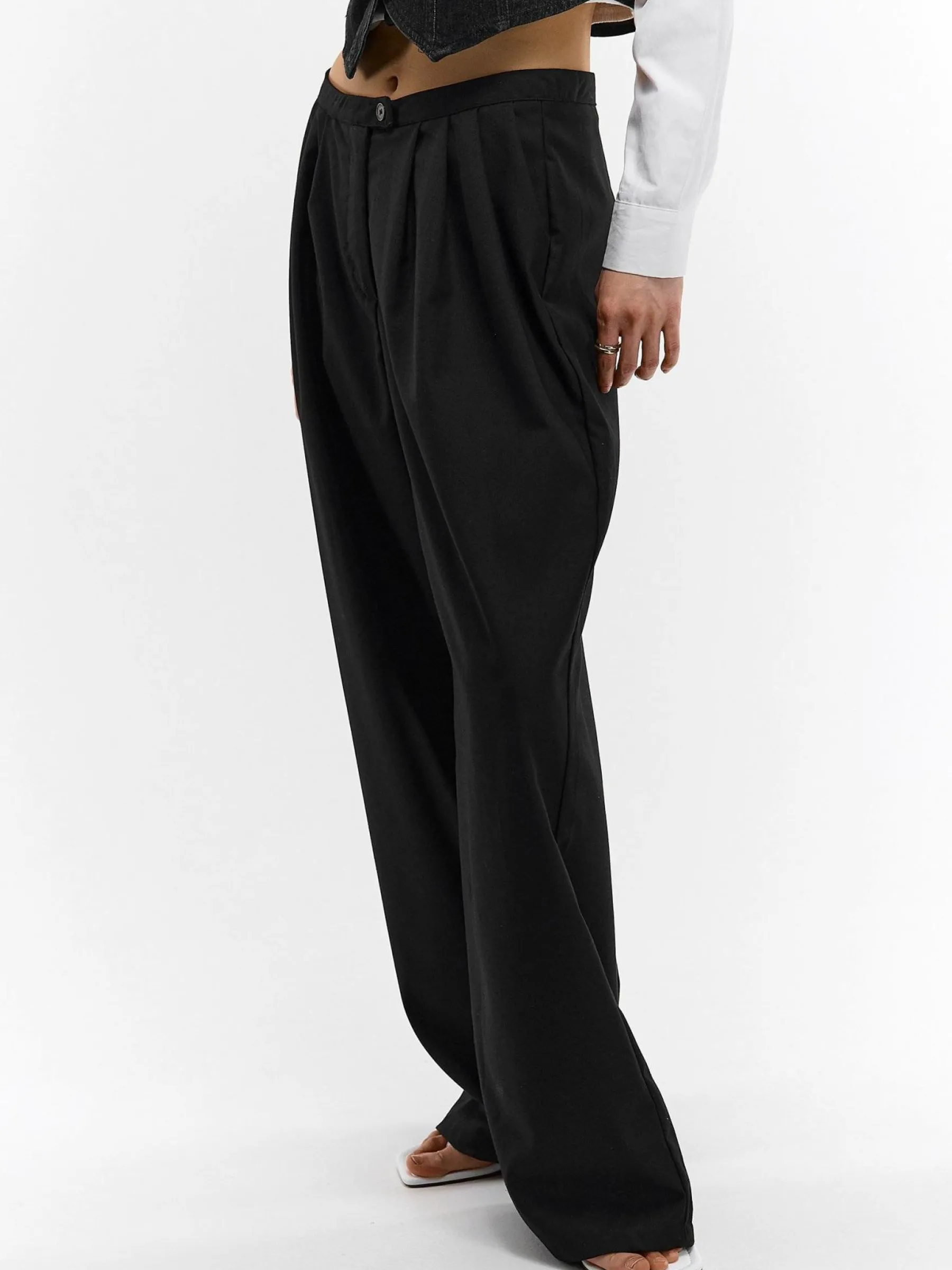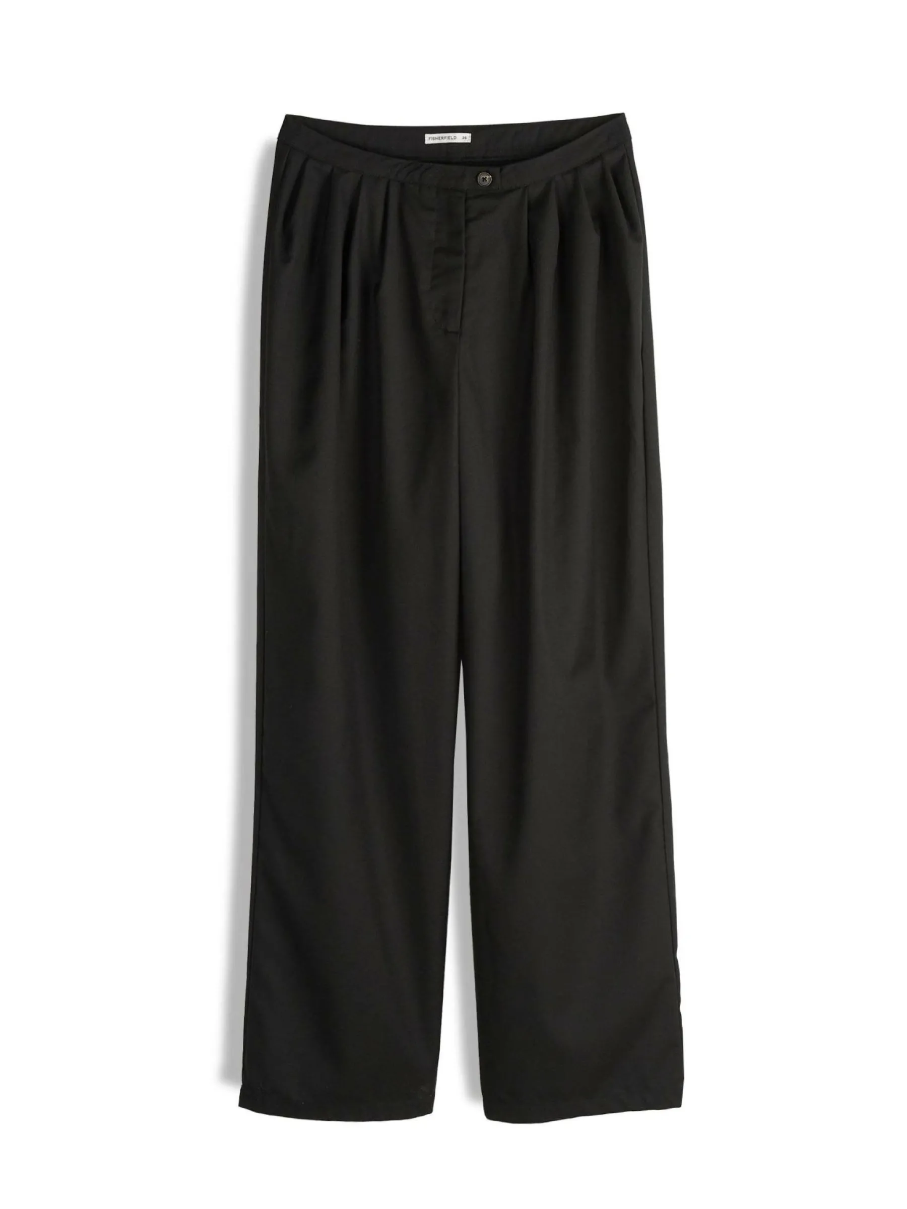 Kolor: czarnyKrój: szerokieTyp: spodnieDługość: dlugiePattern style: pojedynczy kolorDetal: na zamekMateriał: miesz…