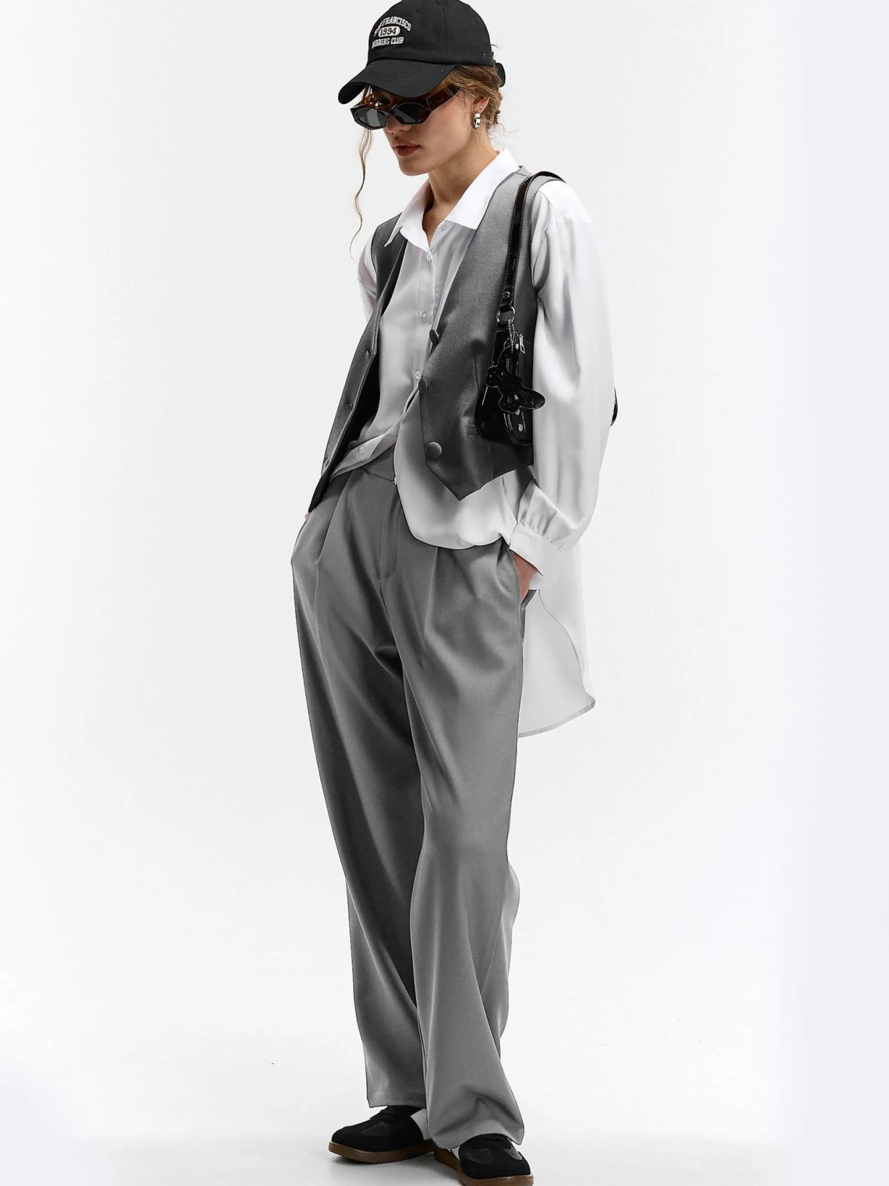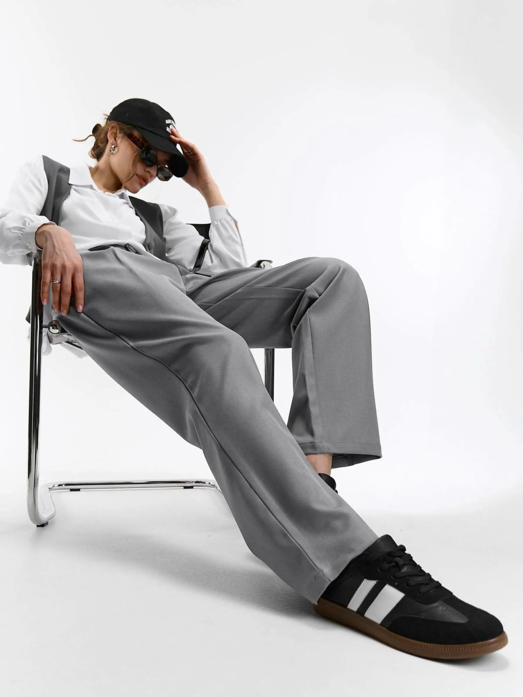 Kolor: szaryKrój: szerokieTyp: spodnieDługość: dlugiePattern style: pojedynczy kolorDetal: na zamekMateriał: syntet…