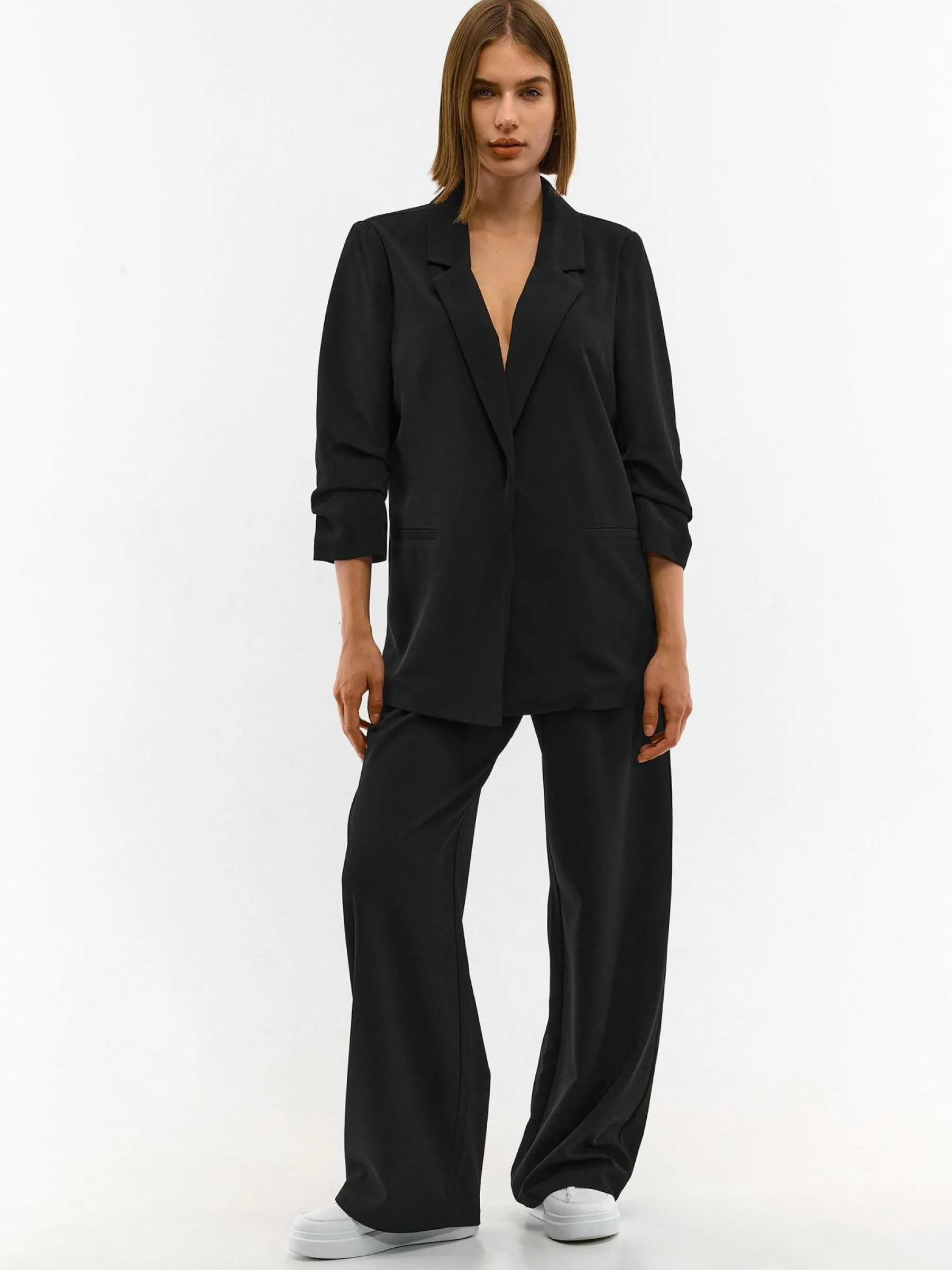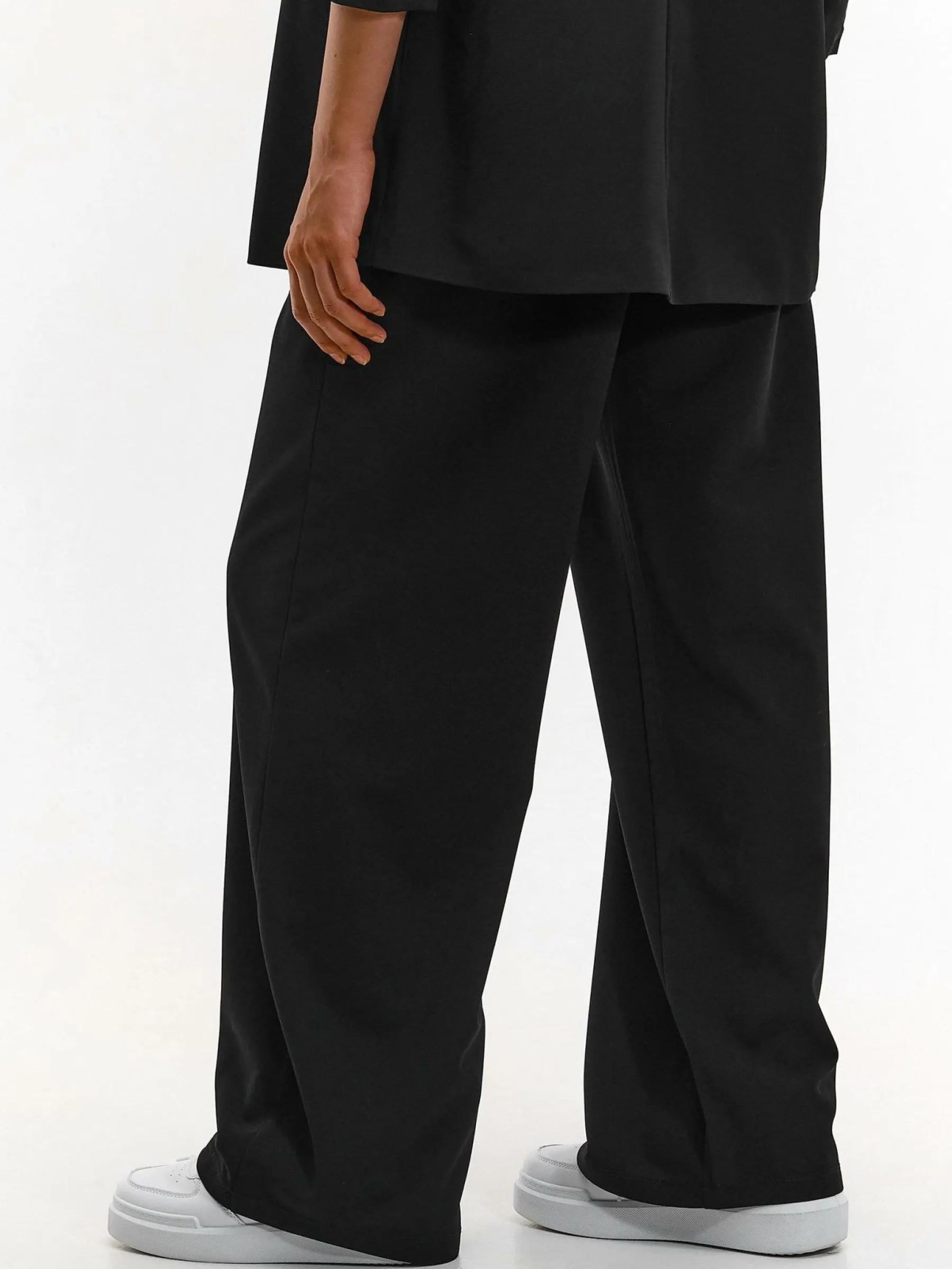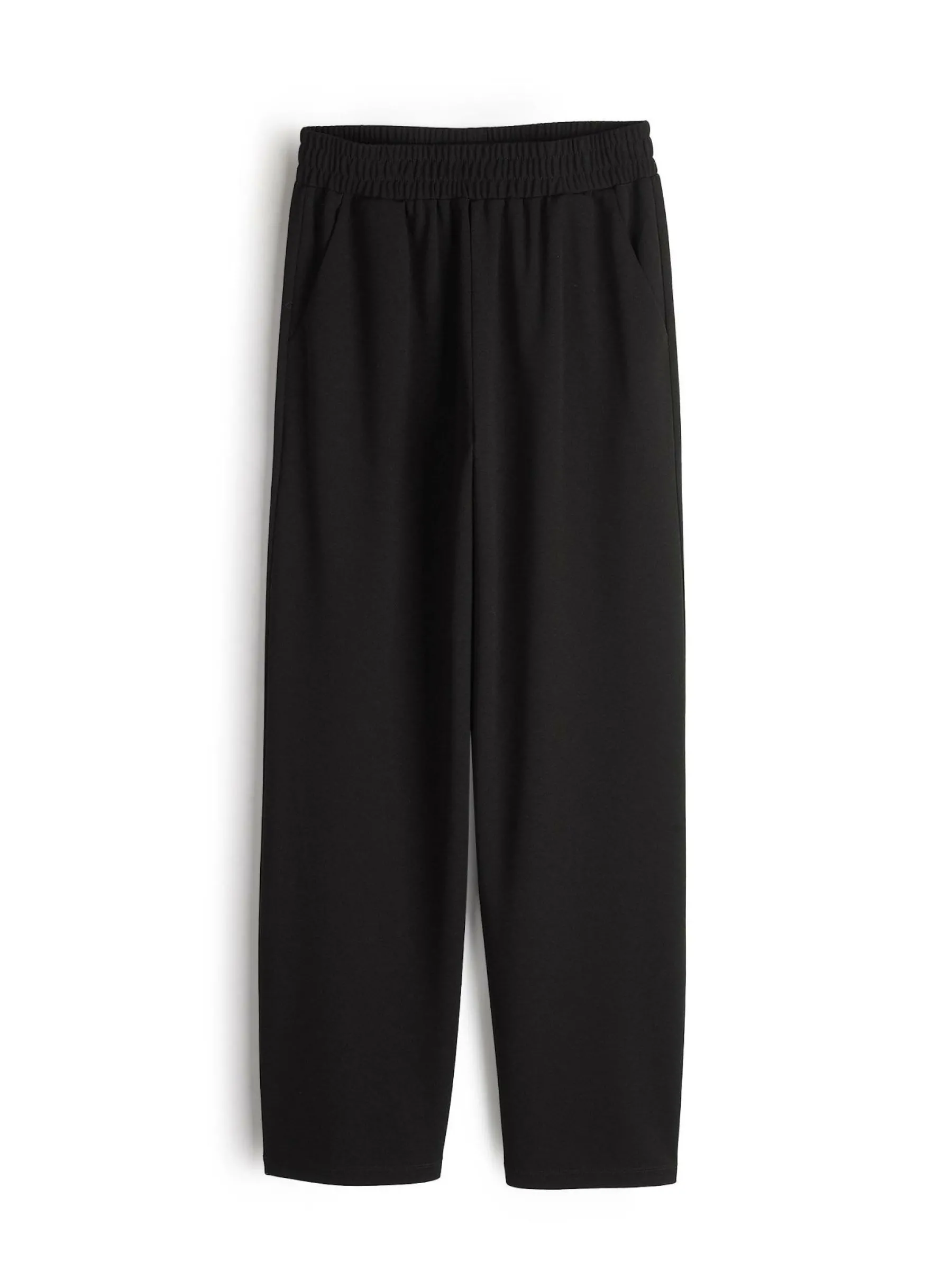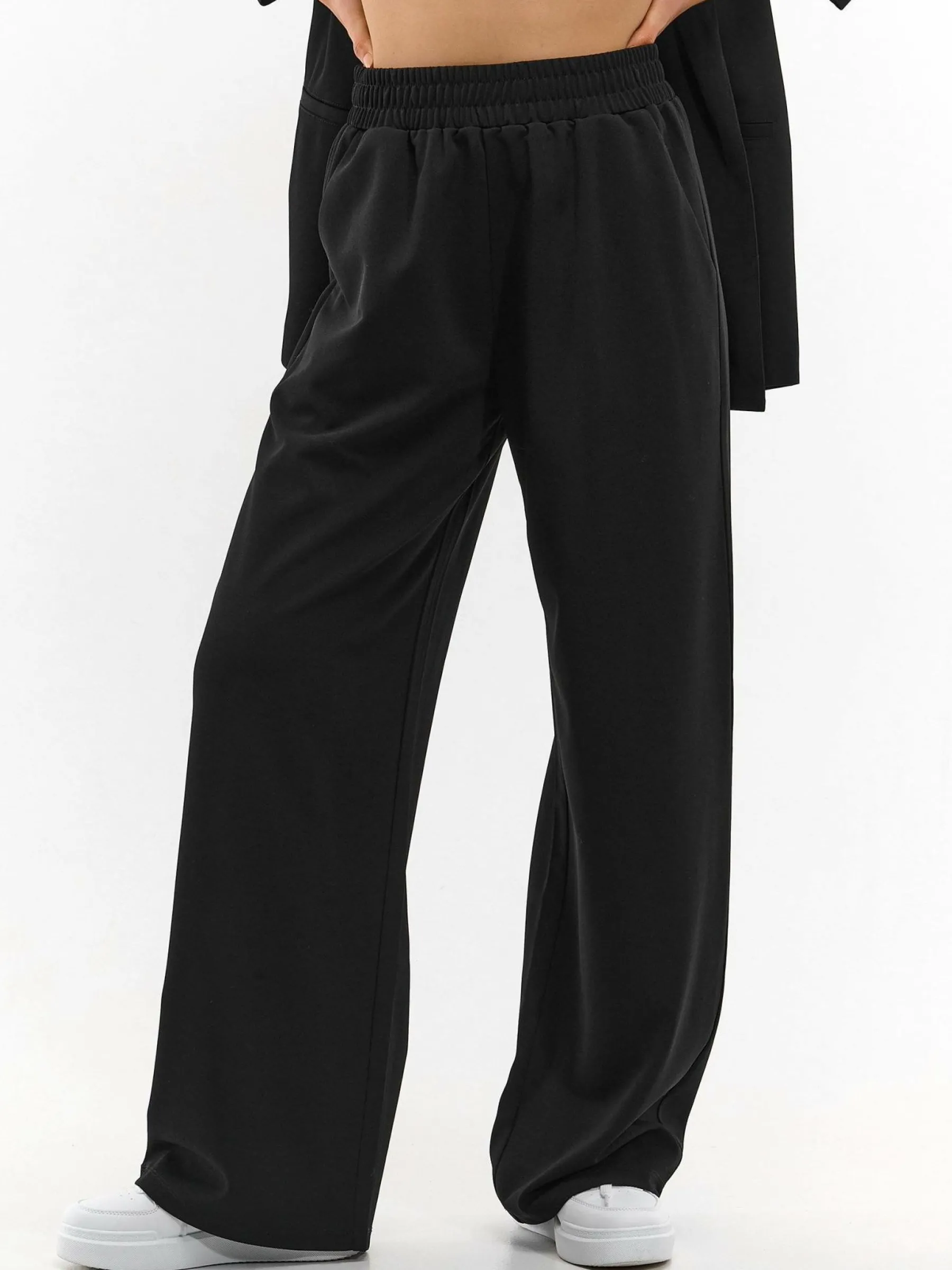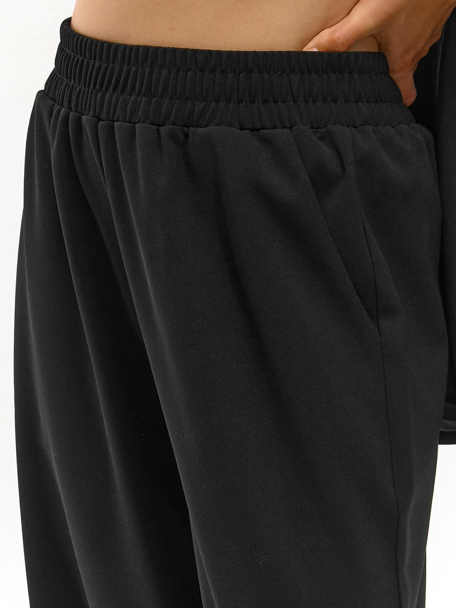 Kolor: czarnyKrój: szerokieTyp: spodnieDługość: dlugiePattern style: pojedynczy kolorDetal: z kieszeniami, z elastyc…
