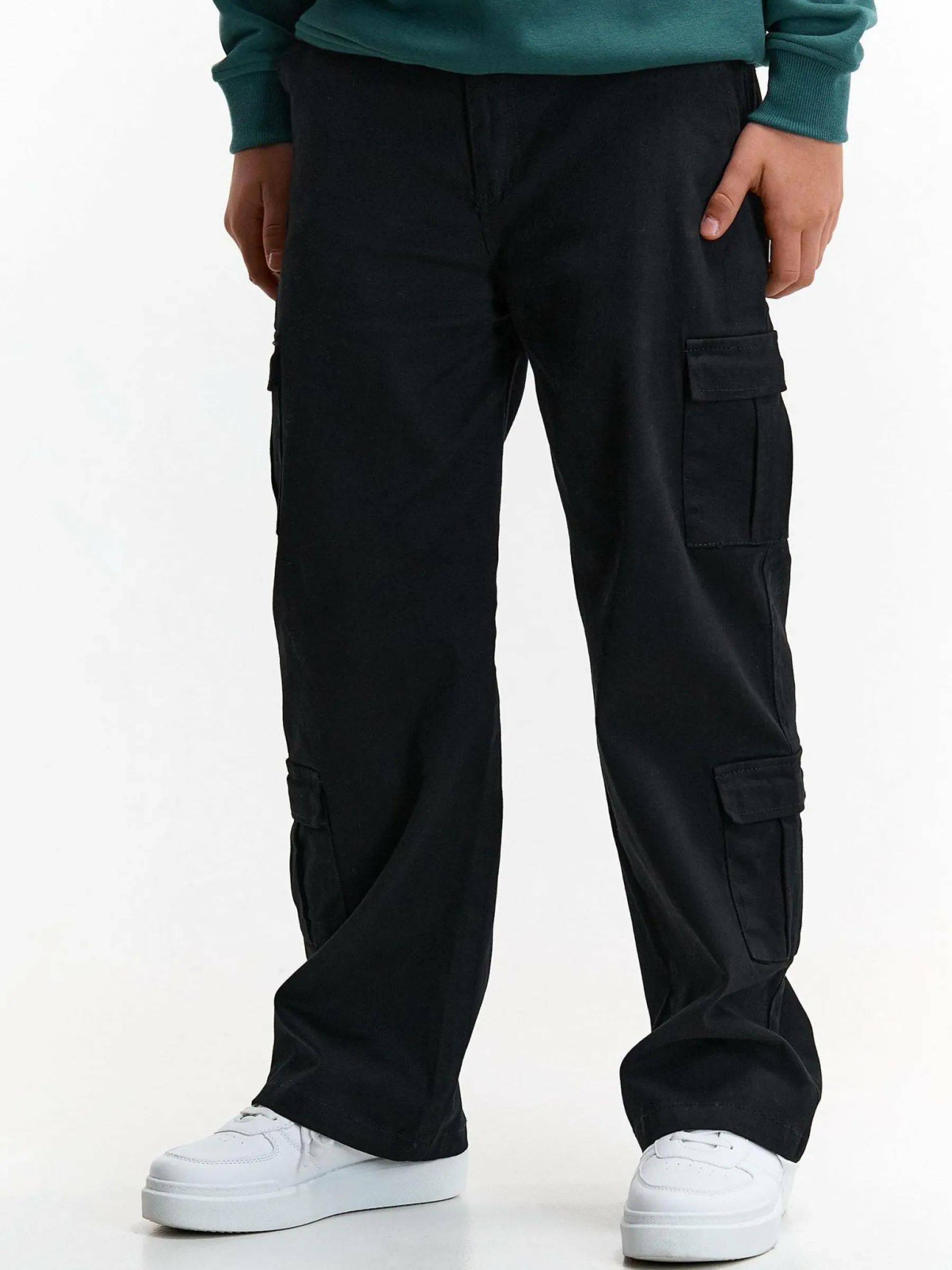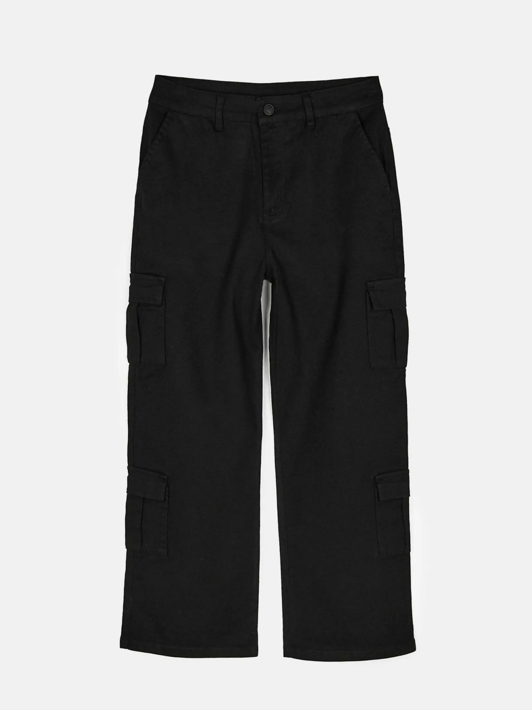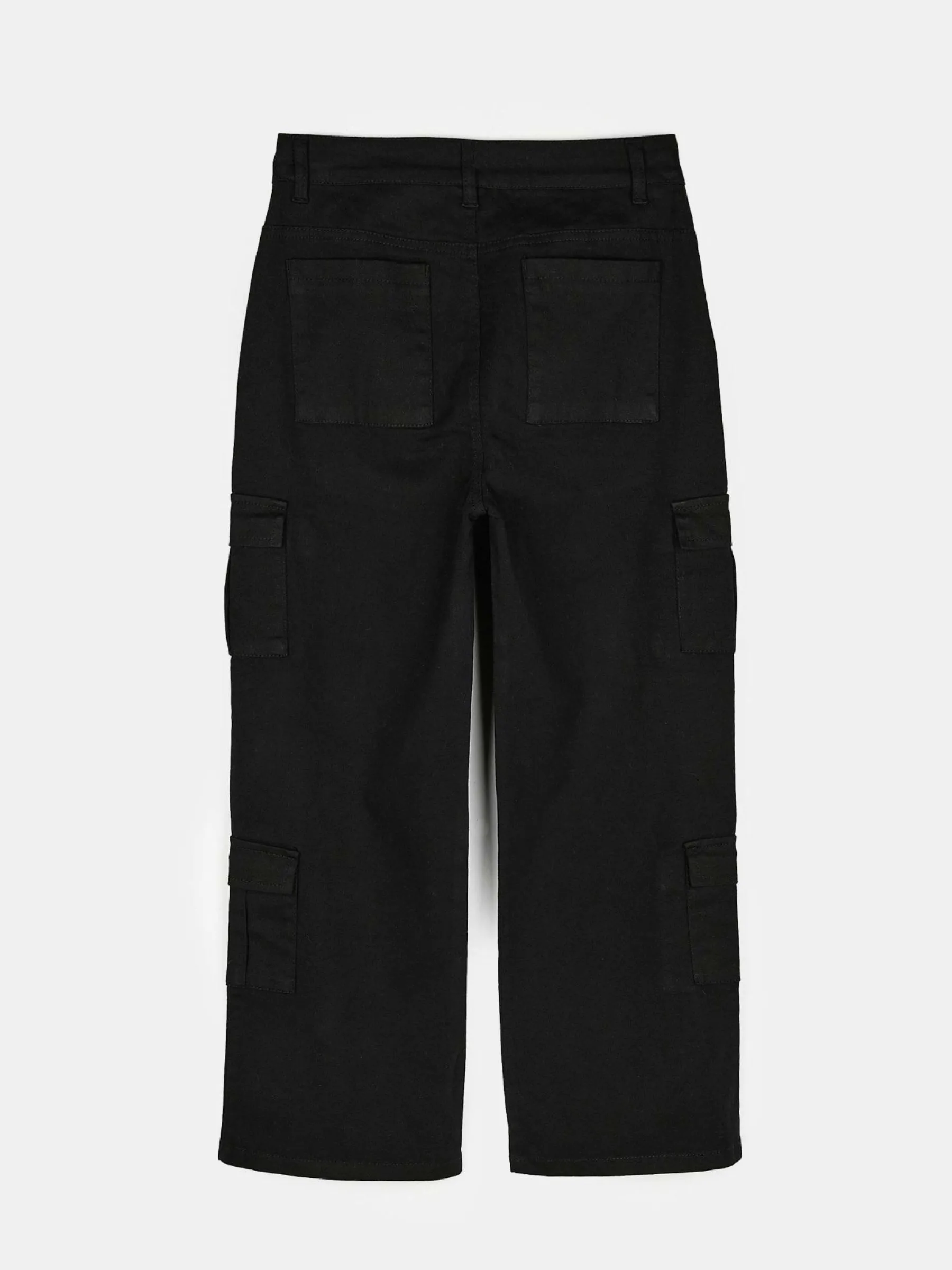 Kolor: czarnyKrój: szerokieTyp: spodnieDługość: dlugiePattern style: pojedynczy kolorDetal: na zamek, z kieszeniamiM…