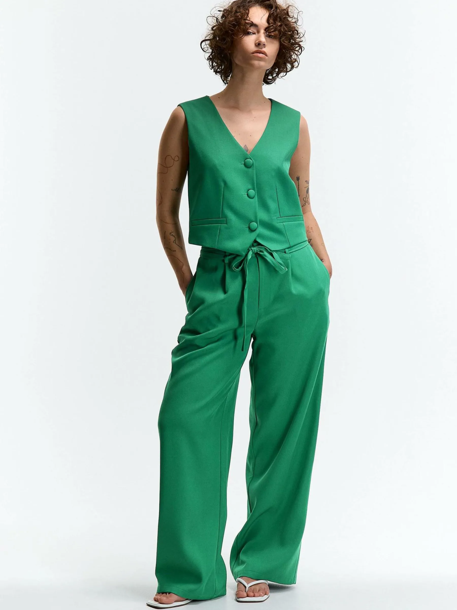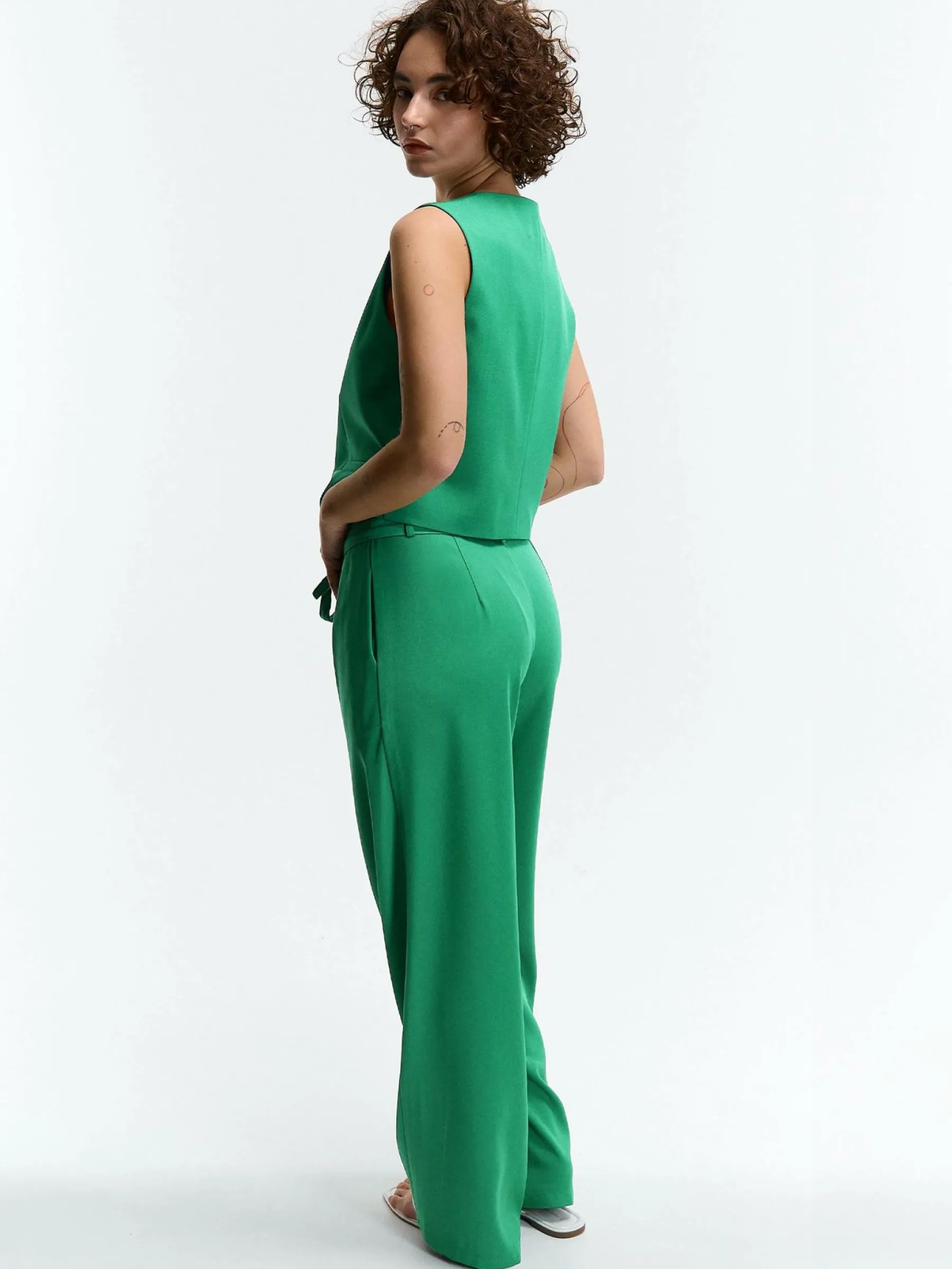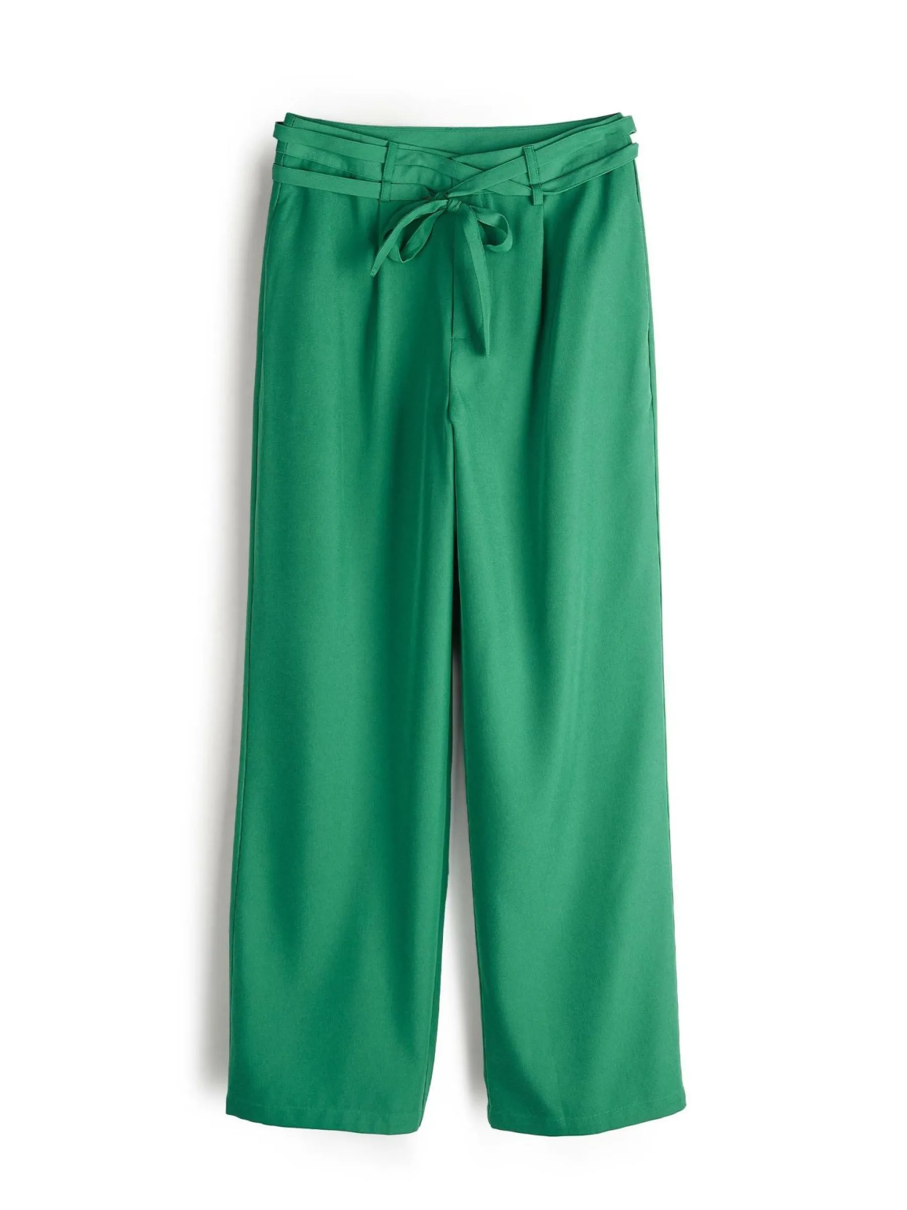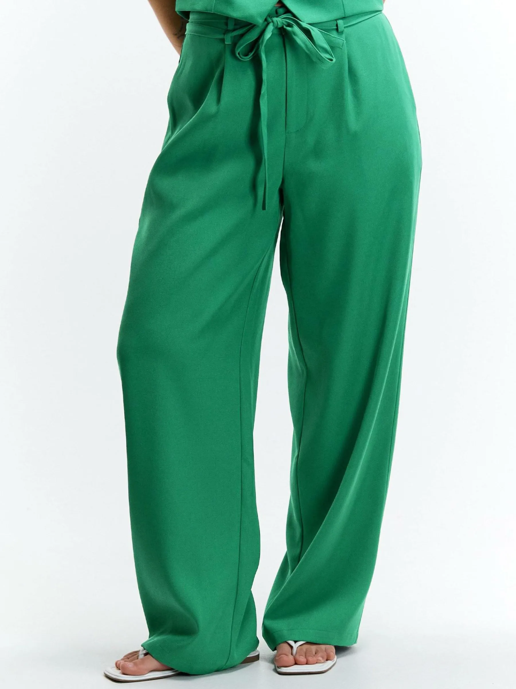 Kolor: zielonyKrój: z wysokim stanem, szerokieTyp: spodnieDługość: dlugiePattern style: pojedynczy kolorDetal: z pas…