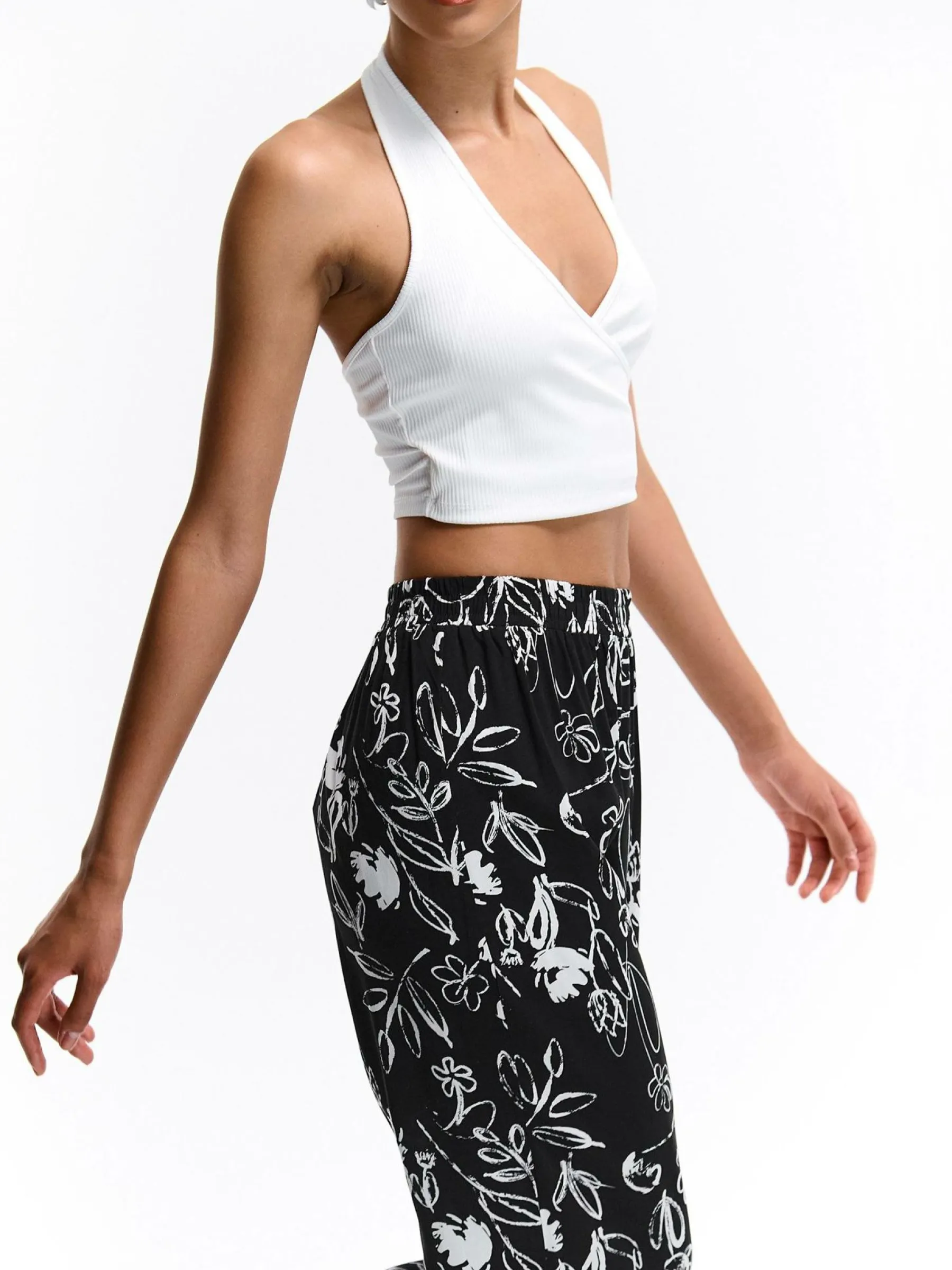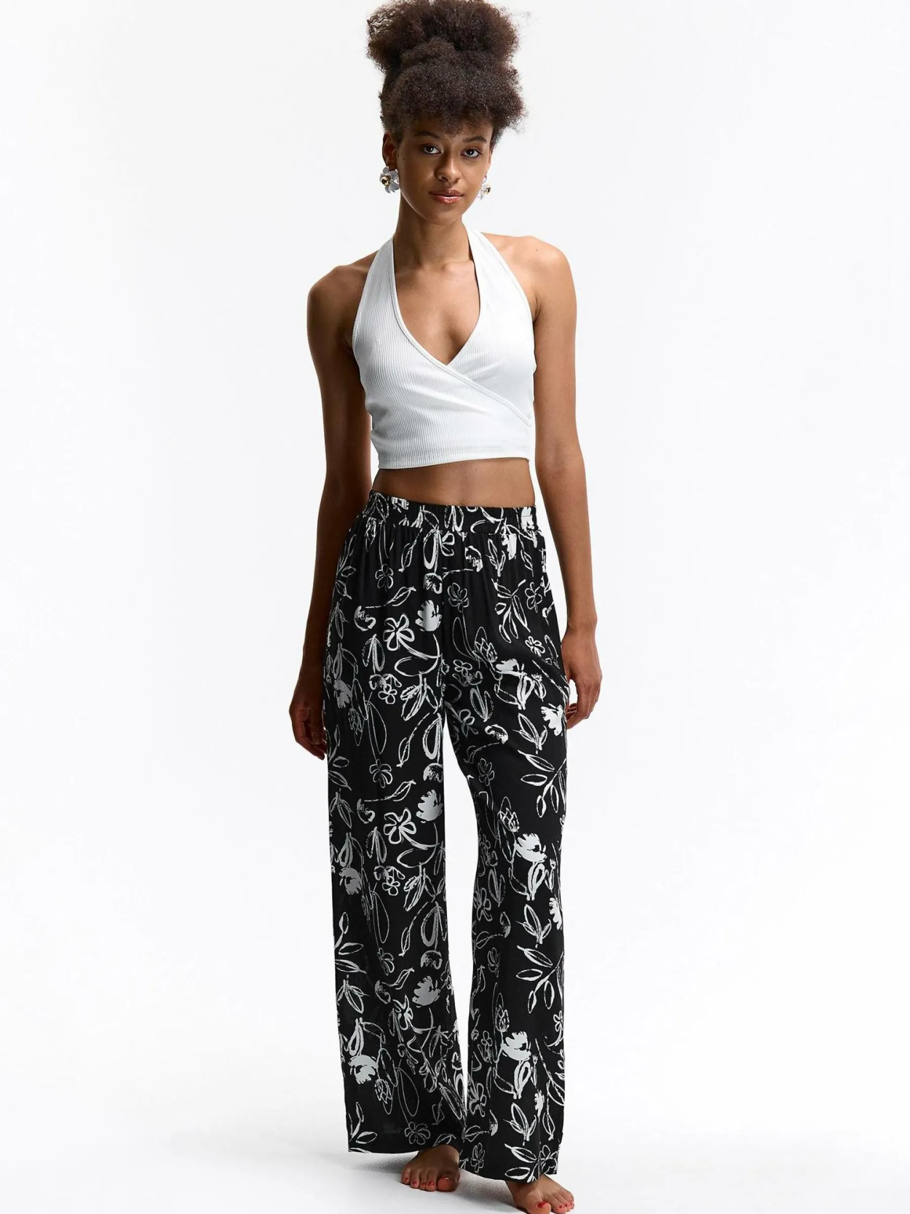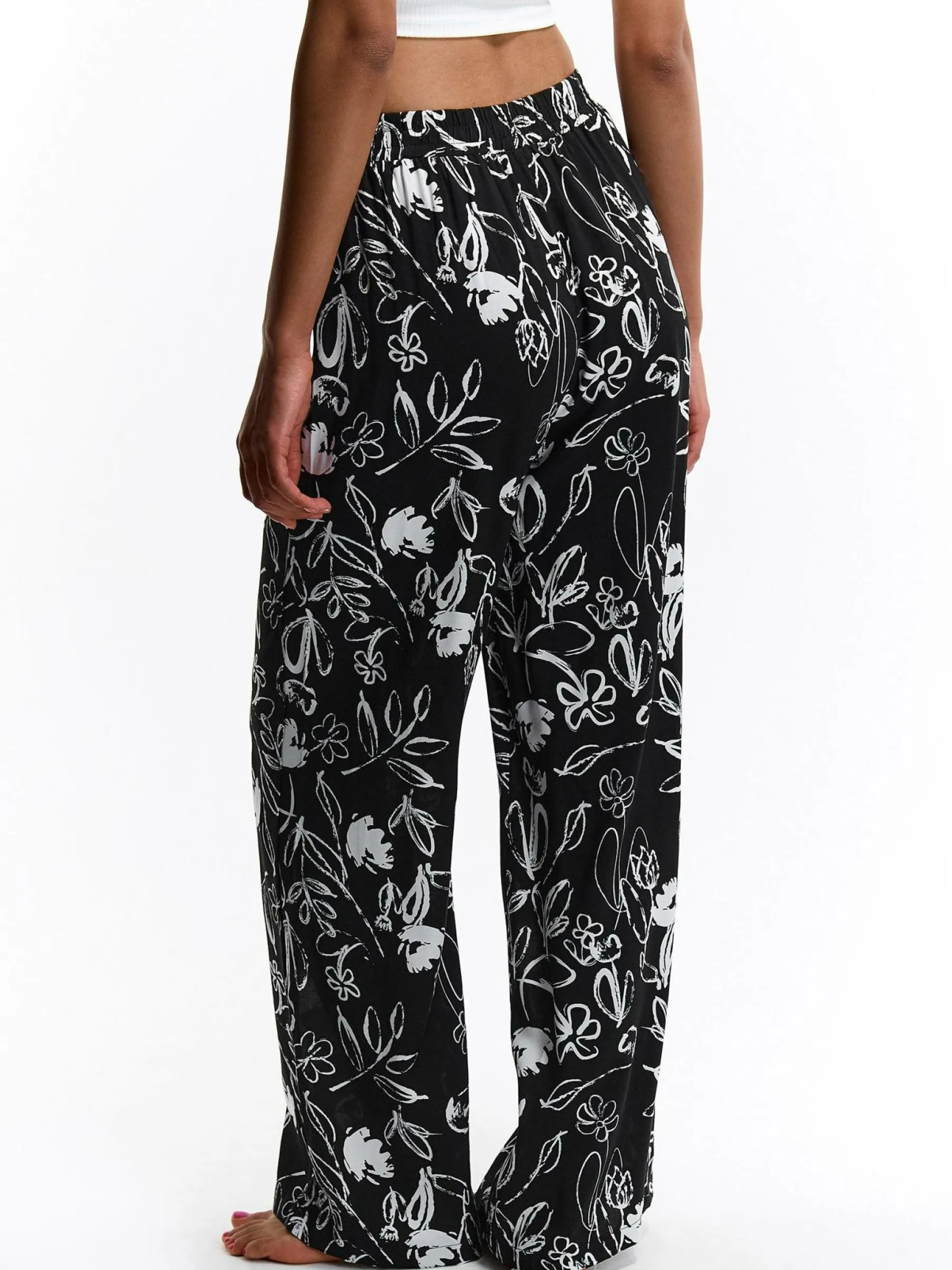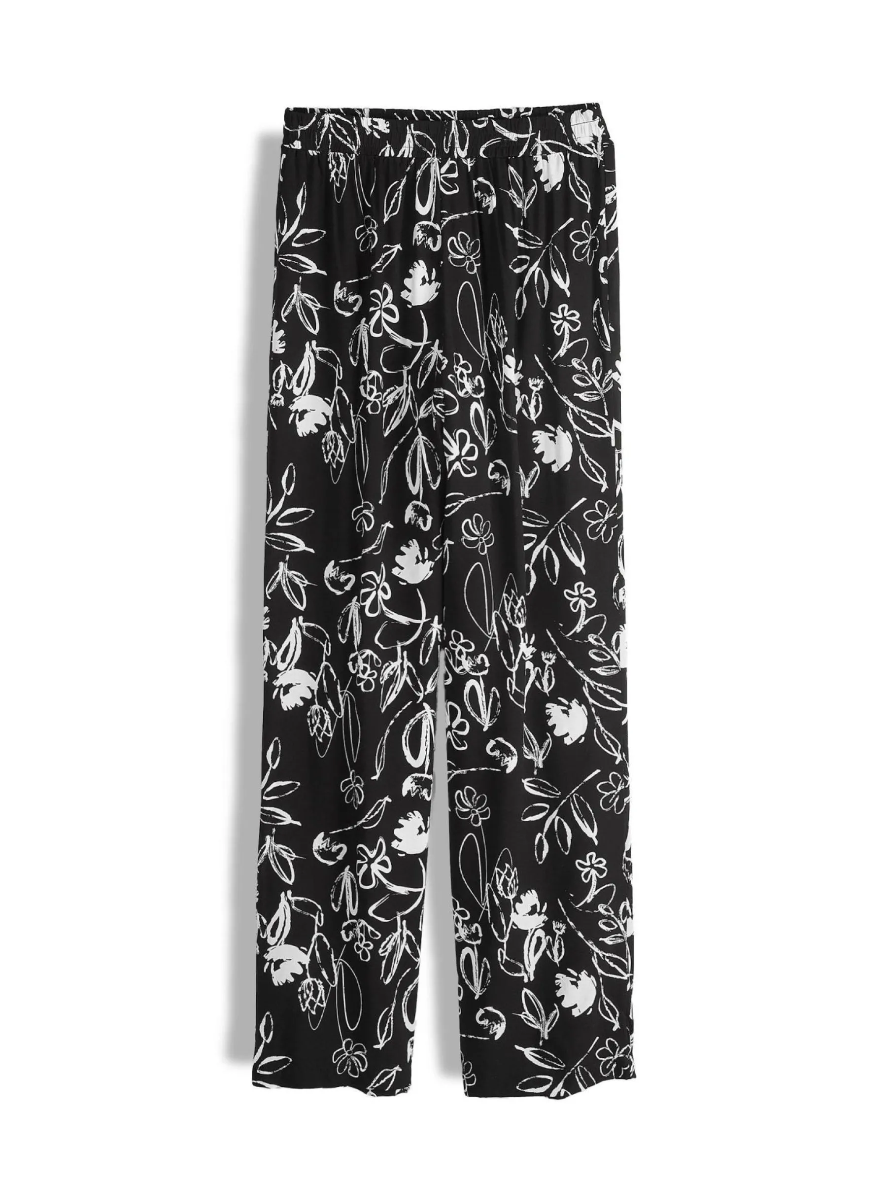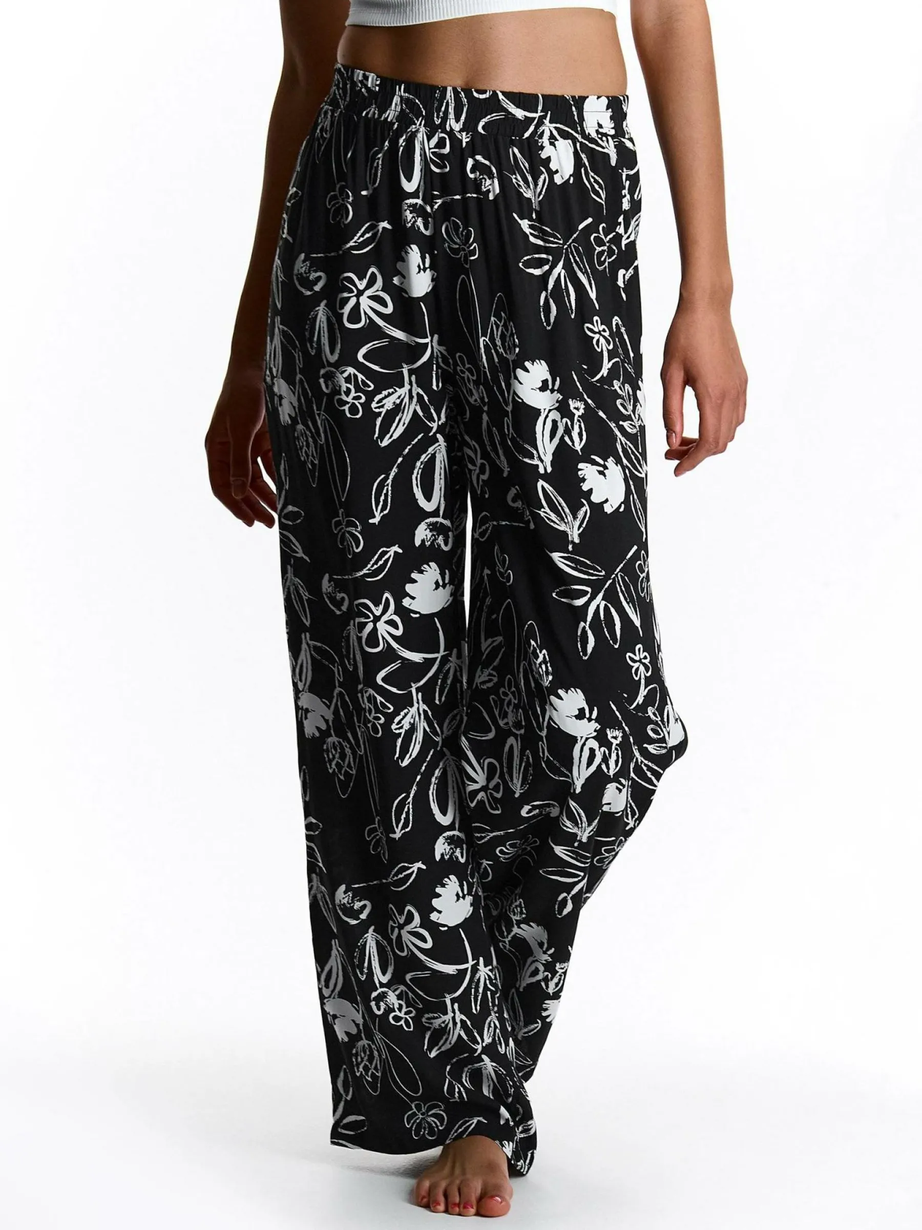 Kolor: czarnyKrój: szerokieTyp: spodnieDługość: dlugiePattern style: kwiatoweDetal: z elastyczną opaskąMateriał: …