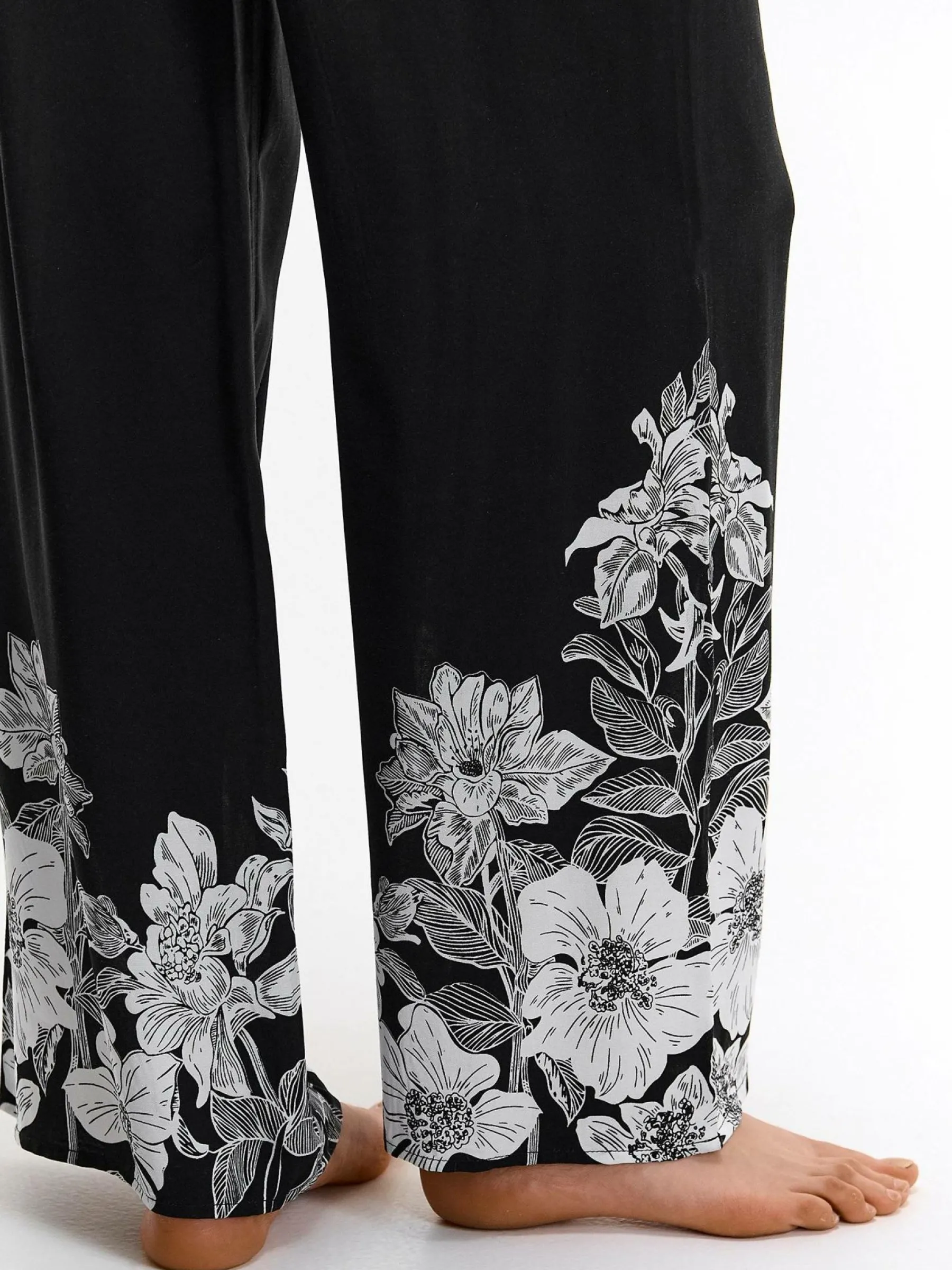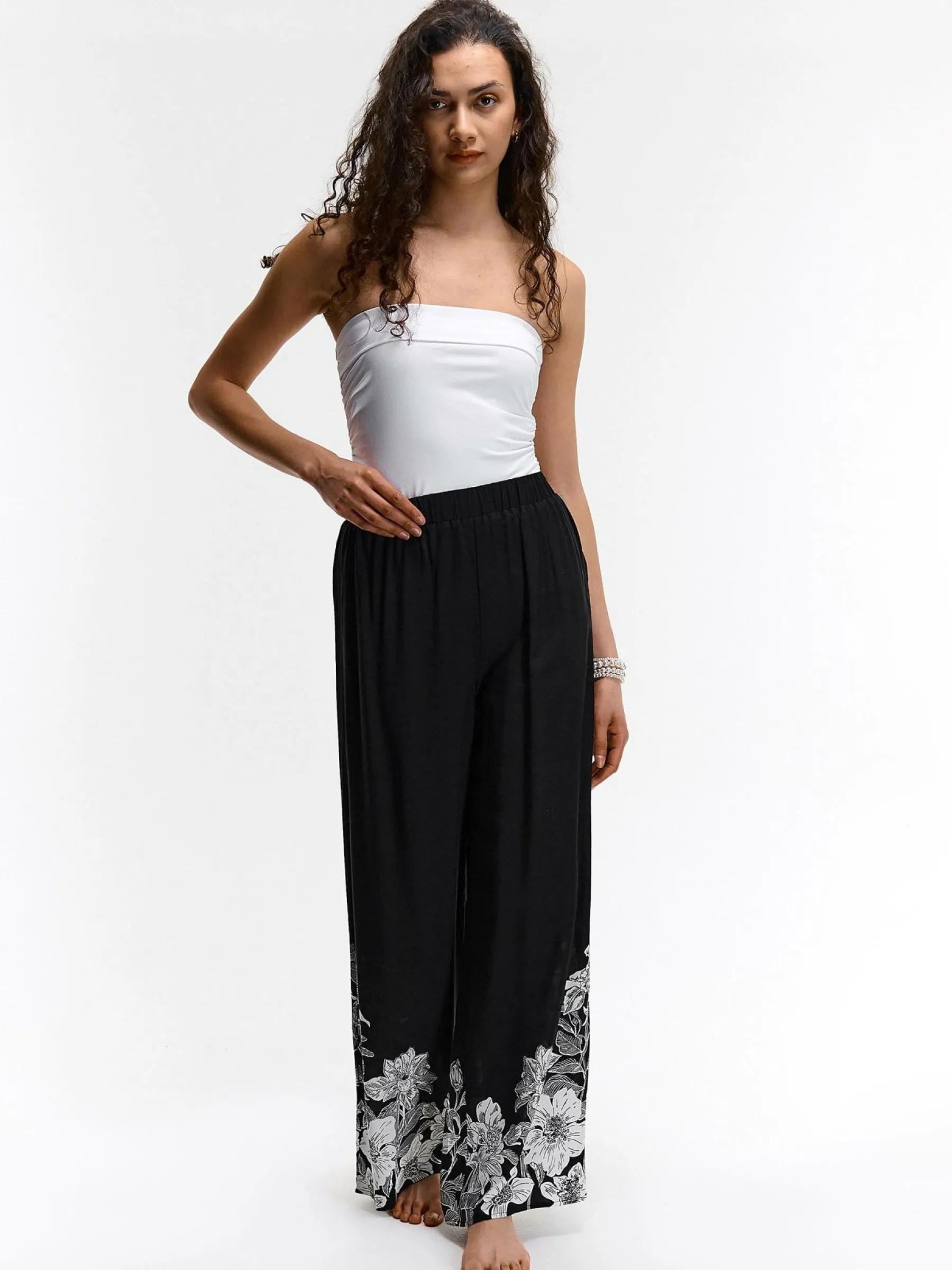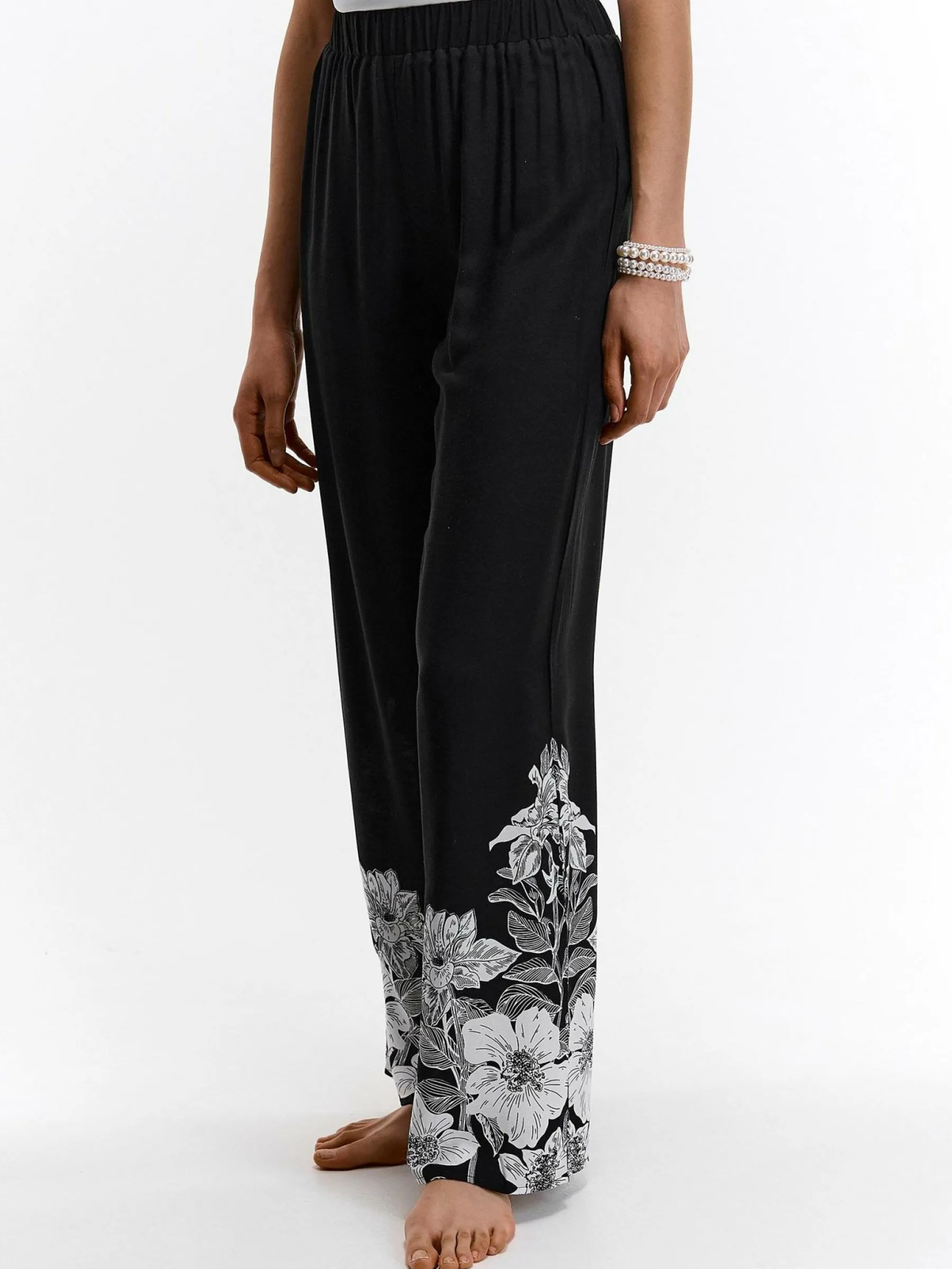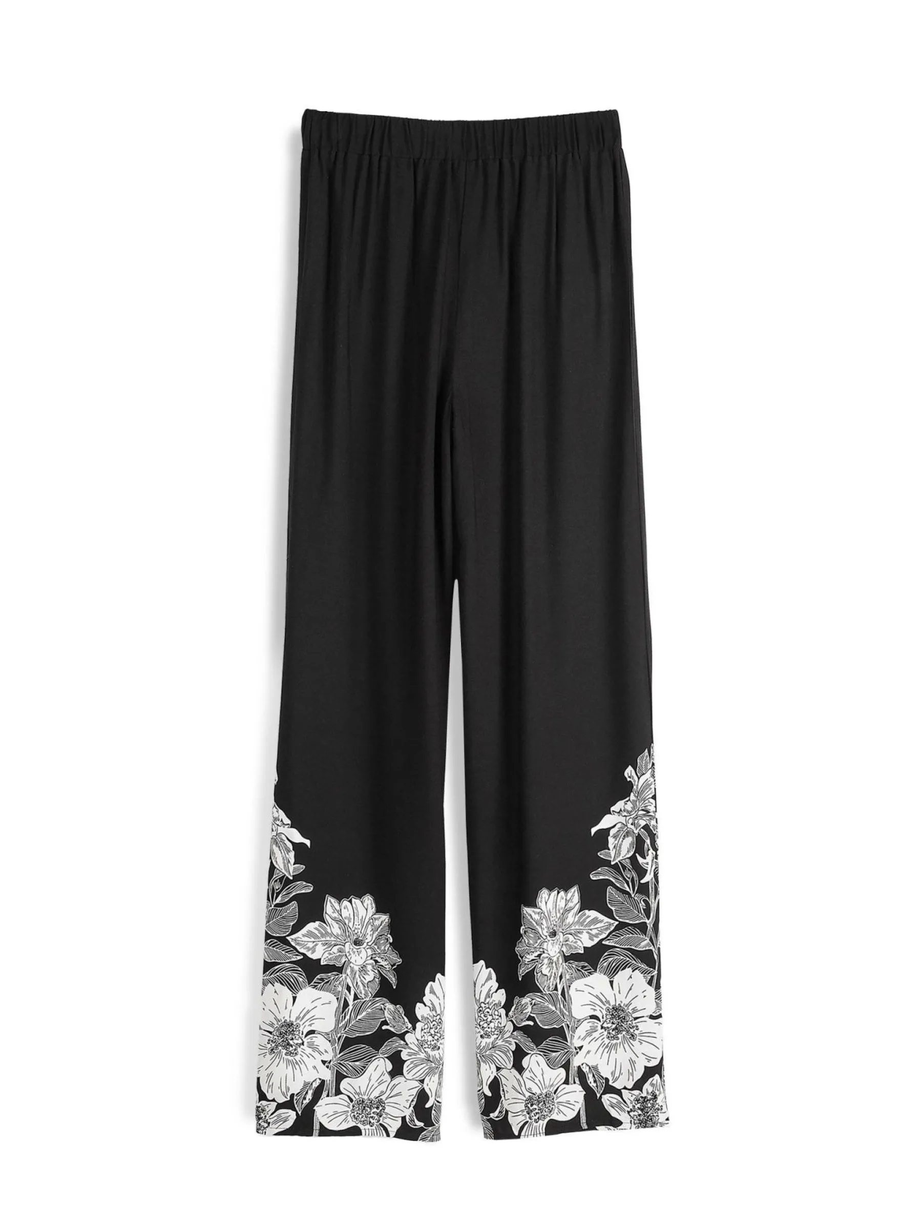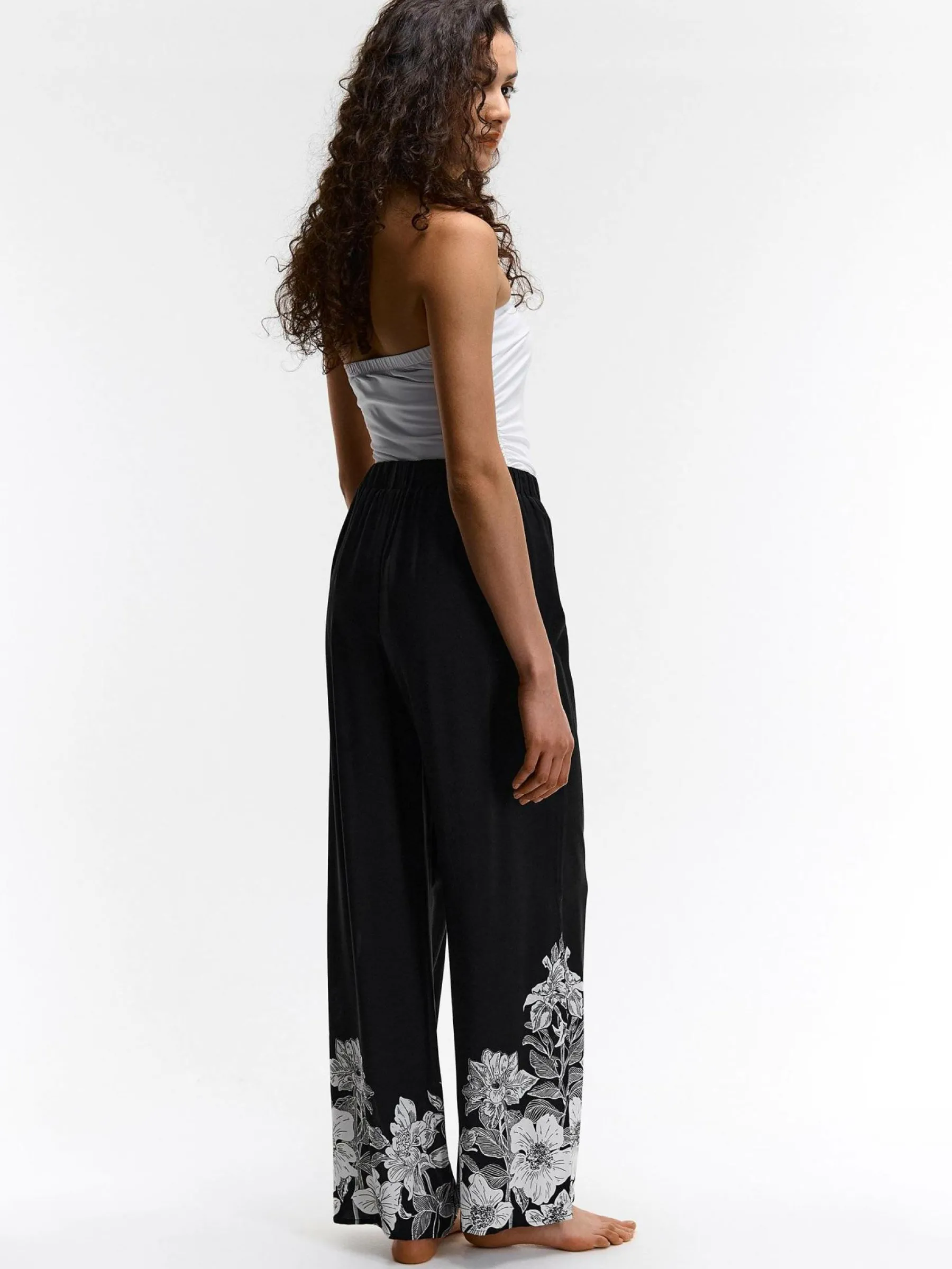 Kolor: czarnyKrój: szerokieTyp: spodnieDługość: dlugiePattern style: kwiatoweDetal: z elastyczną opaskąMateriał: …
