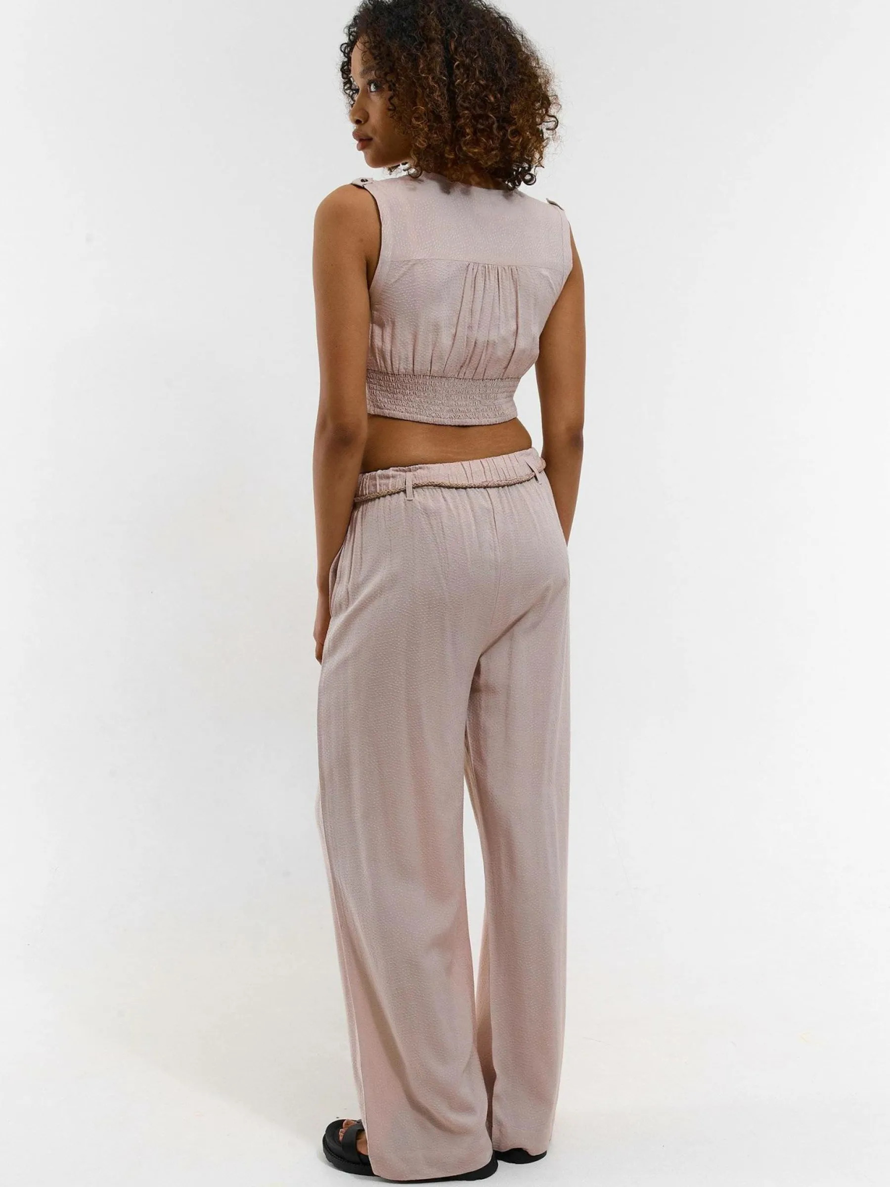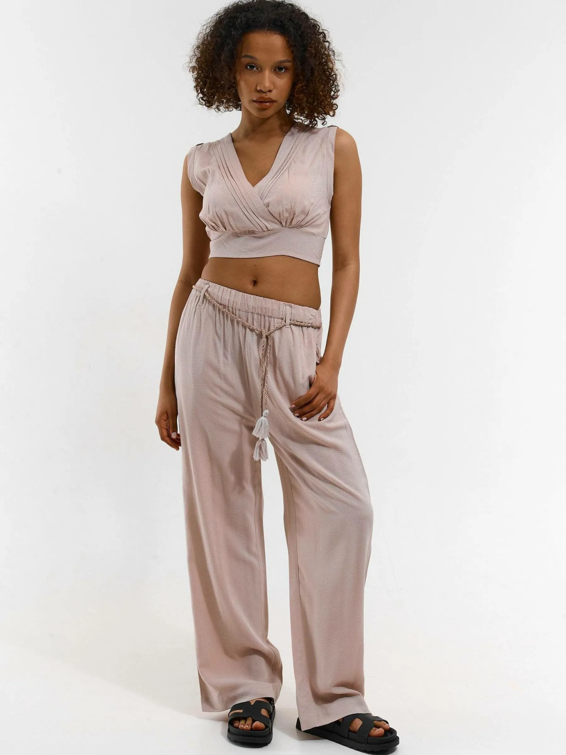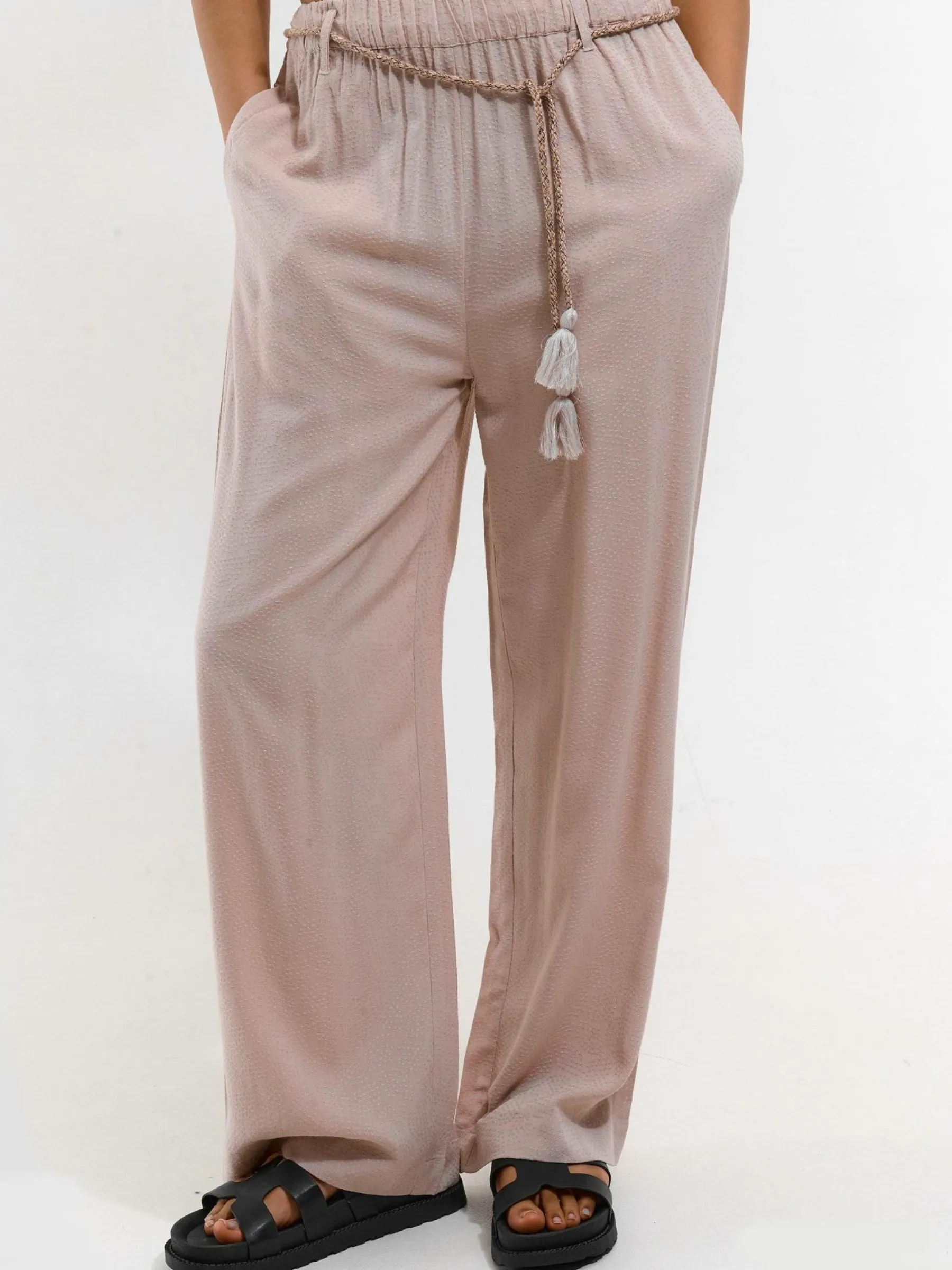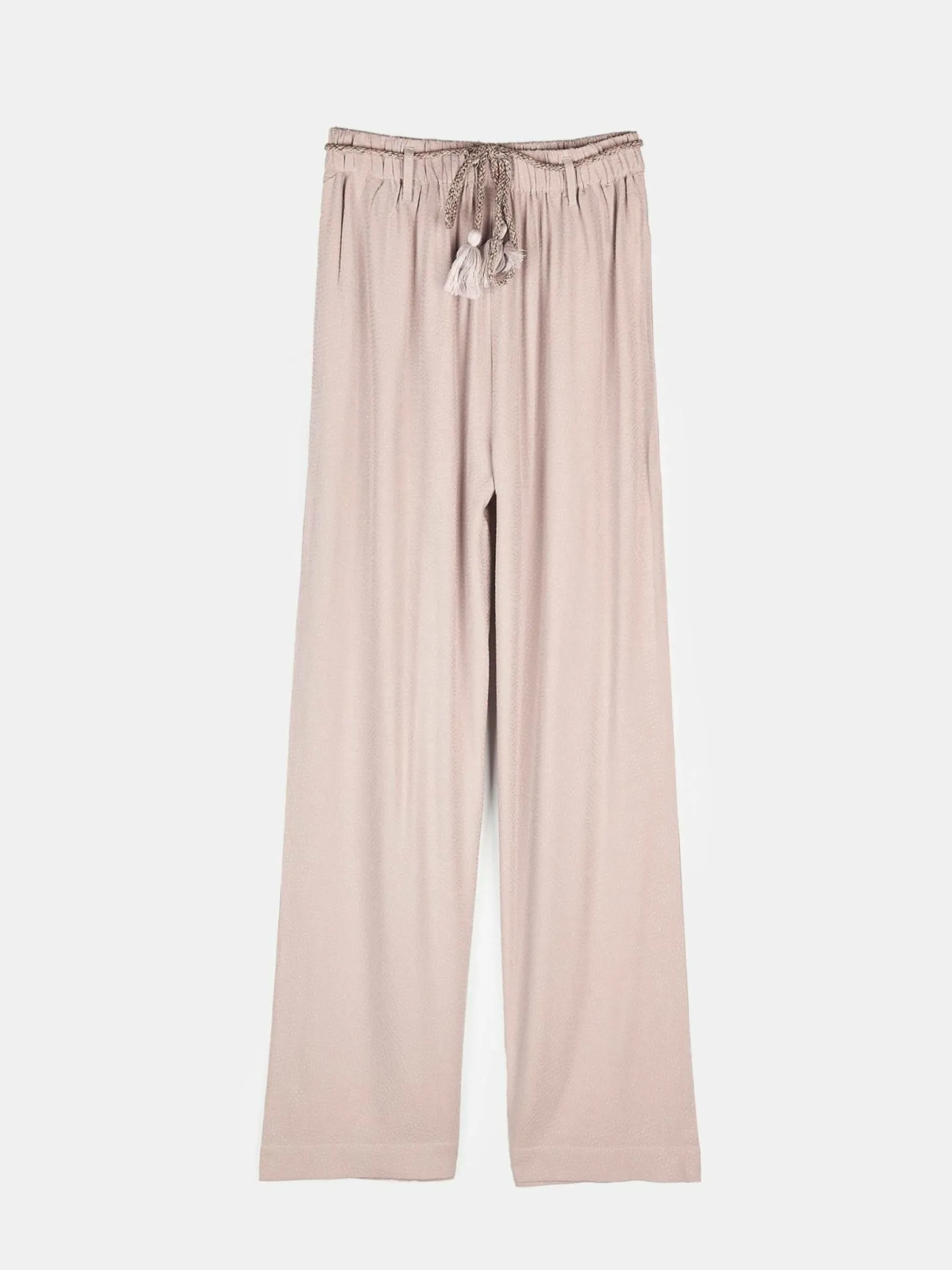 Kolor: beżowyKrój: szerokieTyp: spodnieDługość: dlugiePattern style: pojedynczy kolorDetal: z paskiemMateriał: wis…