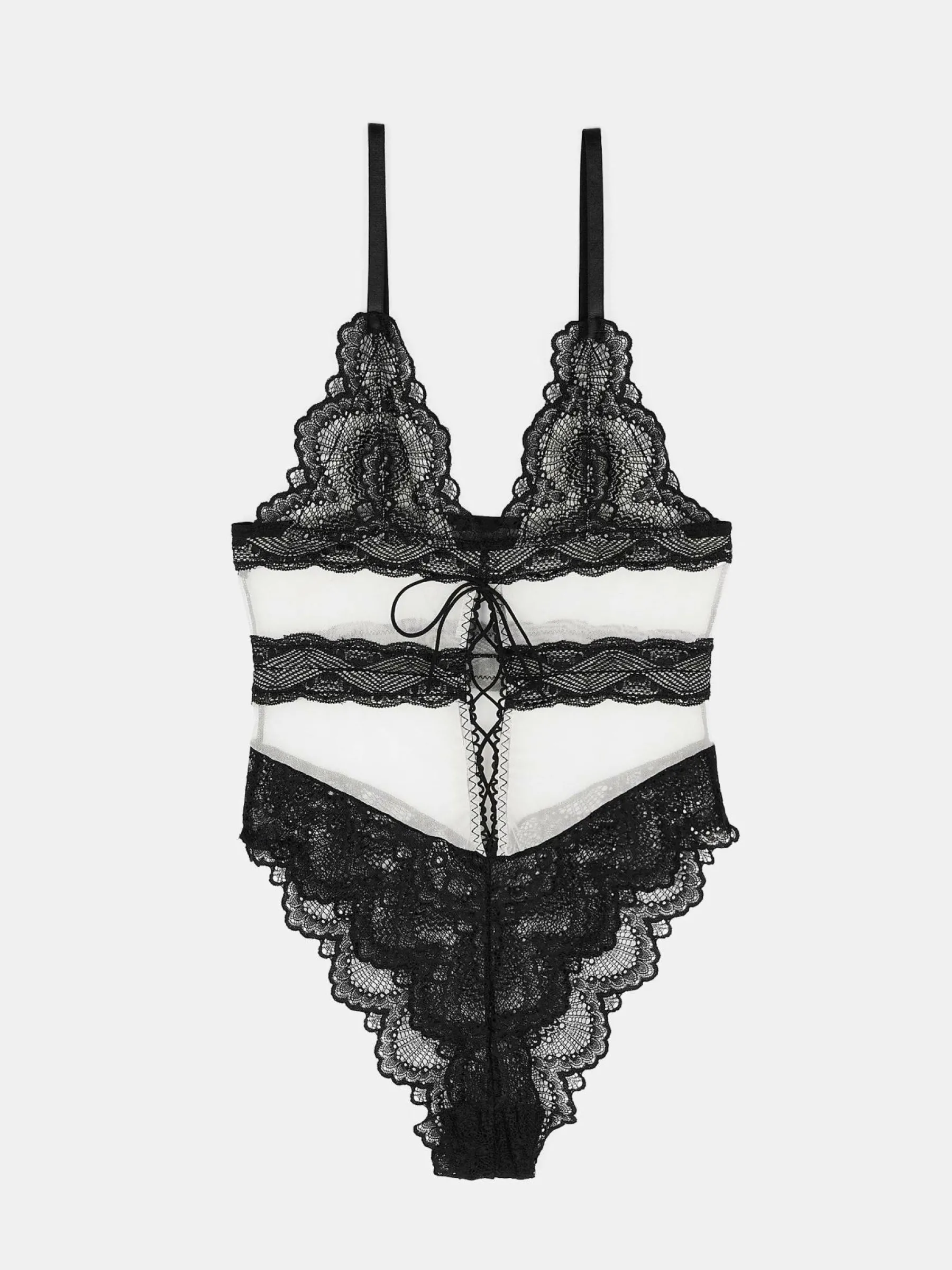 Kolor: czarnyKrój: slimTyp: bodyPattern style: pojedynczy kolorDetal: nieusztywniane, ze sznurowaniemMateriał: koronko…