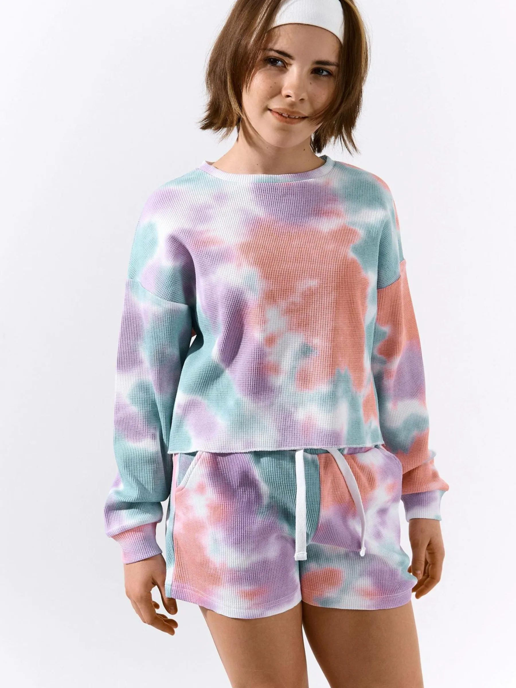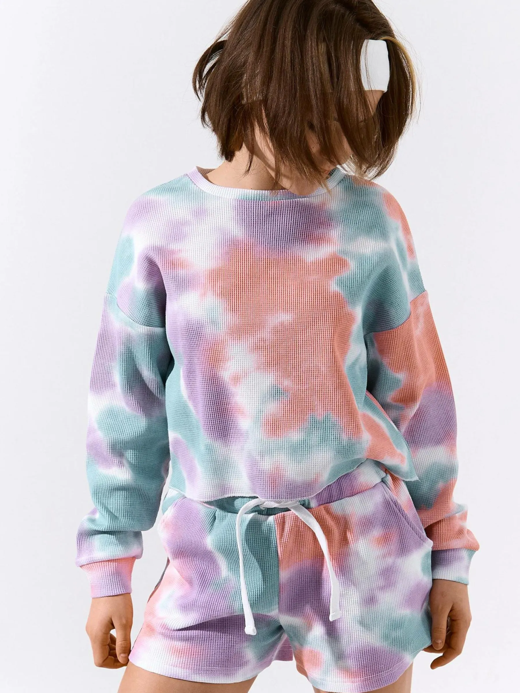 Kolor: białyKrój: straightTyp: spodenkiDługość: krótkiPattern style: tie dyeDetal: z elastyczną opaskąMateriał:…