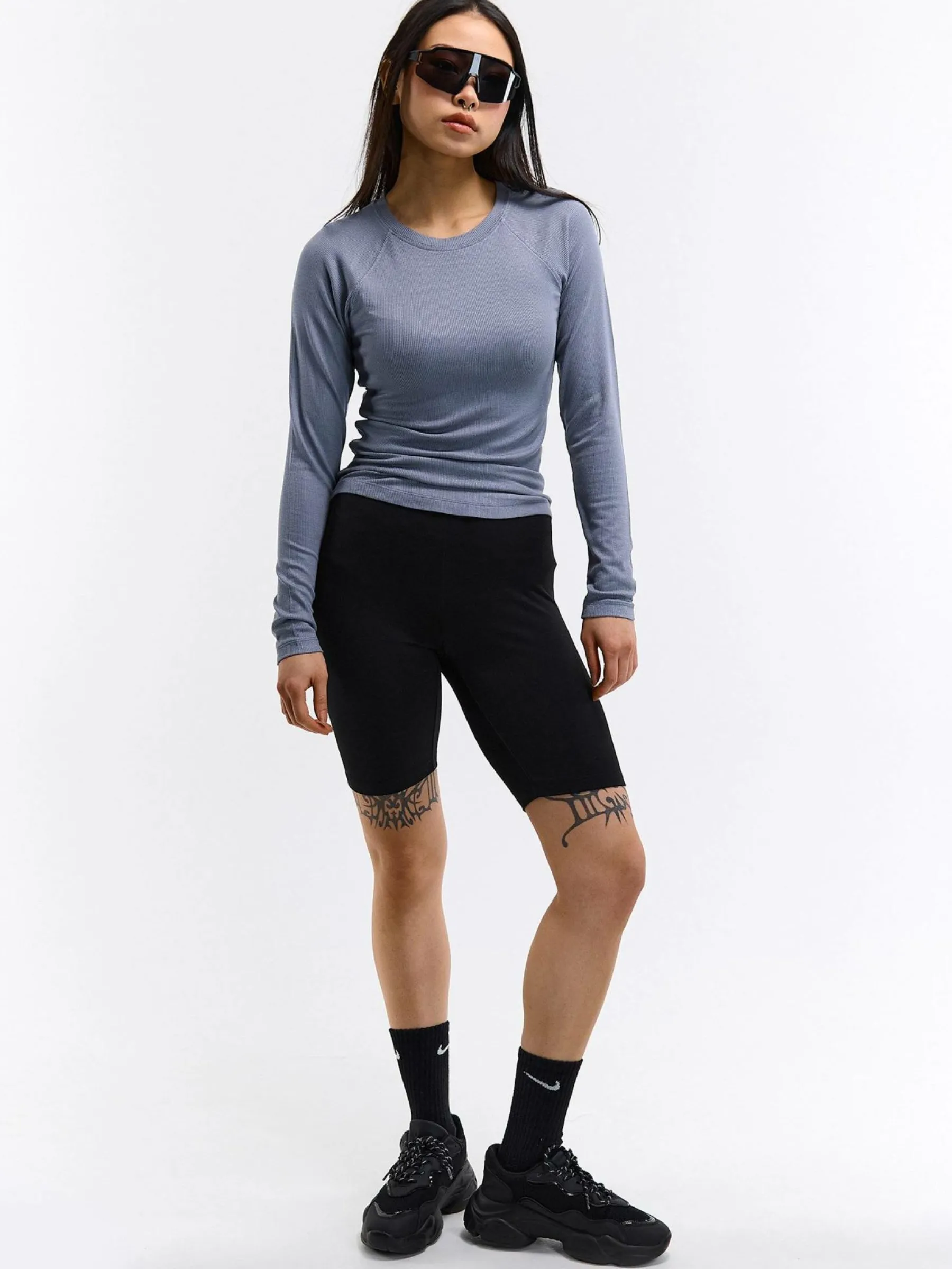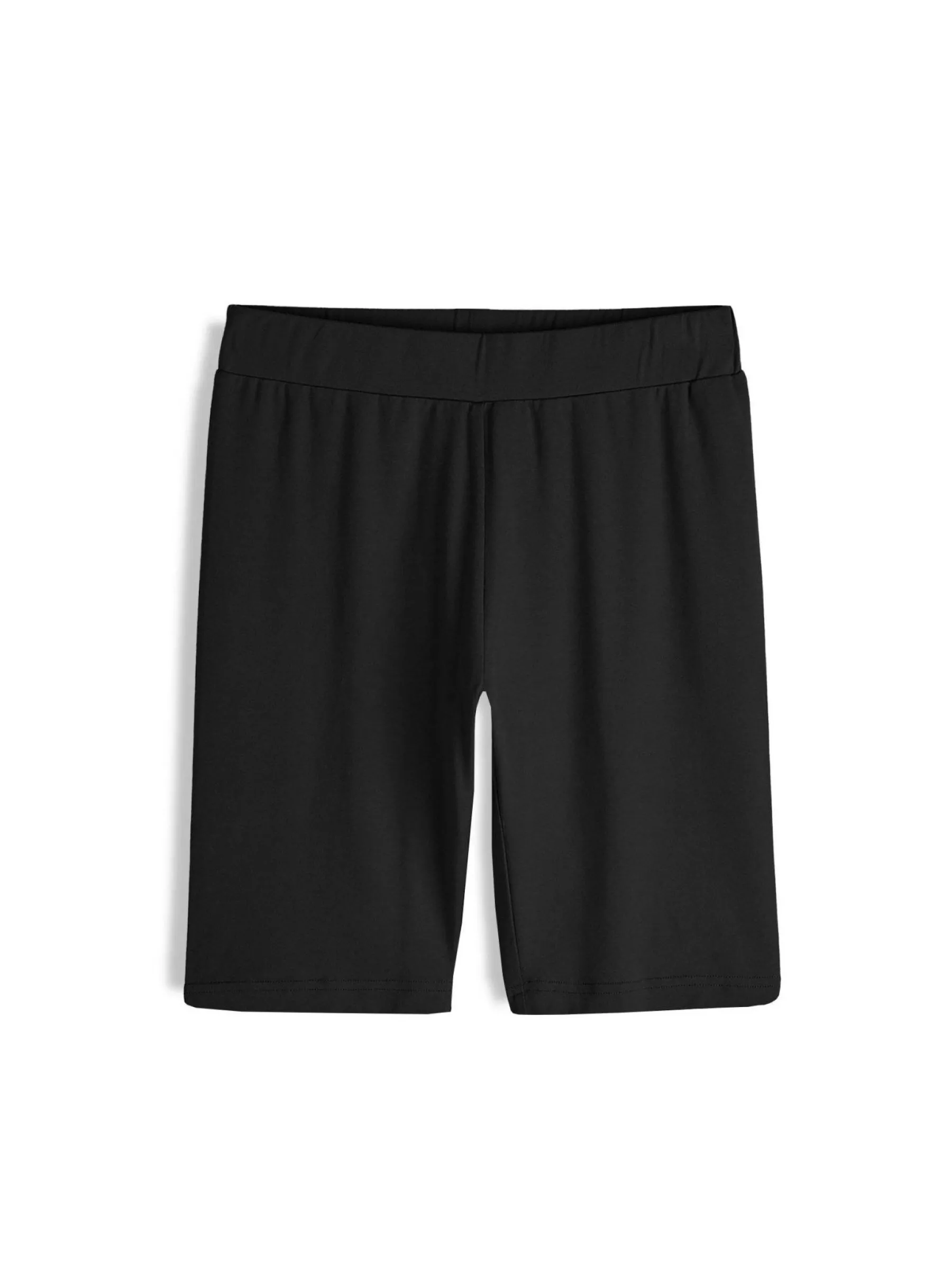 Kolor: czarnyKrój: bikerTyp: spodenkiDługość: krótkiPattern style: pojedynczy kolorDetal: z elastyczną opaskąMate…