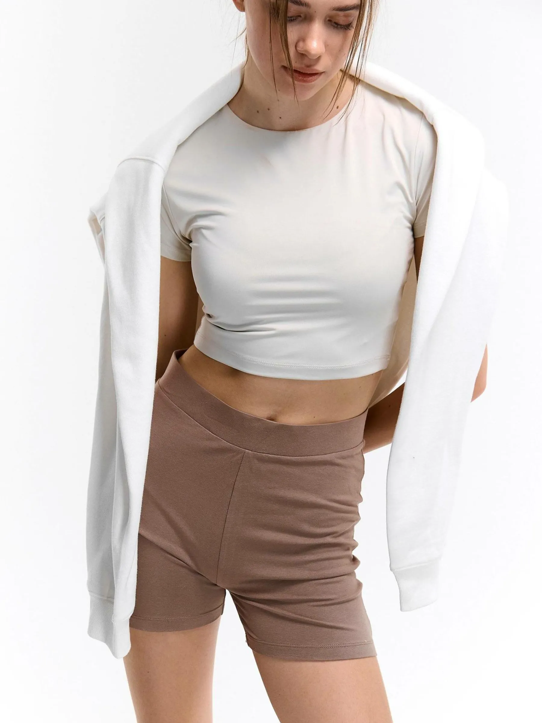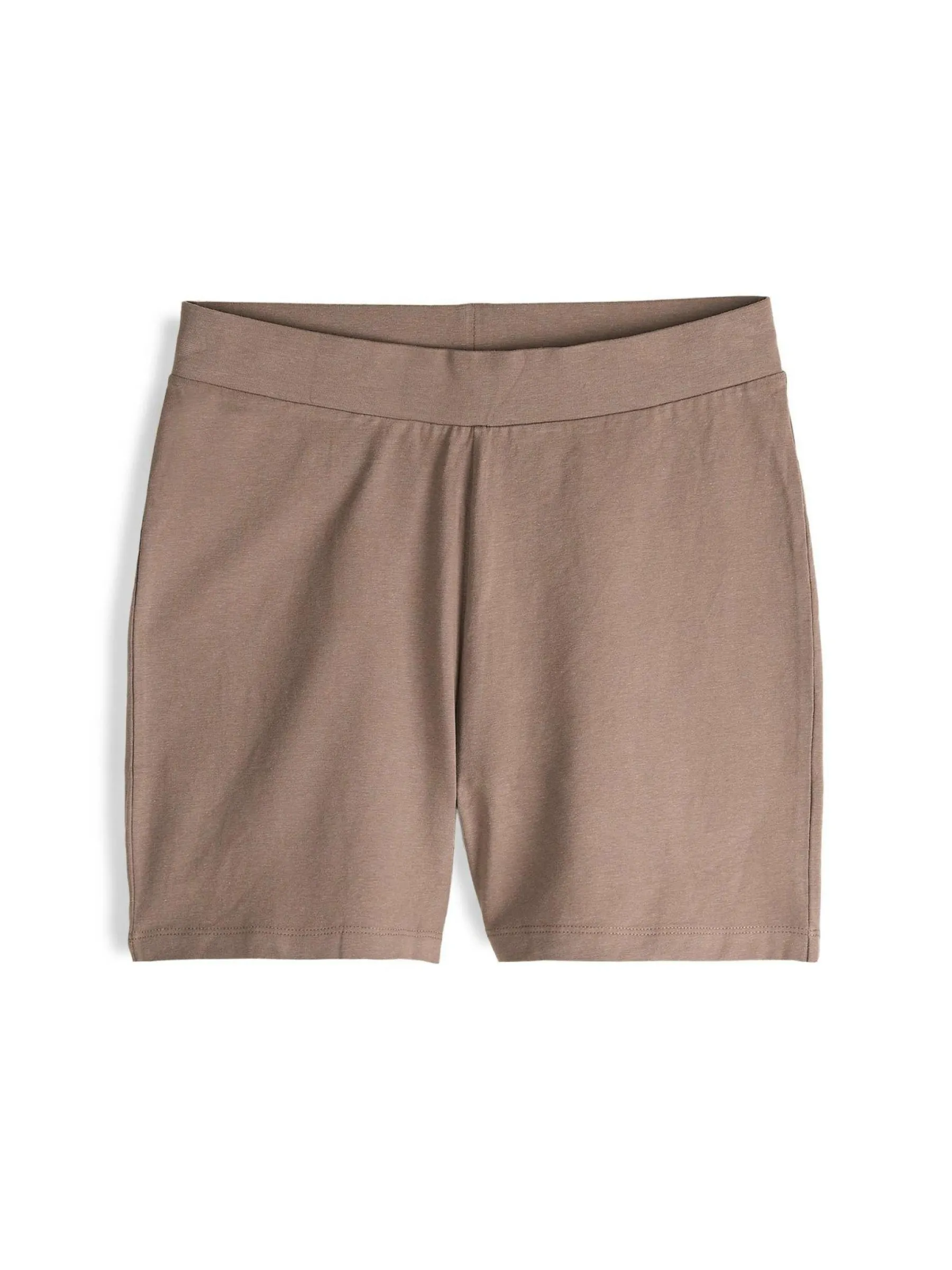 Kolor: brązowyKrój: bikerTyp: spodenkiDługość: krótkiPattern style: pojedynczy kolorDetal: z elastyczną opaskąMa…