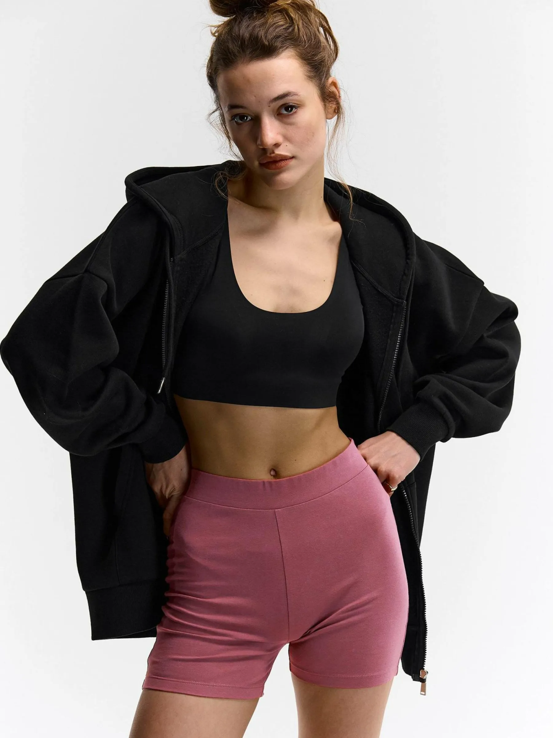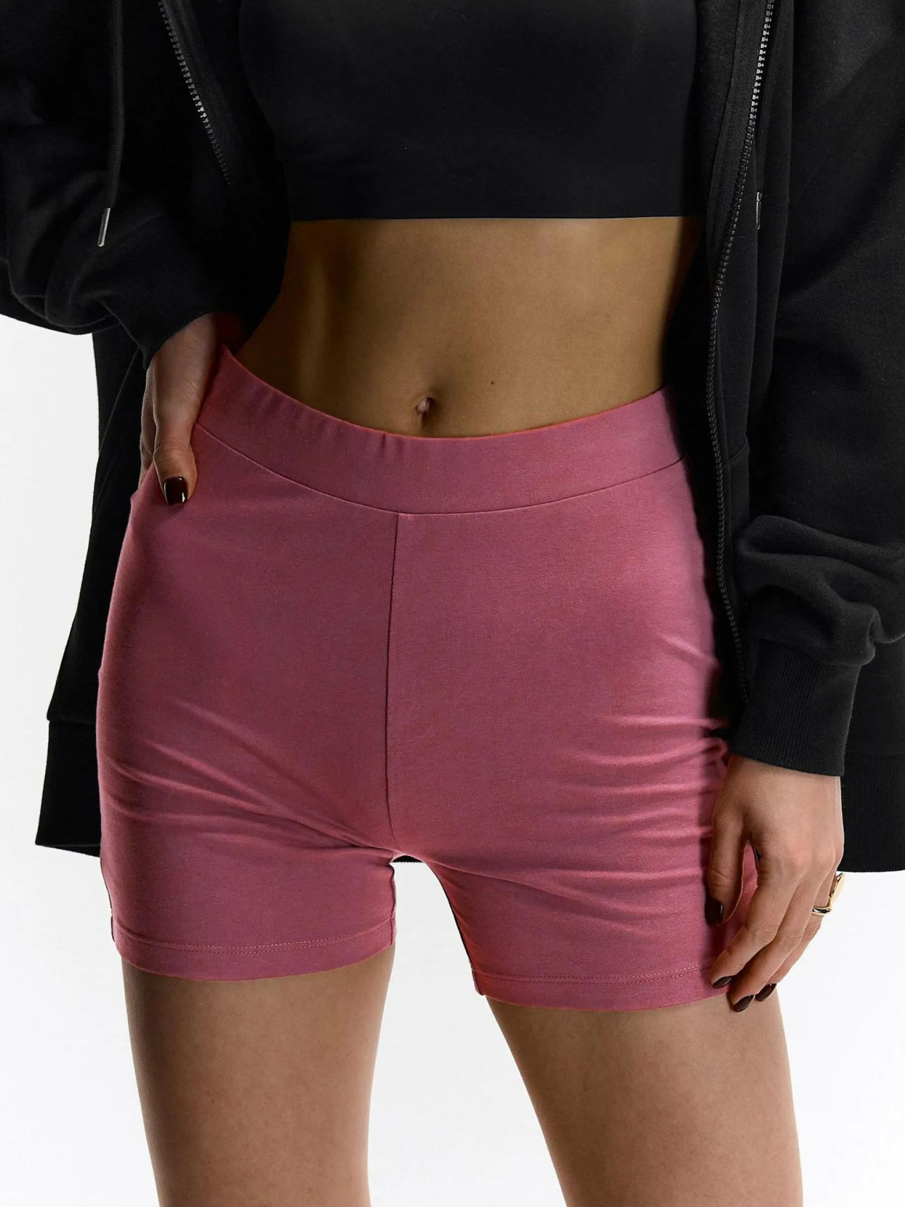 Kolor: różowyKrój: bikerTyp: spodenkiDługość: krótkiPattern style: pojedynczy kolorDetal: z elastyczną opaskąMa…